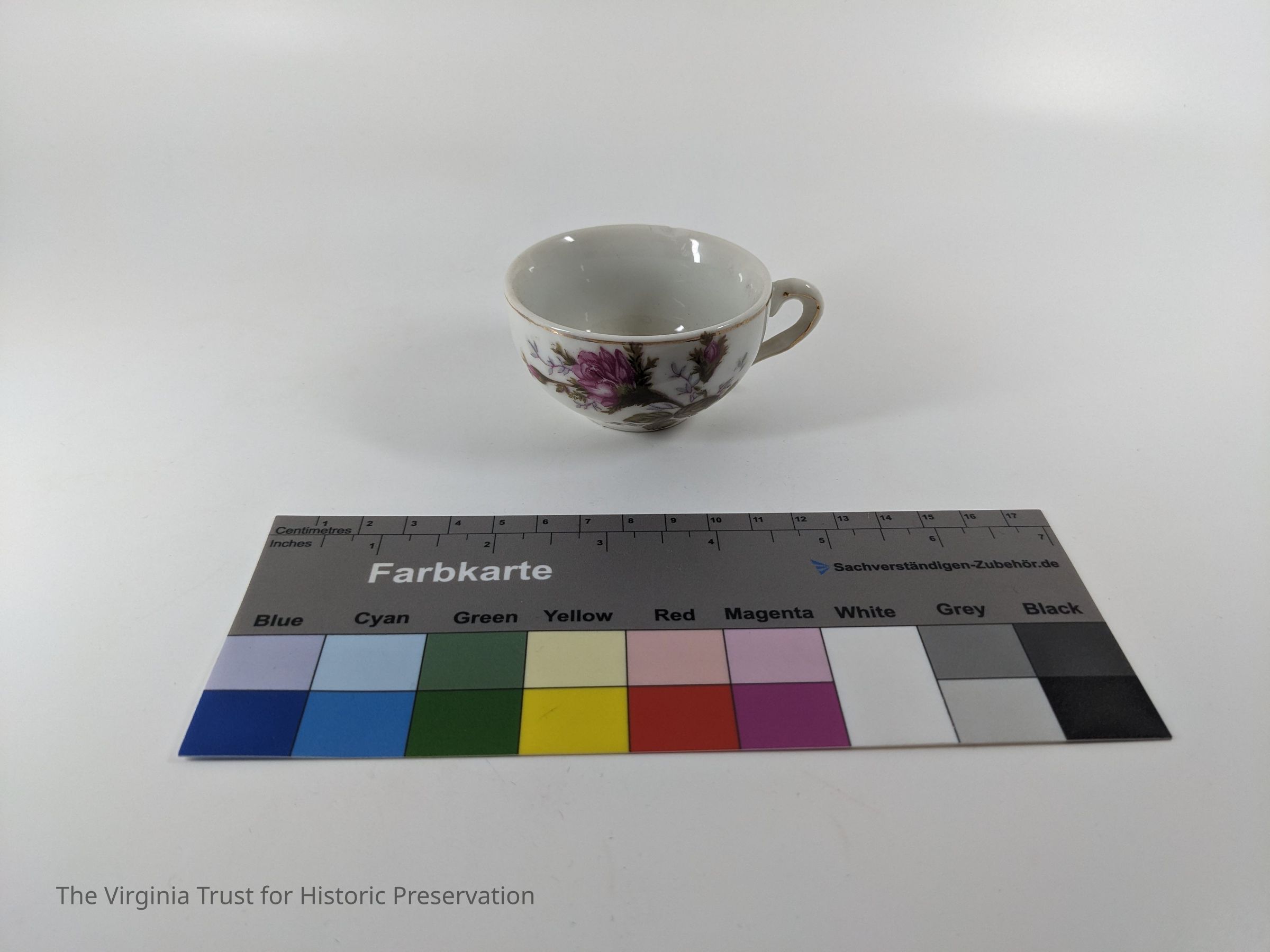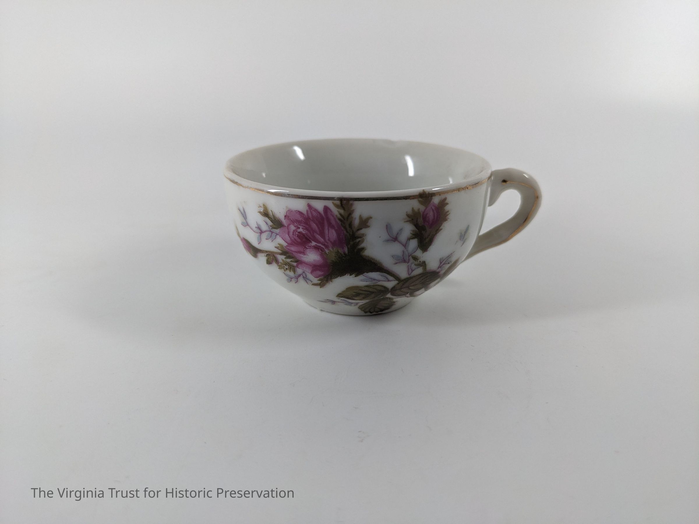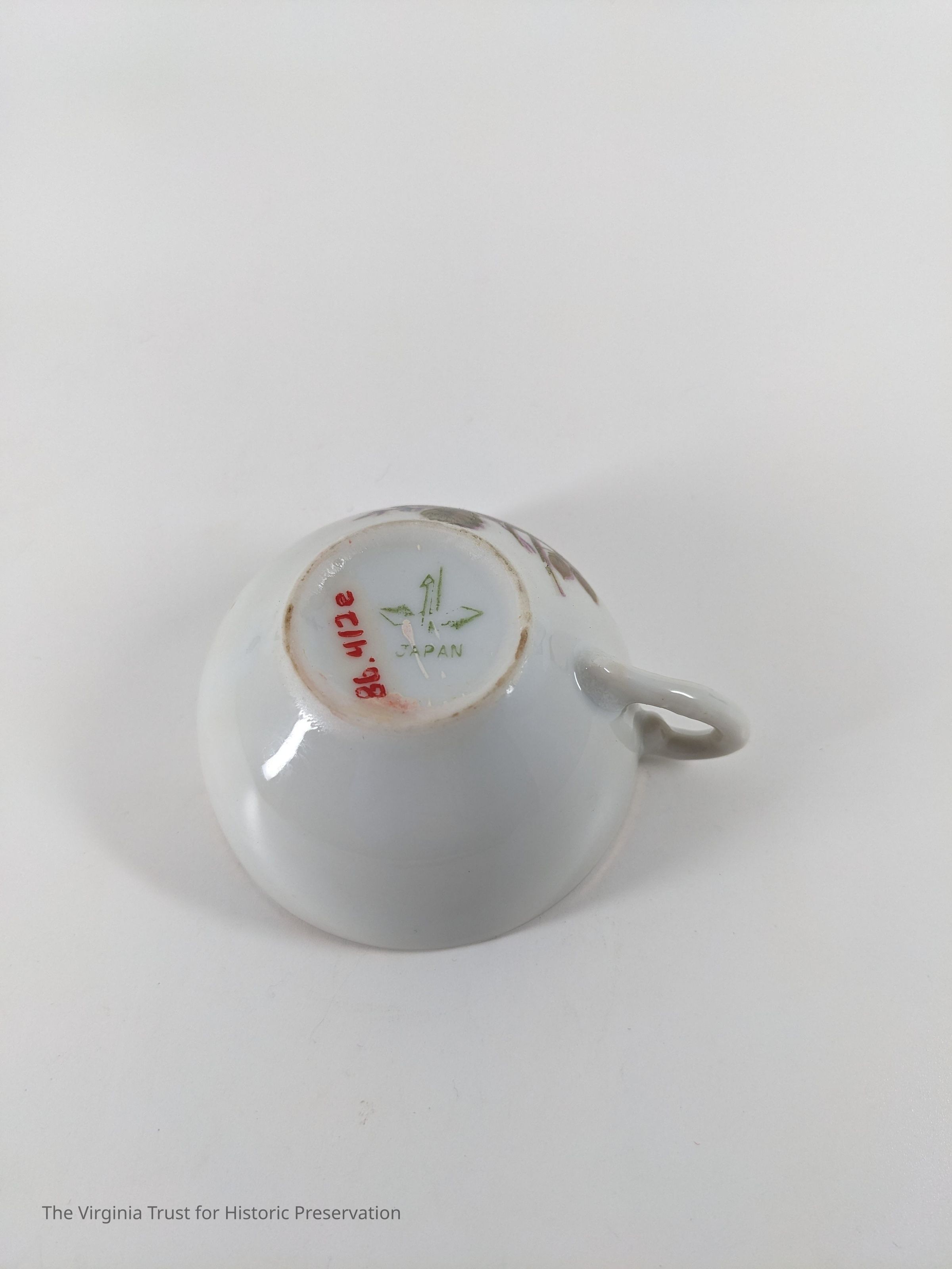 One of a set of 6 small teacups. White with rose design. Marked "Japan."