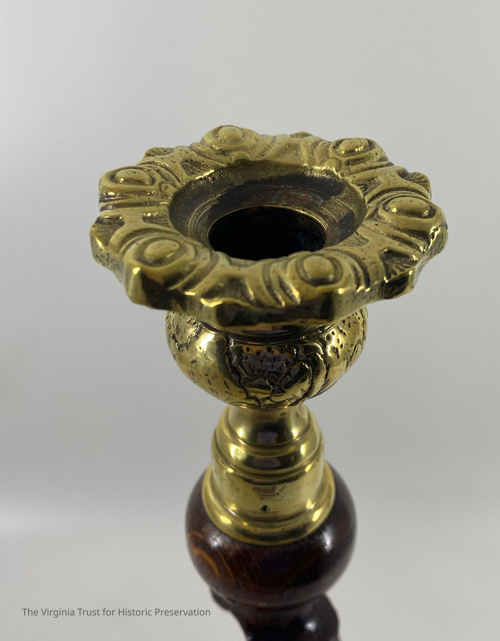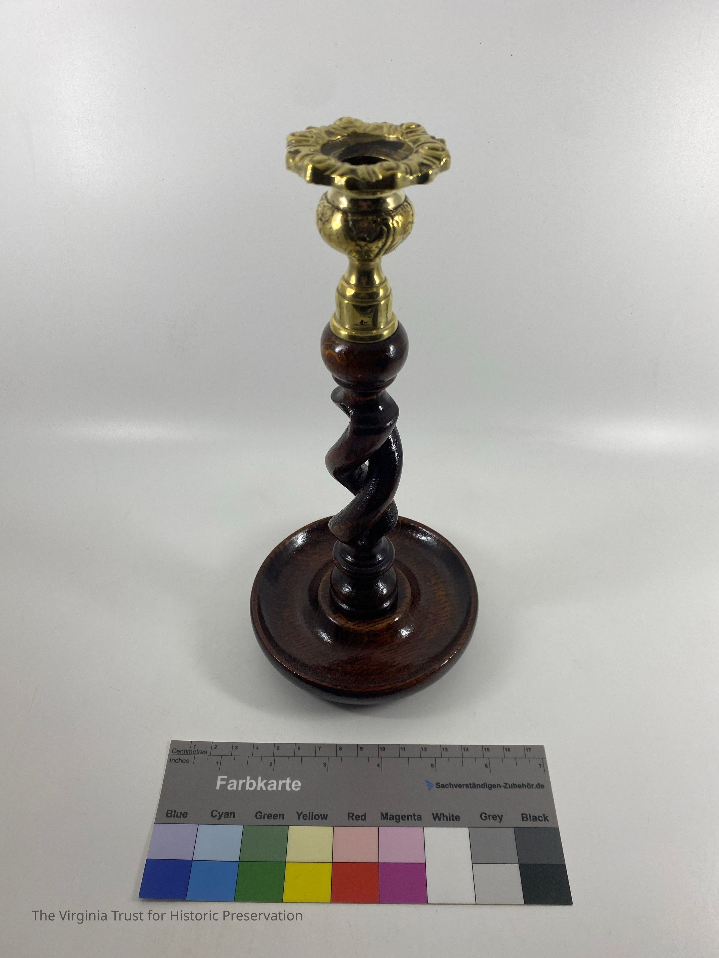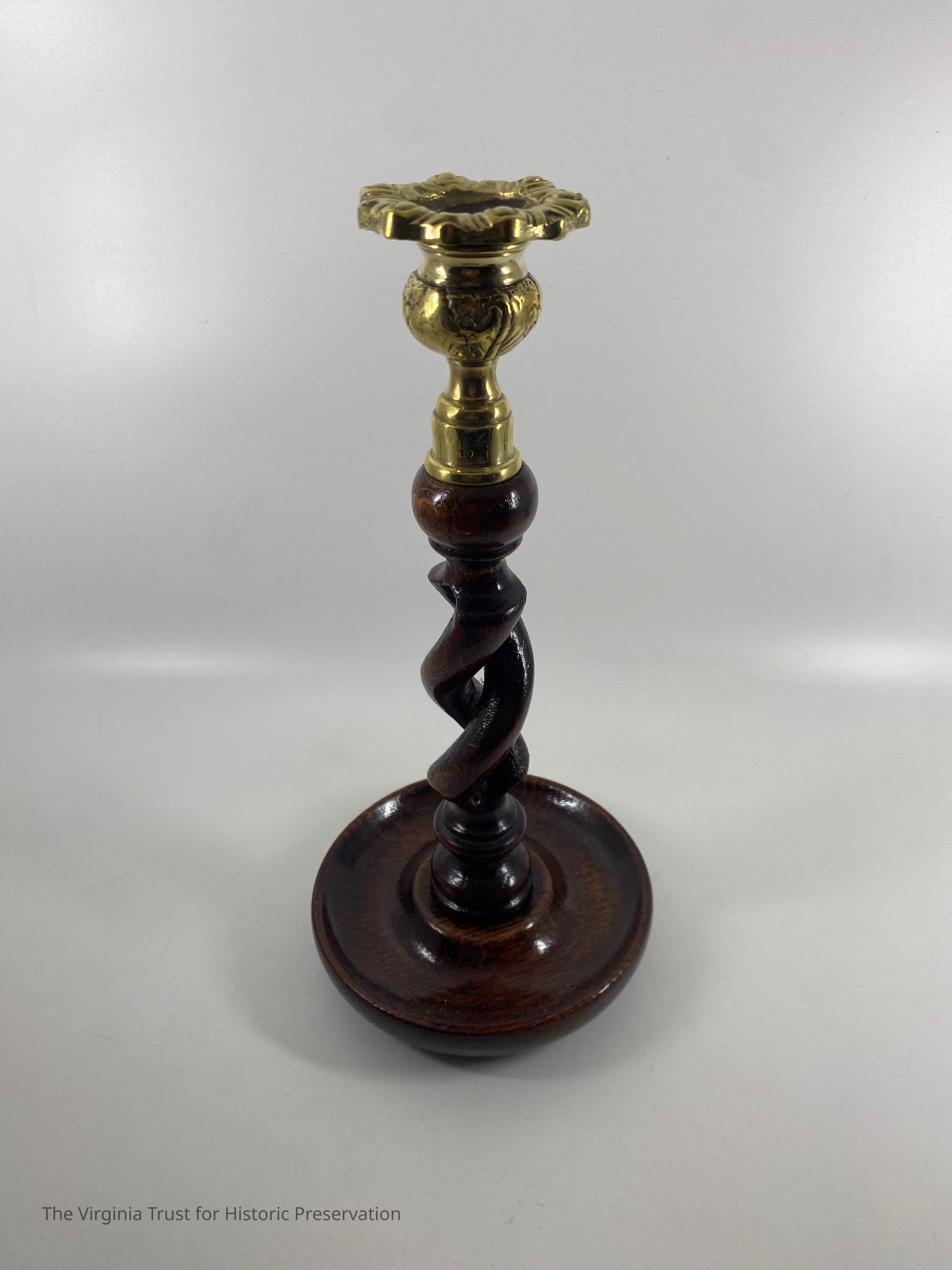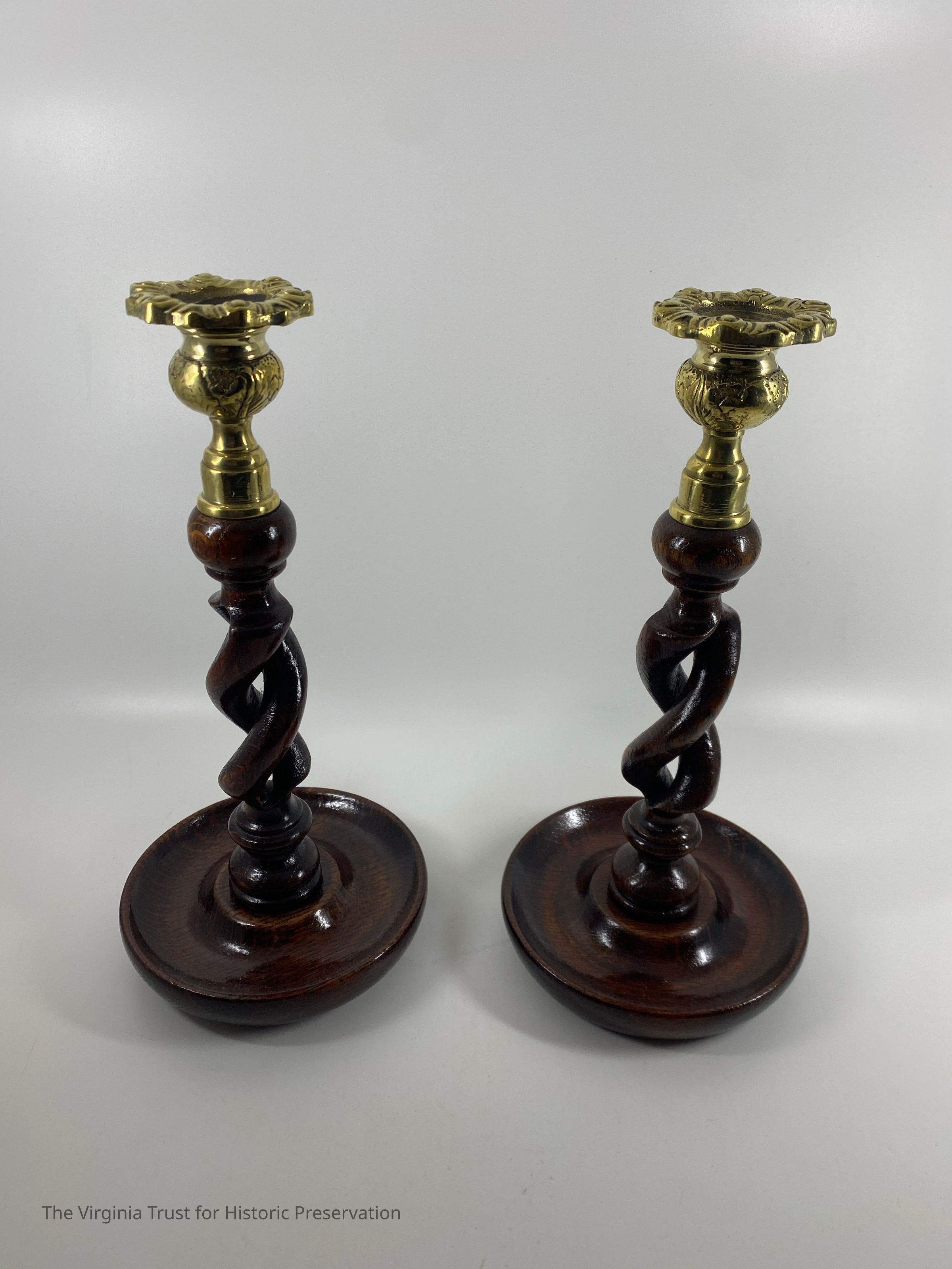 One of a pair of oak barley twist candlesticks, English. Brass thistle tops. "Open twists" - two hand-carved twists spiraling around each other. Brass drip trays to protect wood from hot wax drips. Ca. 1900Dimensions
