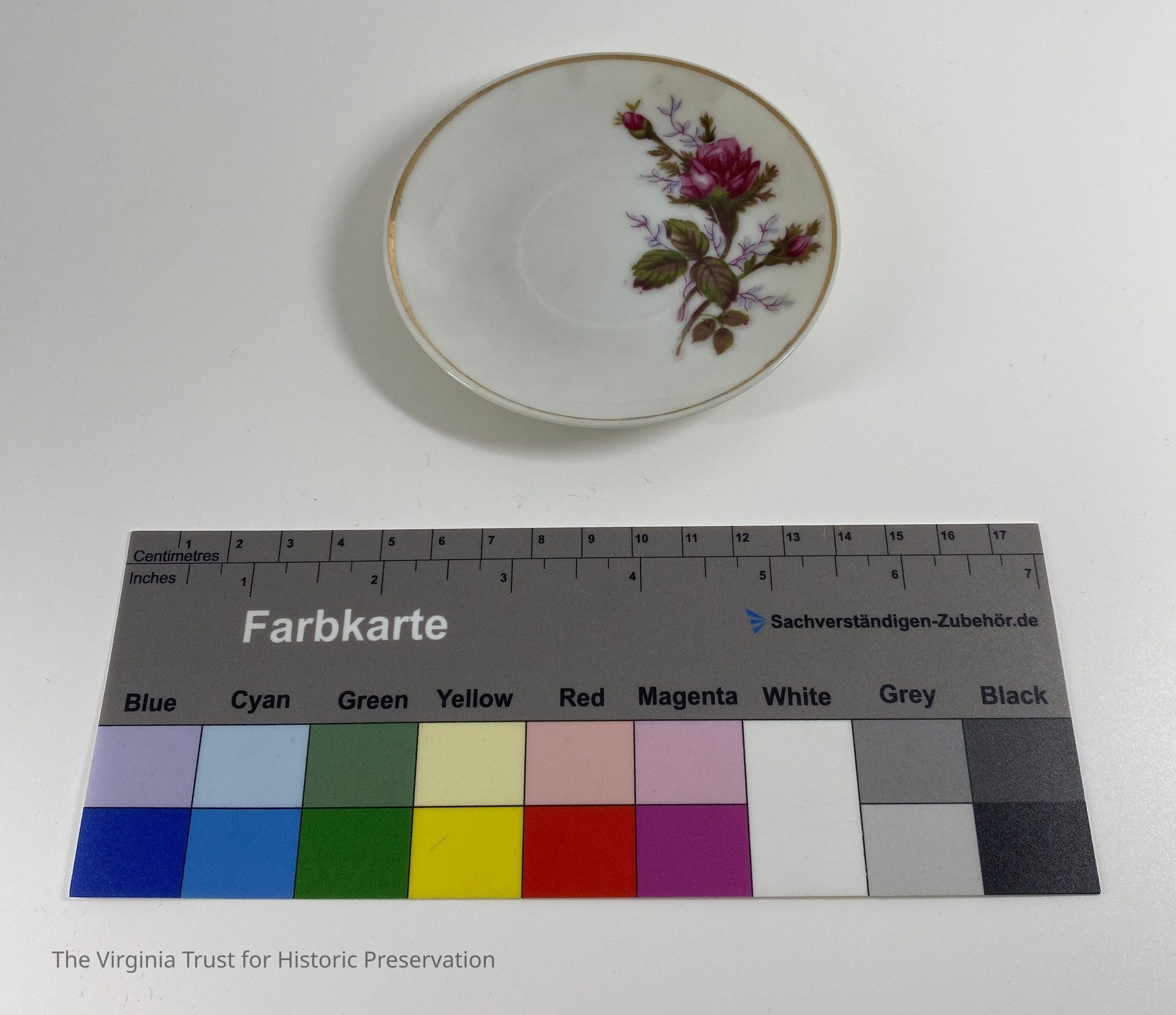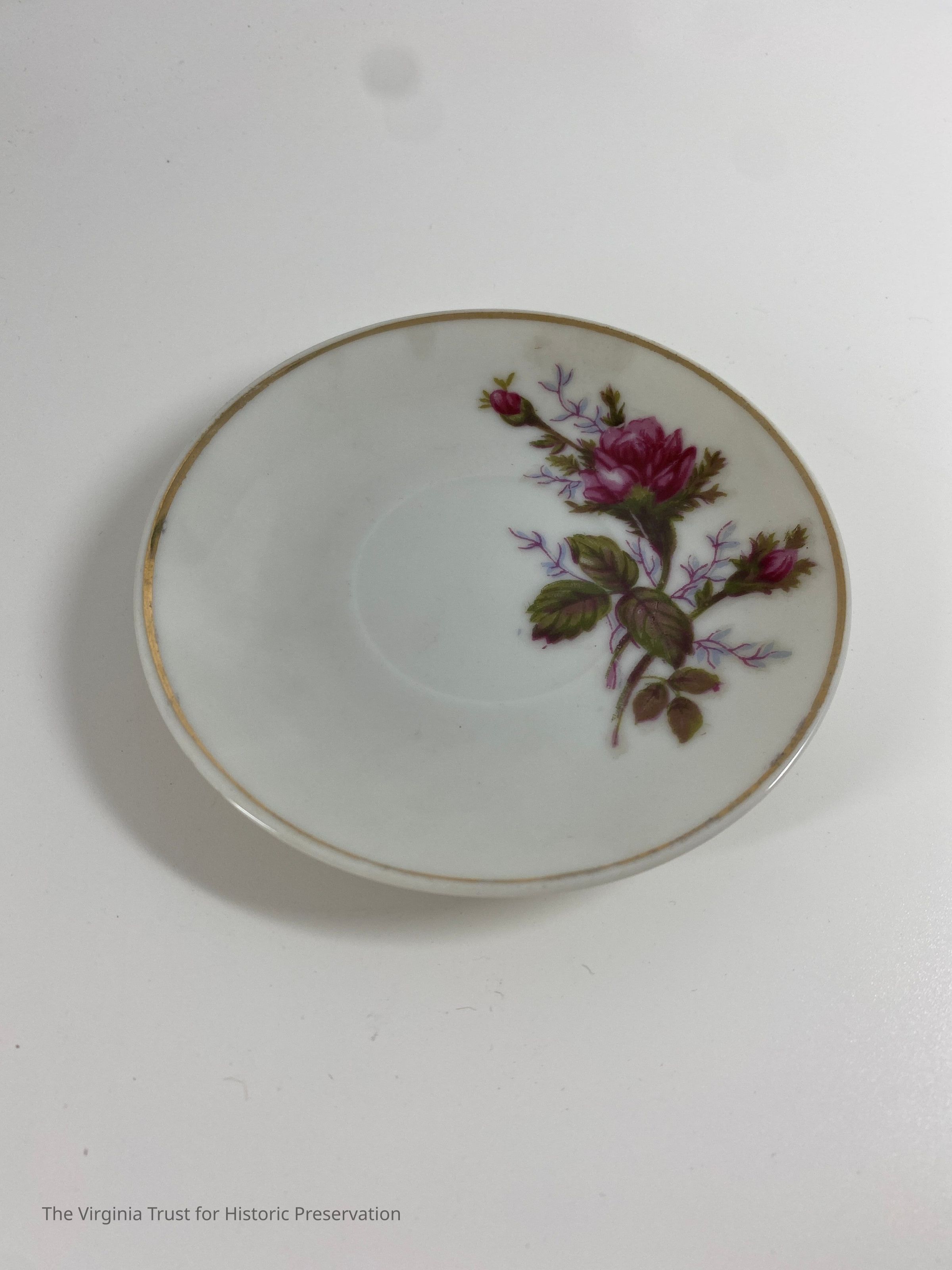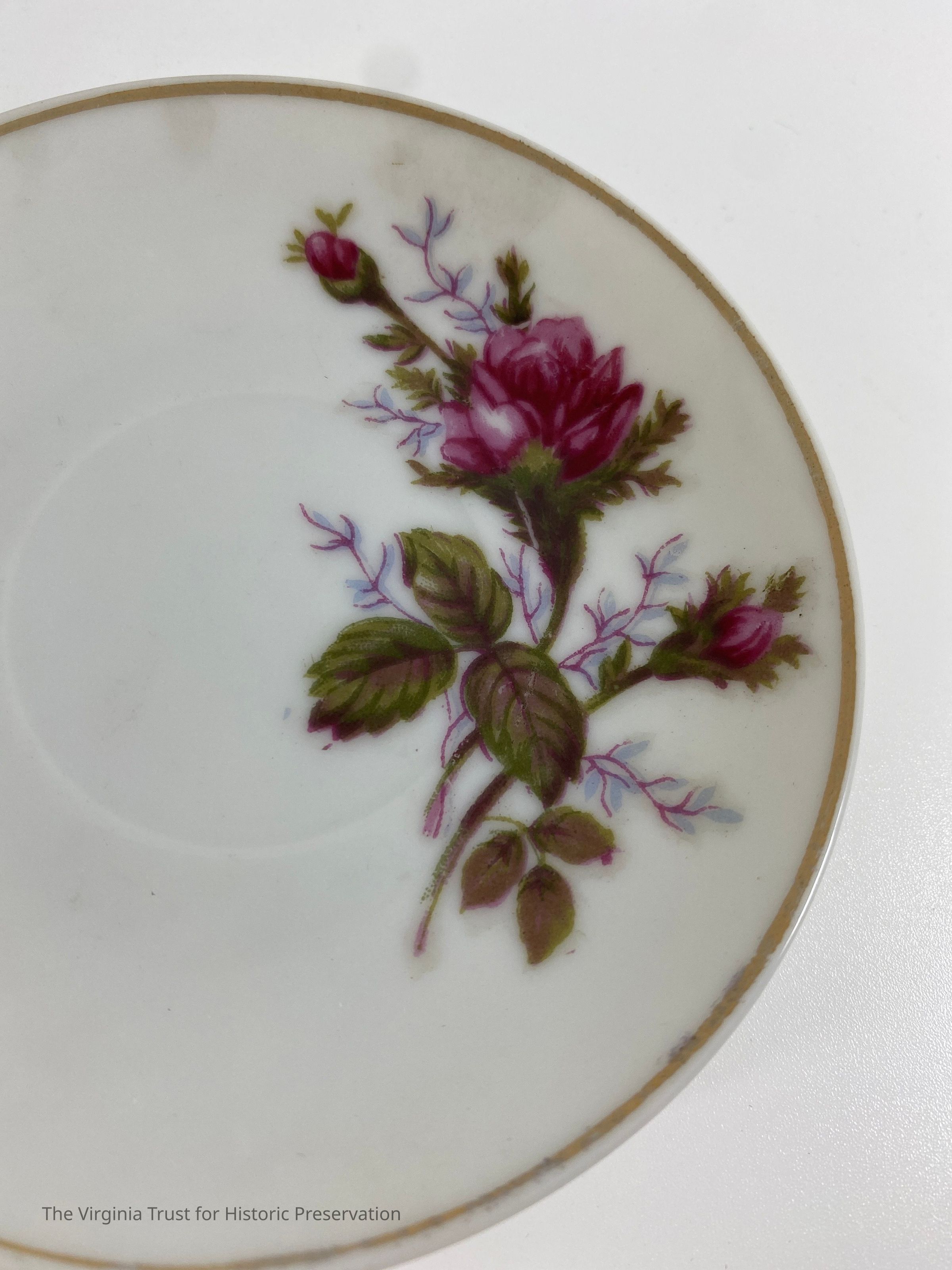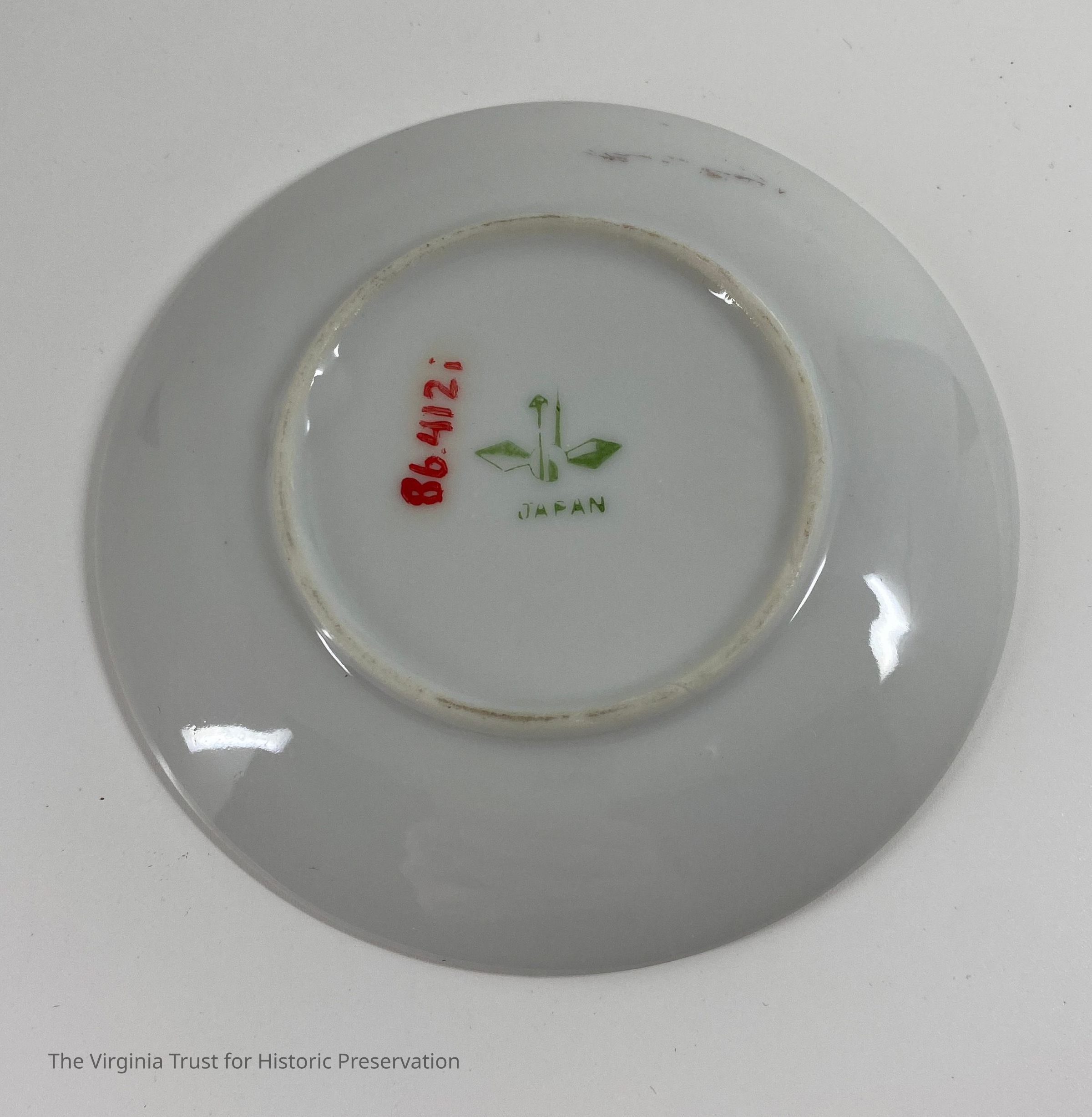 Set of 6 saucers. White with rose design. Marked "Japan."