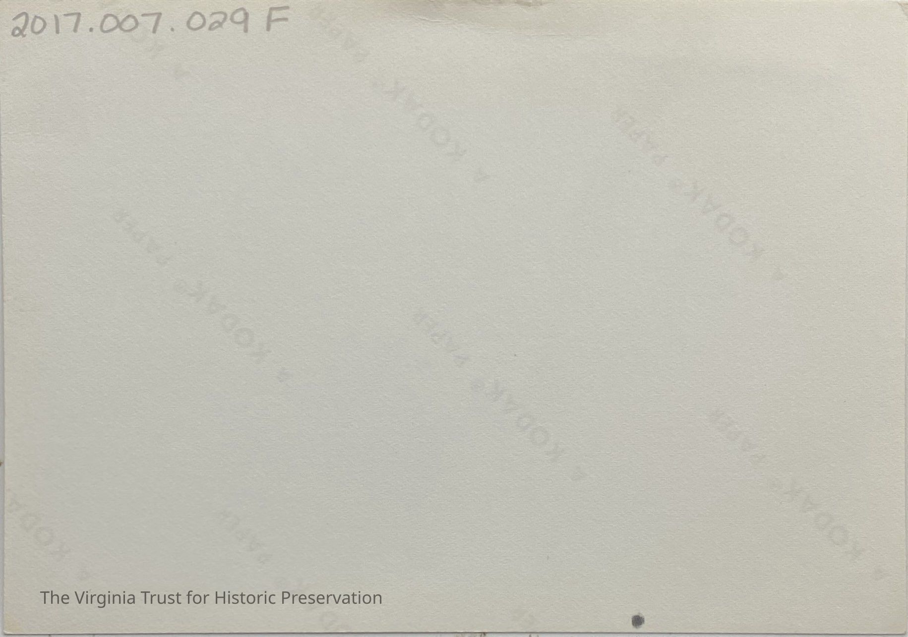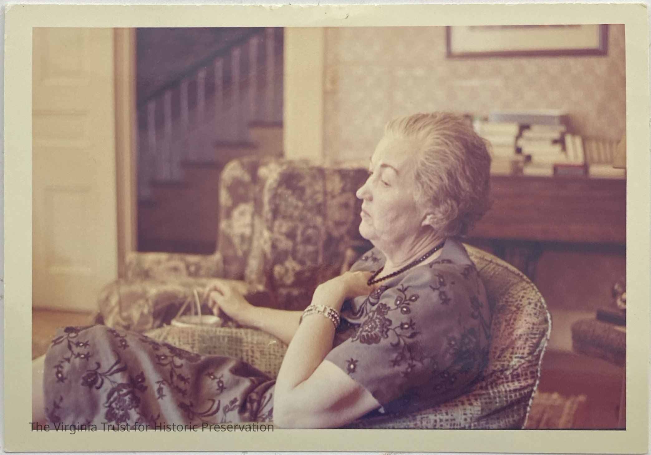 Color photograph of a woman (likely Ms. Edith C.) sitting in a chair with a hand clutching her necklace in the South Parlor of the Lee-Fendall House. Side profile. She wears a blue dress with floral pattern. Books, another chair, and the main stair rail in the background. Straight white border.
