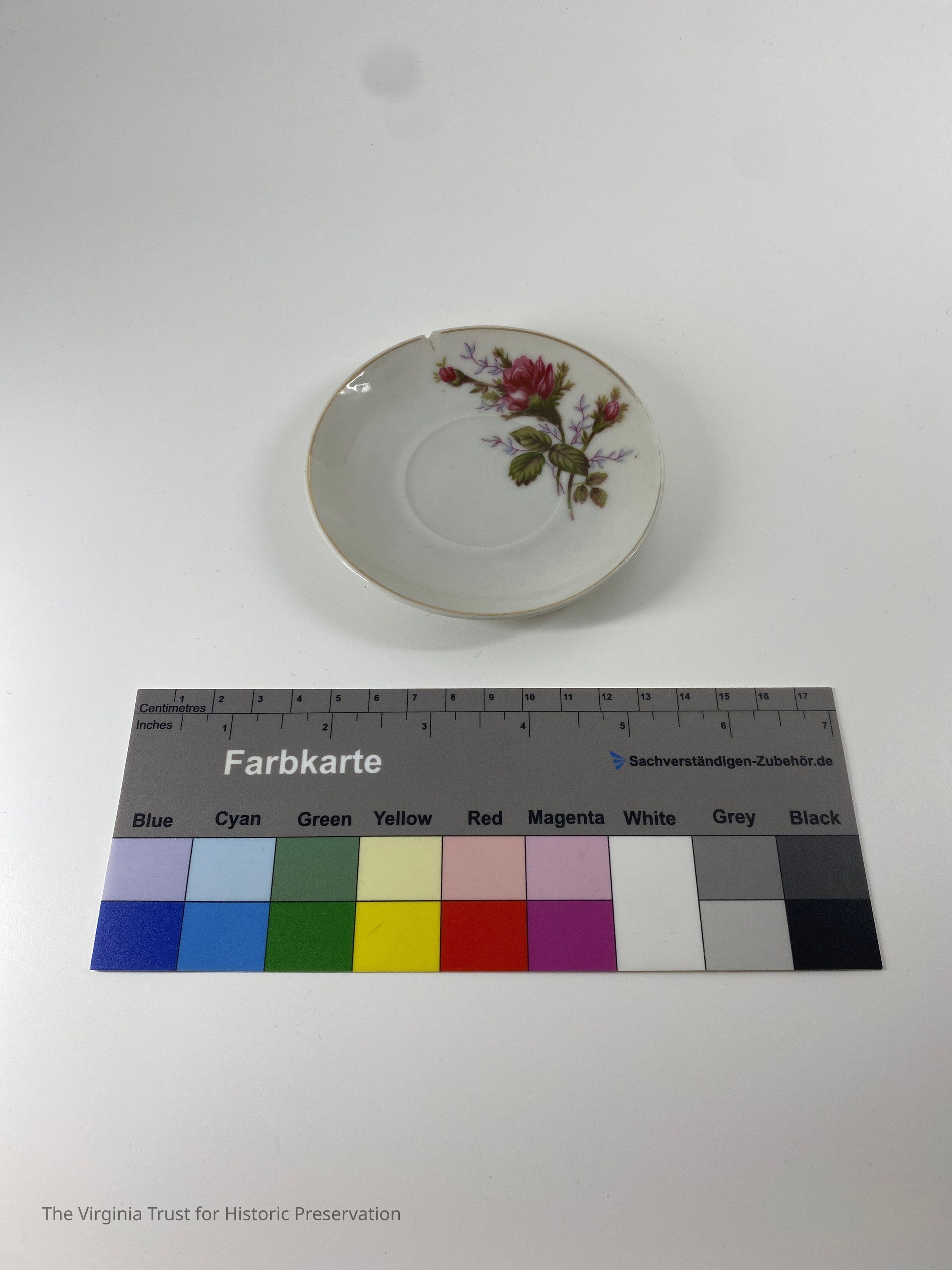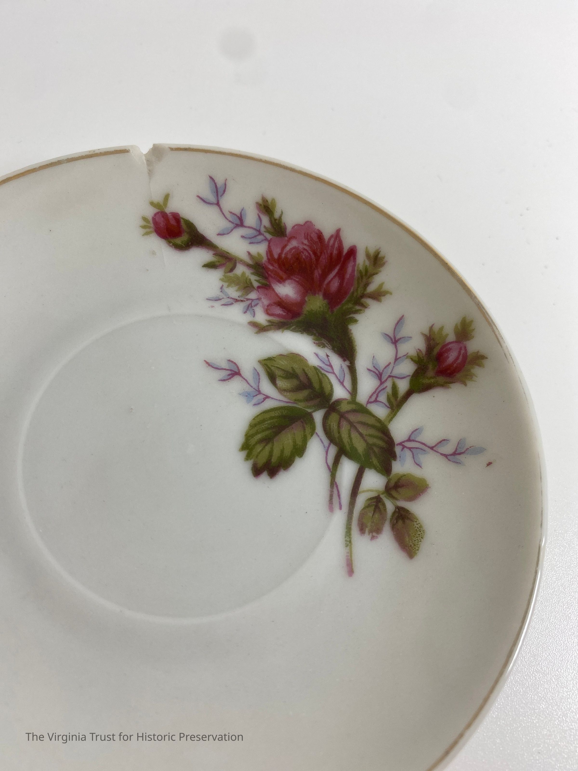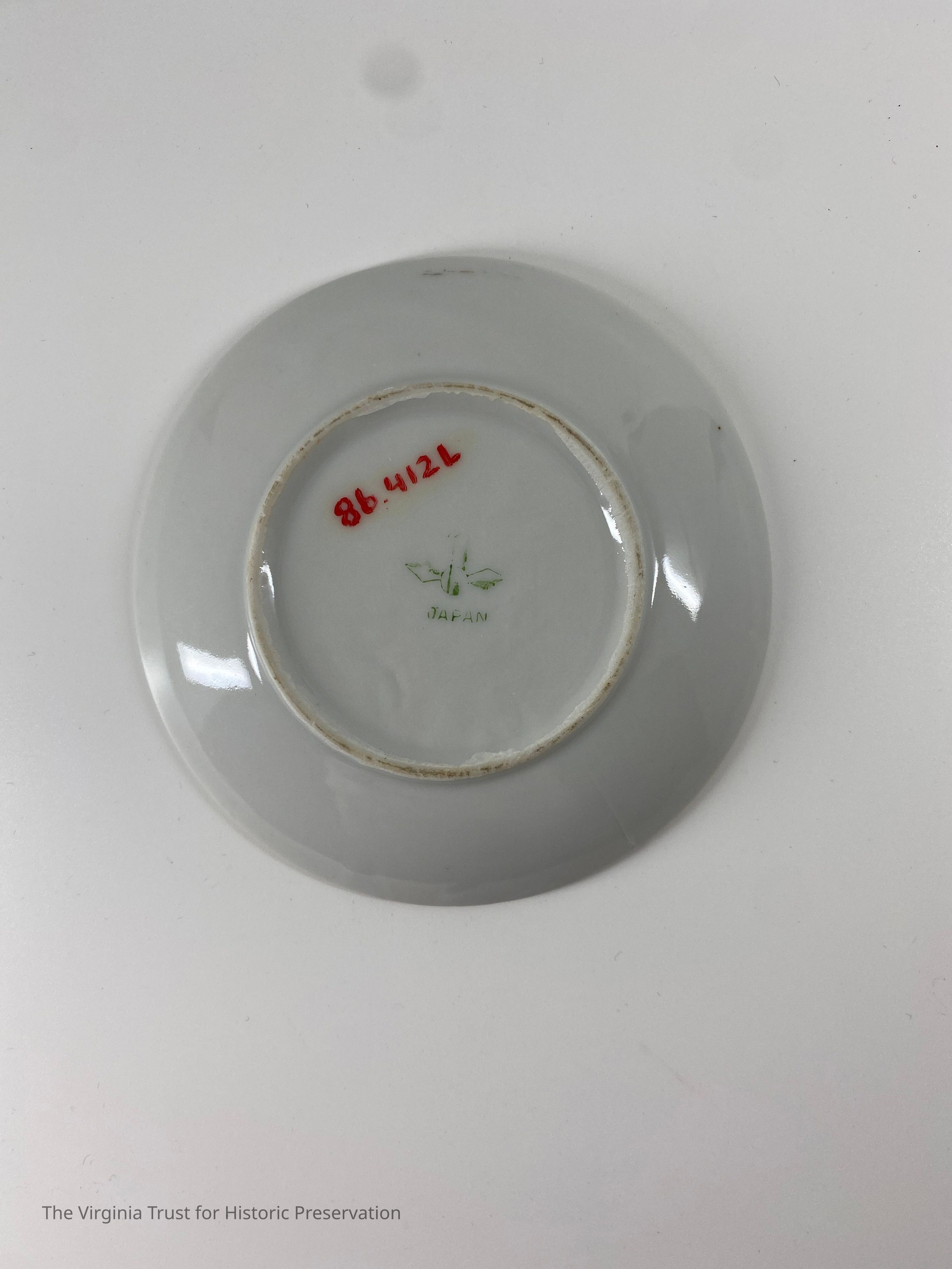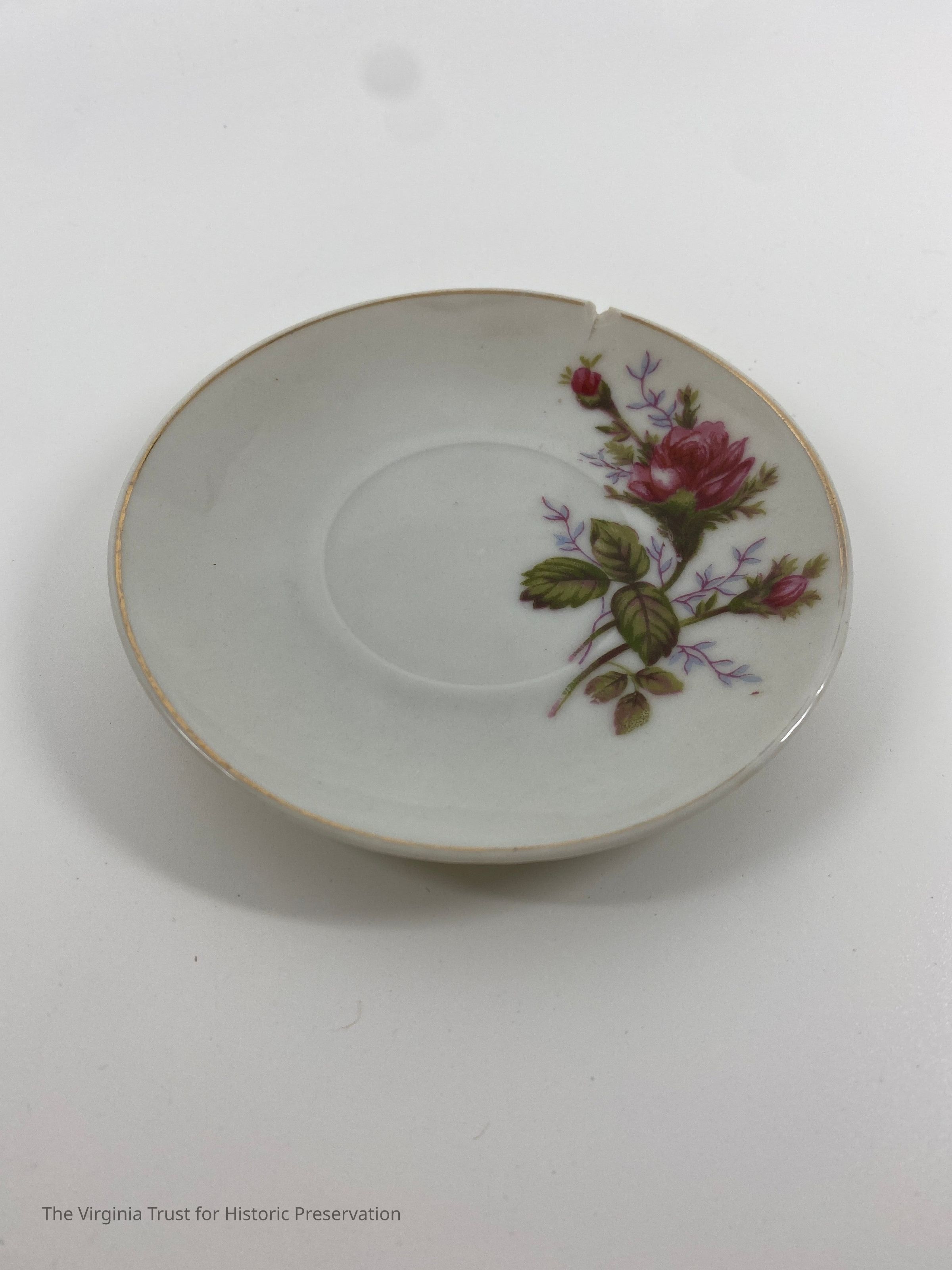 One of a set of 6 saucers. White with gold rim, pink rose on edge. Marked "Japan."