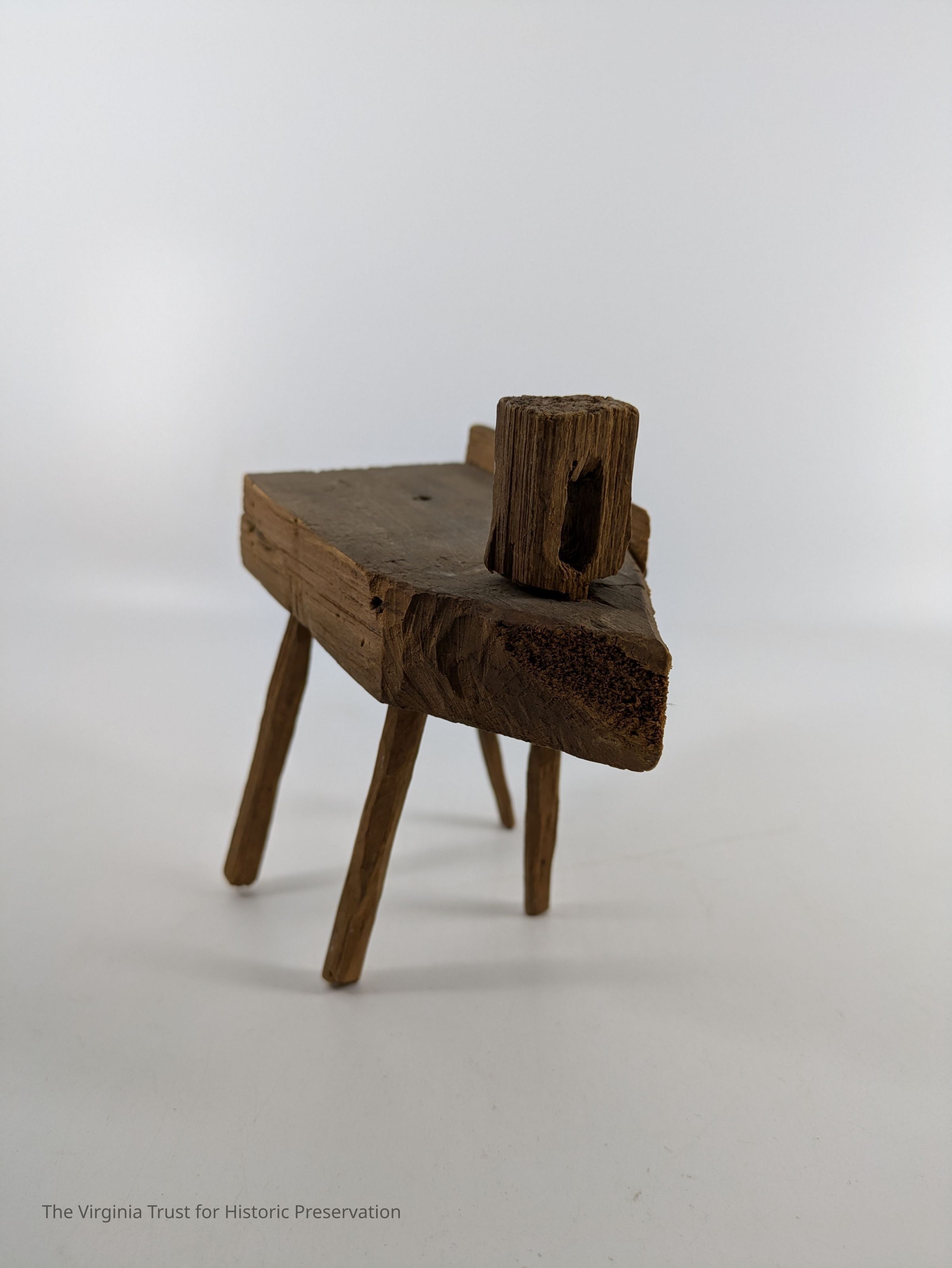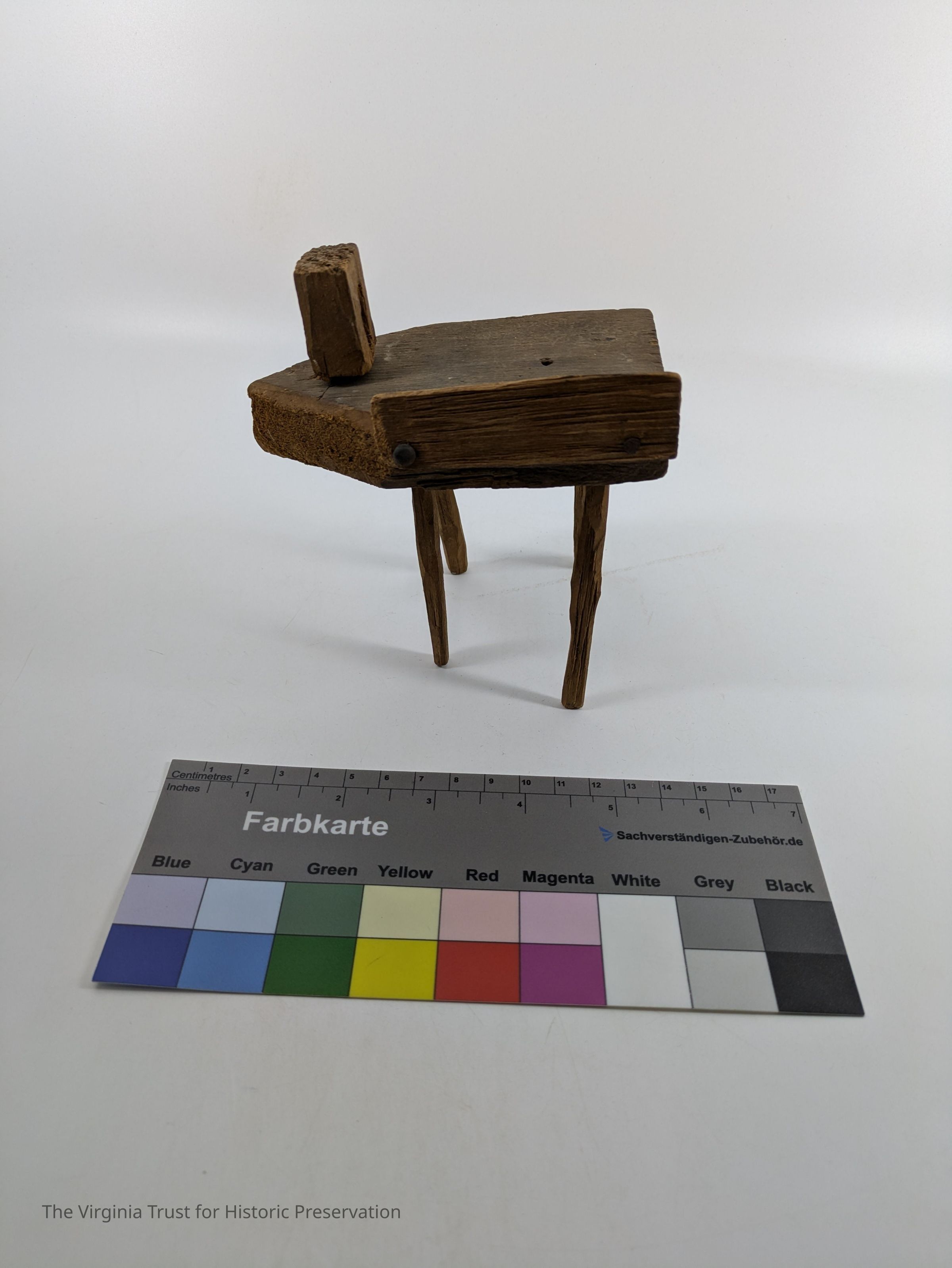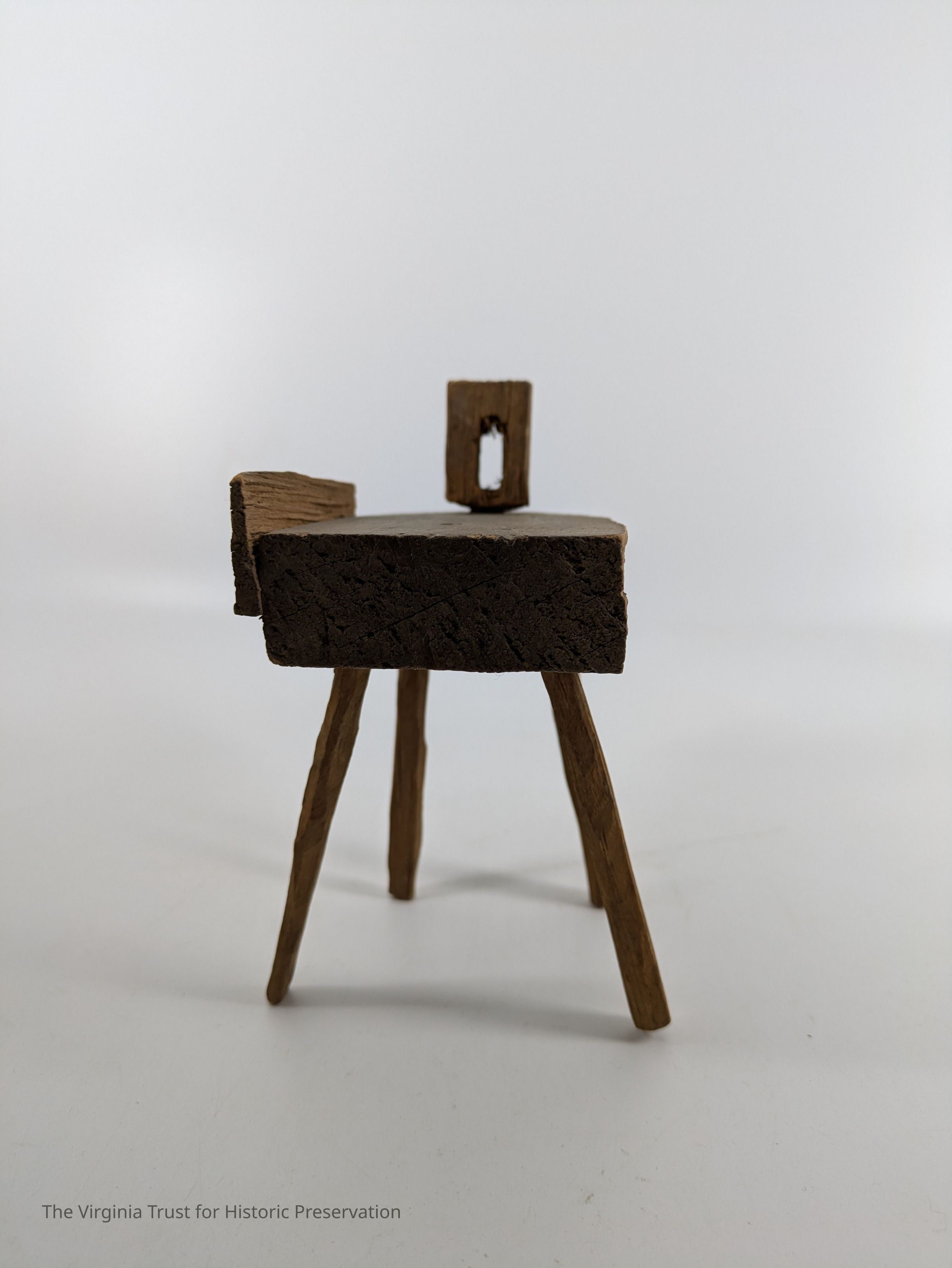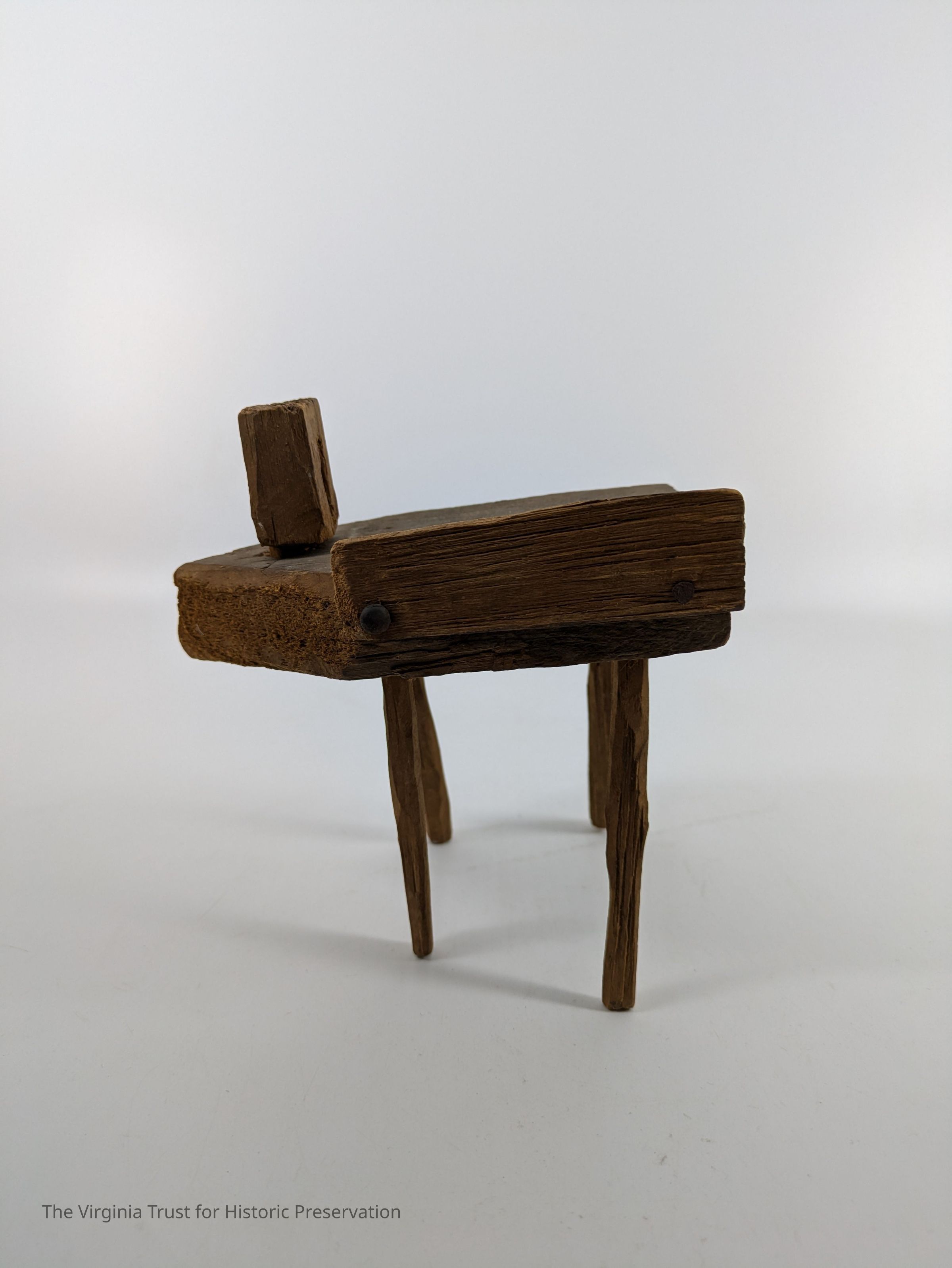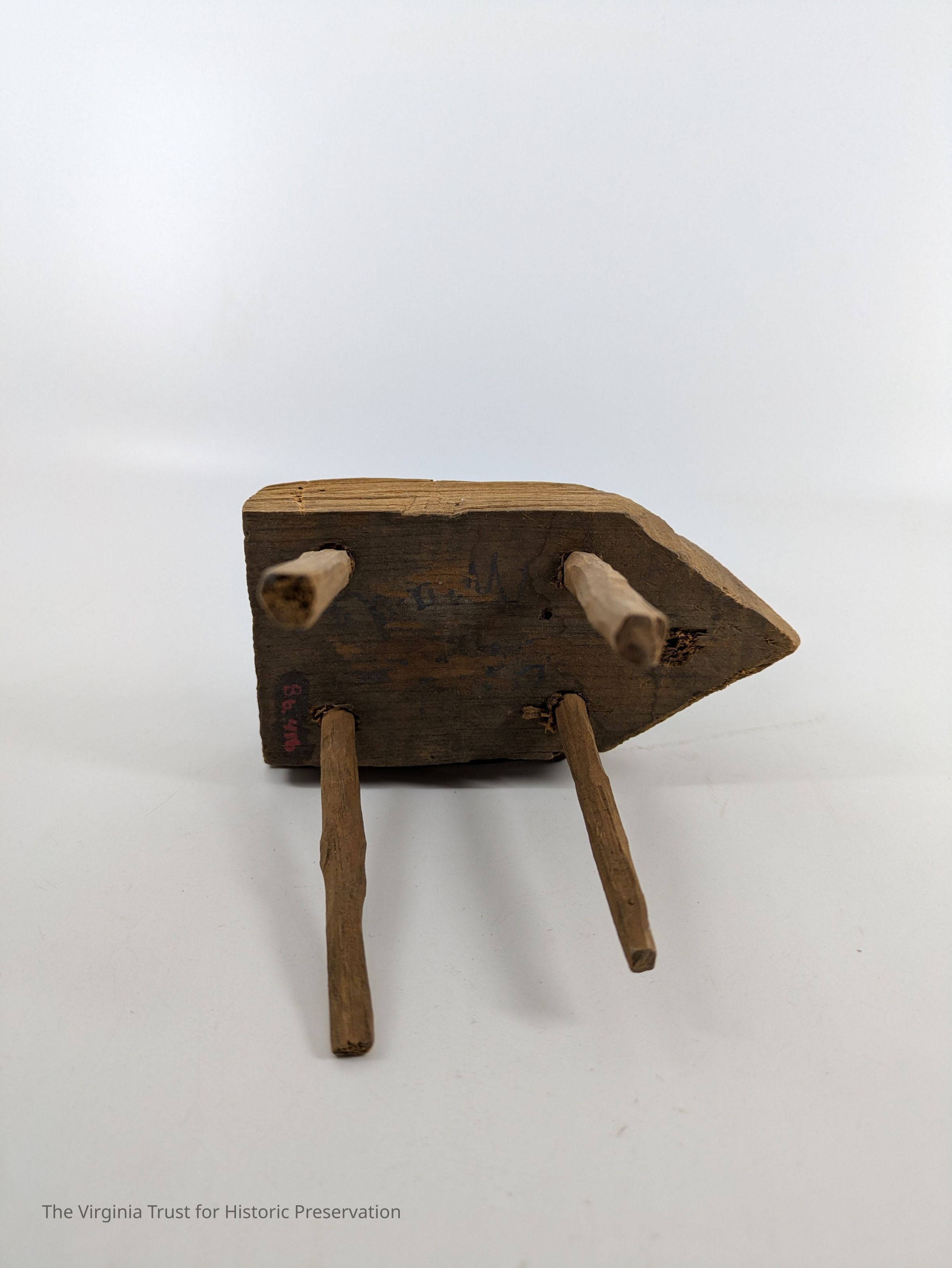 Wooden toy animal. Appears to be made by a child. 4 legs and a mark on bottom: "Made ??." Rough, unfinished wood side has come off.