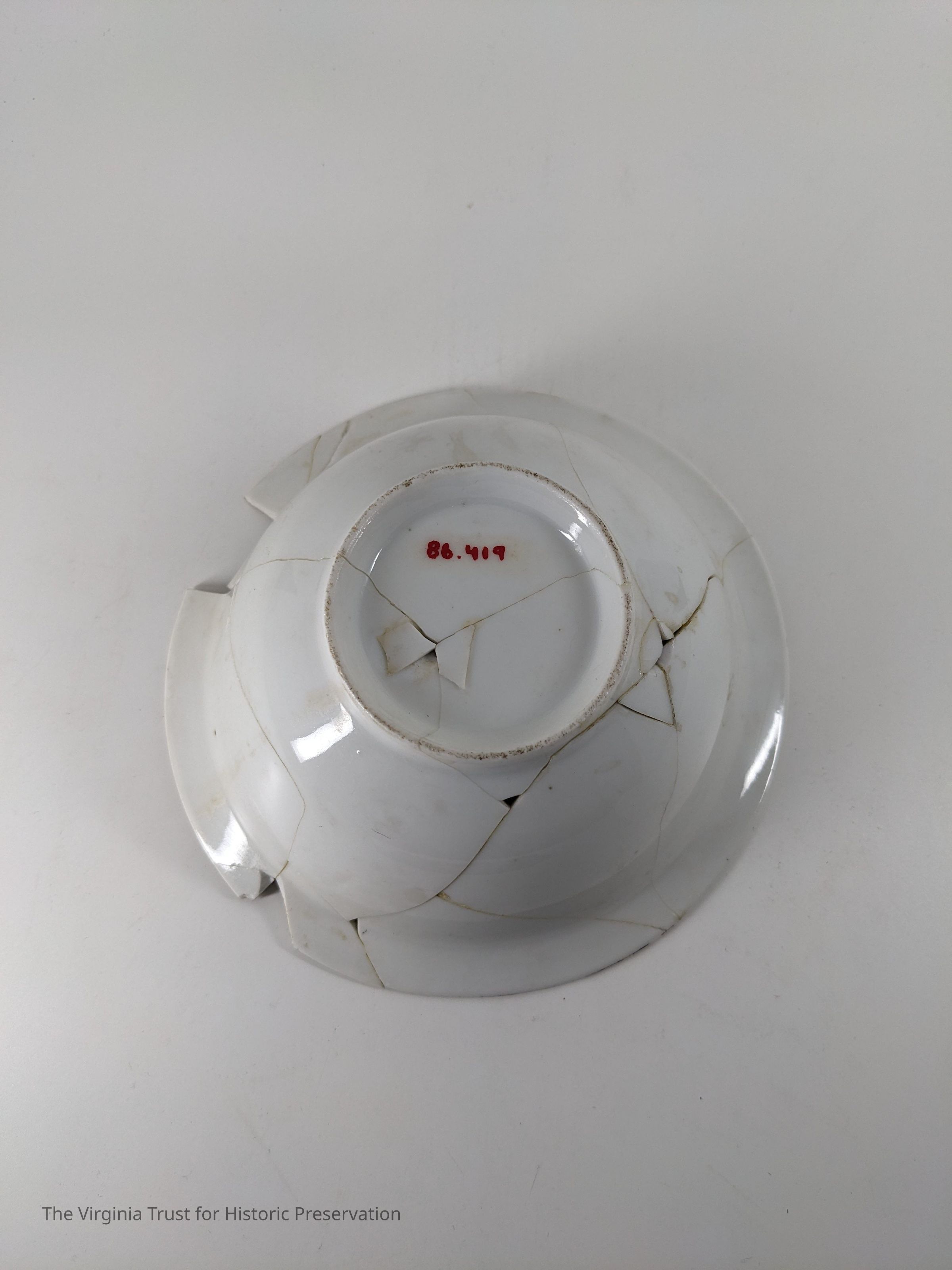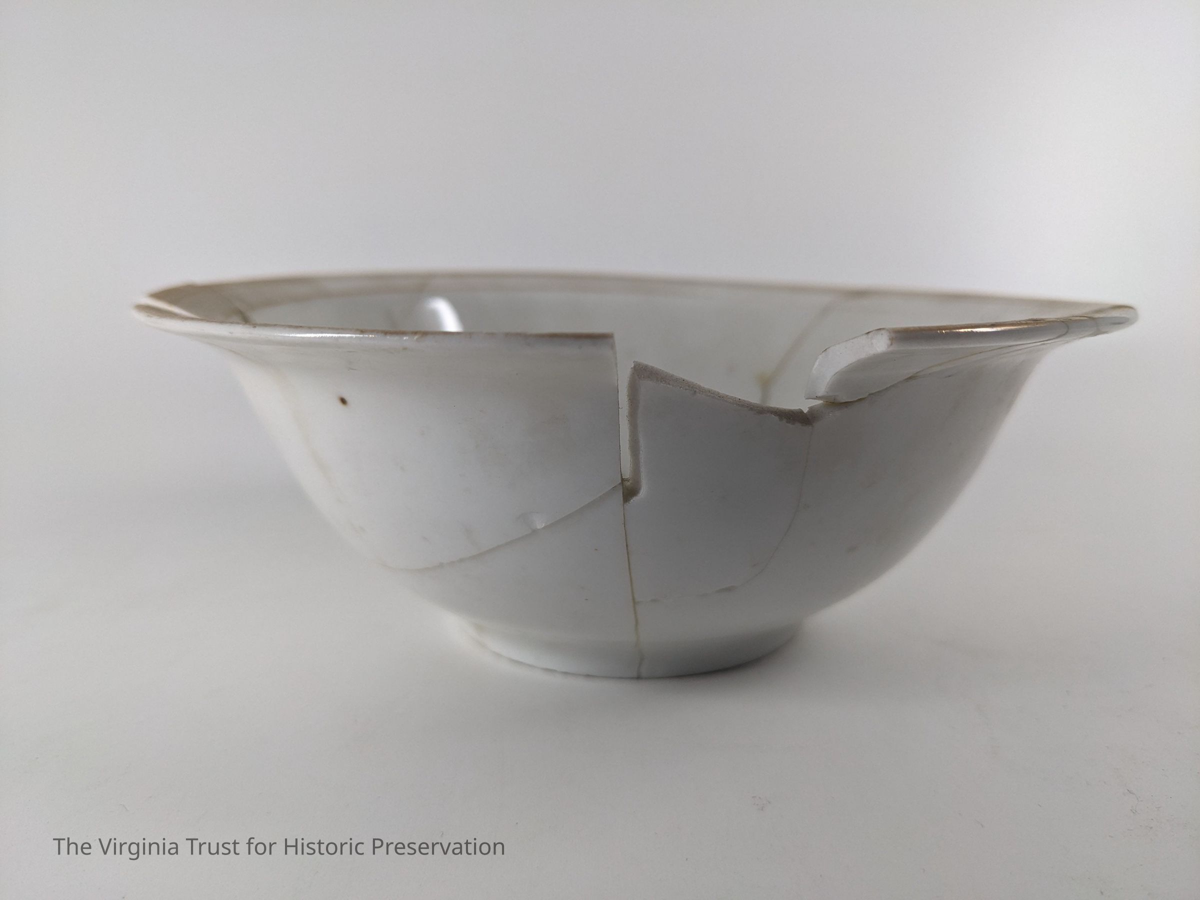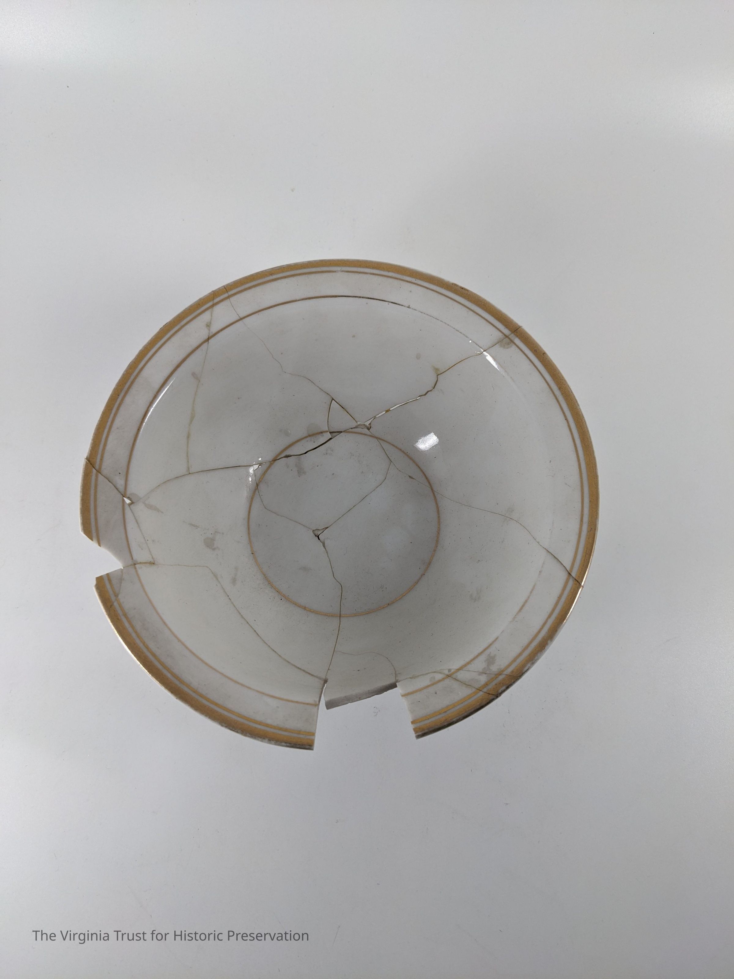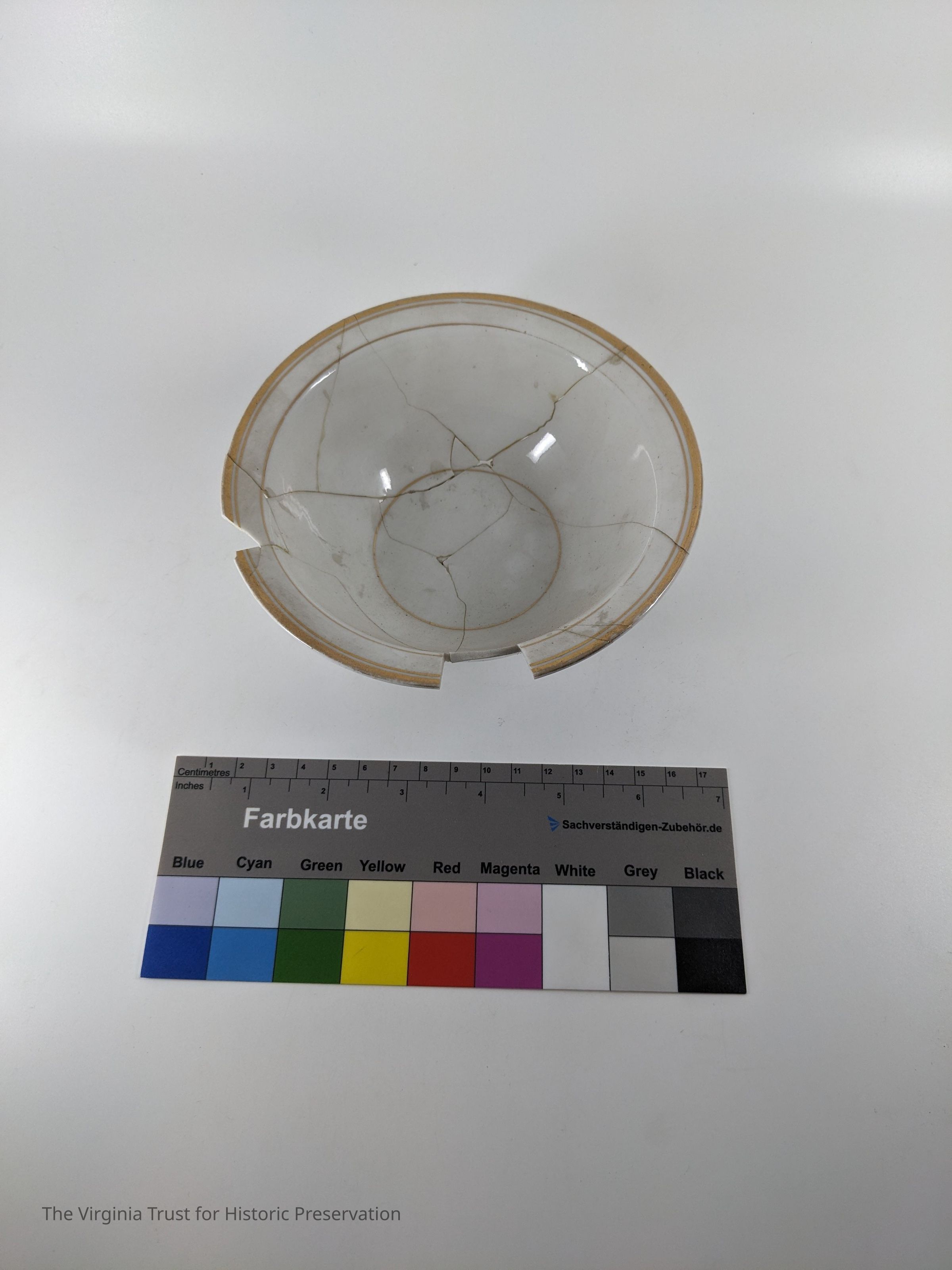 Miniature bowl. Ceramic with gold band along the rim. Part of set with pitcher.