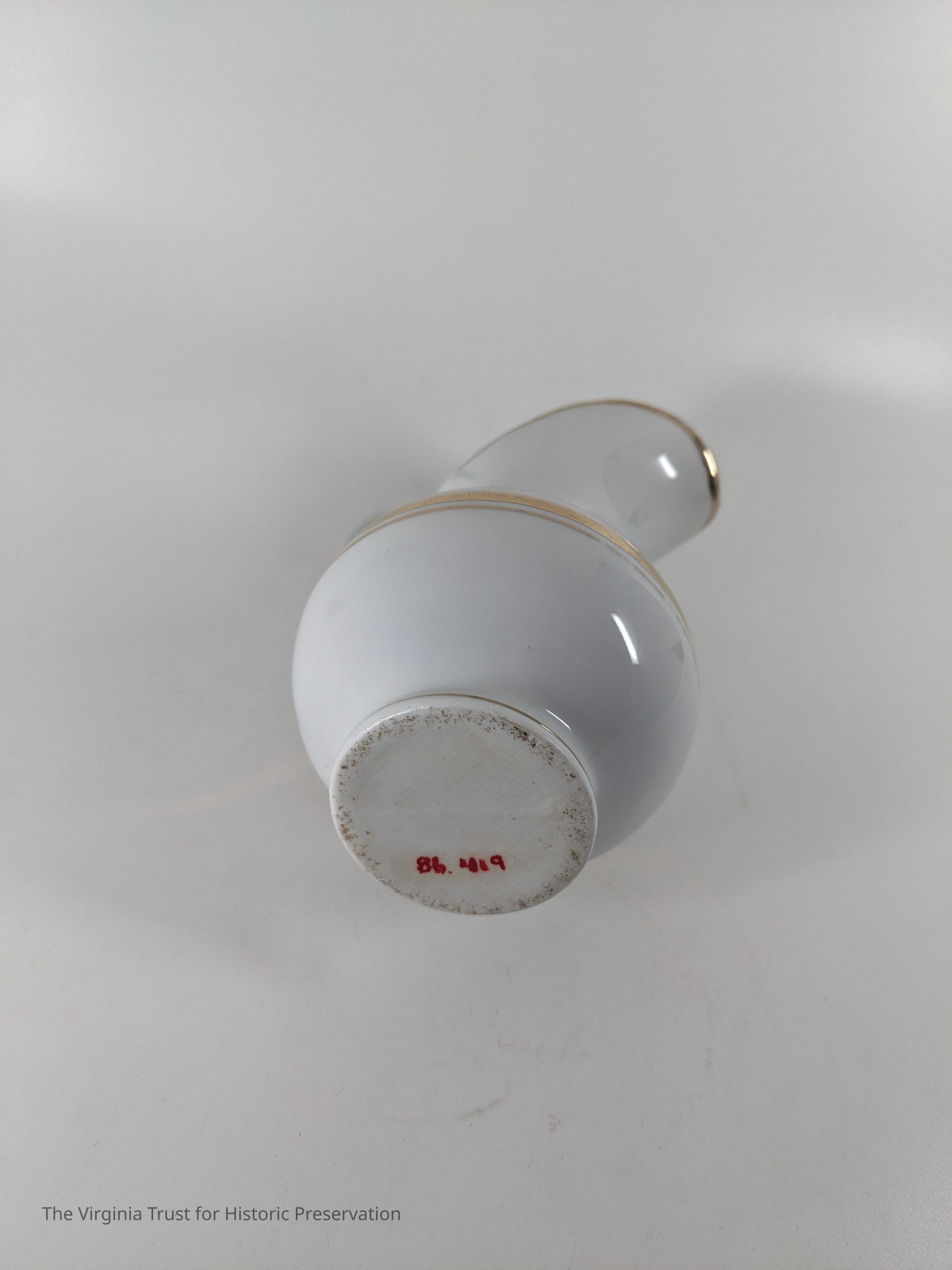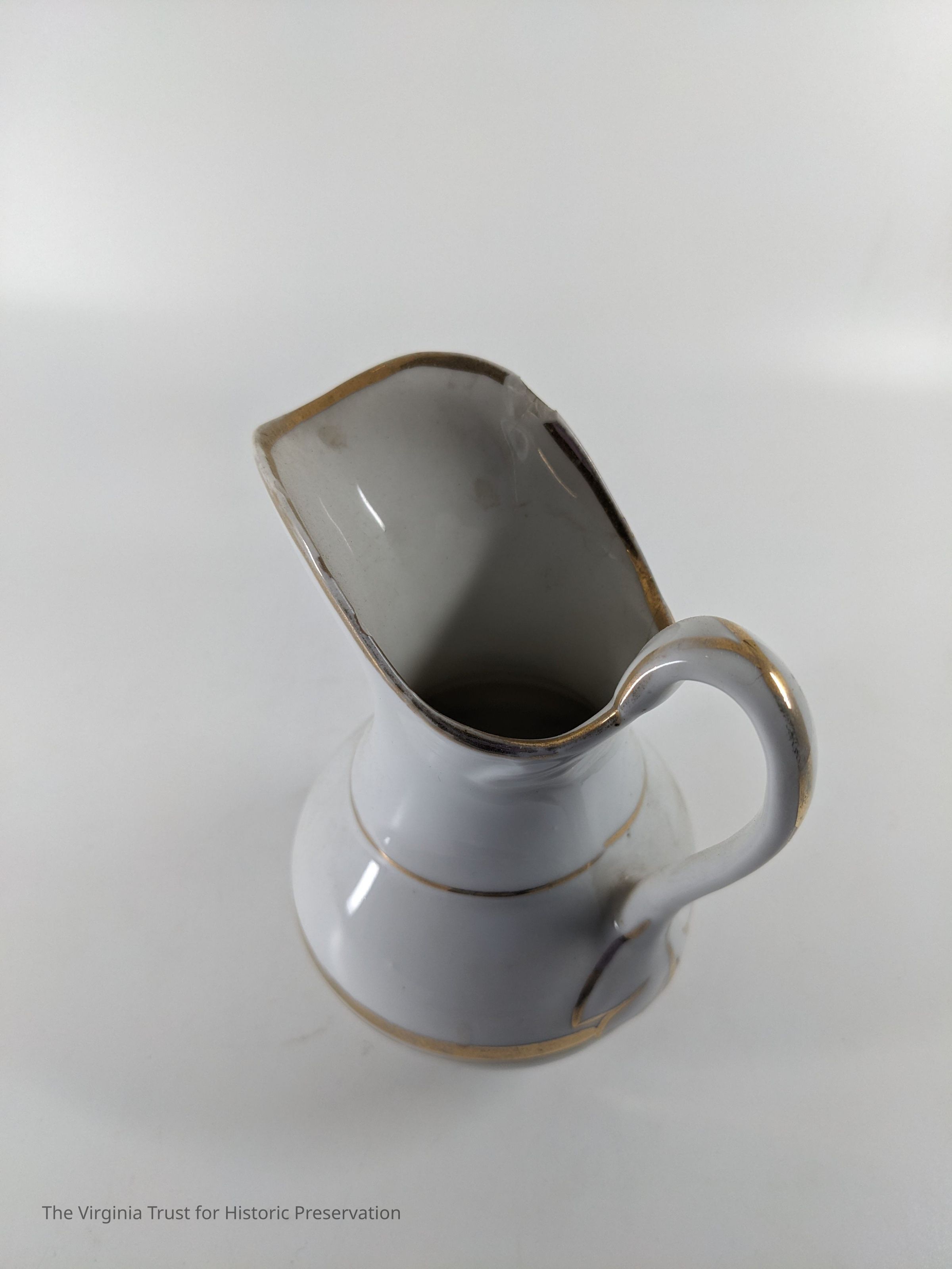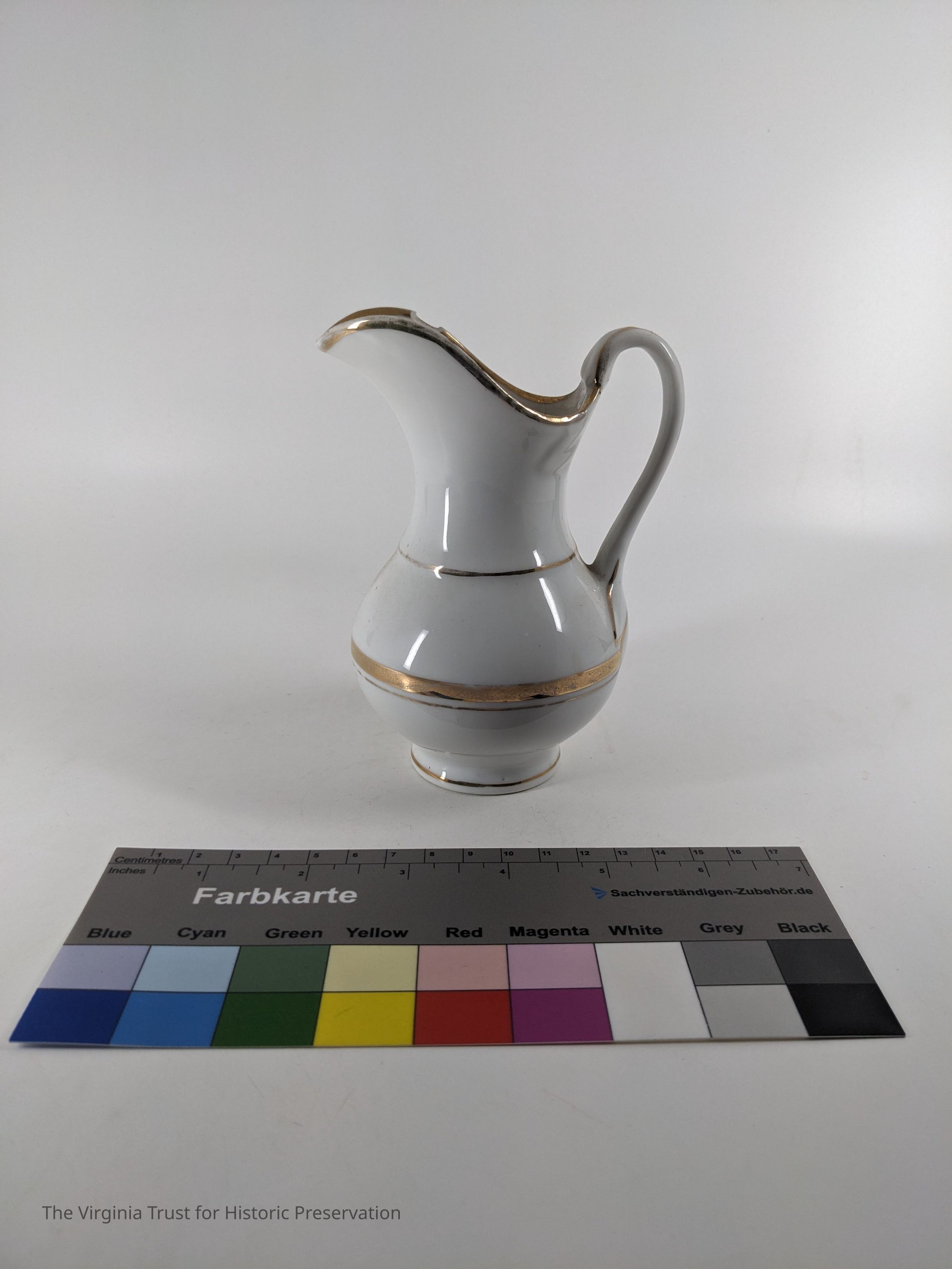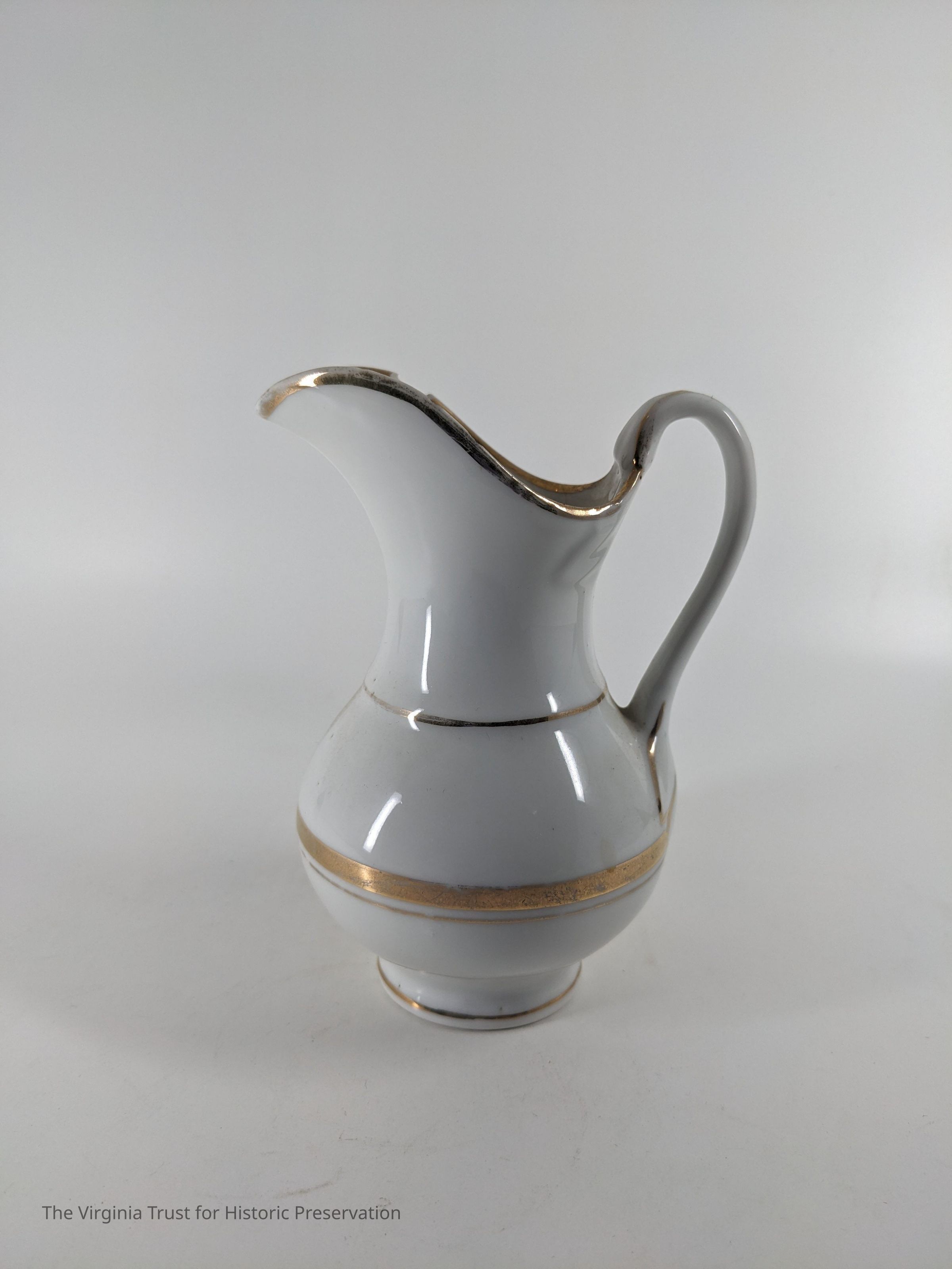 White ceramic miniature pitcher with gold bands around lip, middle section, and foot.