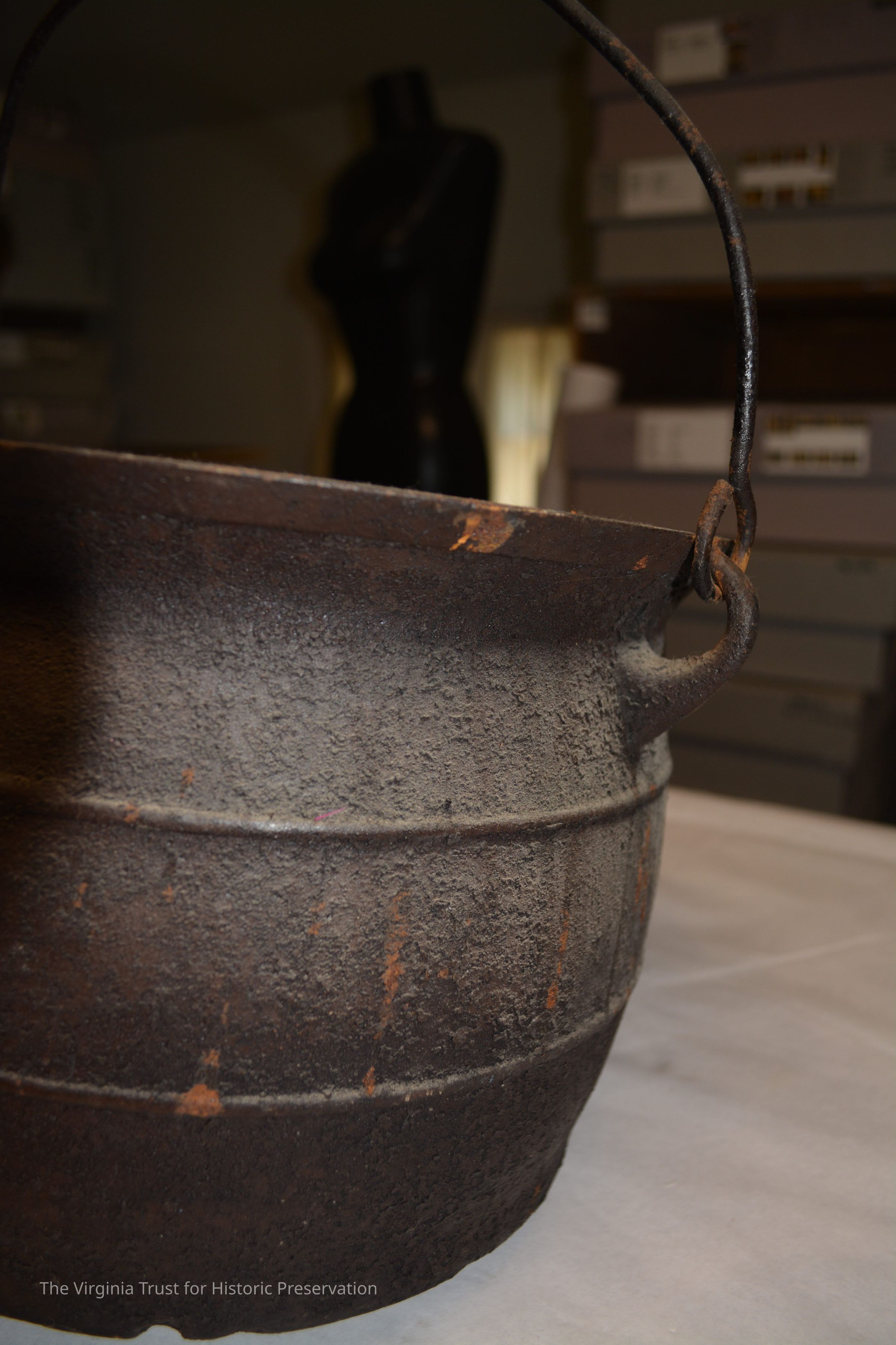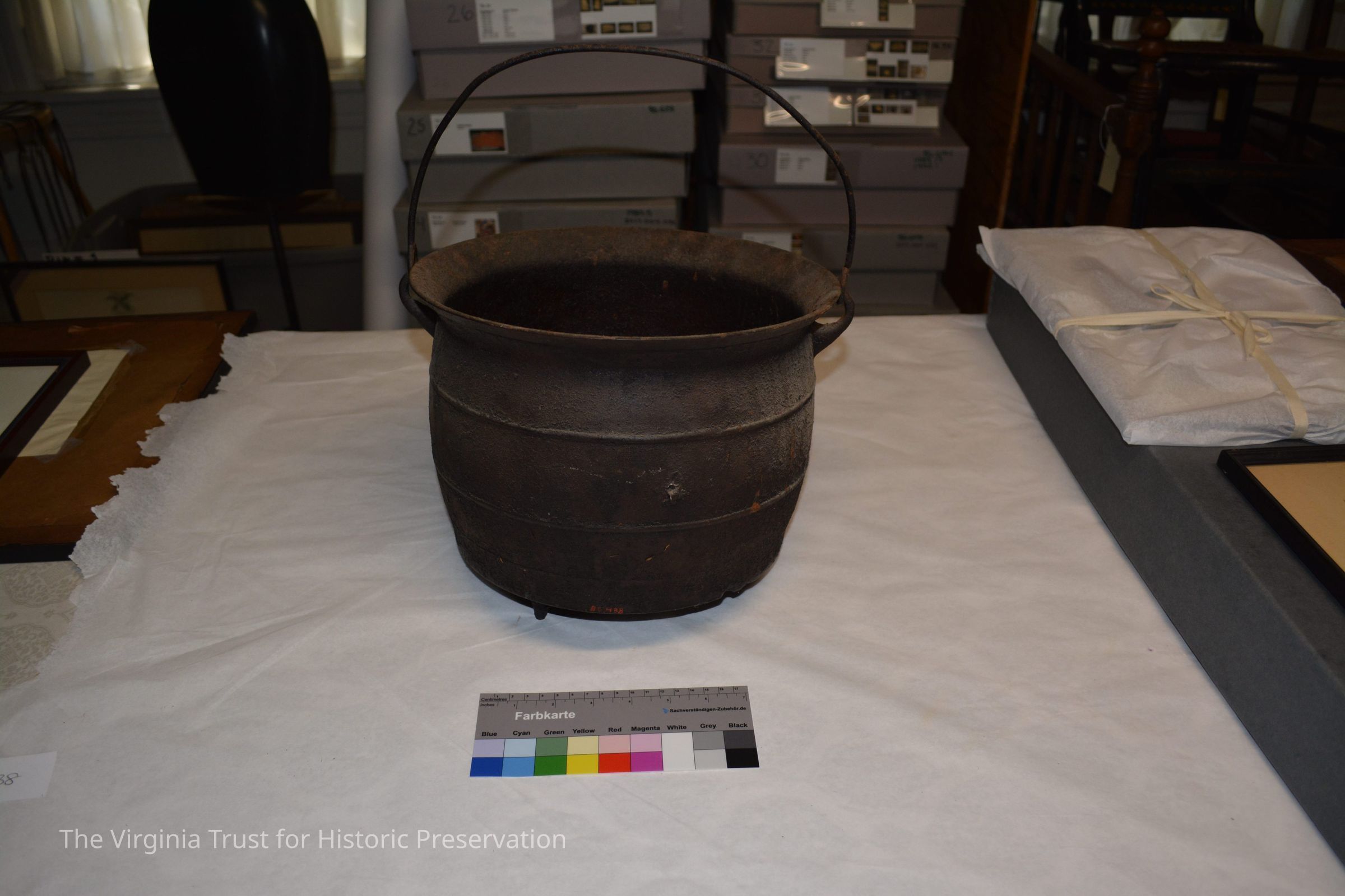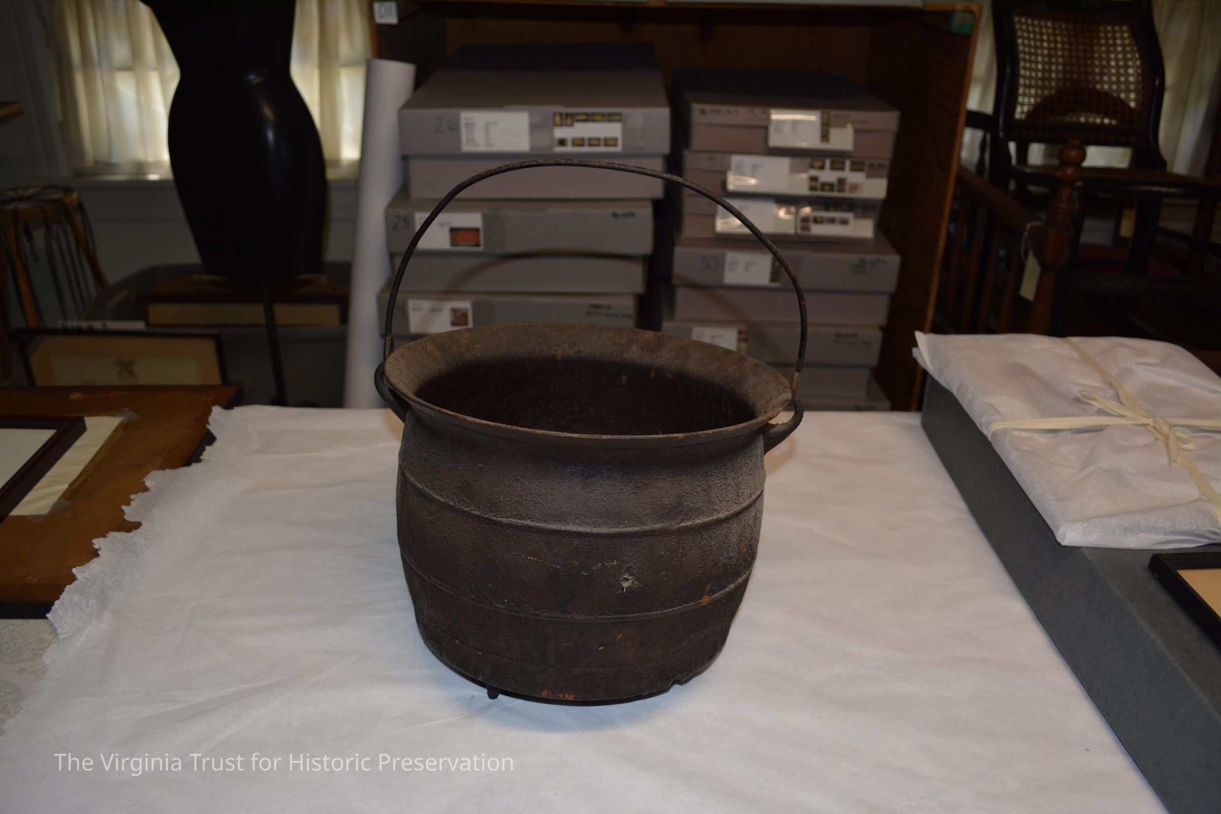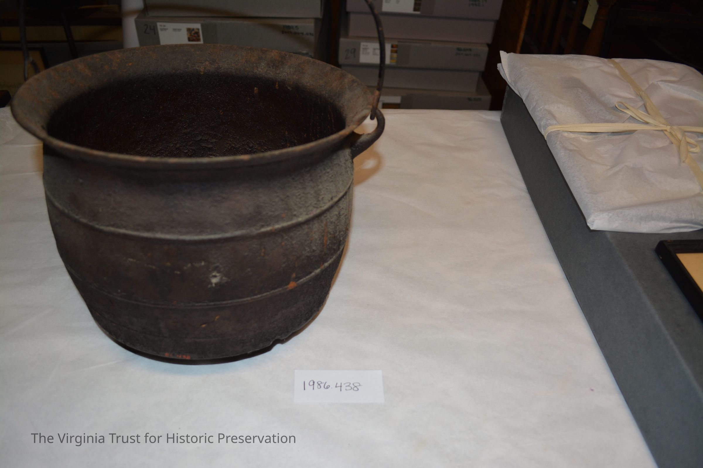 Large cast iron cooking pot (donated by B.H. Full) came from Richard Lee II home and present gravesite of Richard Lee II, Thomas Lee of Stratford, and Richard Henry Lee. Found in 1950 in debris of Lee home (Machodoc) near Hague, Westmoreland County, VA. Home had burned down several years earlier.Exhibition