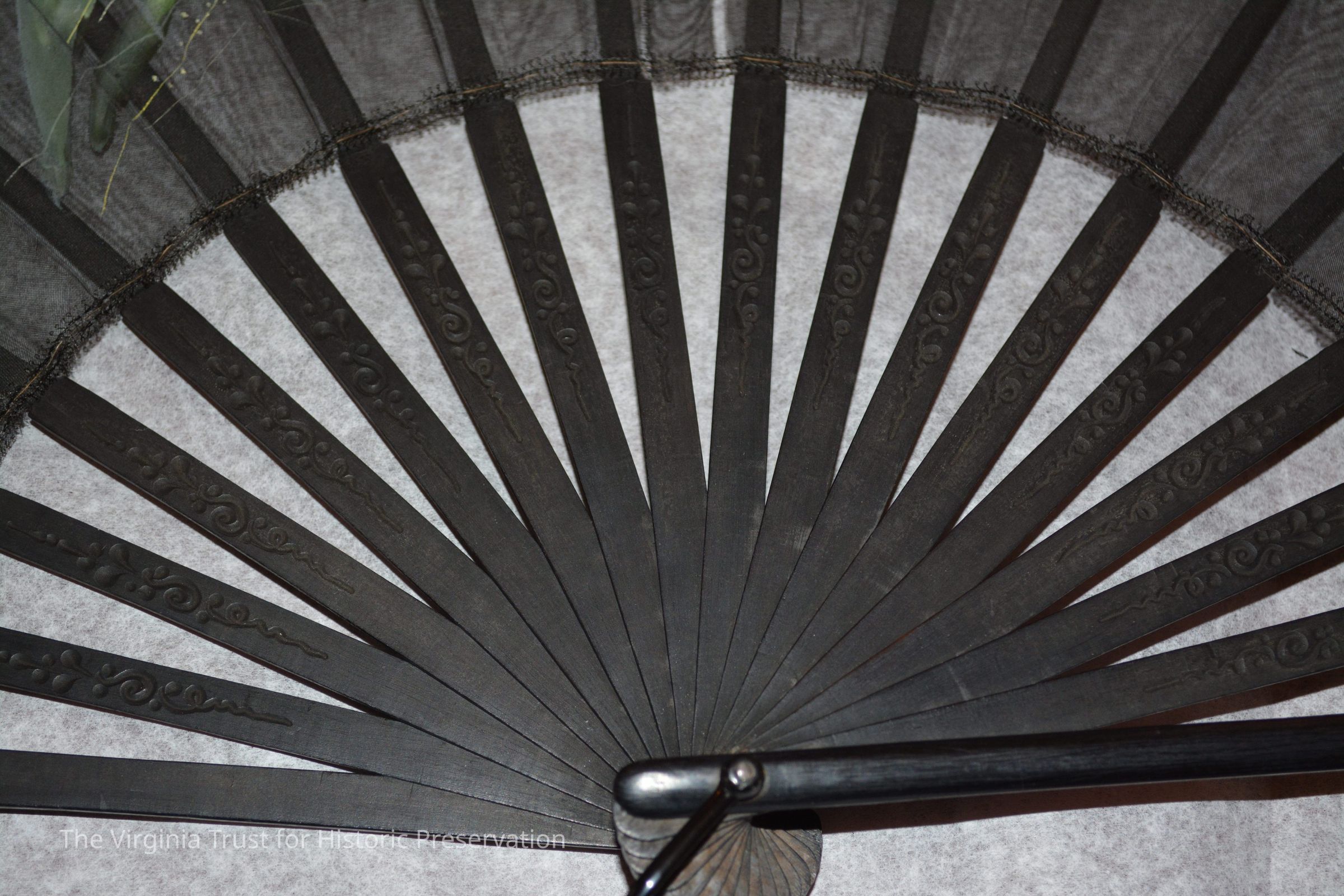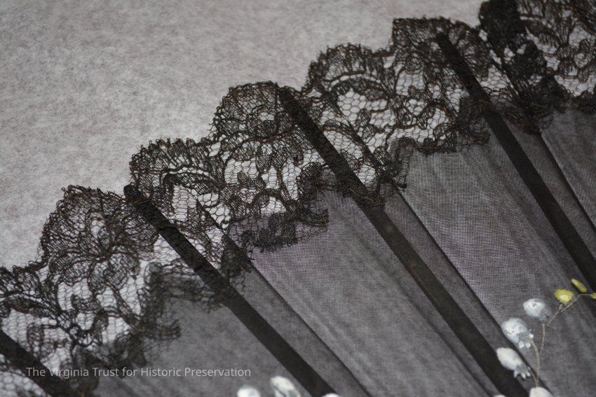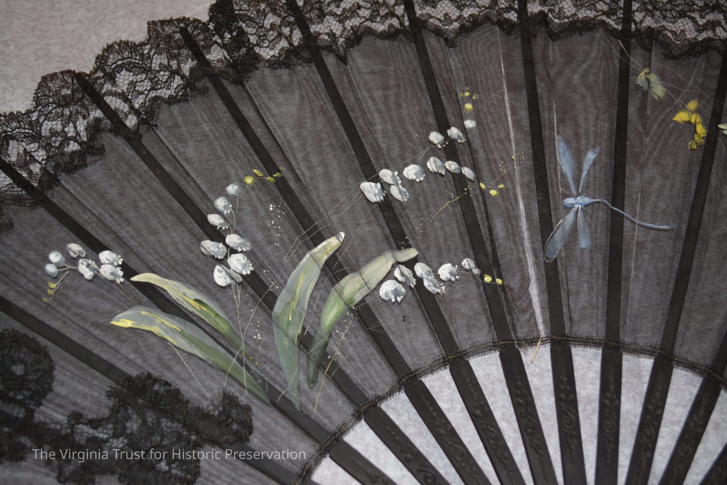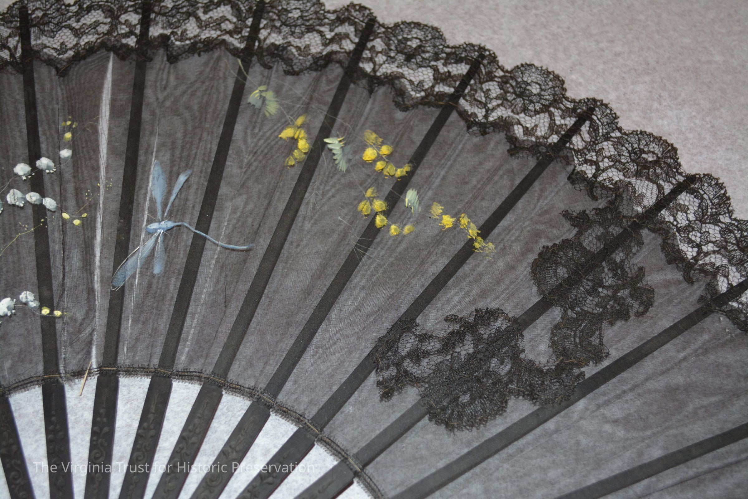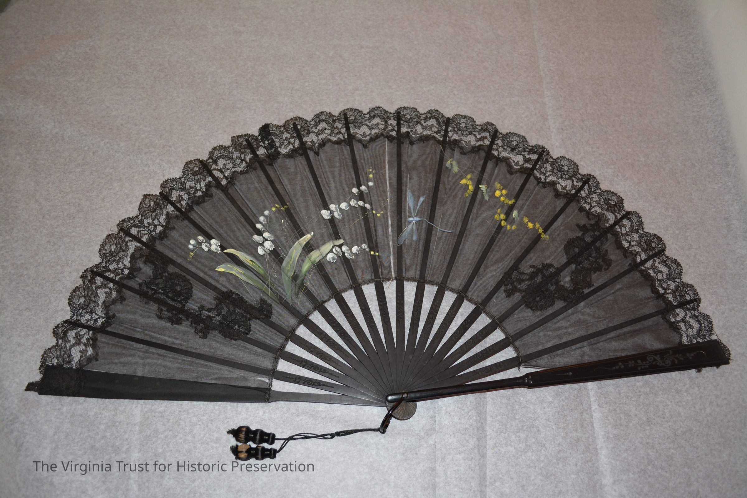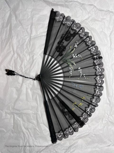 Black hand fan with painted flowers and dragonfly. 2" lace border hand-sewn to body of fan. Tassel on bottom of fan, two wood beads covered with silk.