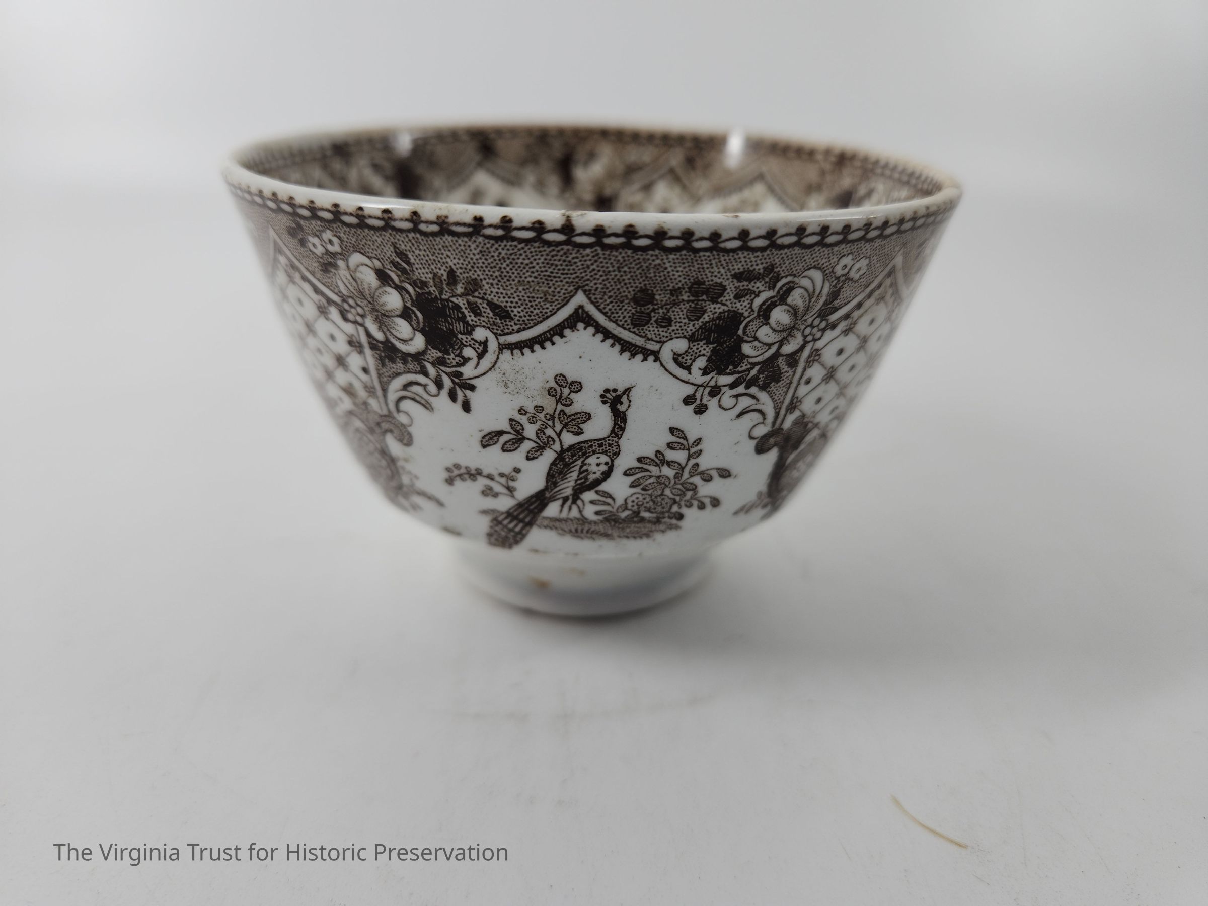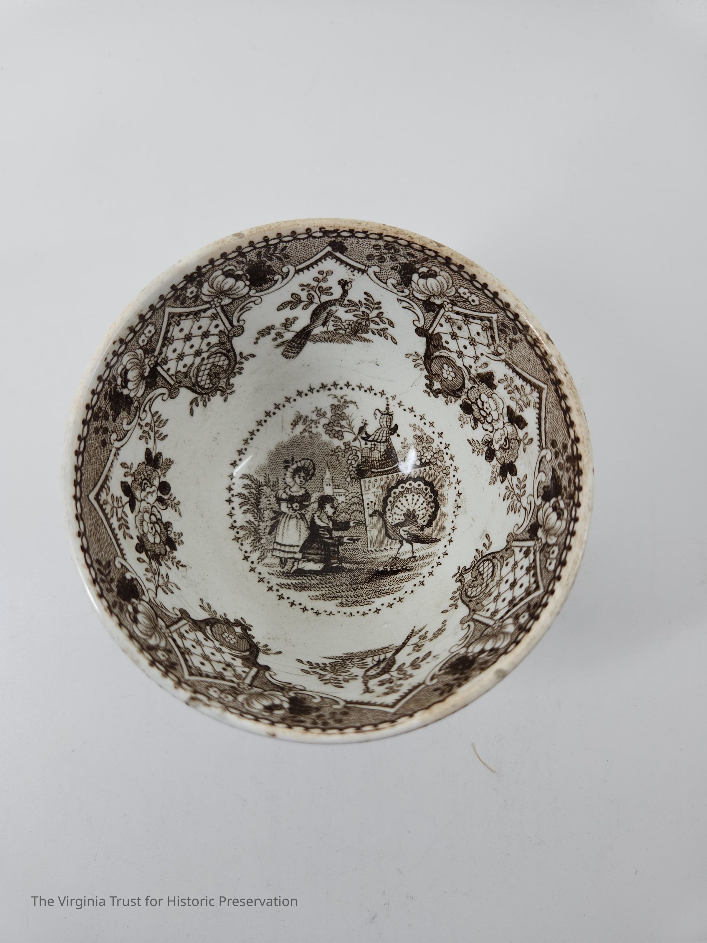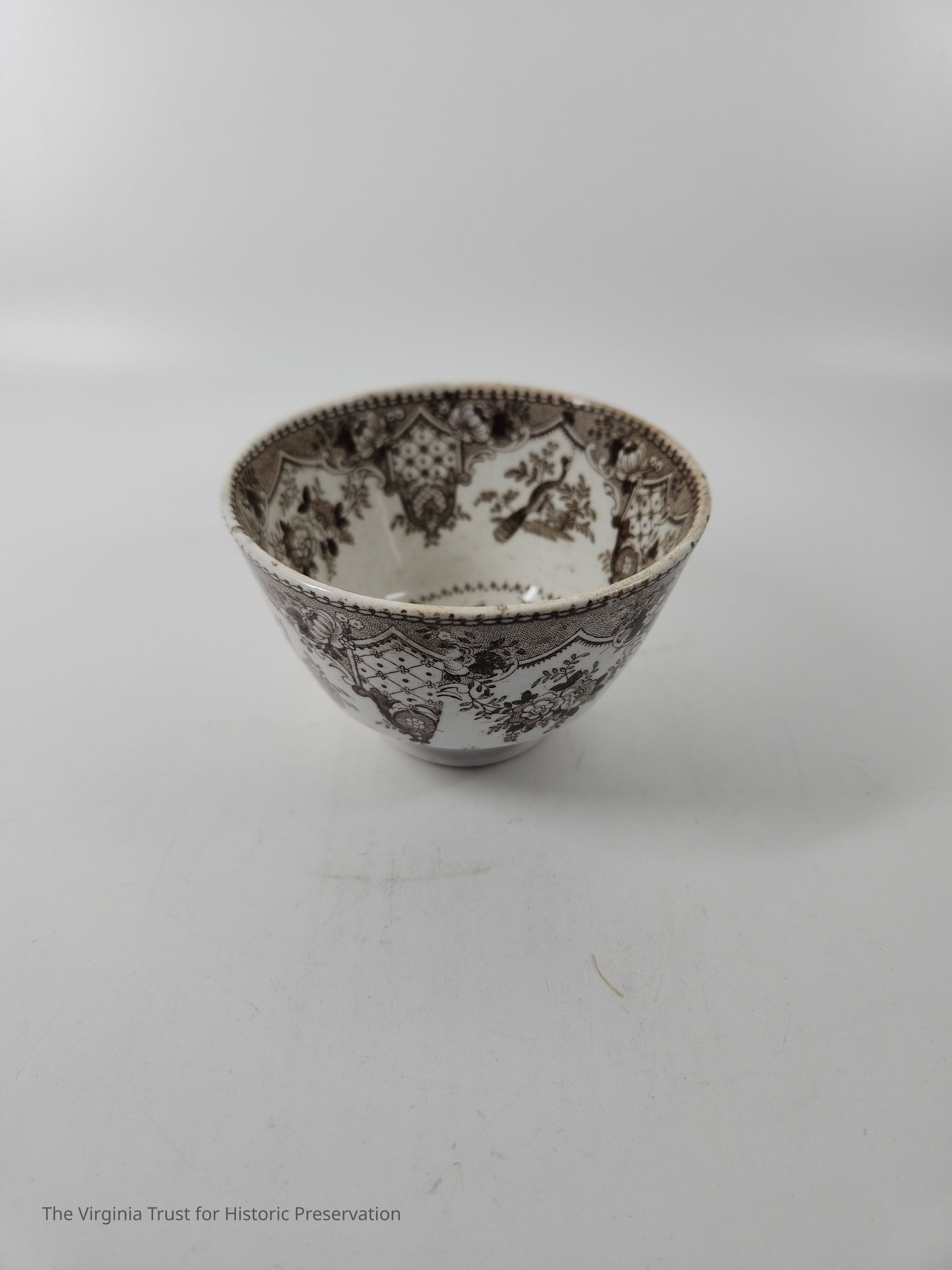 Handleless cup. Brown and white design. Marked "ANB" on the bottom in black. Design depicts children with a peacock. Peacocks and flowers alternate around the rim. Same as C.