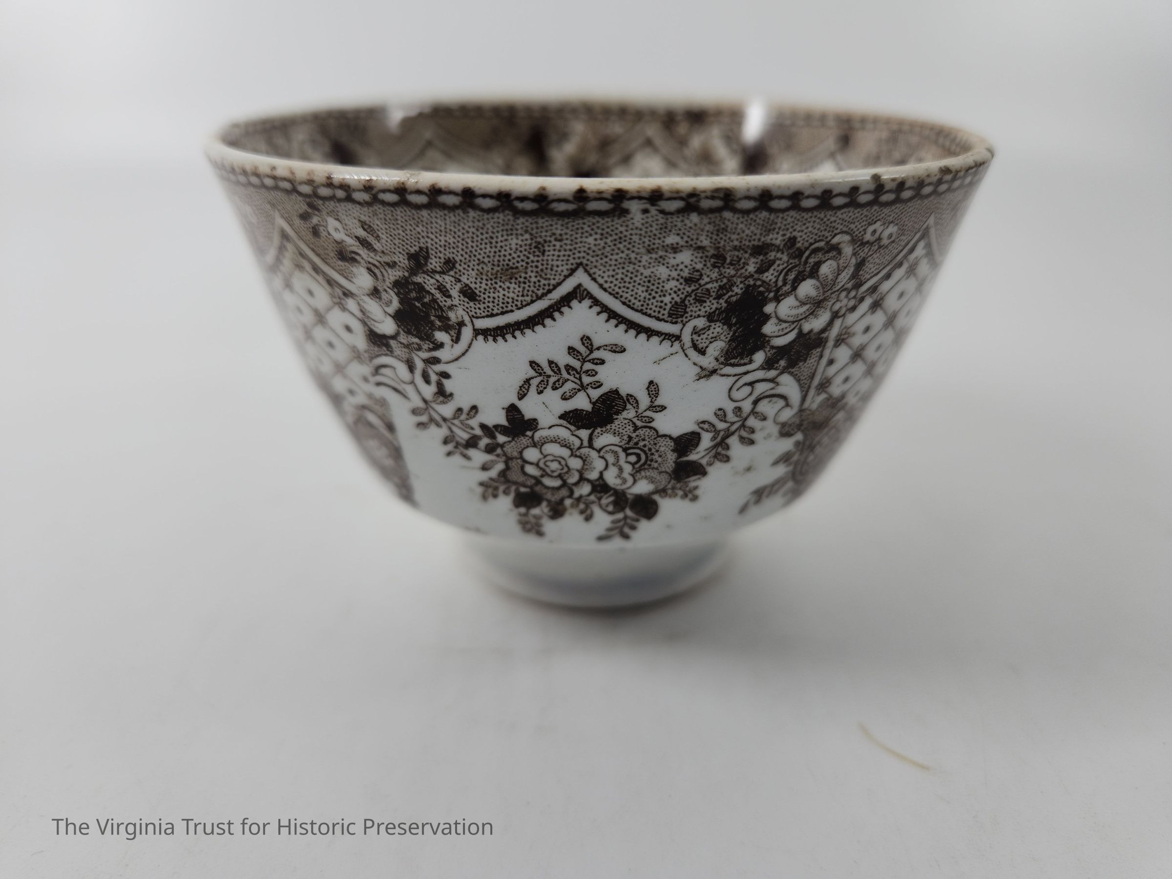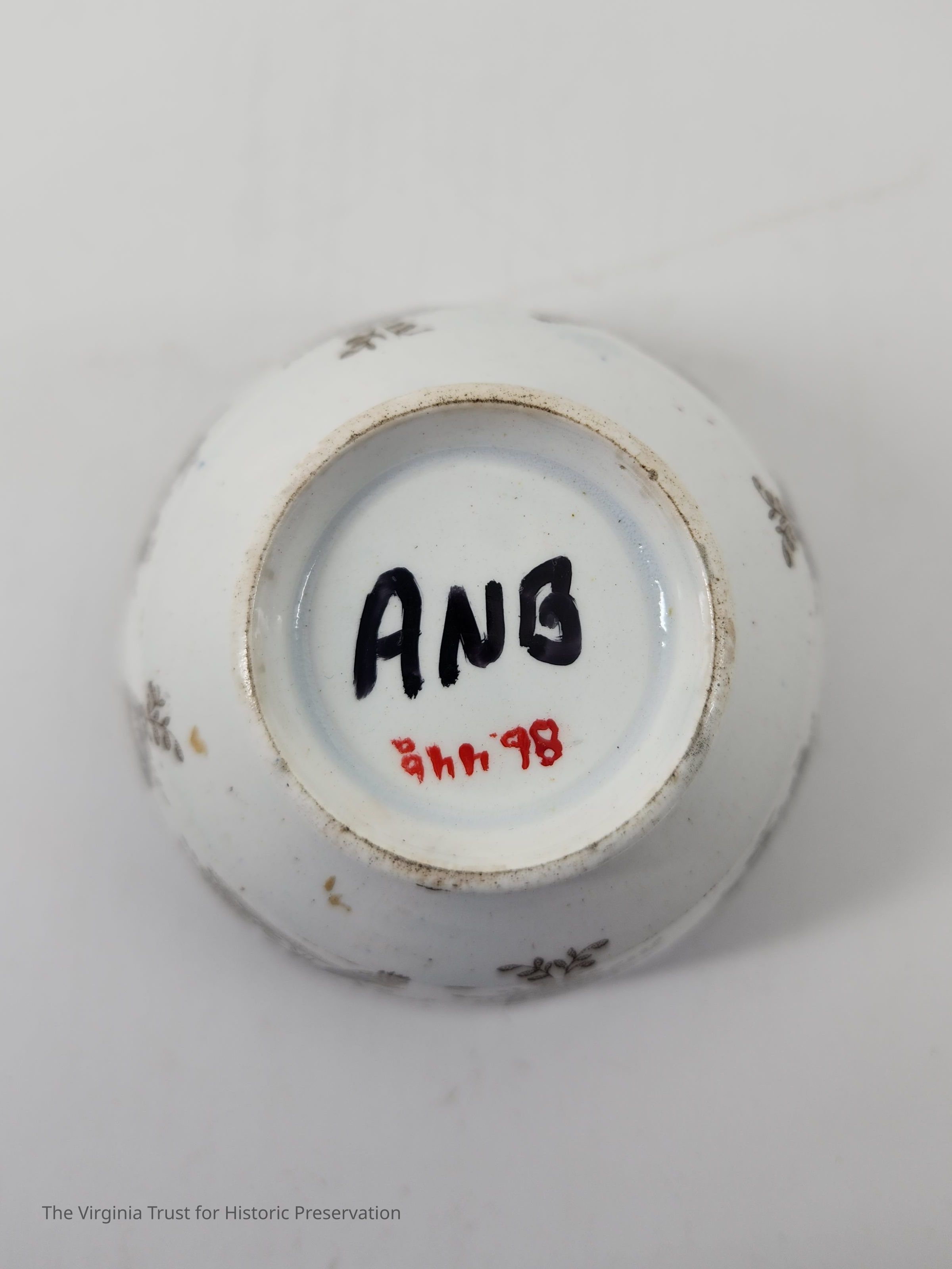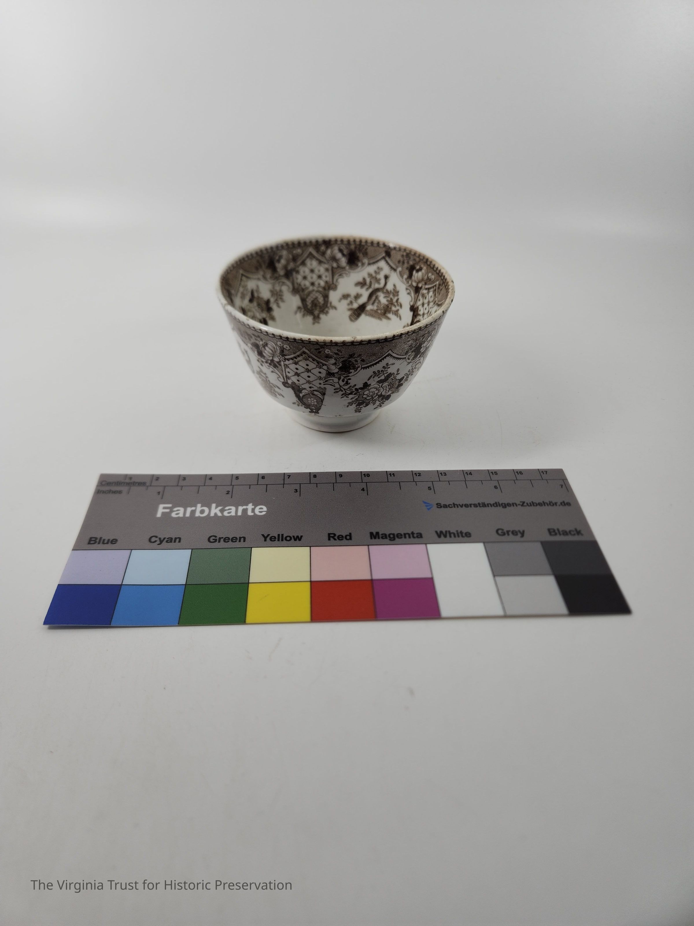 Handleless cup. Brown and white design. Marked "ANB" on the bottom in black. Design depicts children with a peacock. Peacocks and flowers alternate around the rim. Same as C.