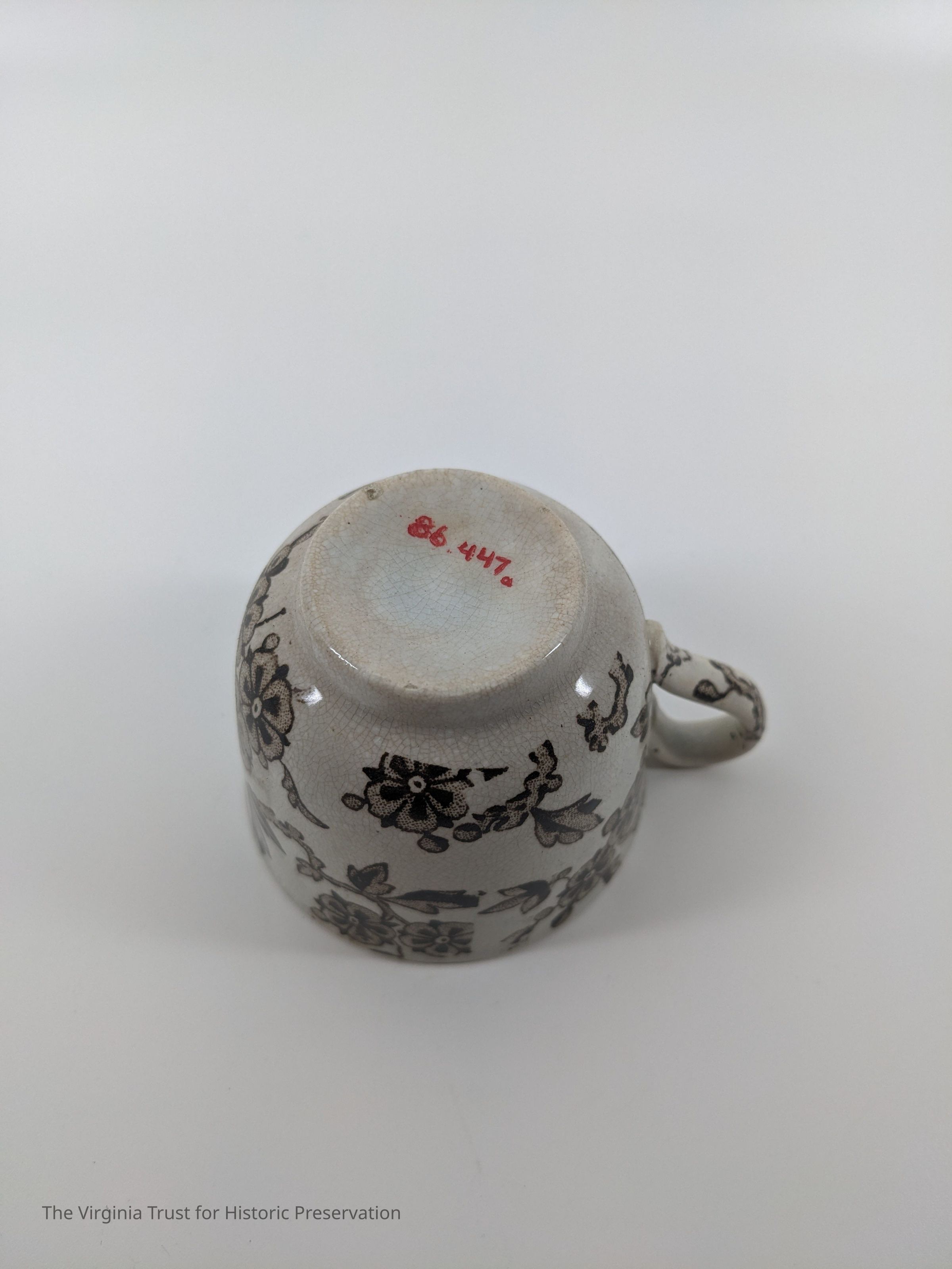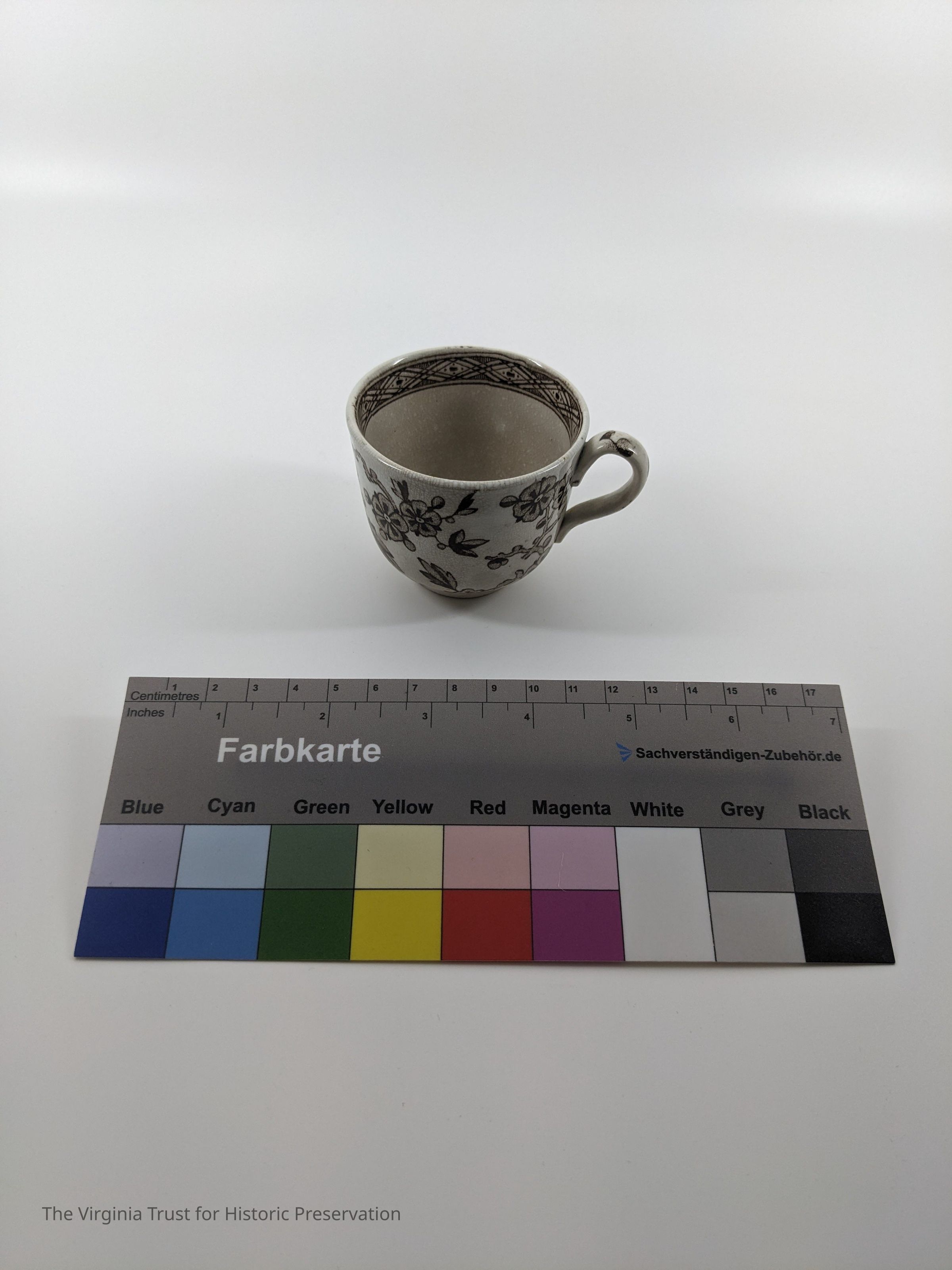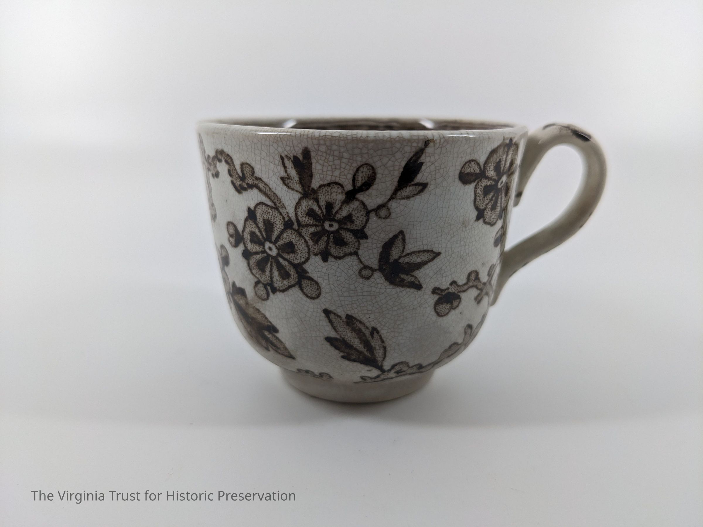 Part of a tea set. A-E teacups. White with brown floral design. The interior of A is light brown.