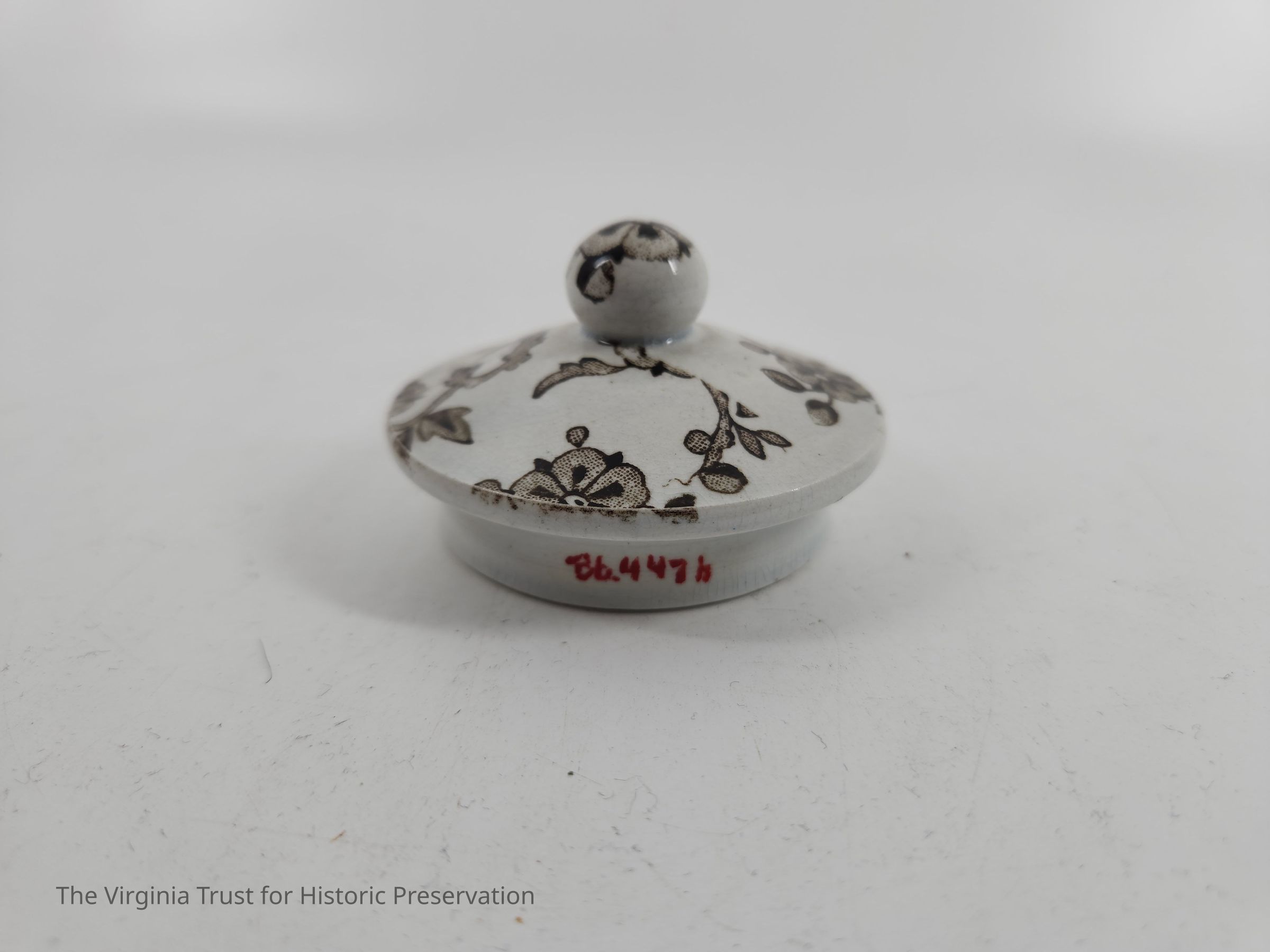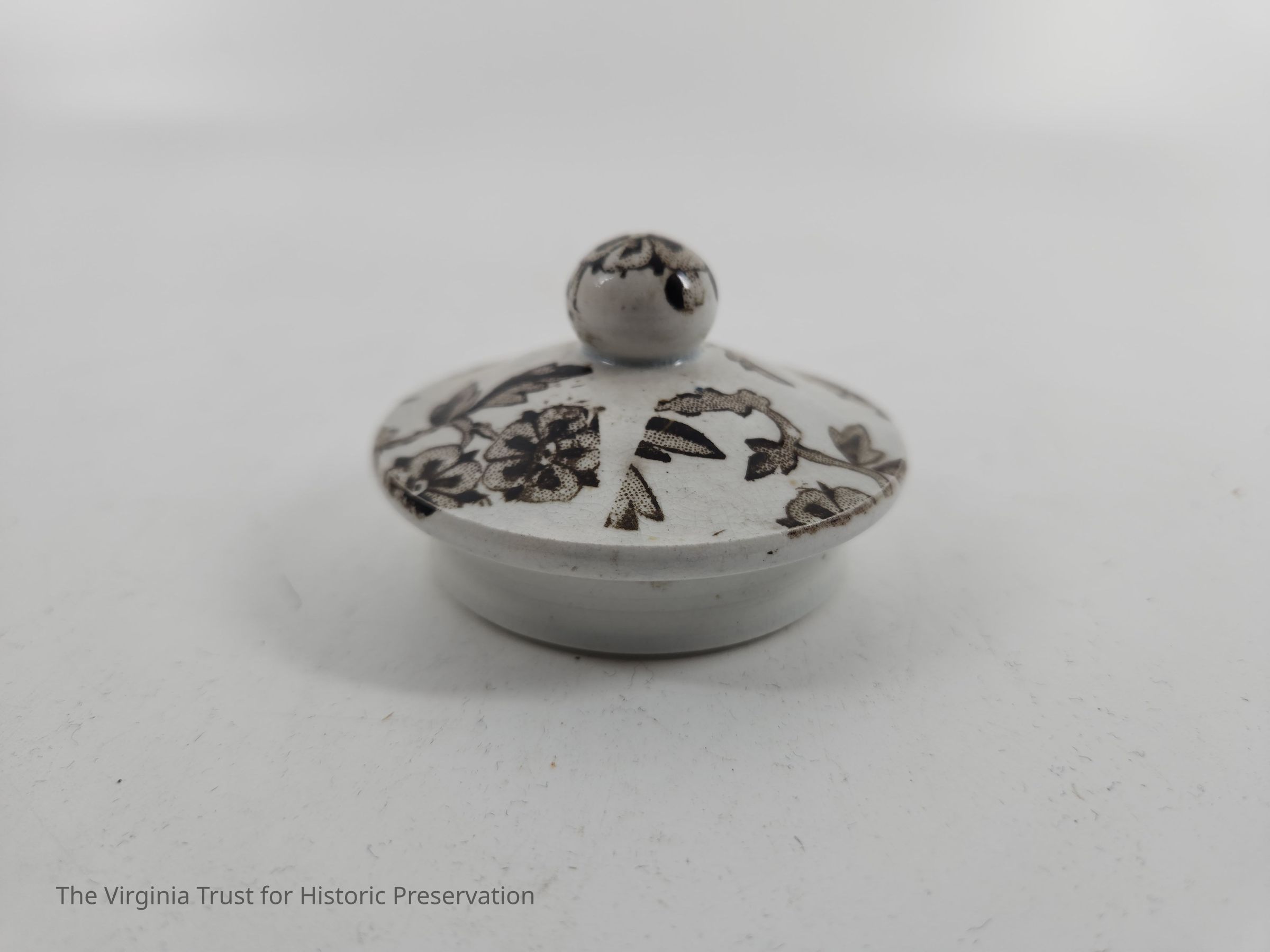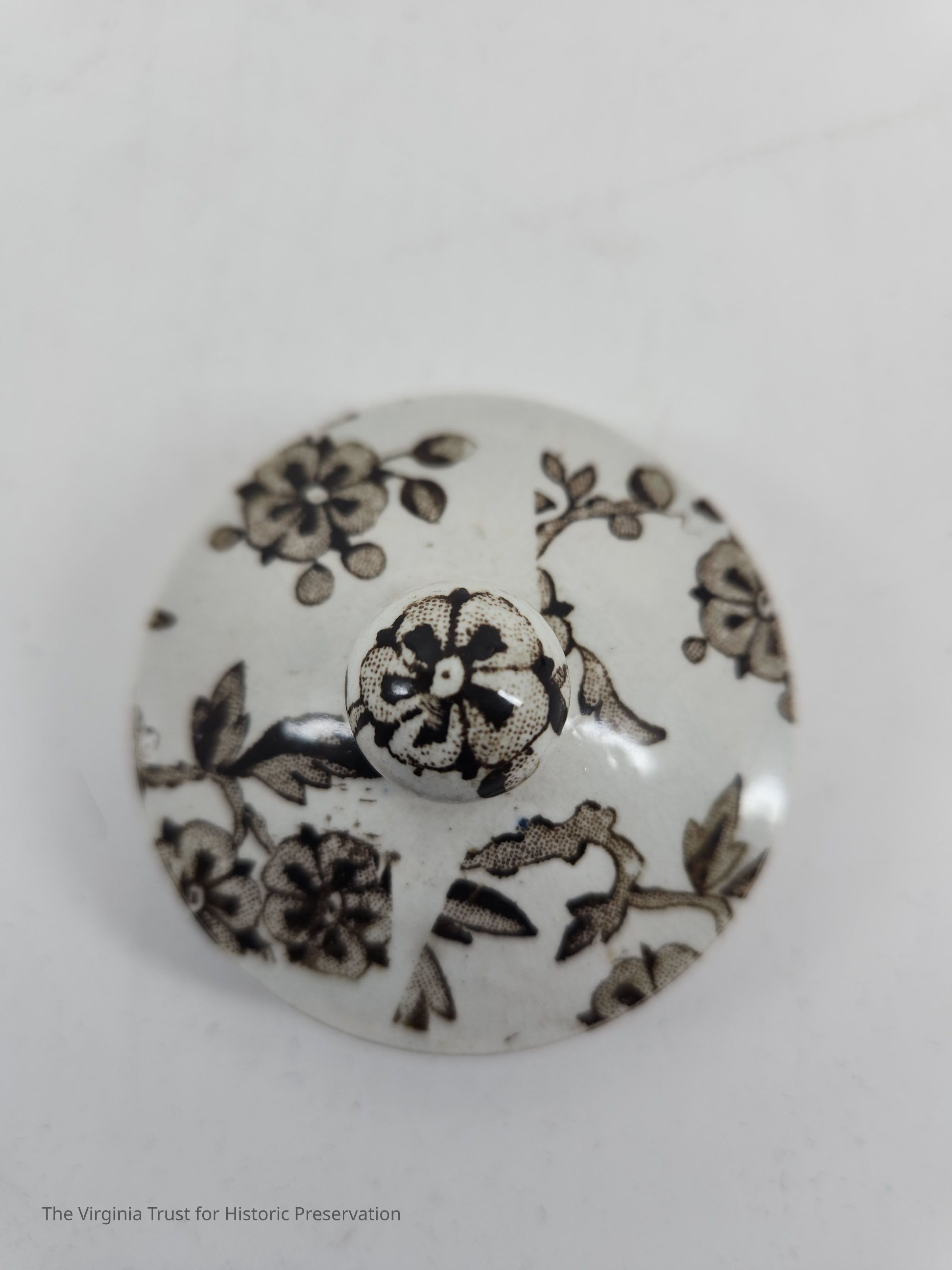 Lid to sugar bowl. White with brown floral design.