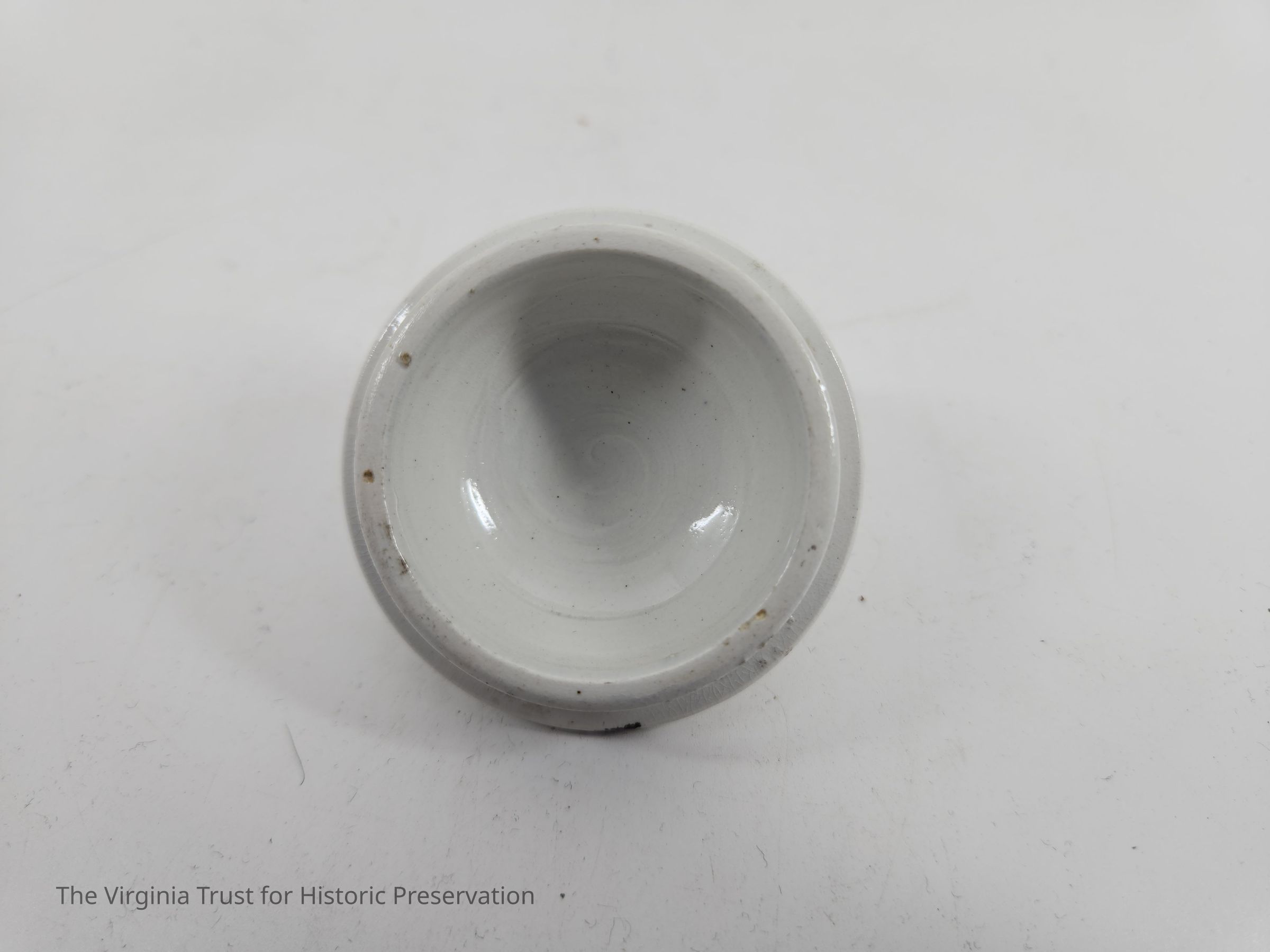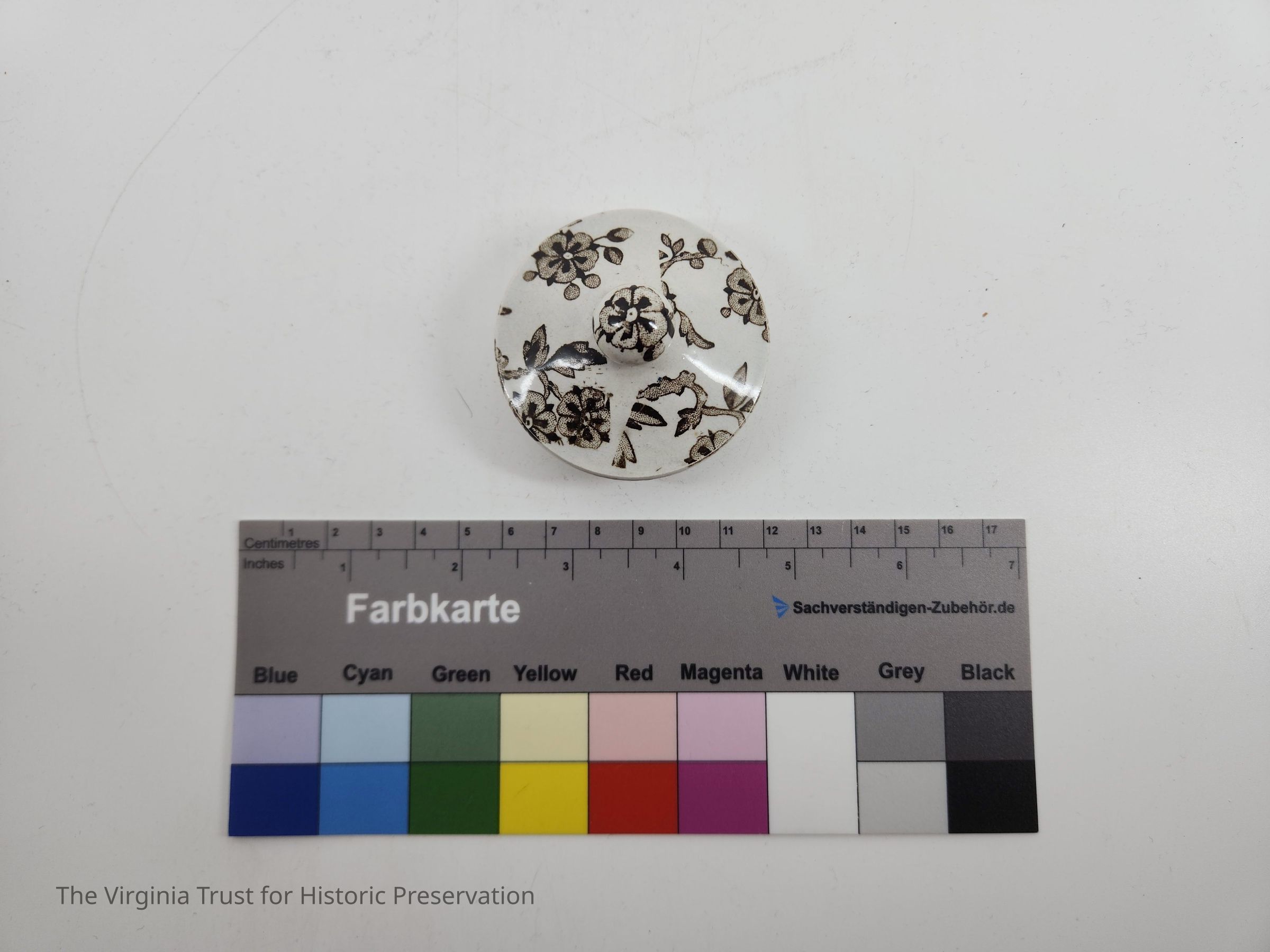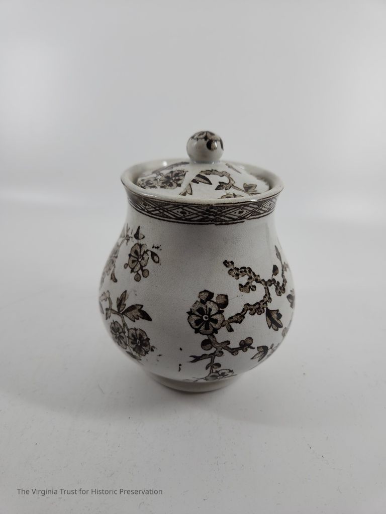Lid to sugar bowl. White with brown floral design.