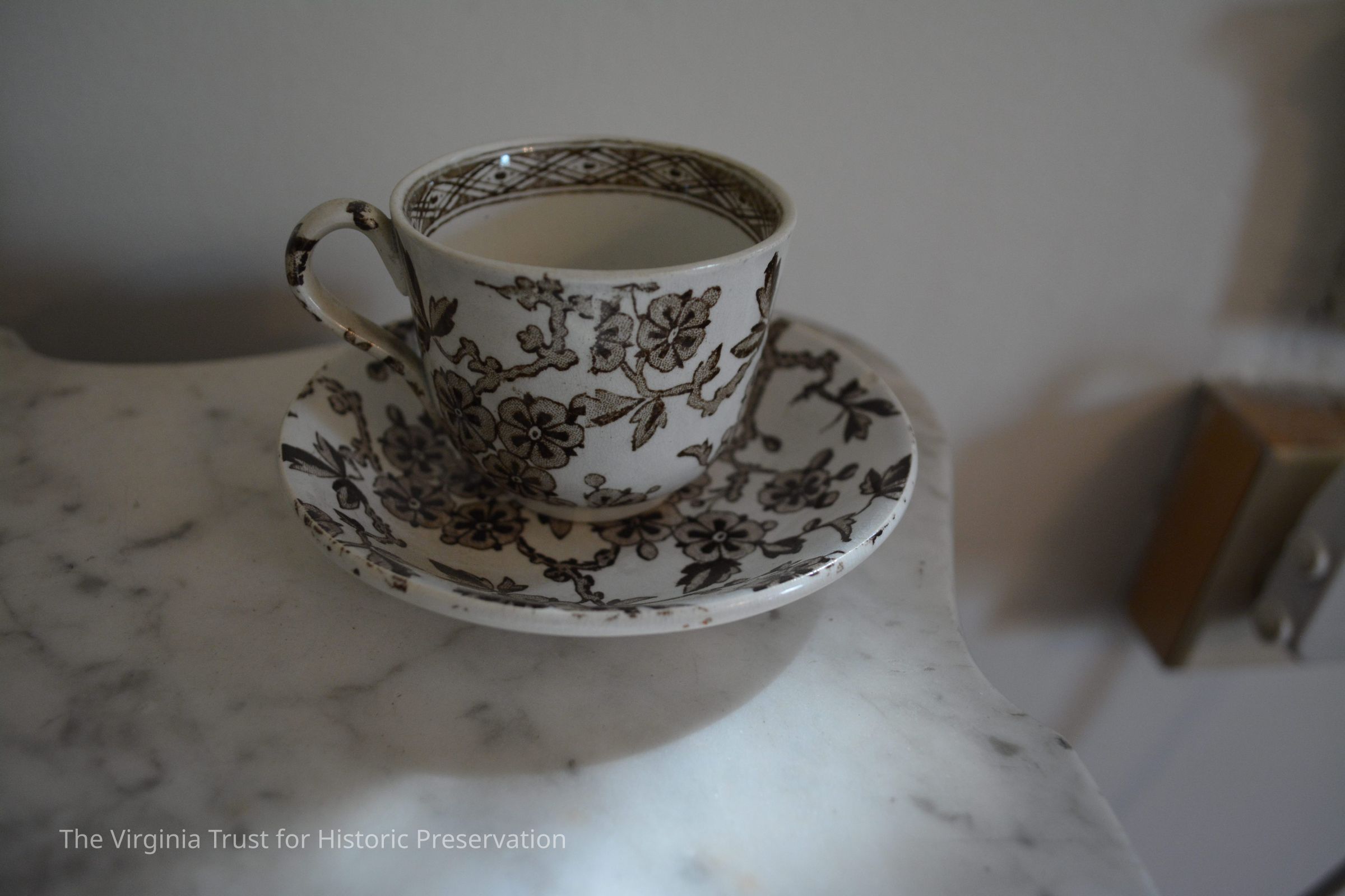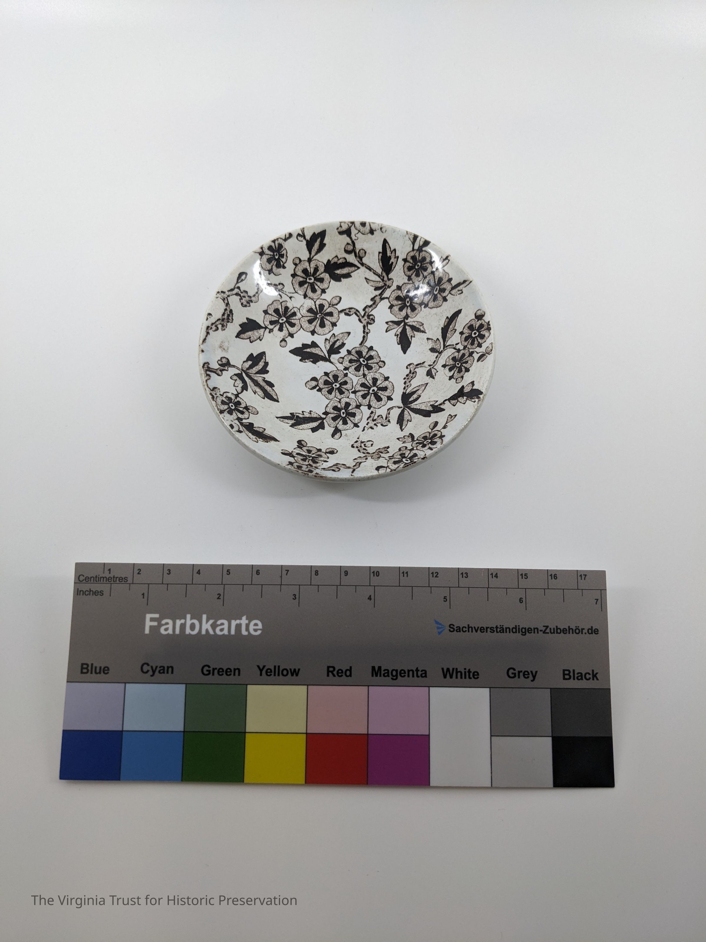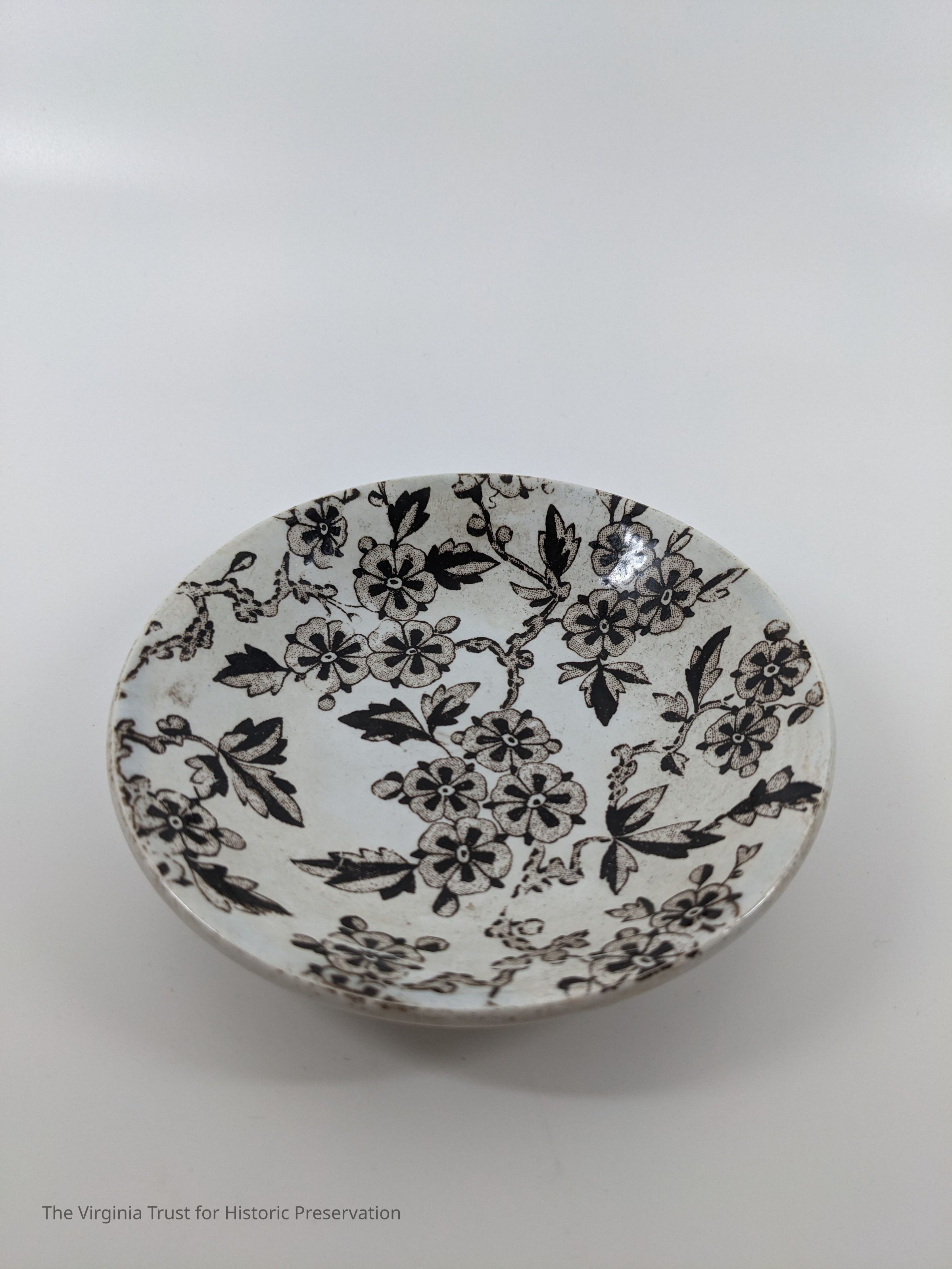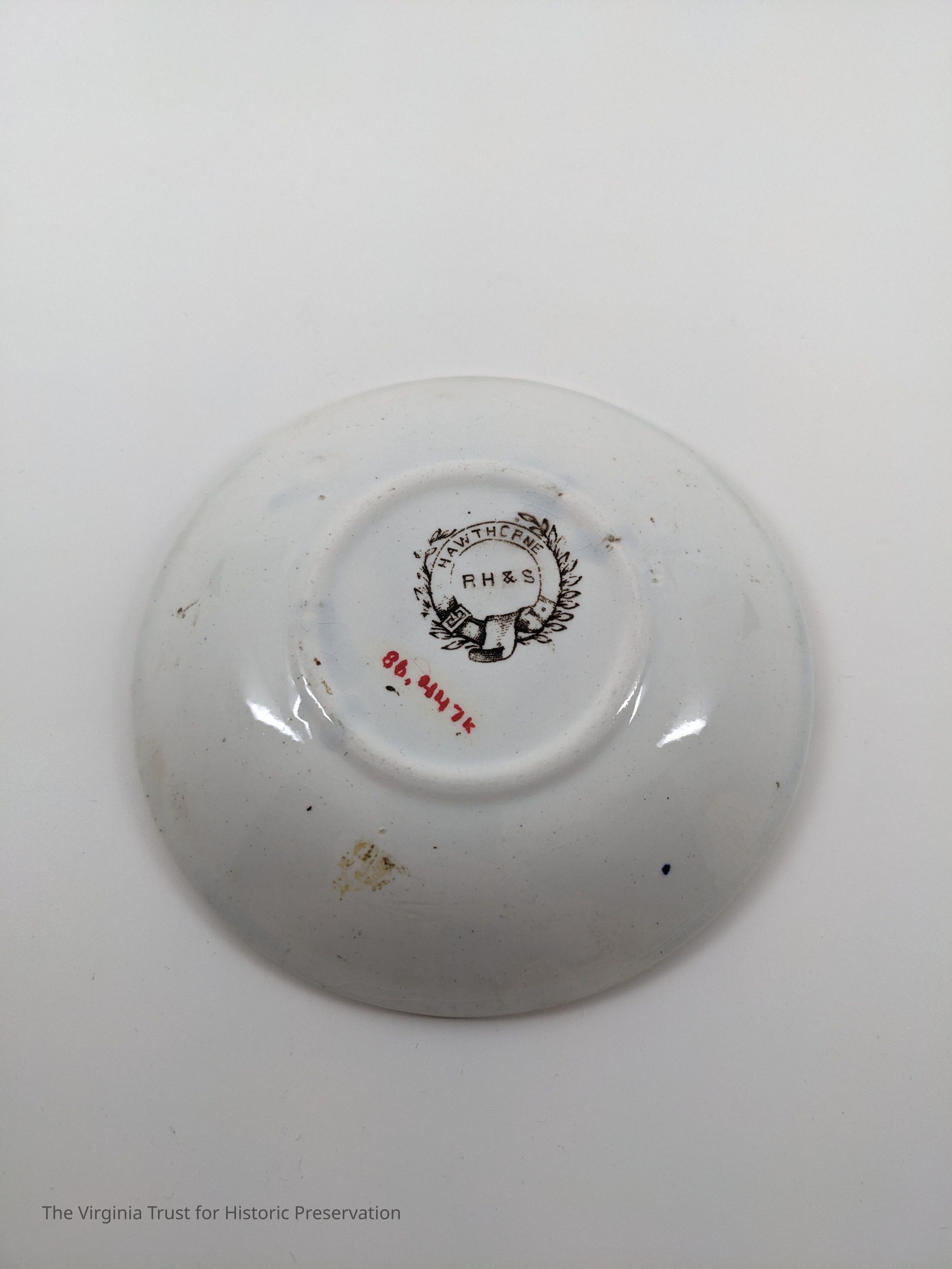 Small saucer. White with brown floral design. Marked "Hawthorne RH & S."