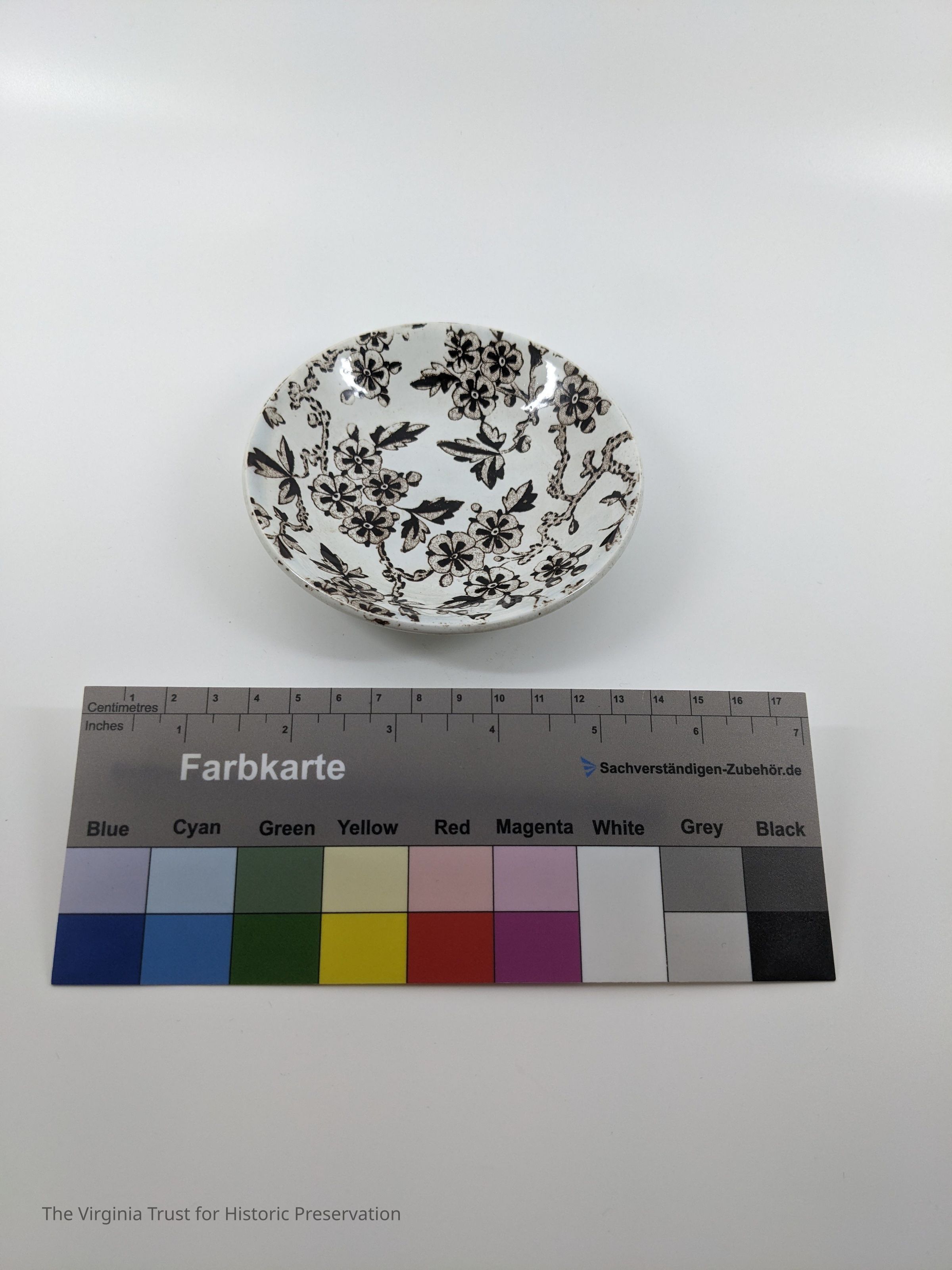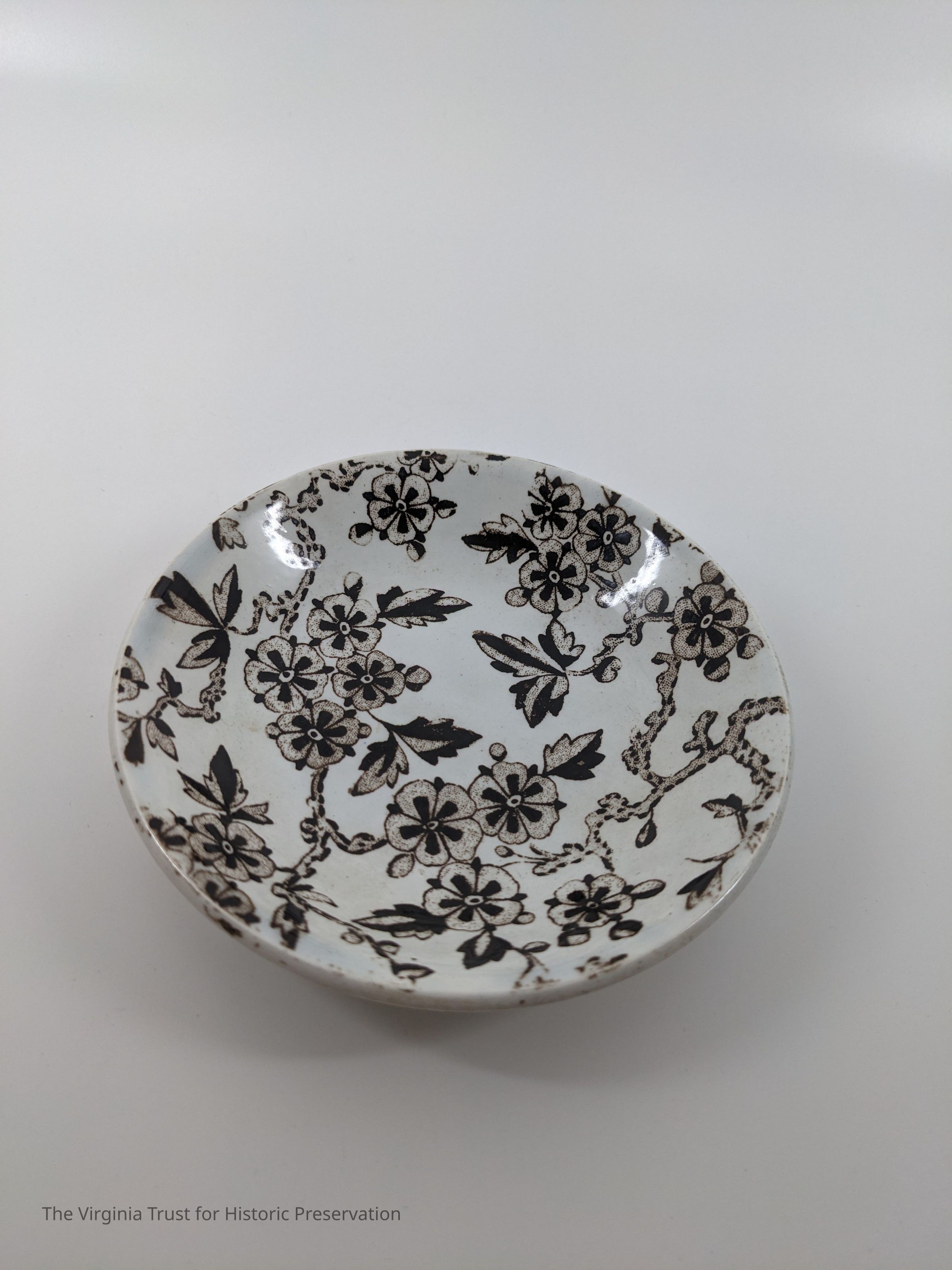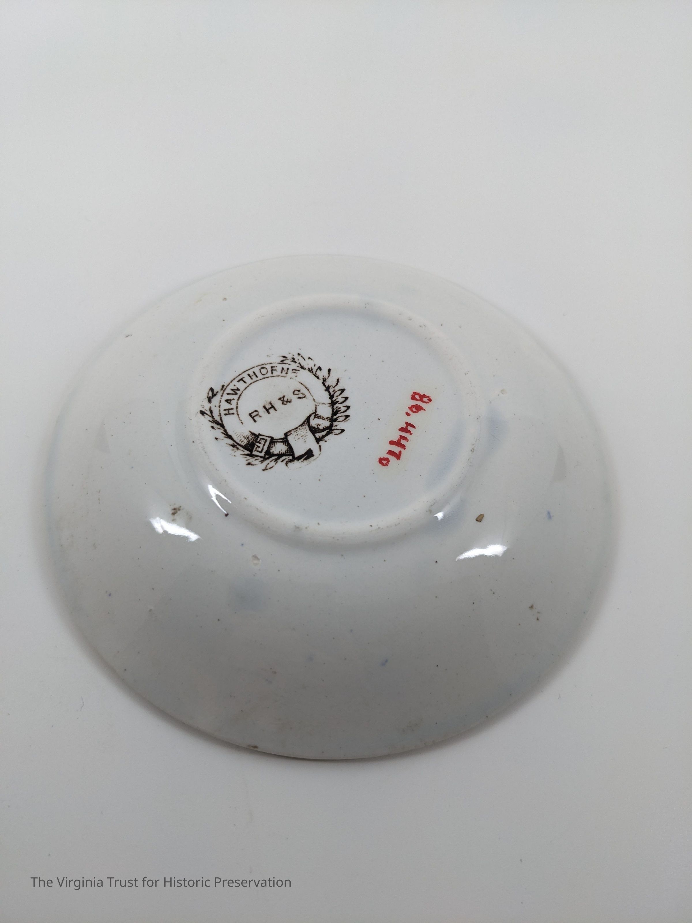 Small saucer. White with brown floral design. Marked "Hawthorne RH & S."