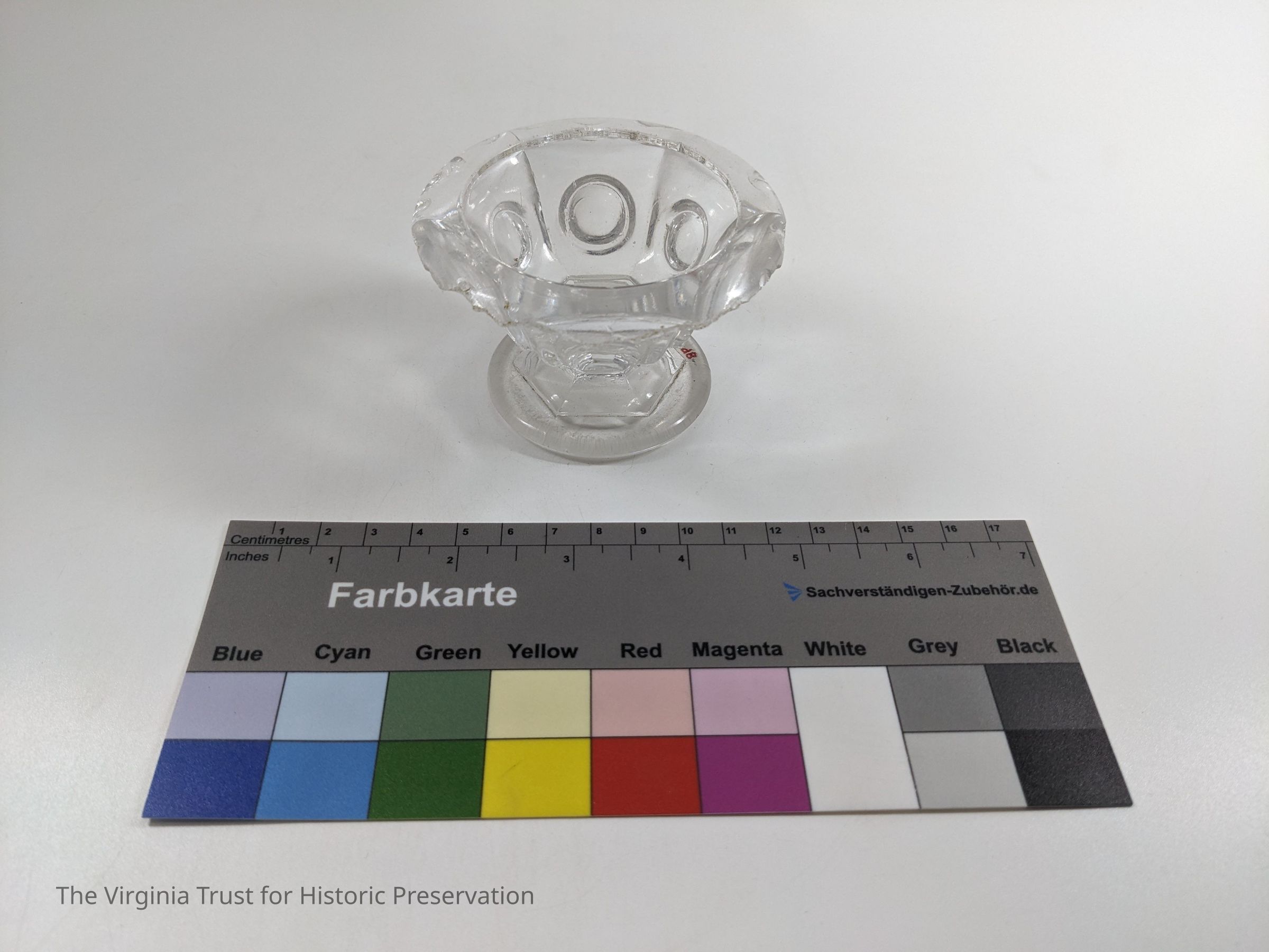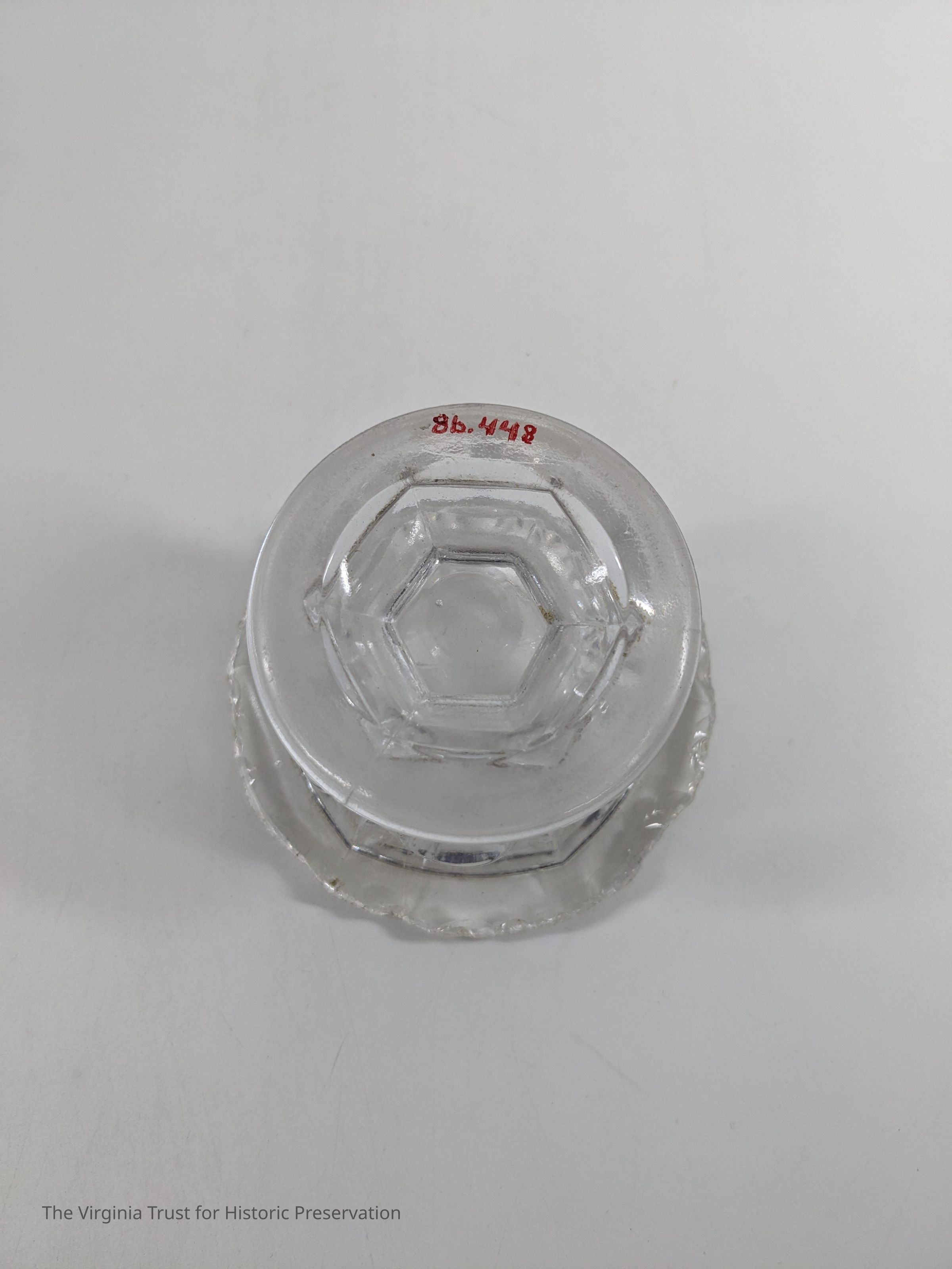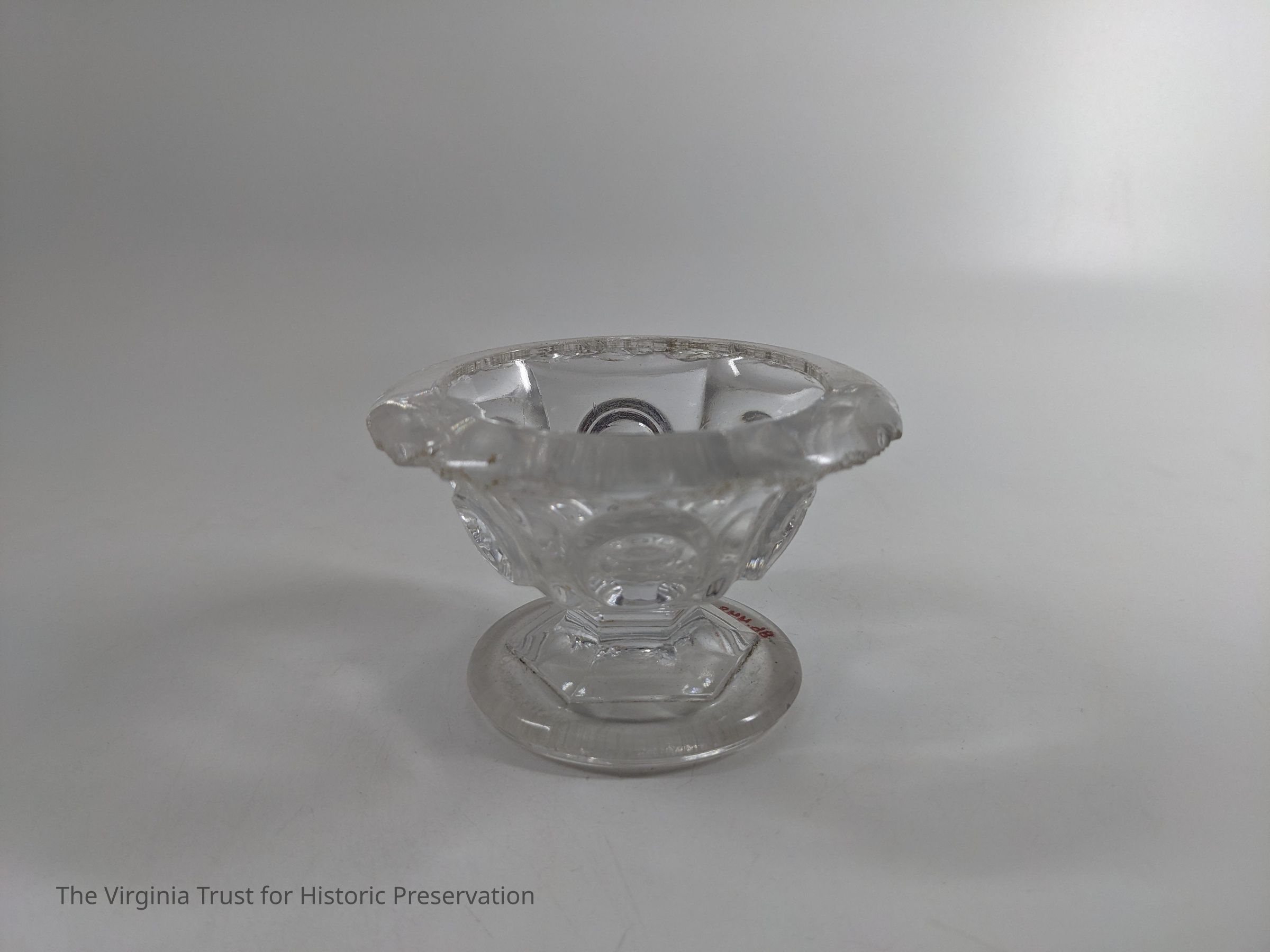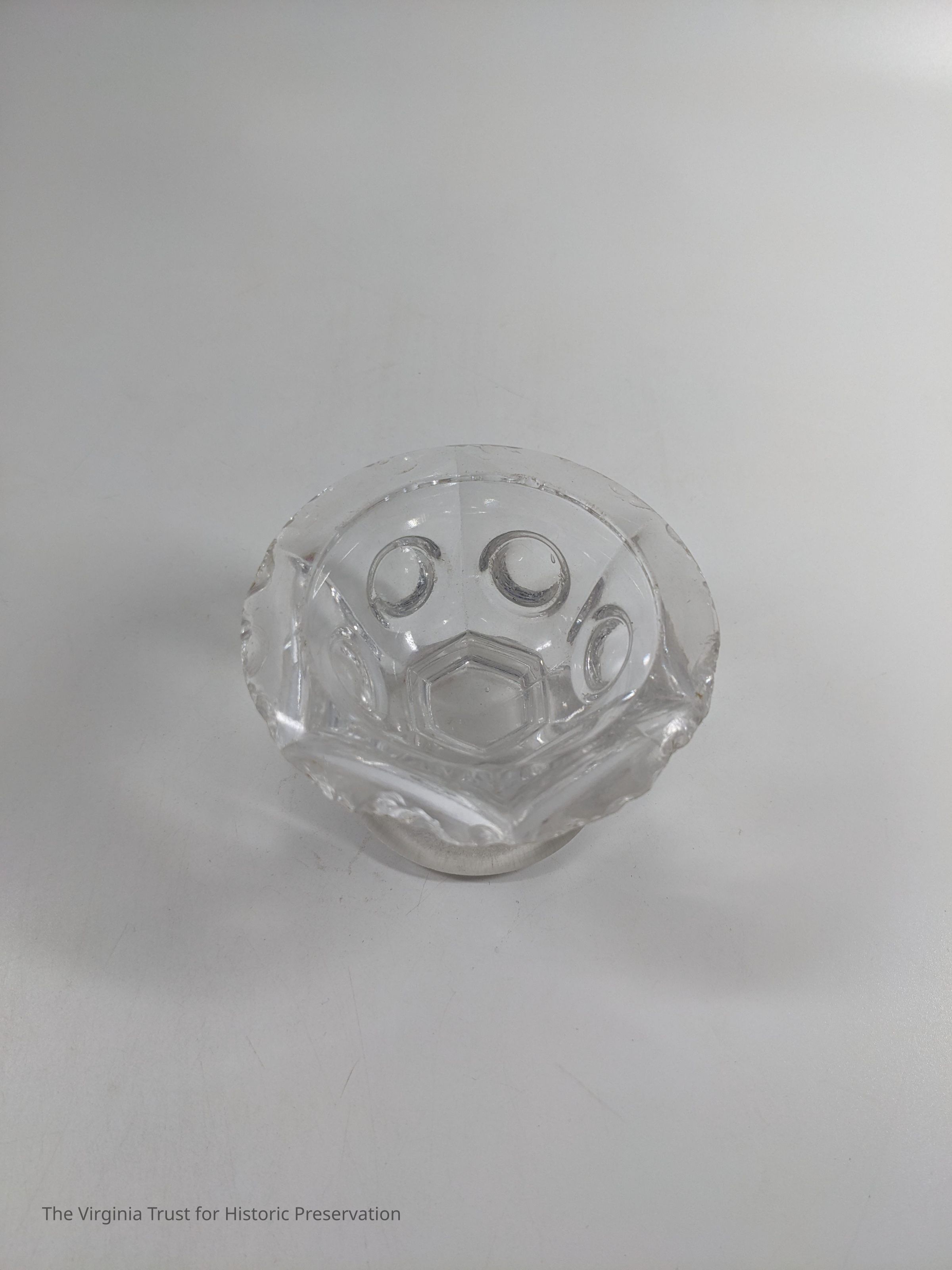 Clear glass salt dip with a thumb print design.