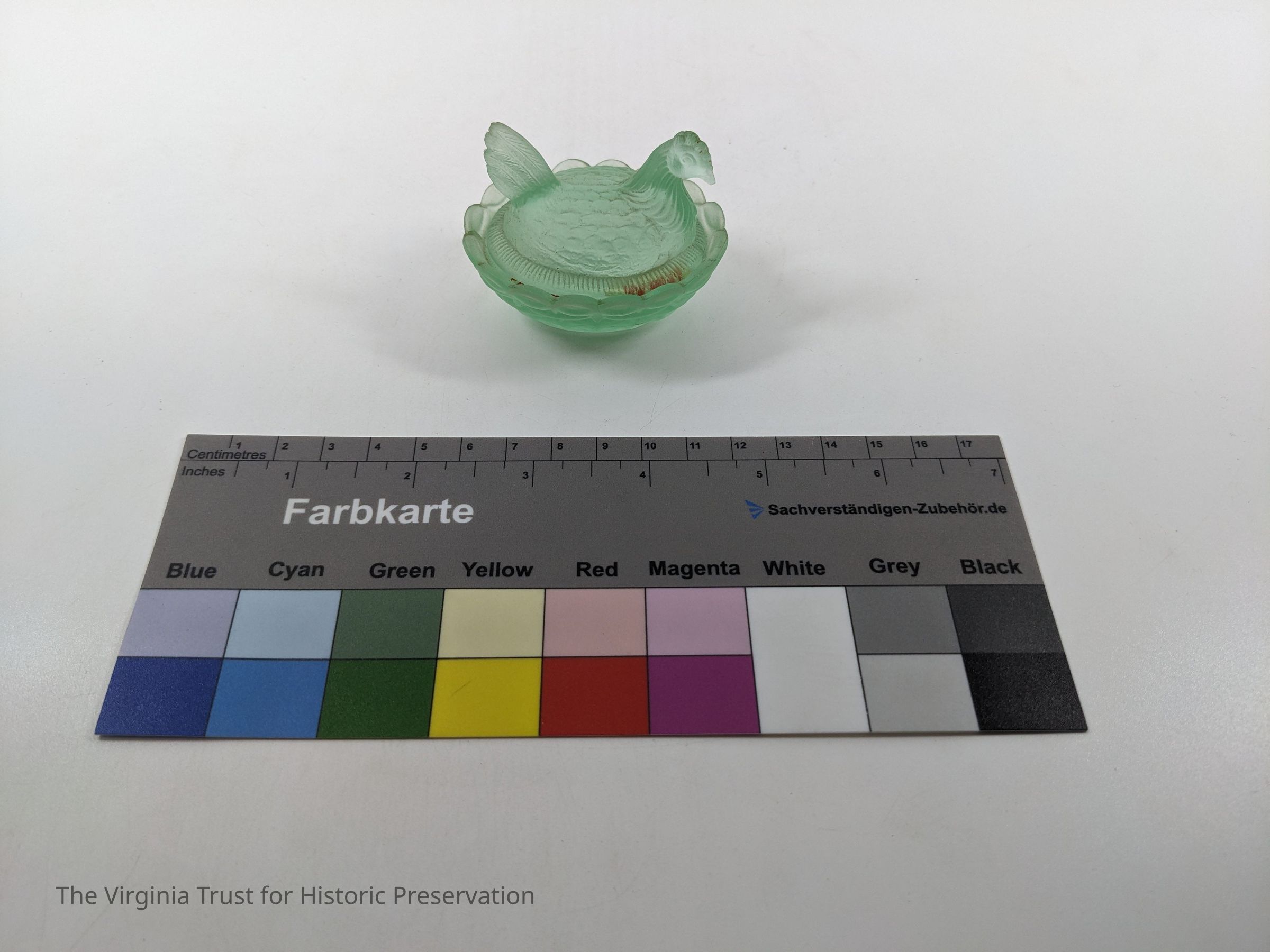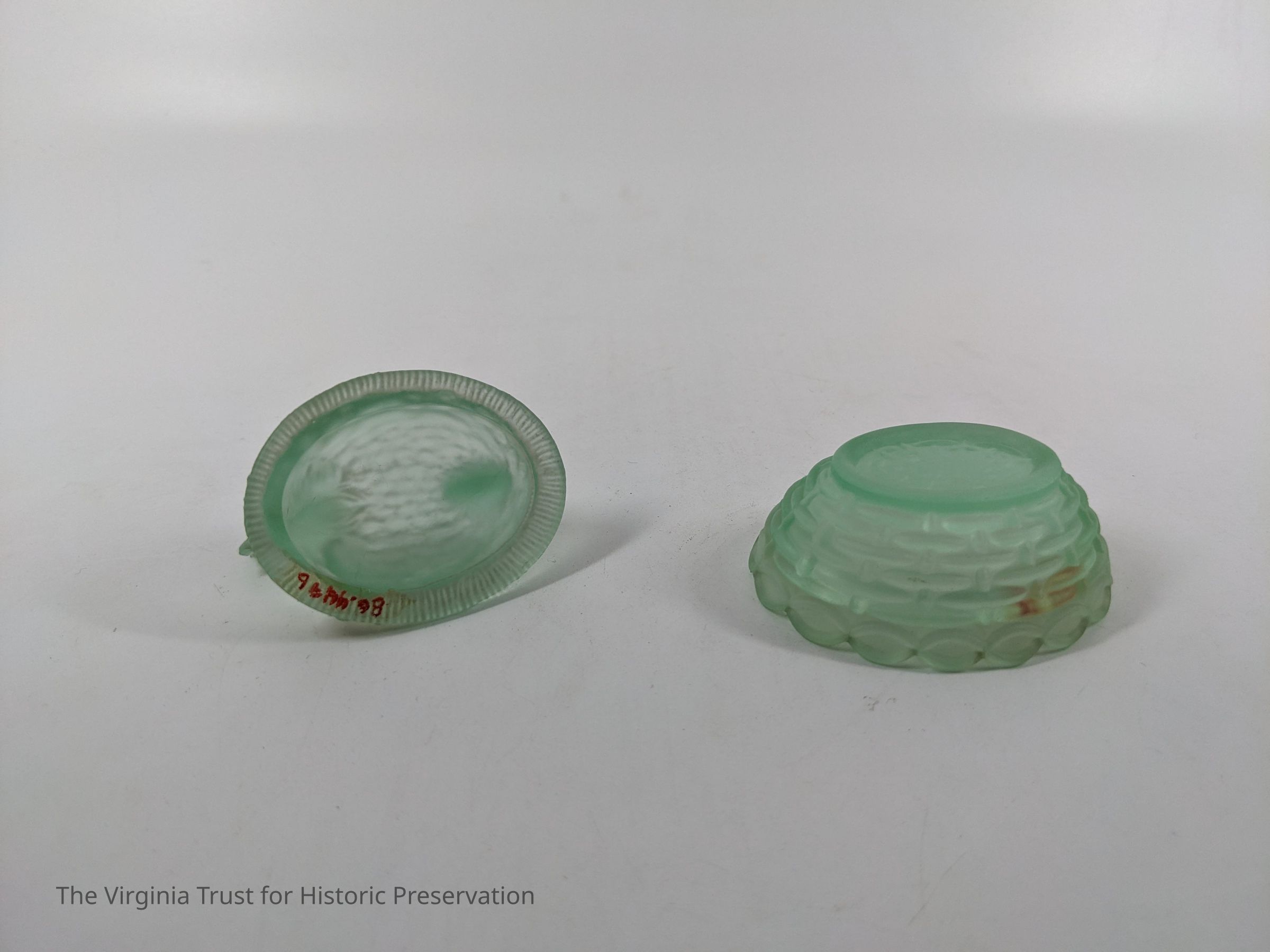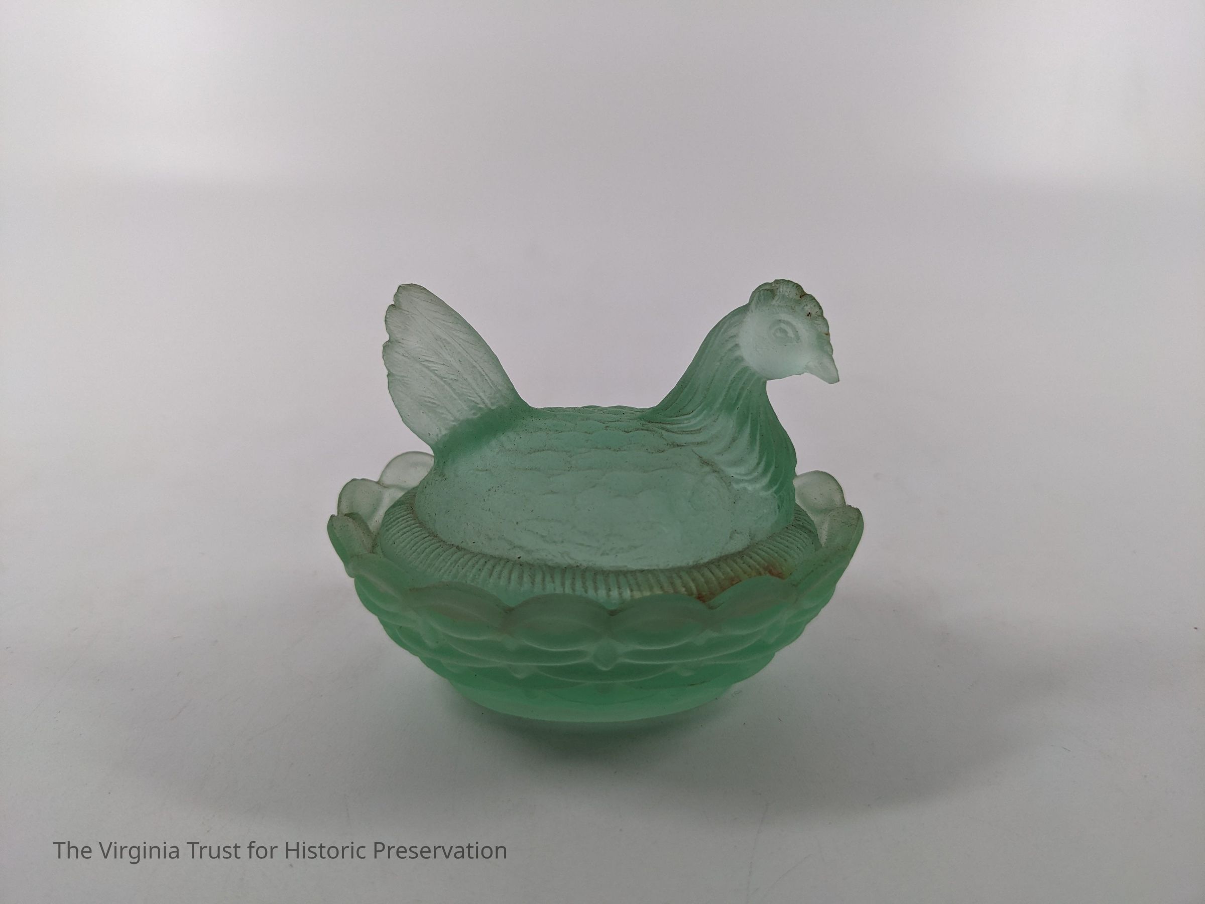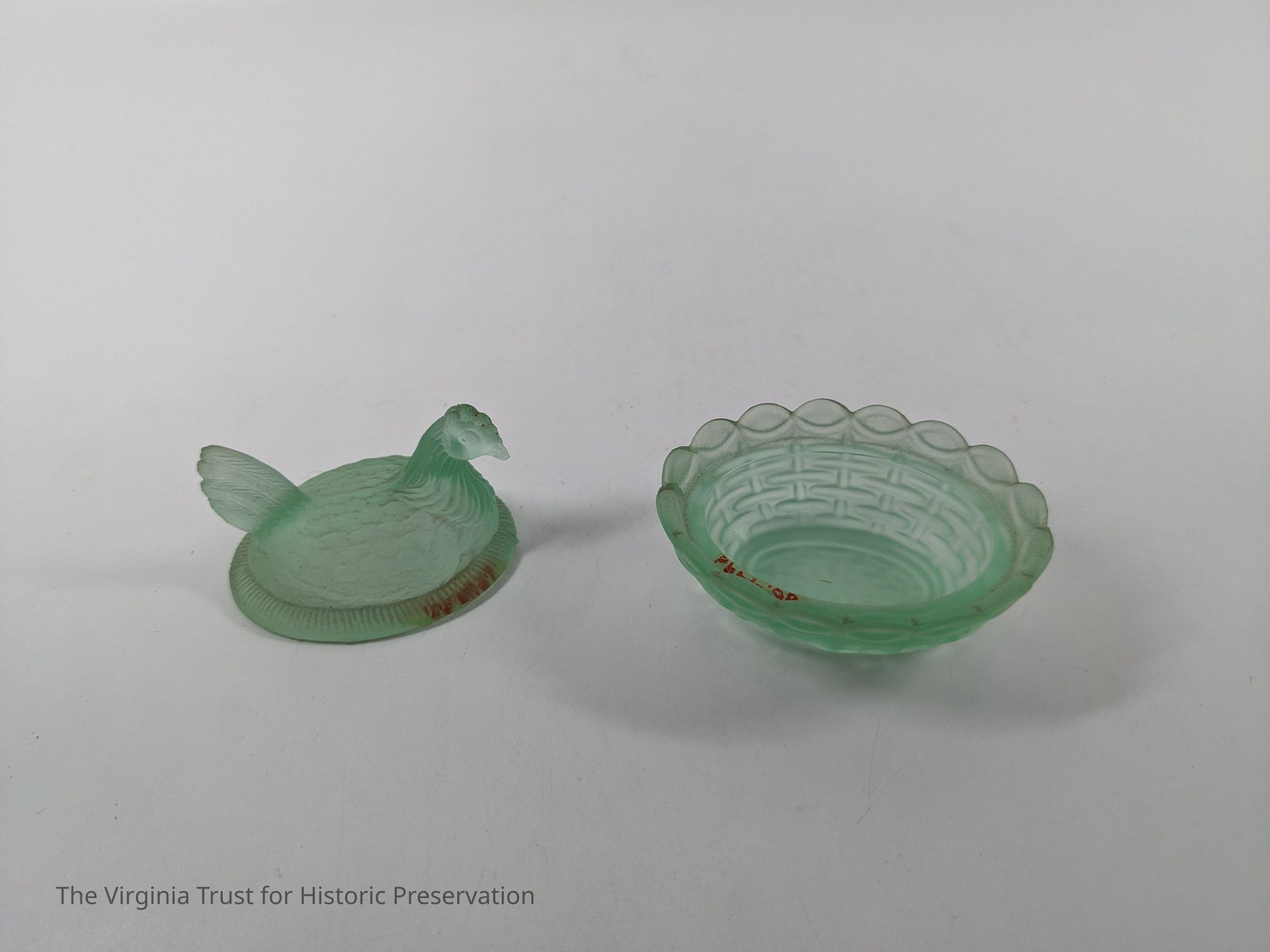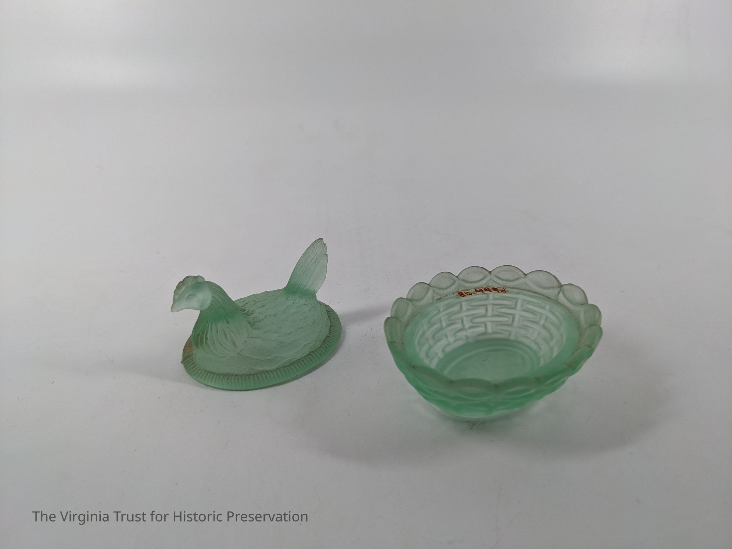 Pair of pale green glass saltcellars in the shape of chickens. Both with lids.