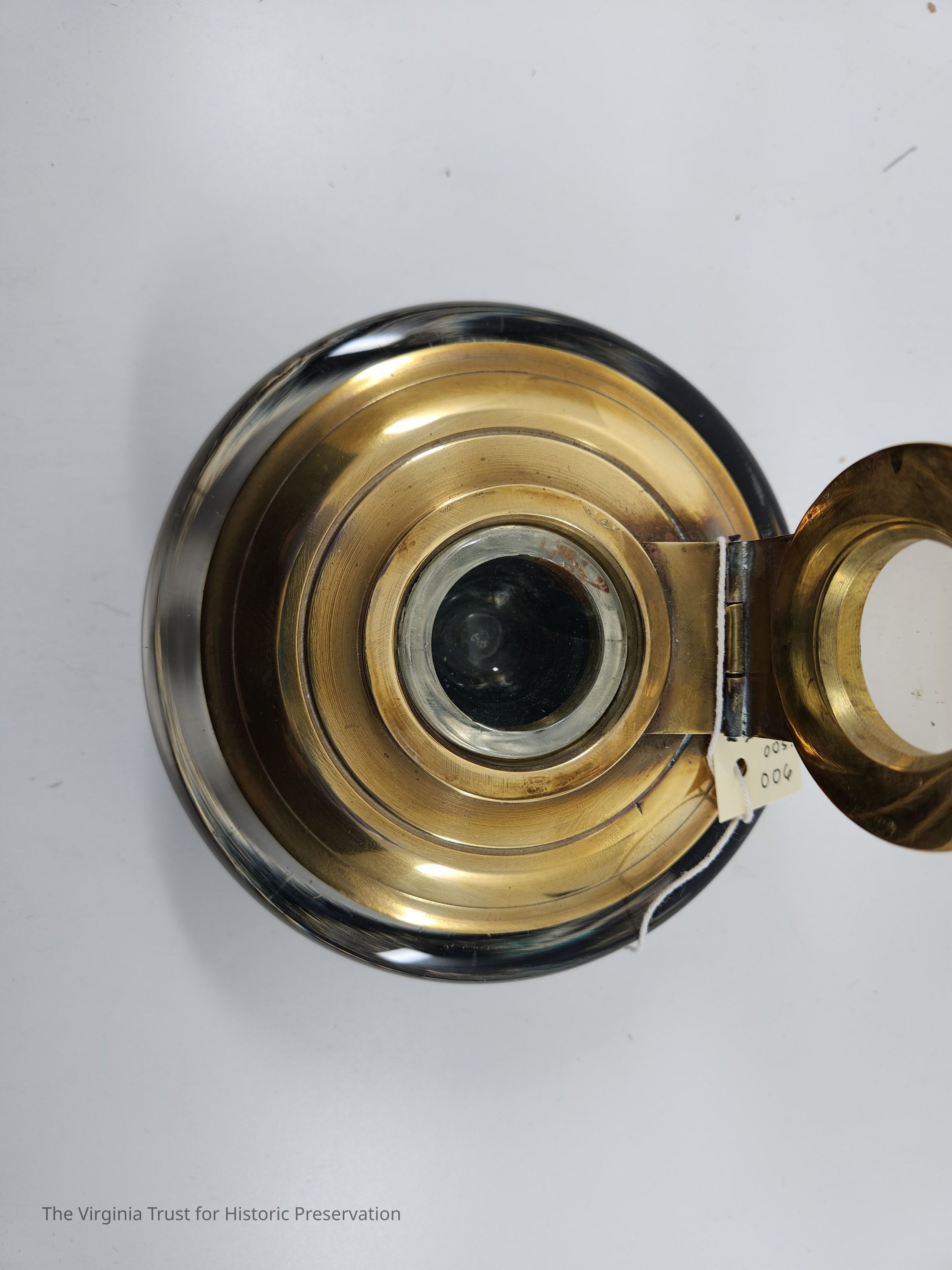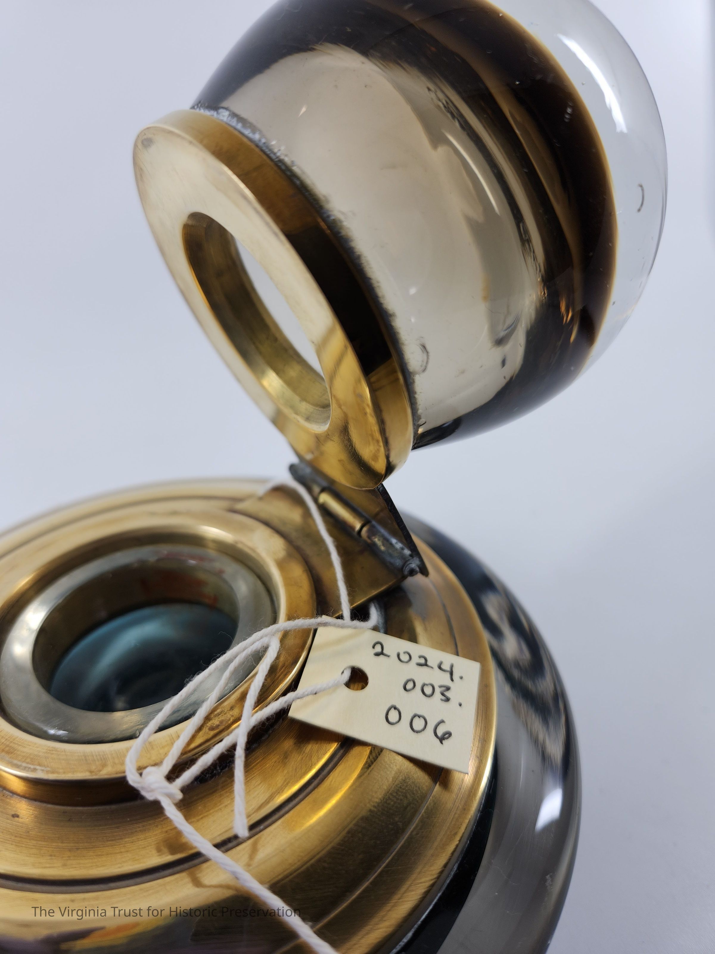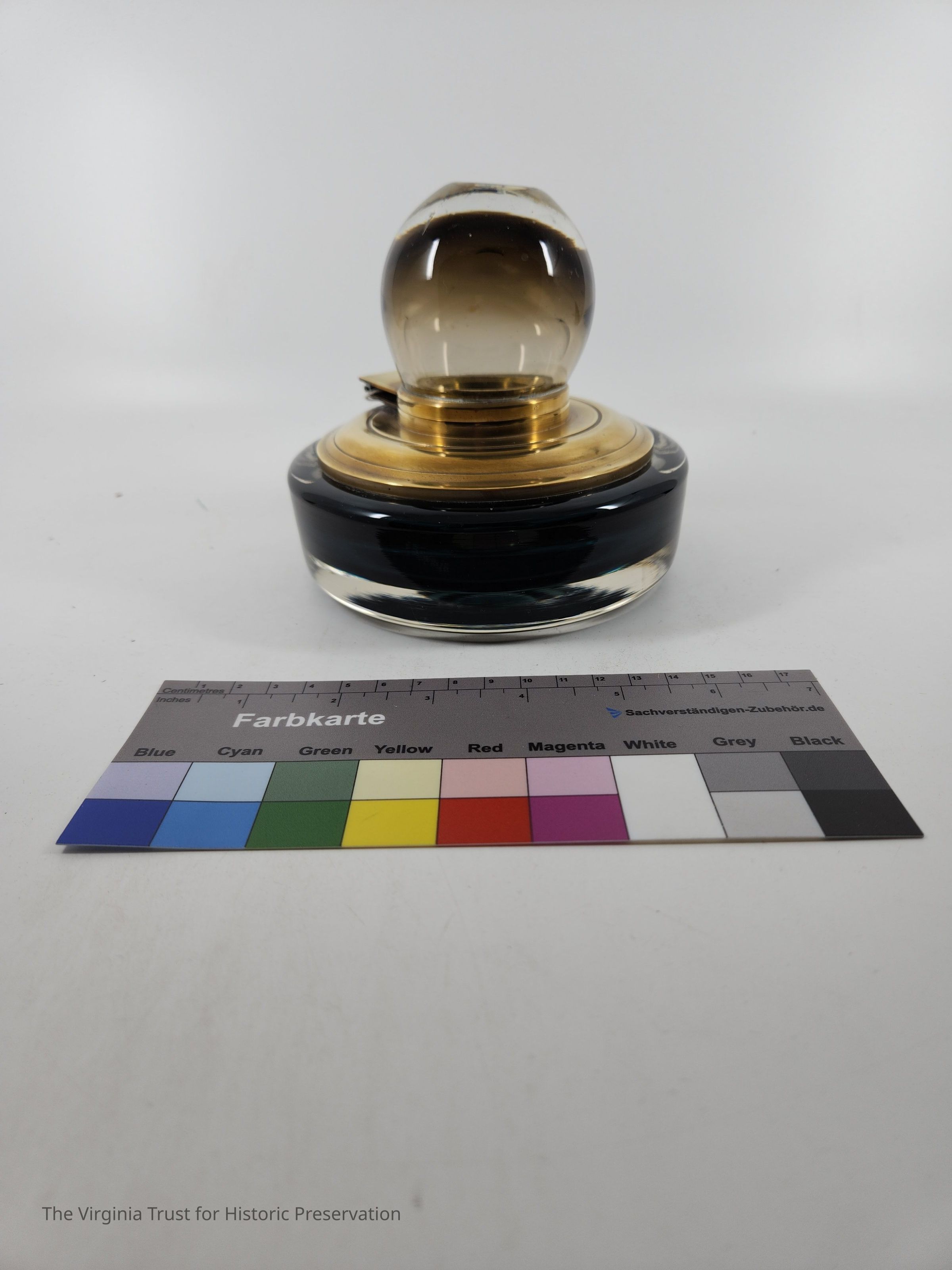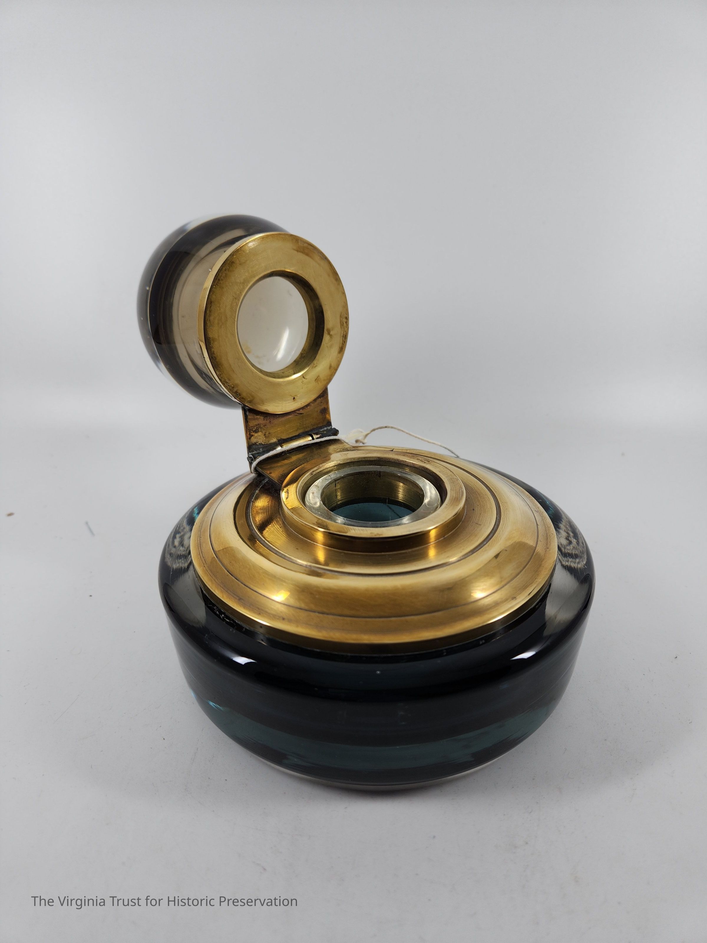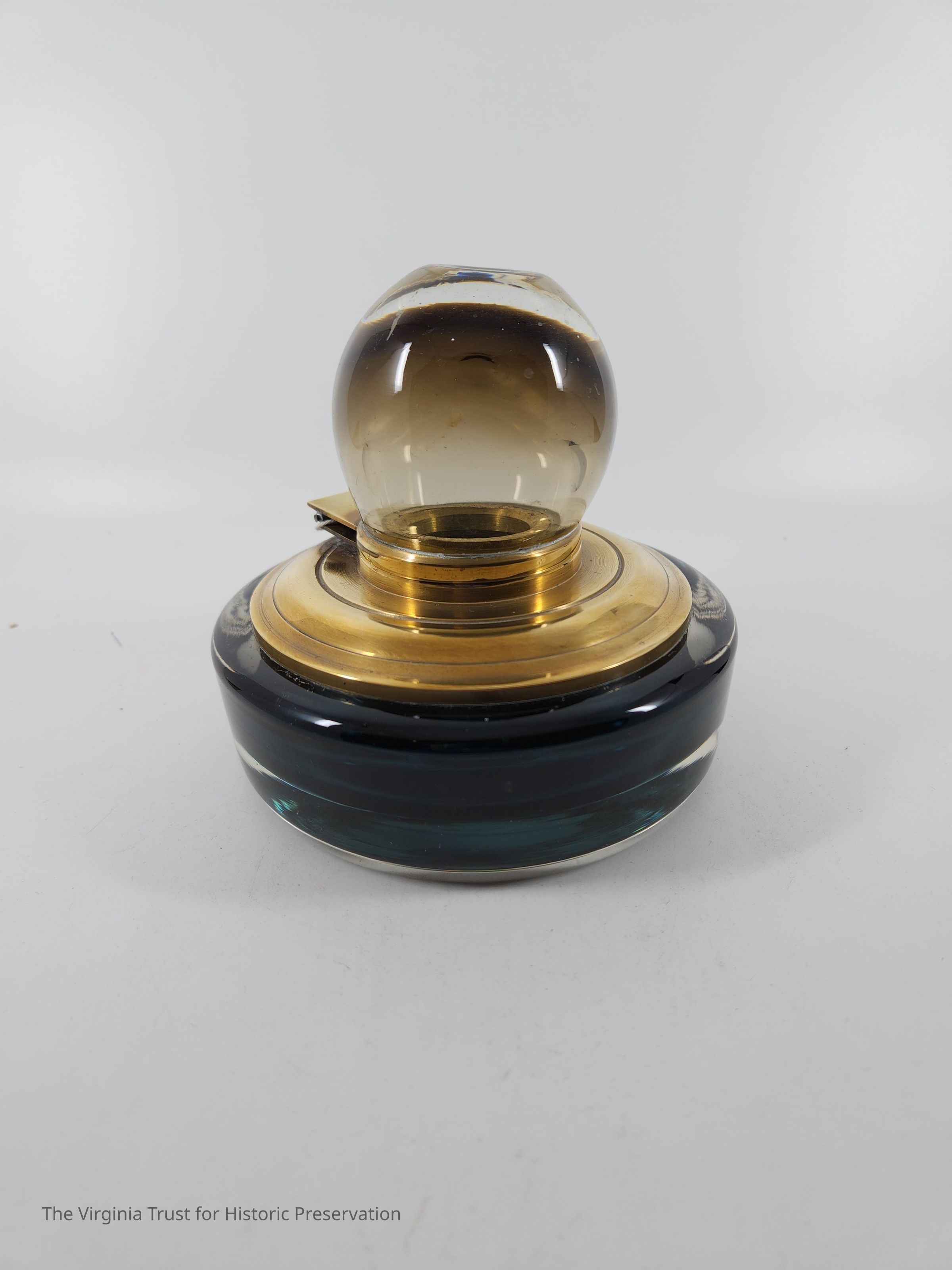 Glass inkwell with dark blue base and a spherical hinged top that opens to ink reservoir. Heavy. ca. 1930.