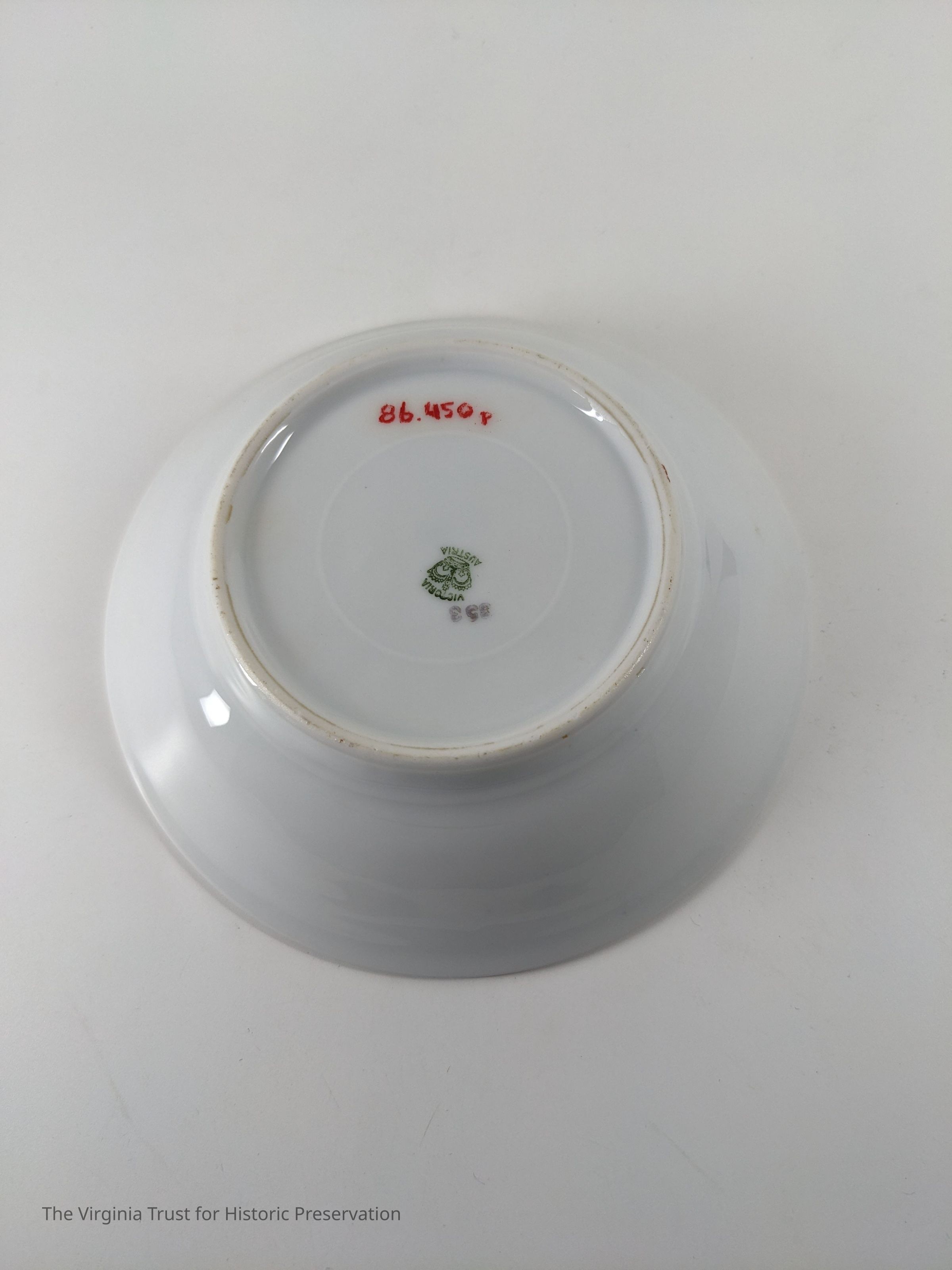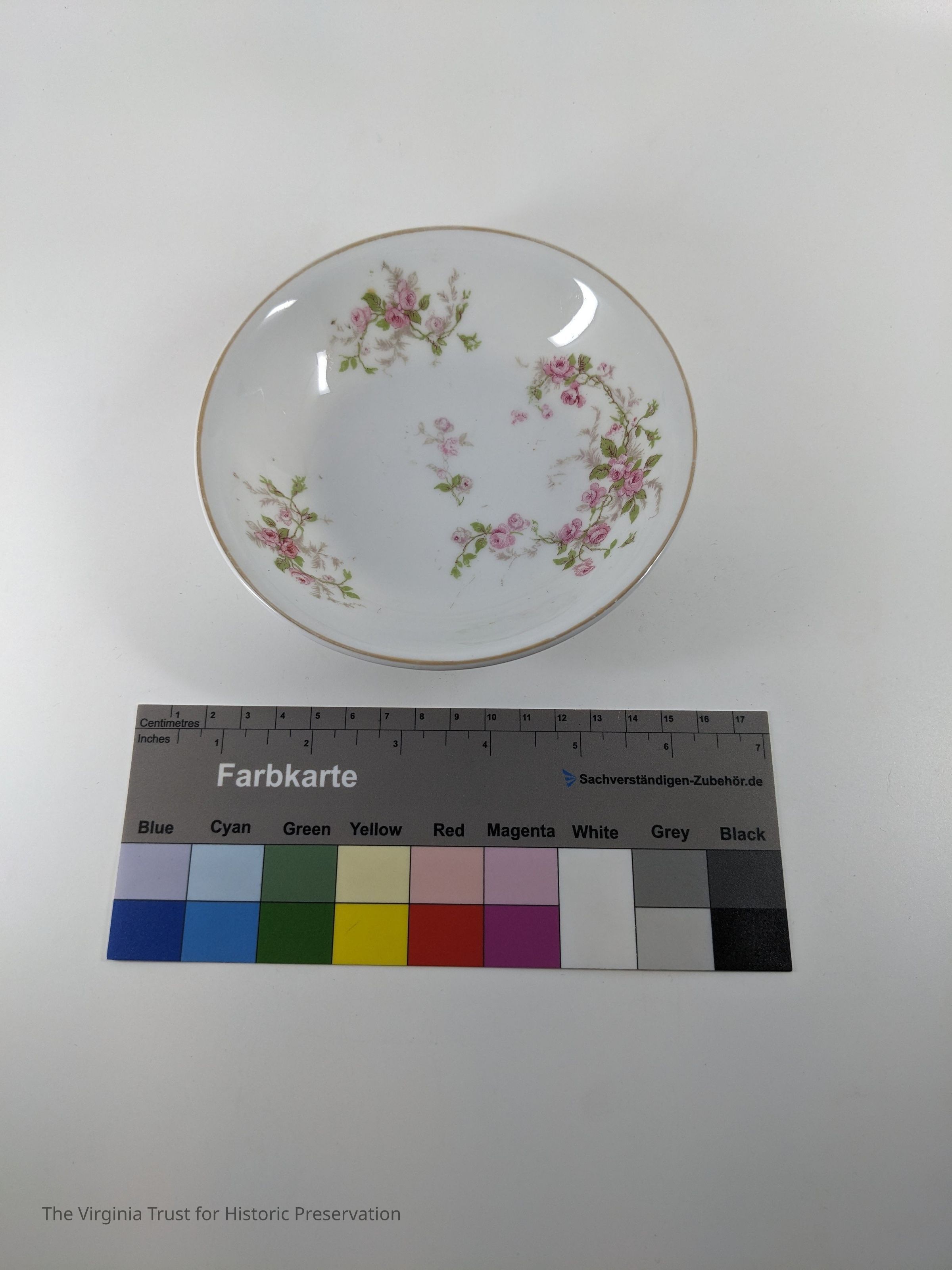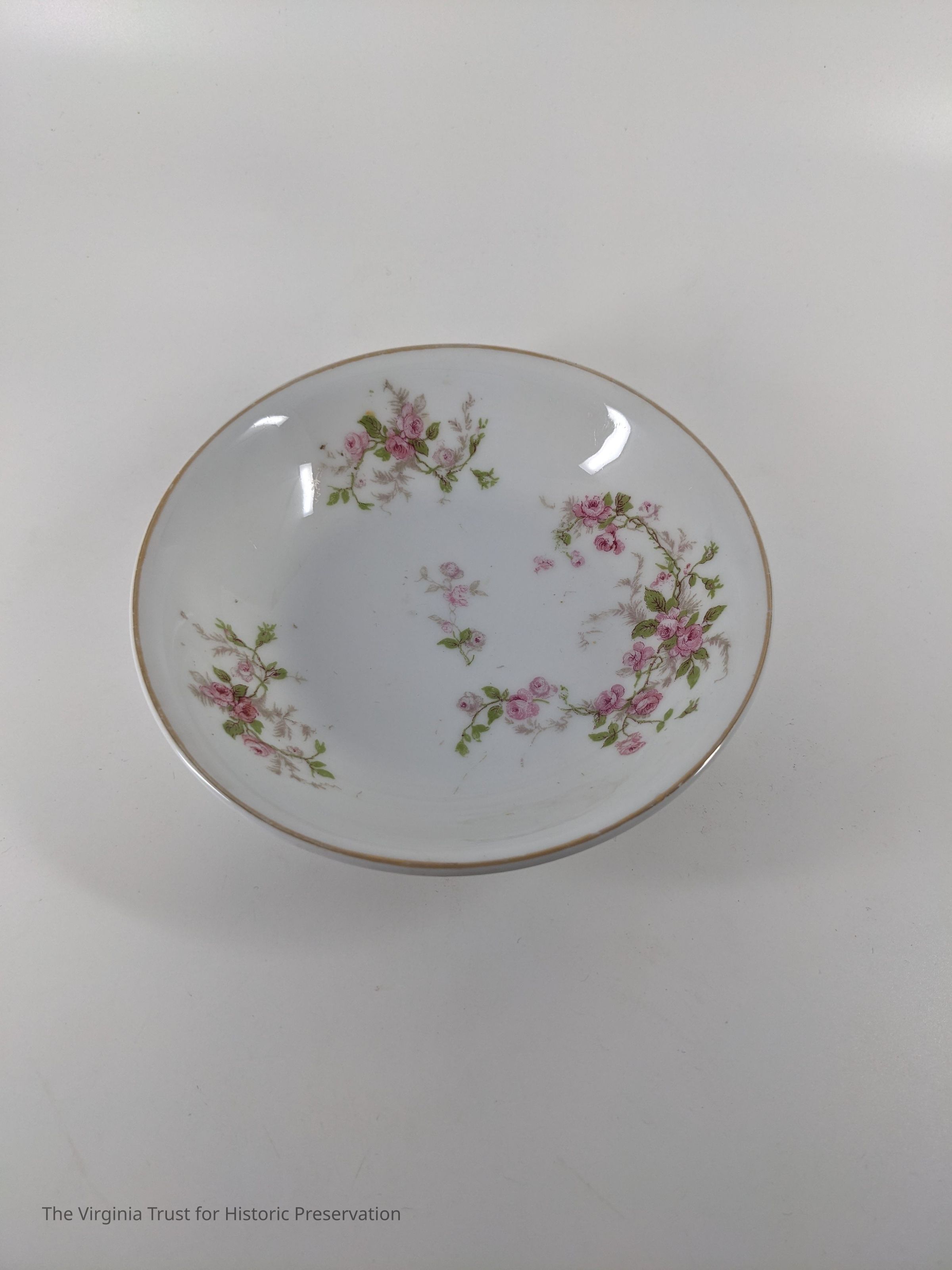Berry dish with pink rose design and gold rim. Marked "Victoria Austria."