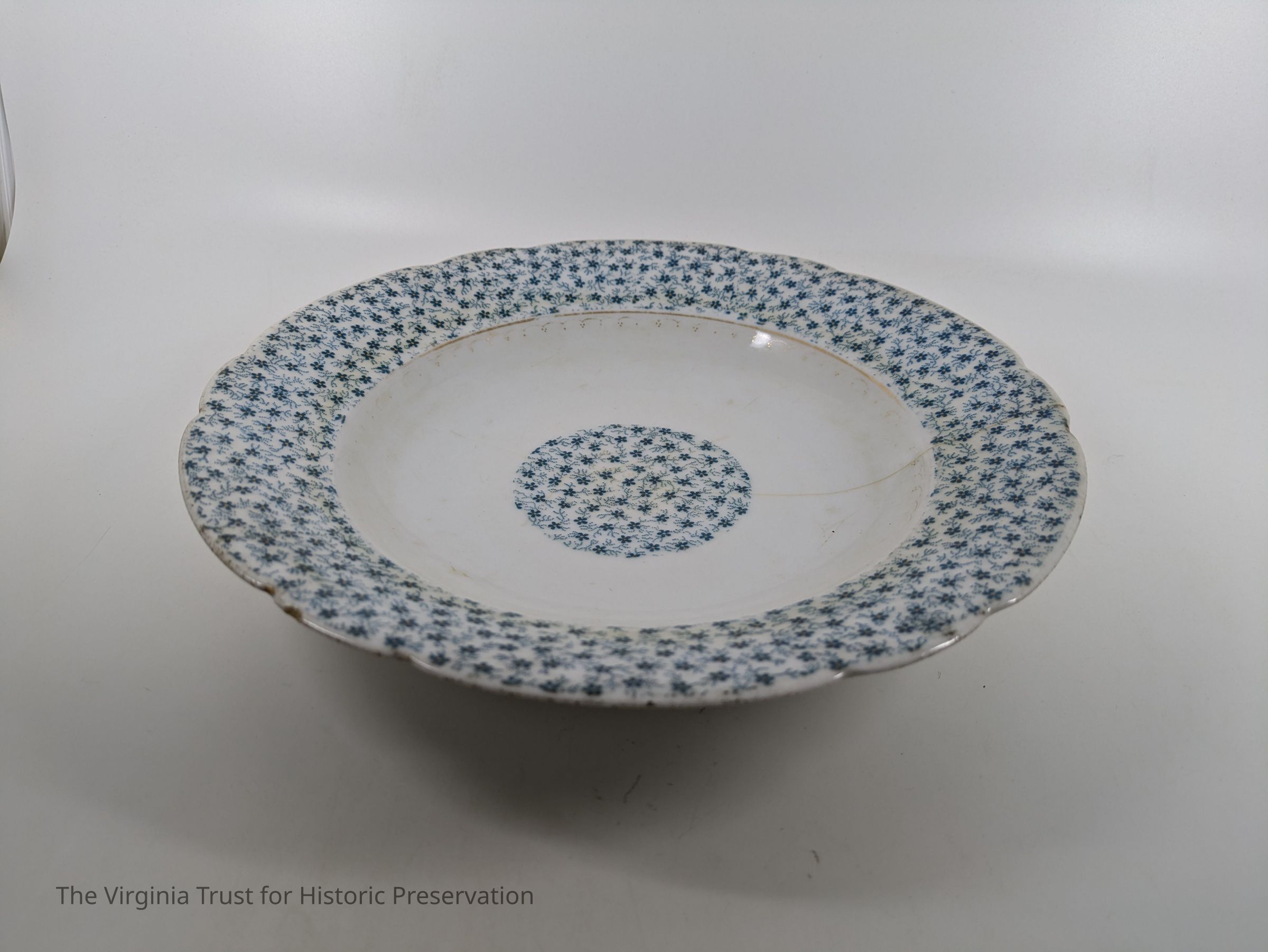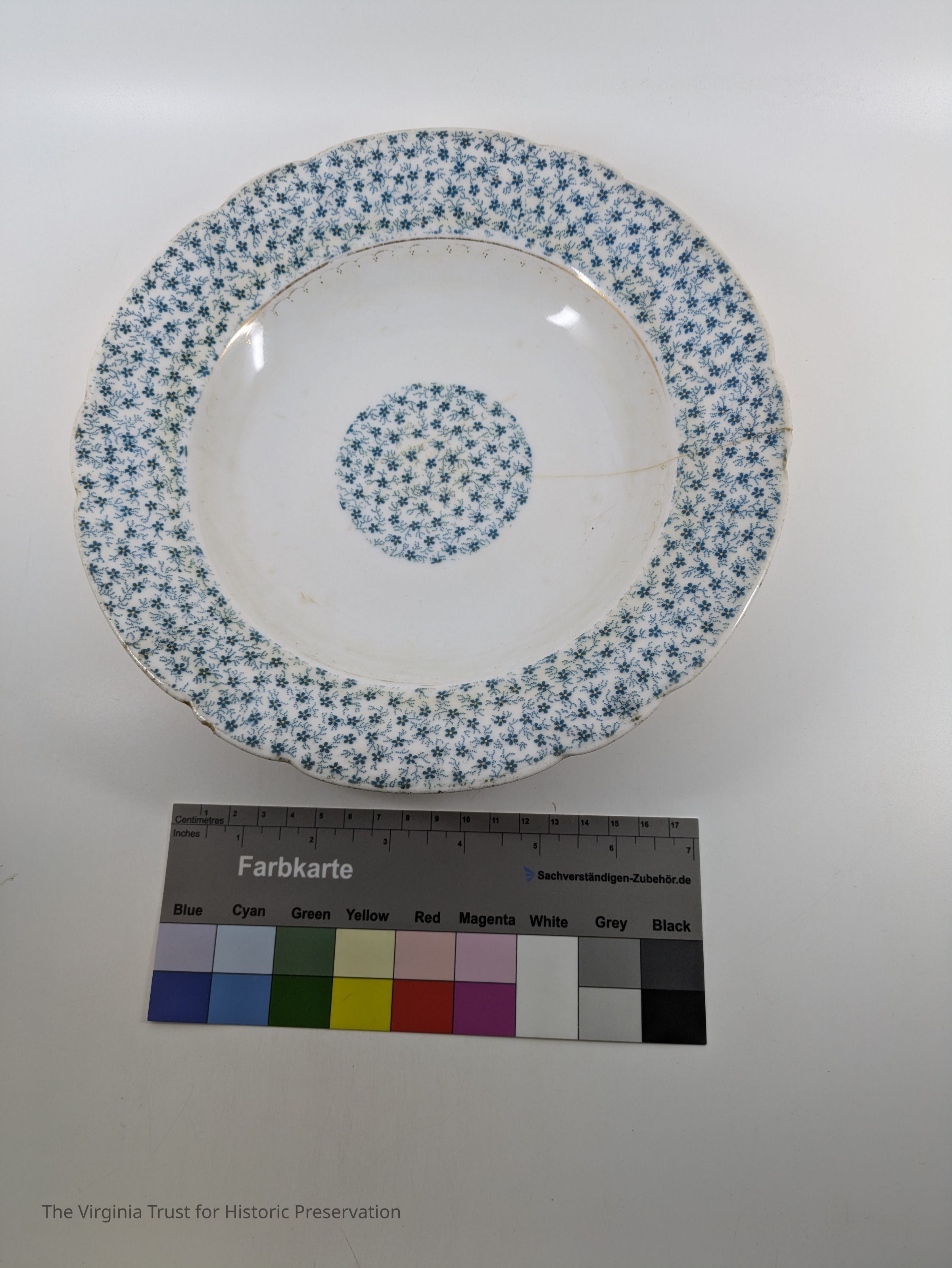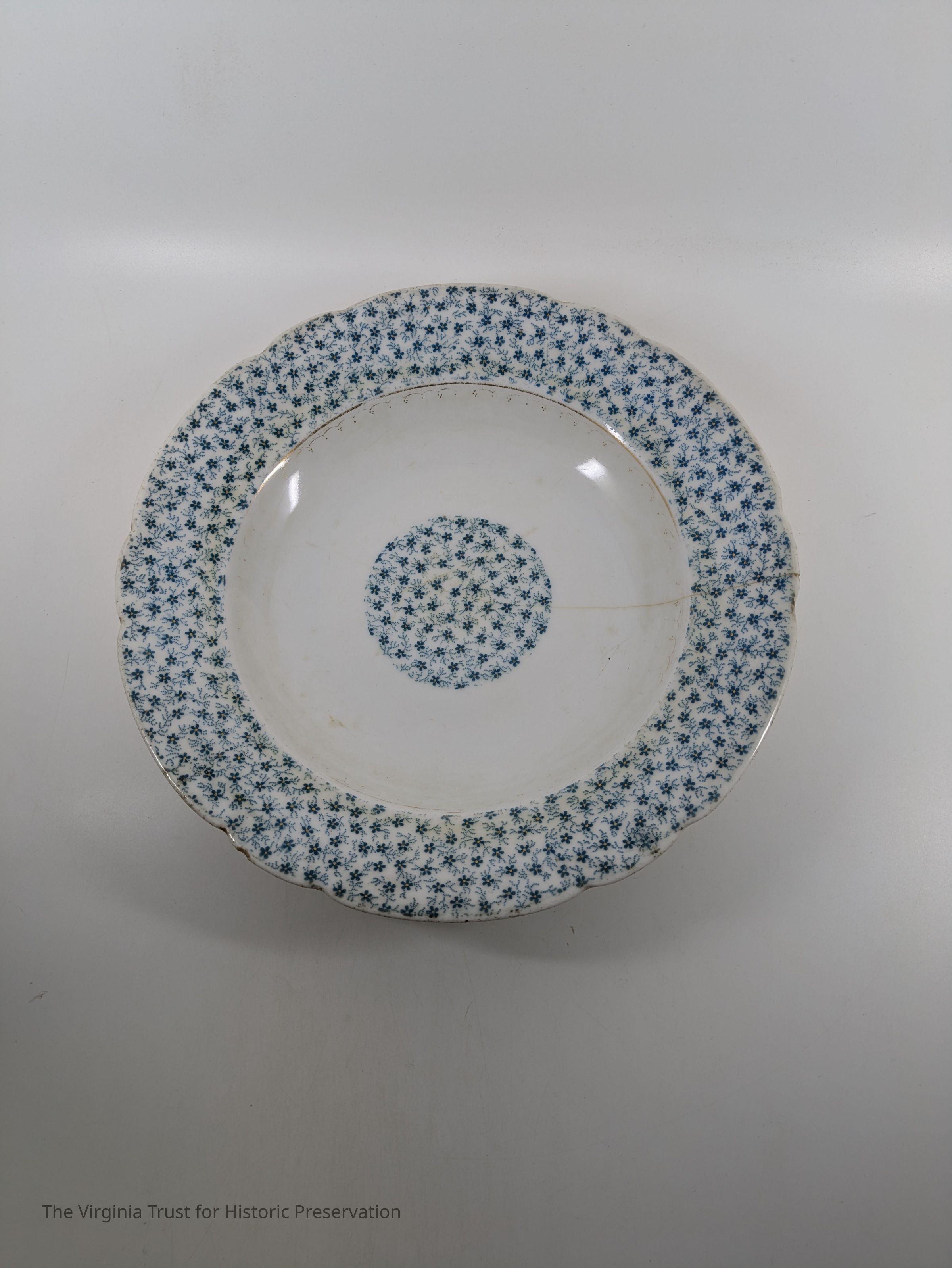 Set of six soup bowls. White bone china with blue flowers on rims and center. Marked "4332/20." French Bone China.