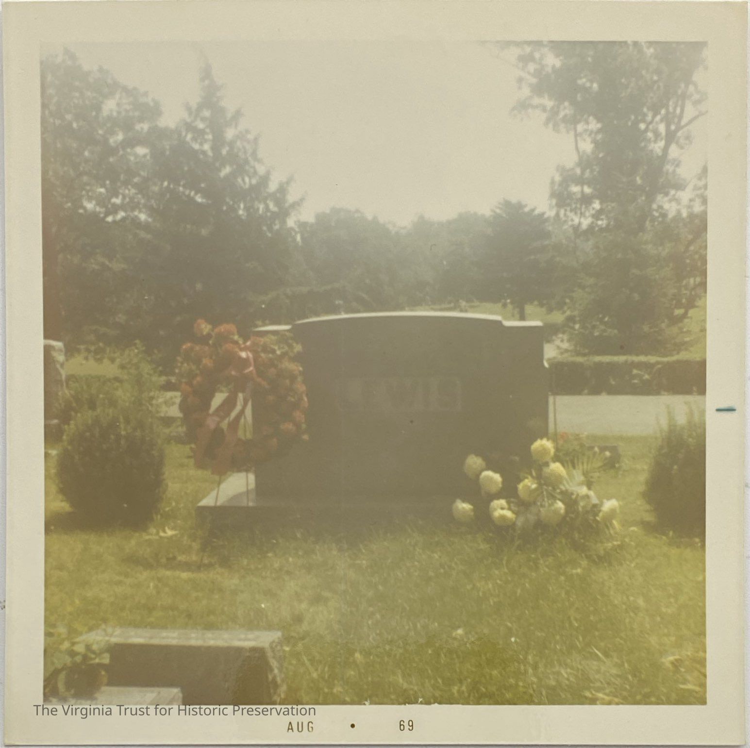 Photograph of John L. Lewis gravestone located in Oak Ridge Cemetery (Springfield, IL). A wreath and flowers lay next to stone. Trees in background.Dimensions