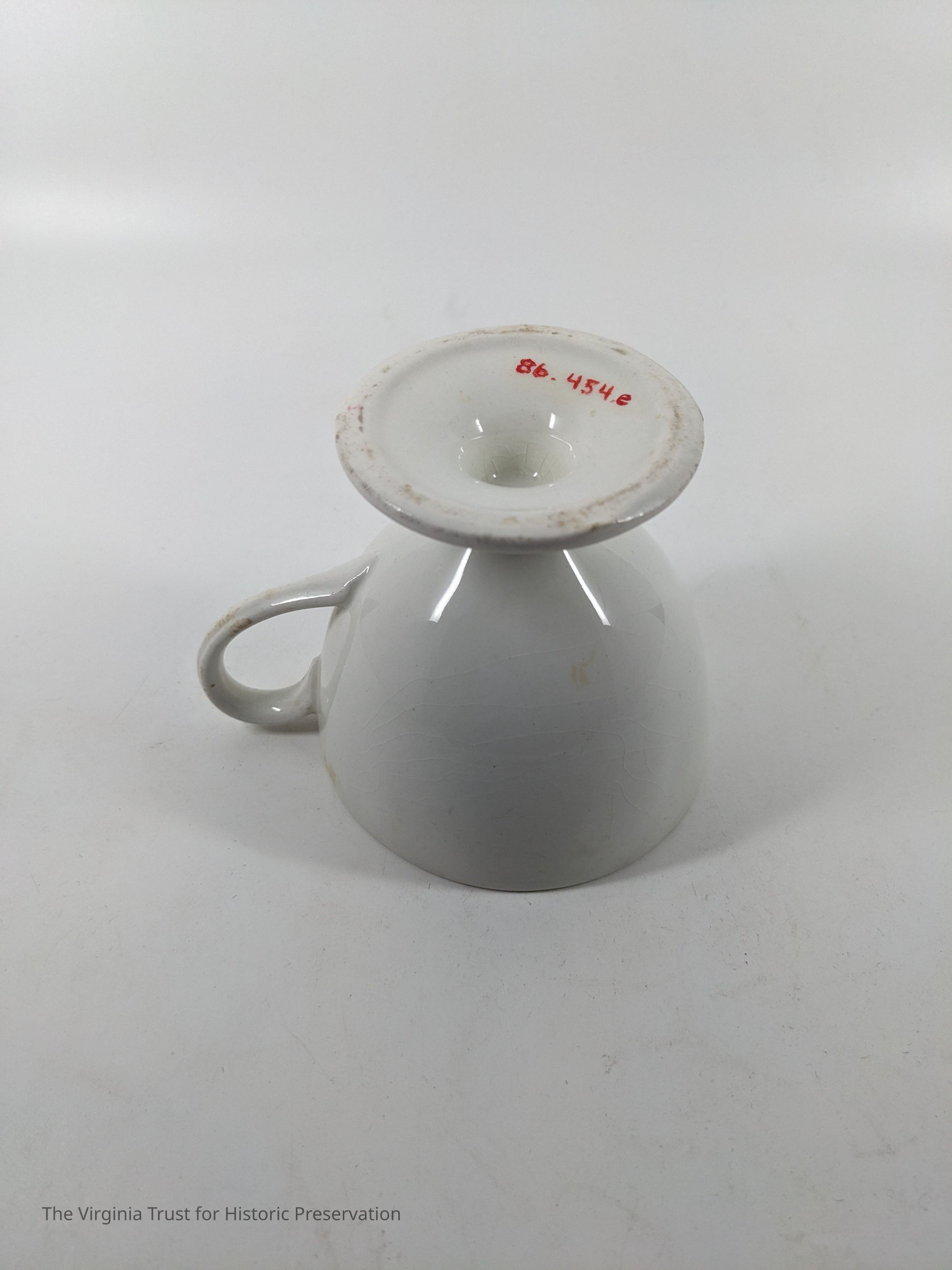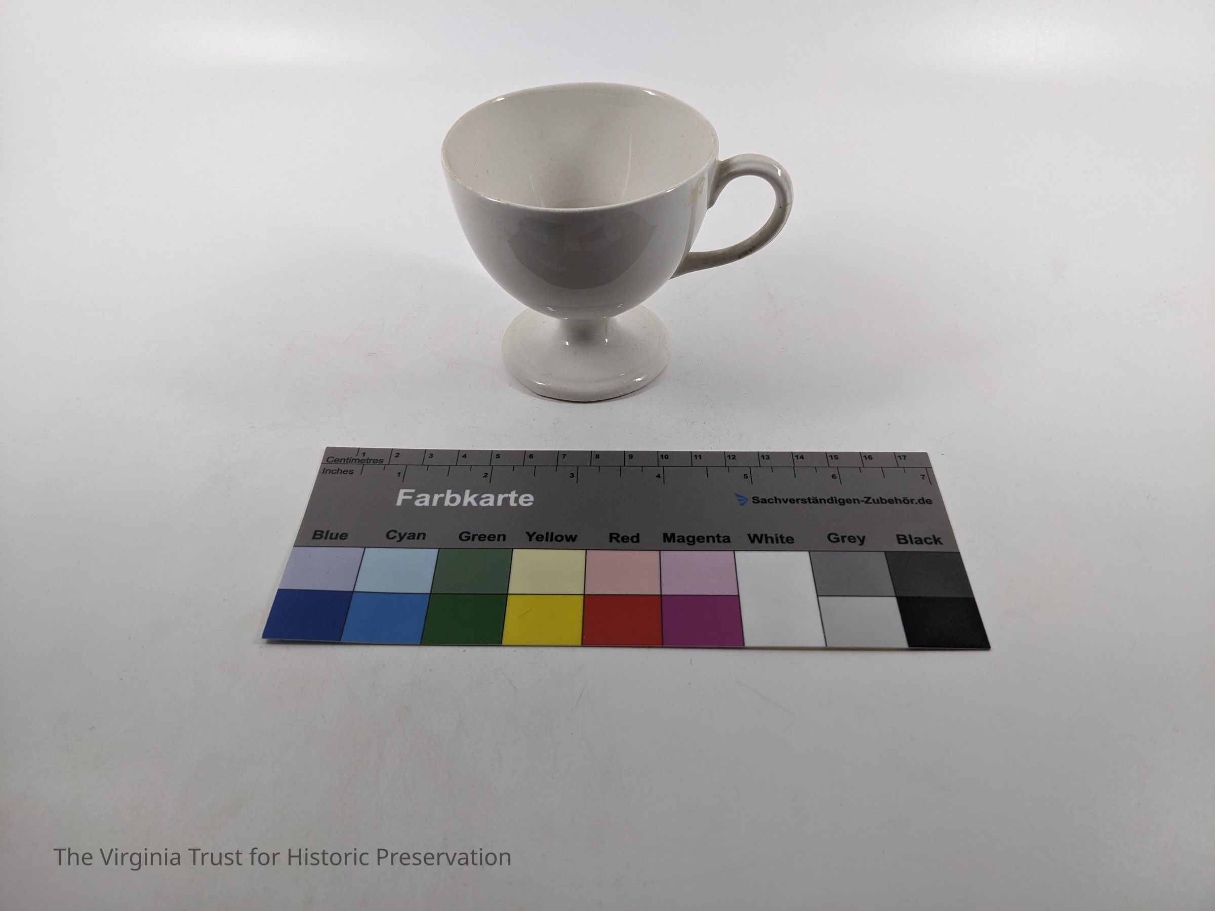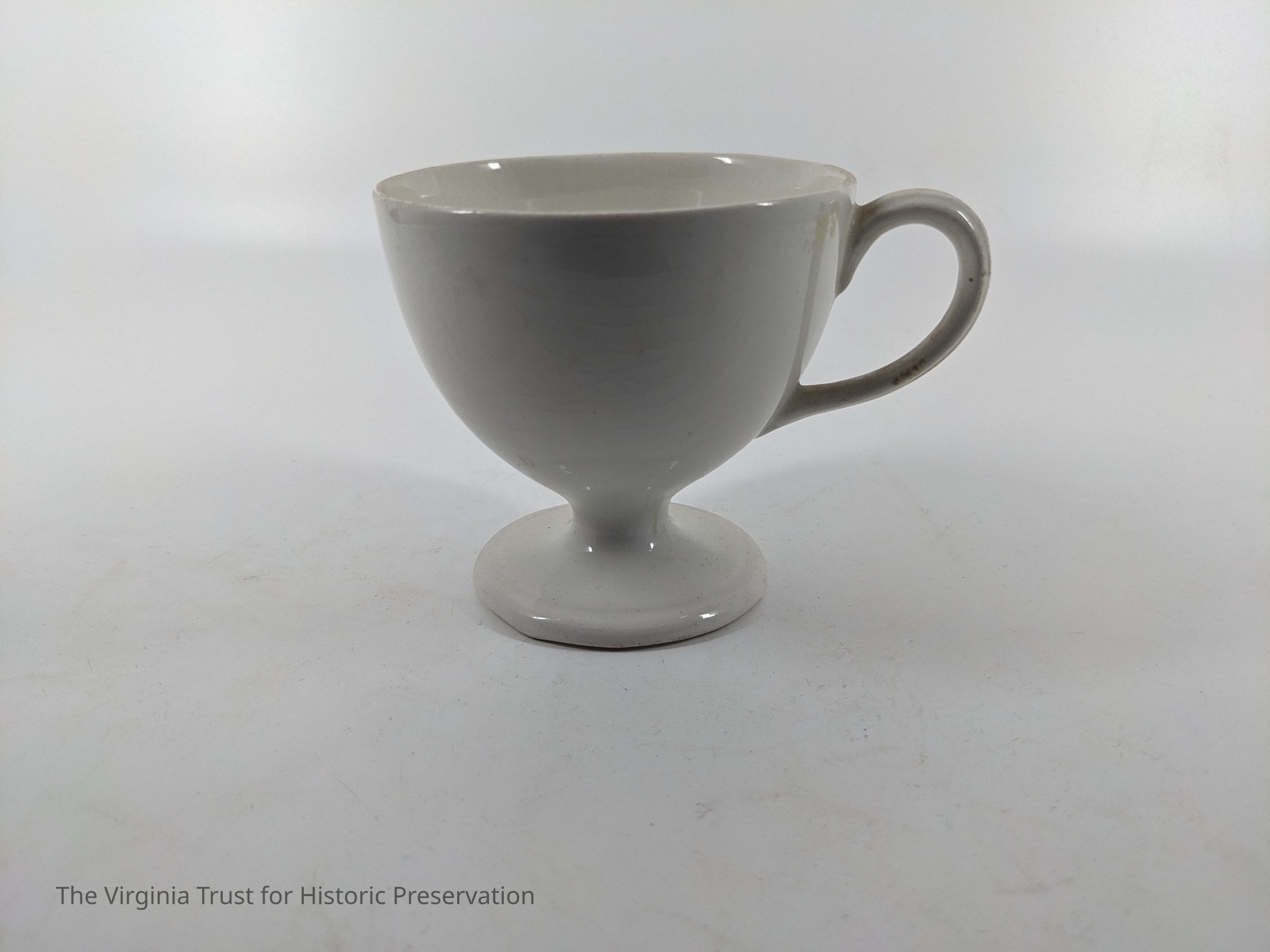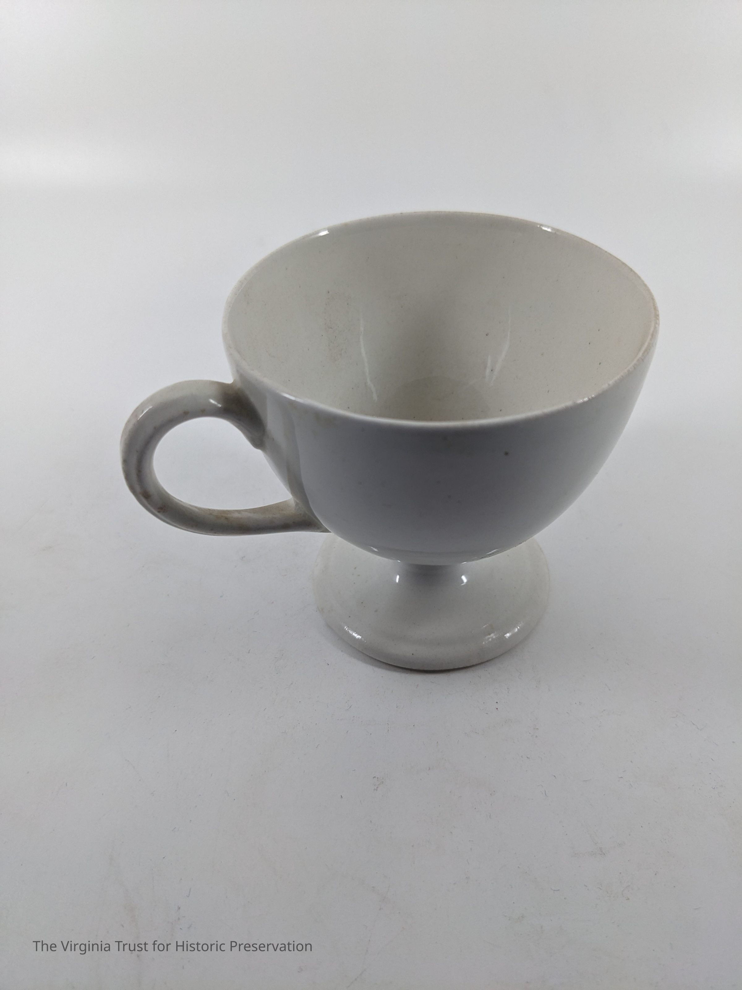 White china teacup. Pedestal style, gold around rim and handle.