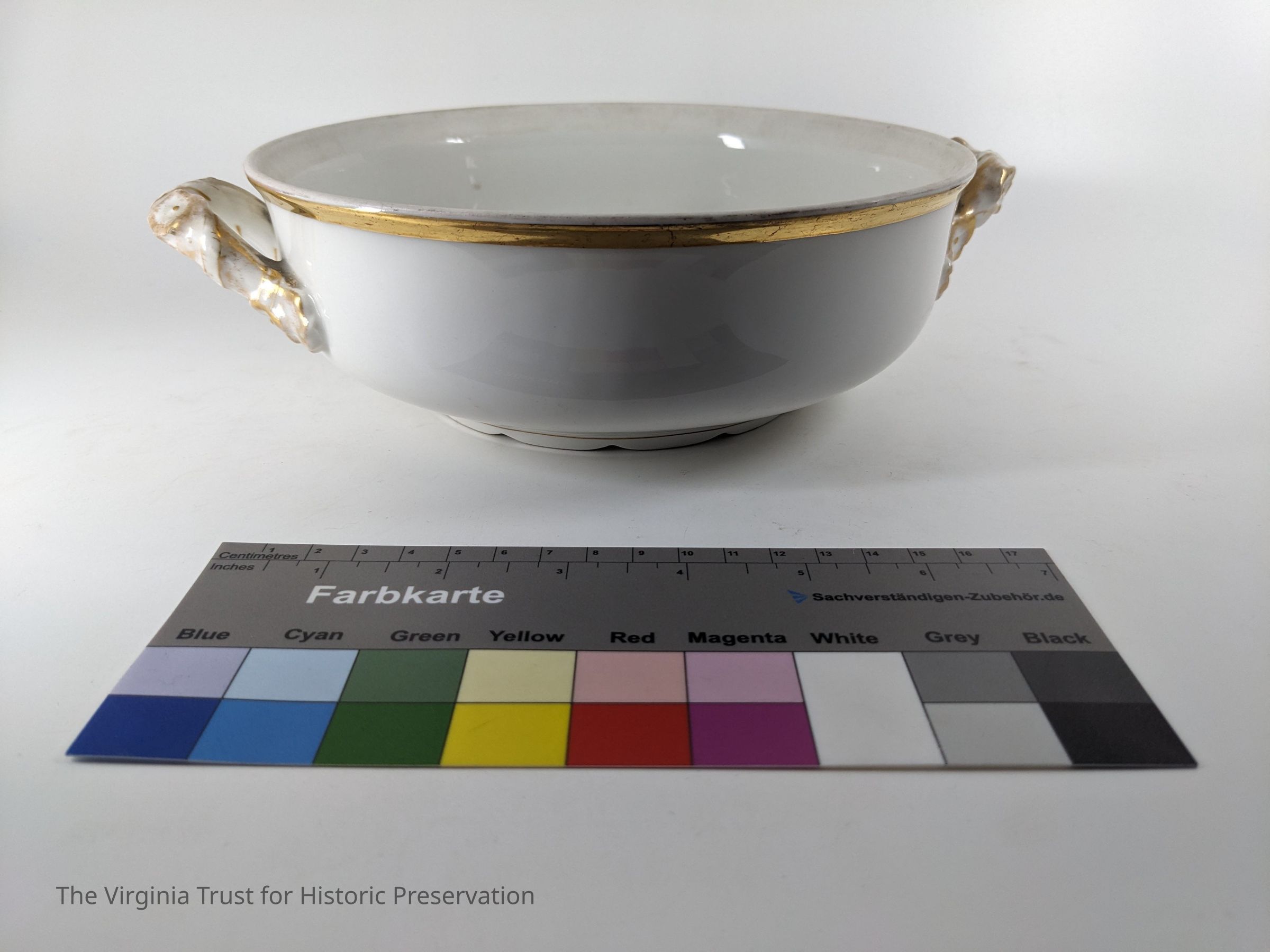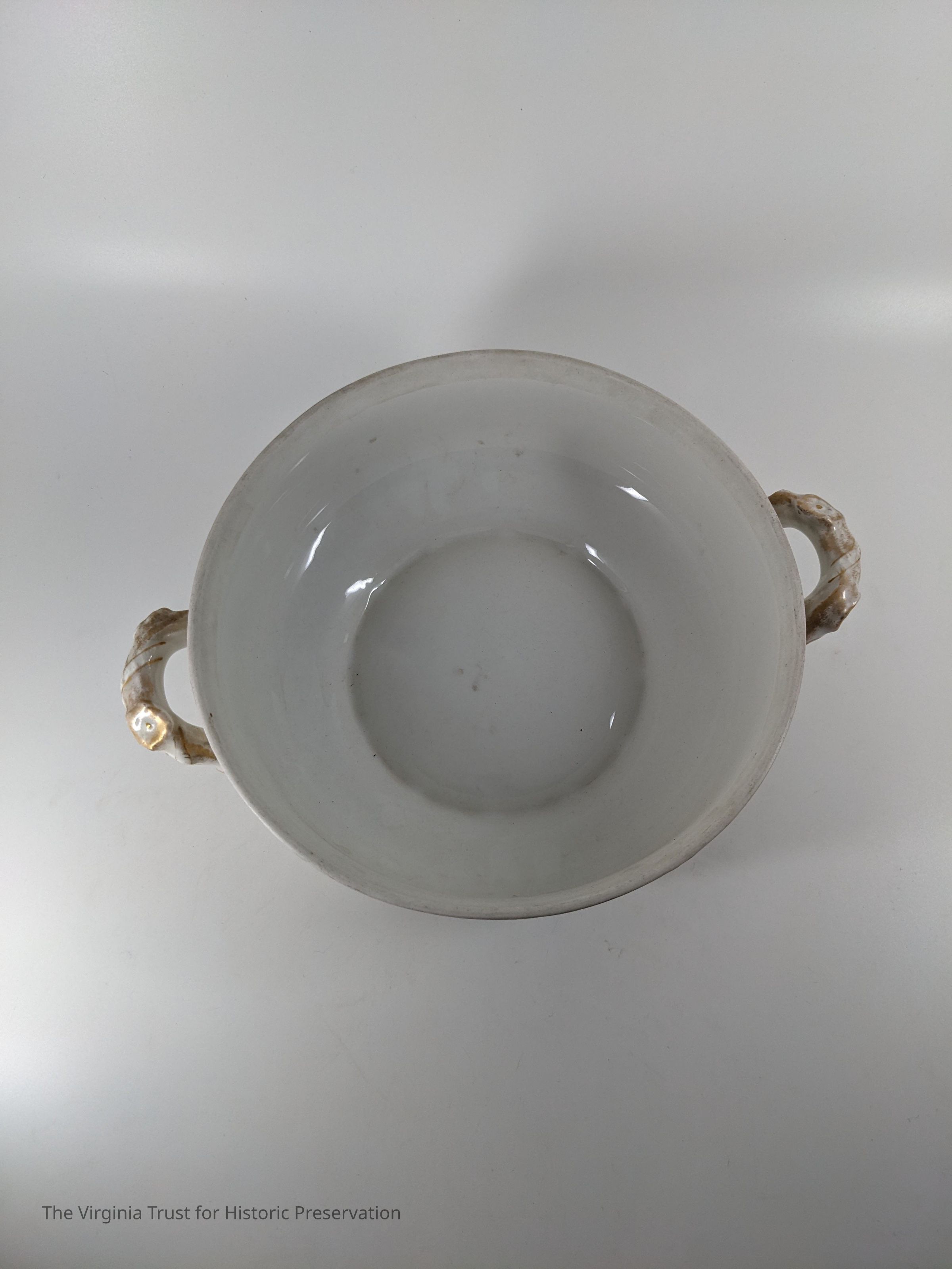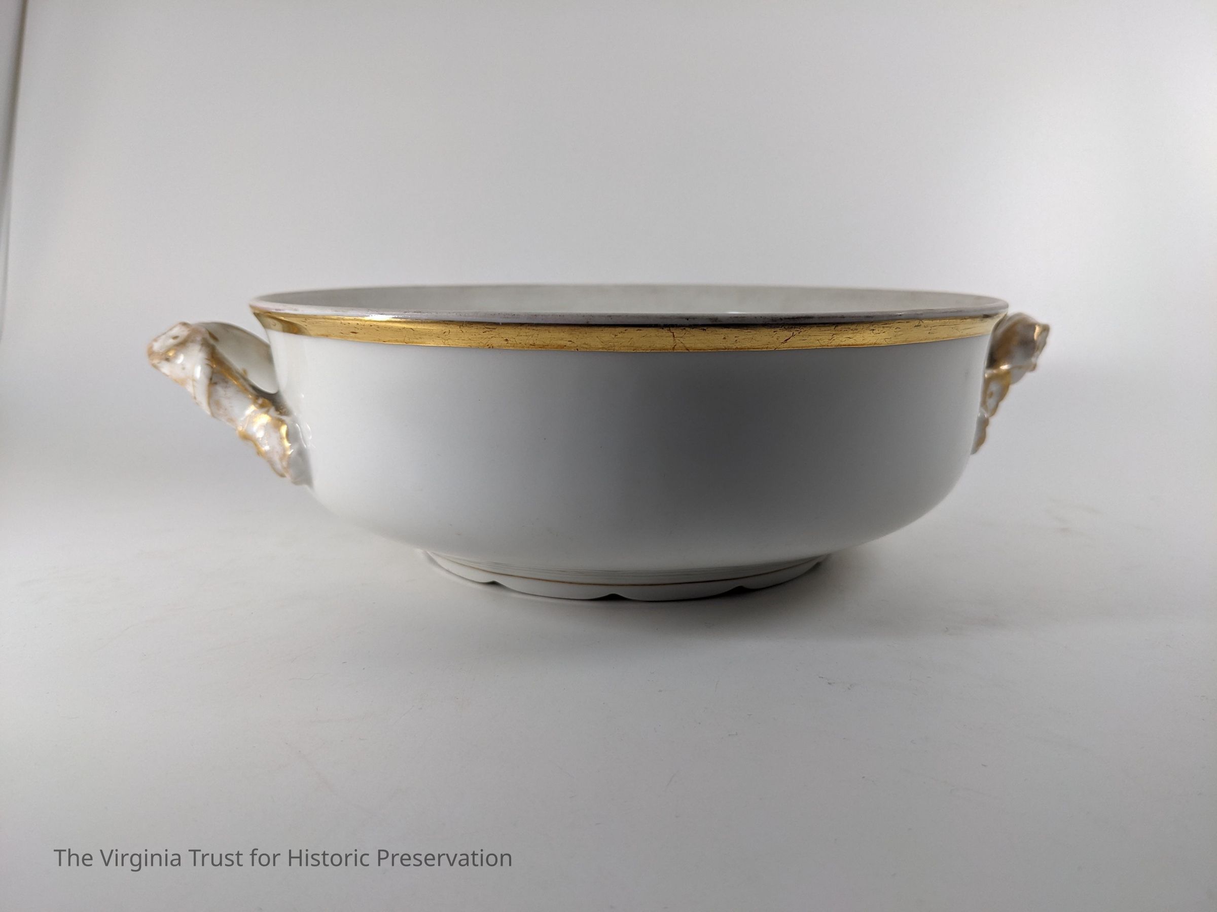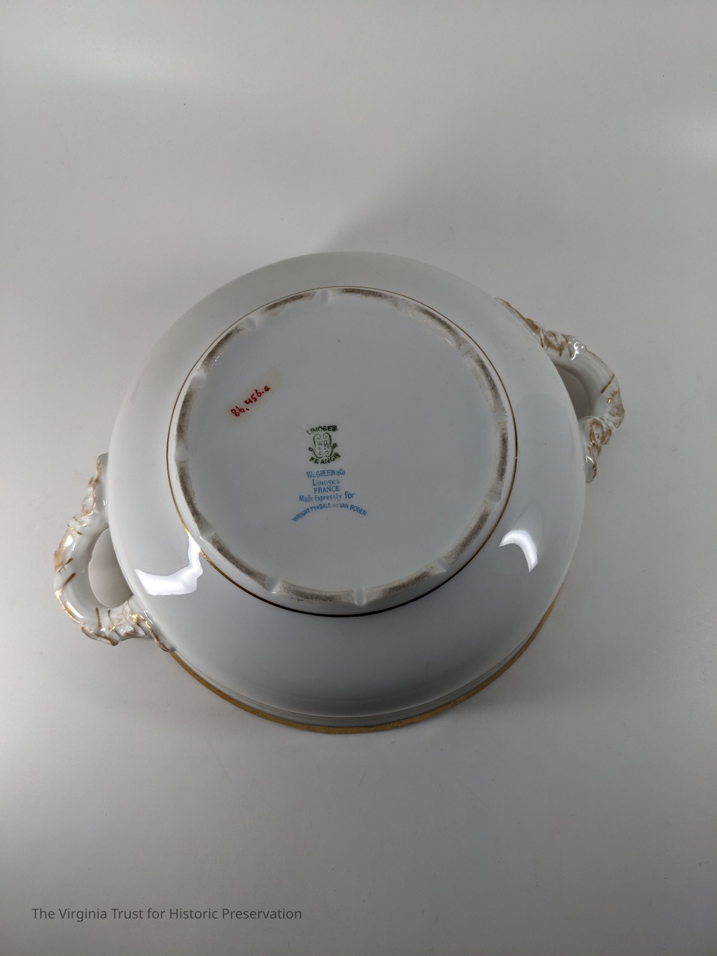Round serving dish with two handles and a separate lid. White with gold rim and decorated handles. Bottom of bowl marked: "Limoges, France Wm Geurin & Co Limoges France Made Expressly for Wright Tyndale and Van Roden."Dimensions