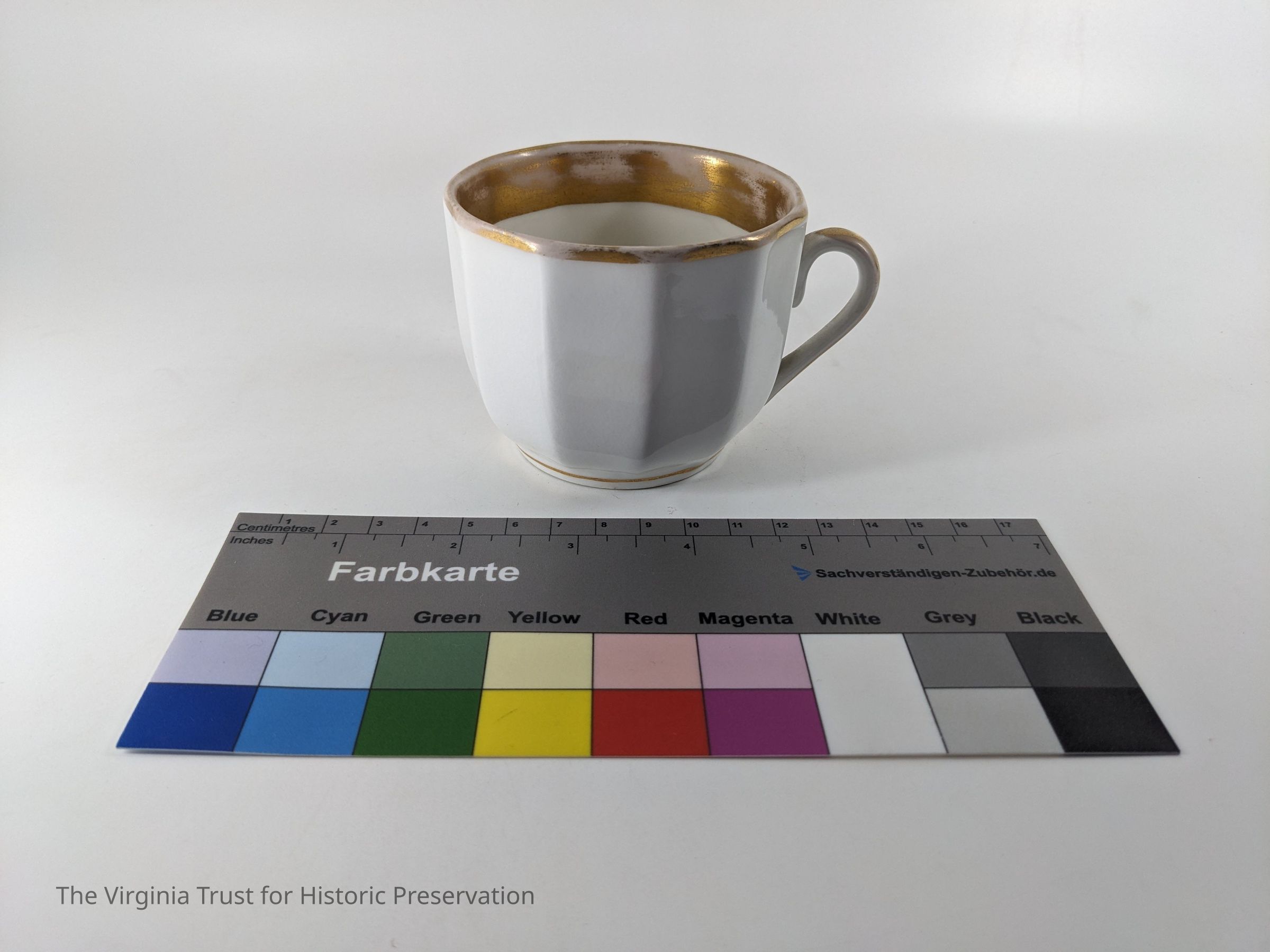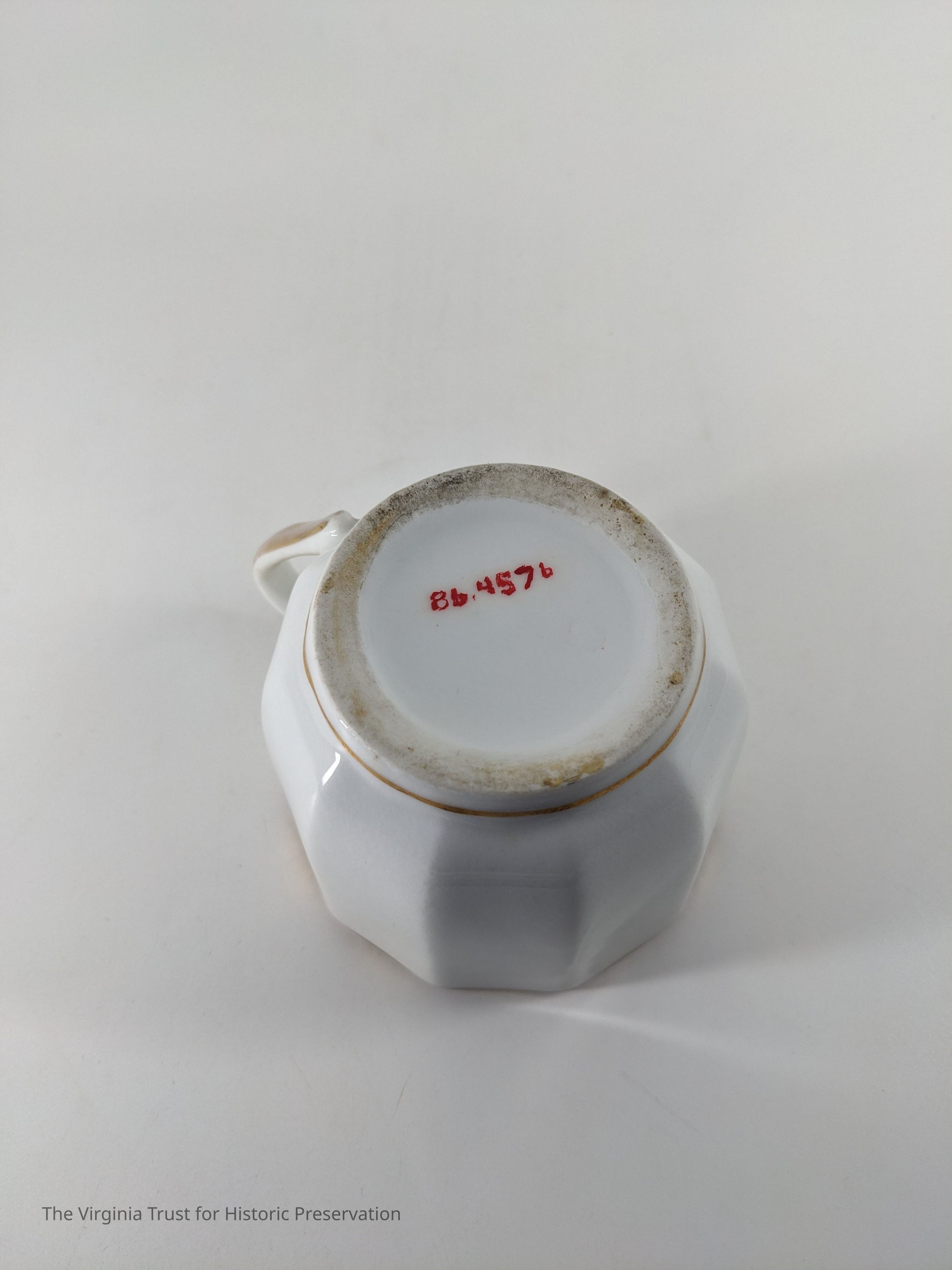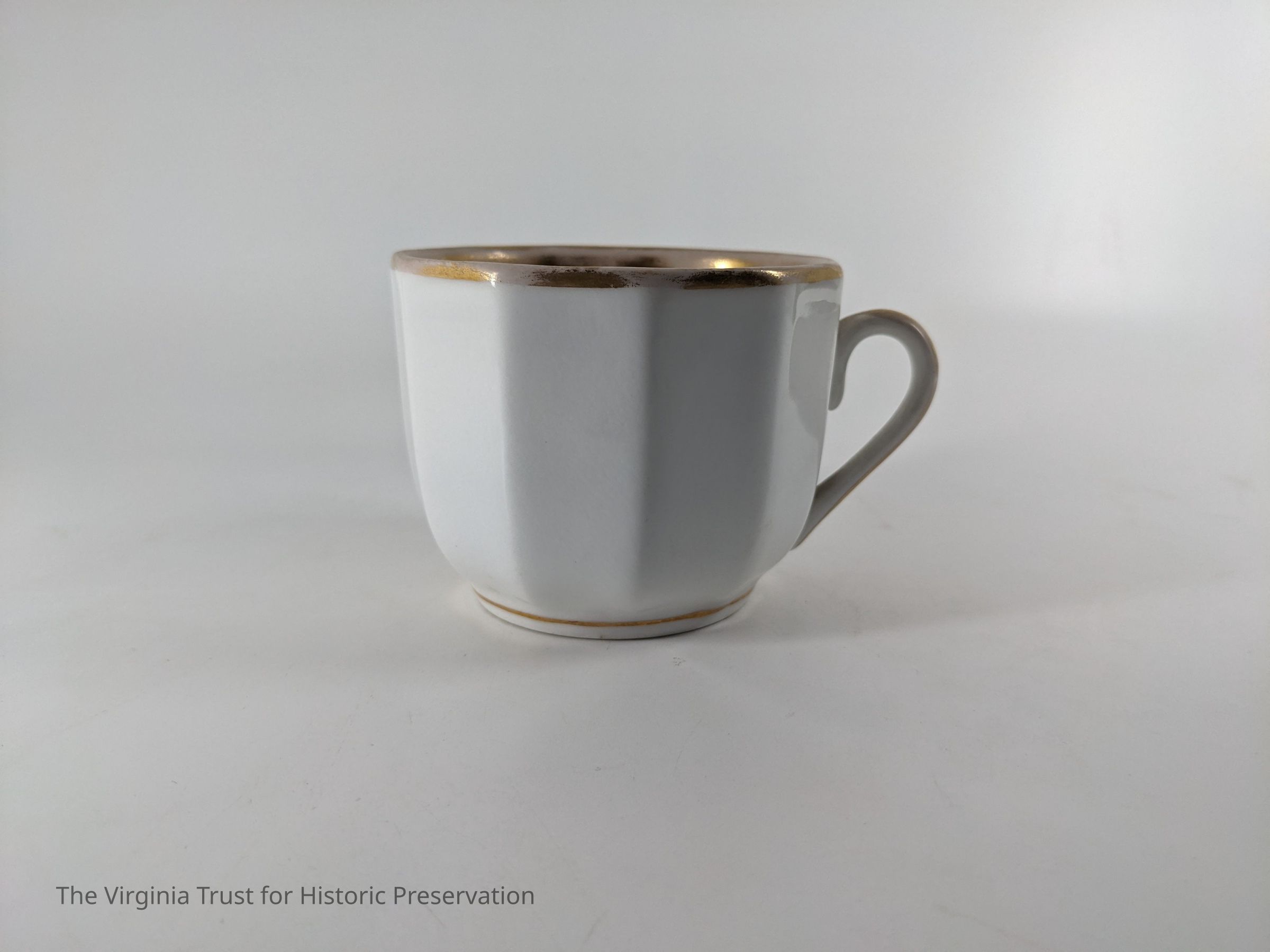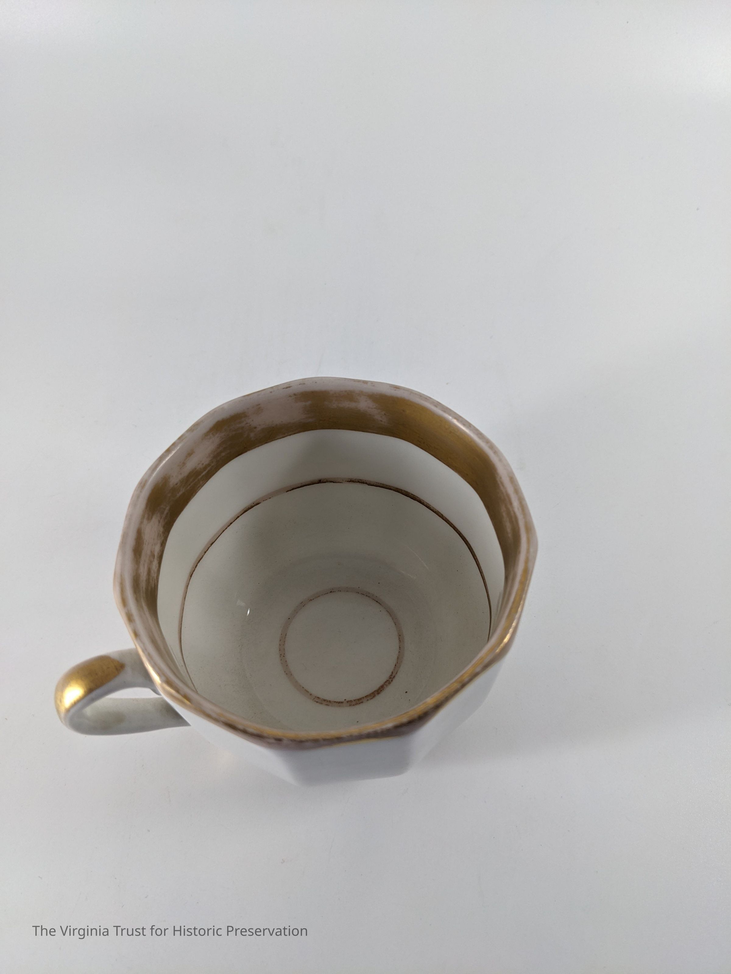 Teacup, white with gold bands of decoration inside and outside of cup.