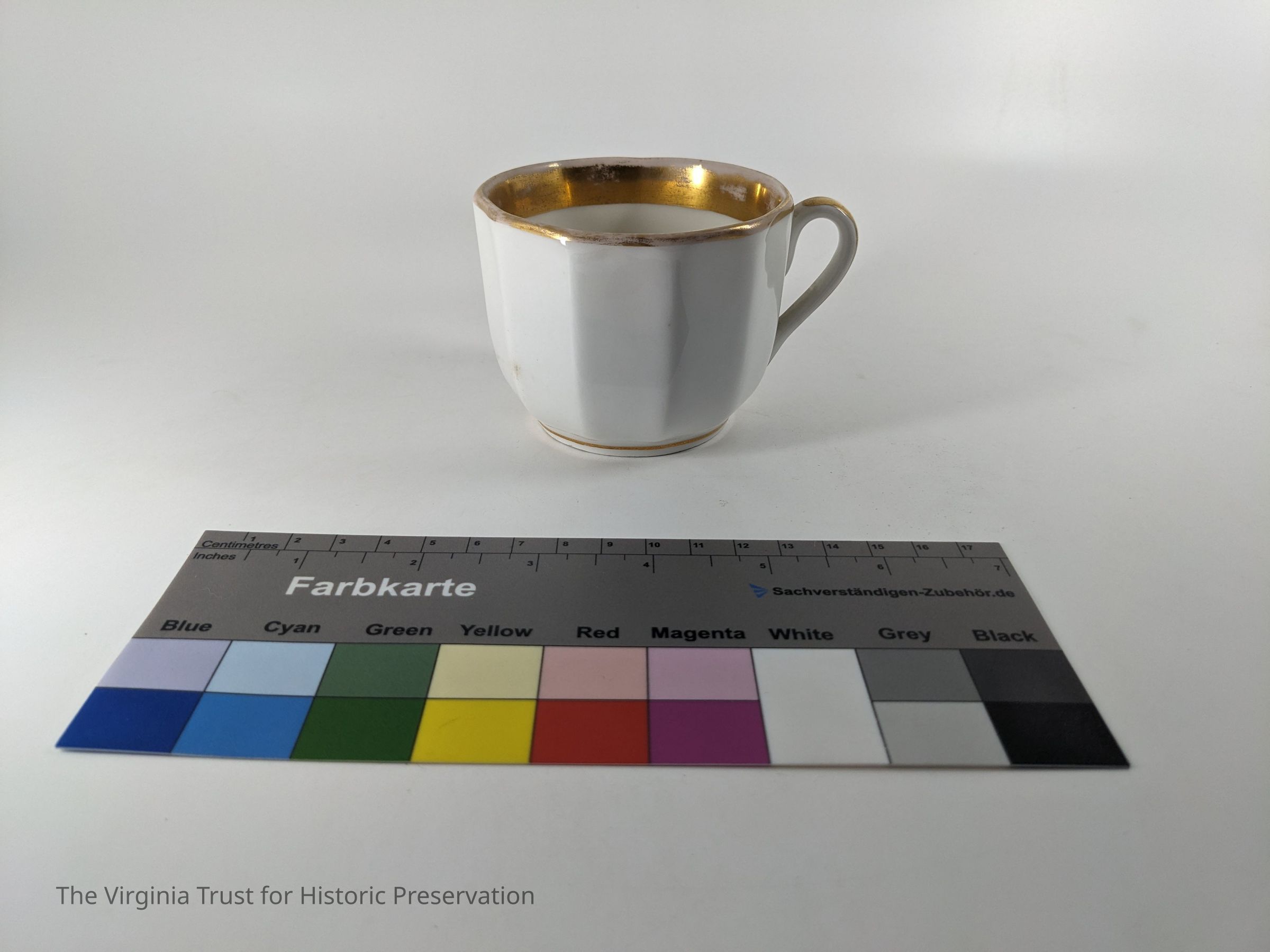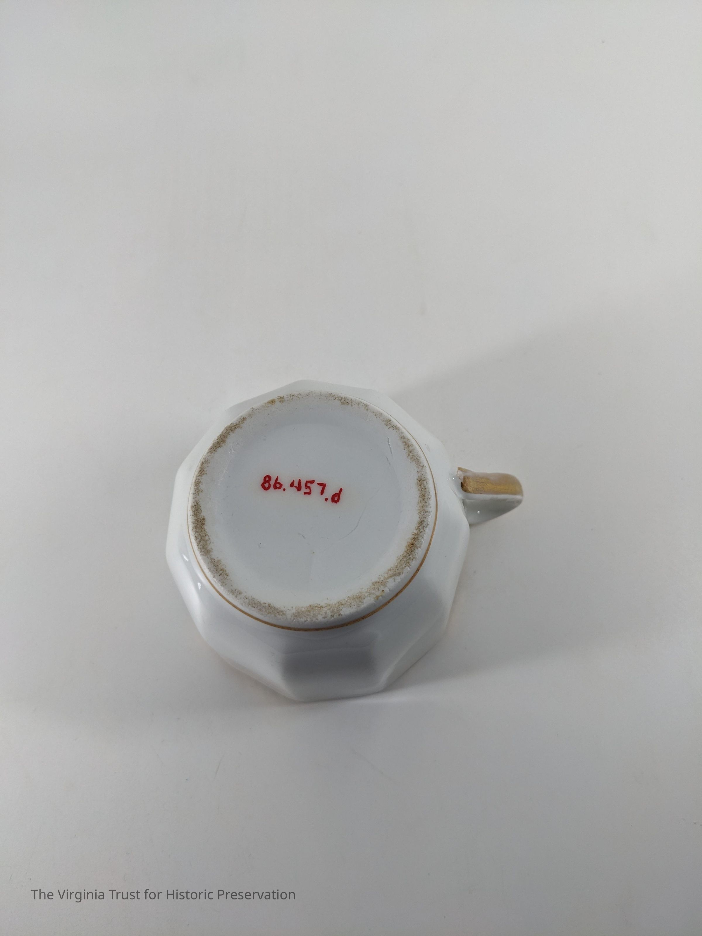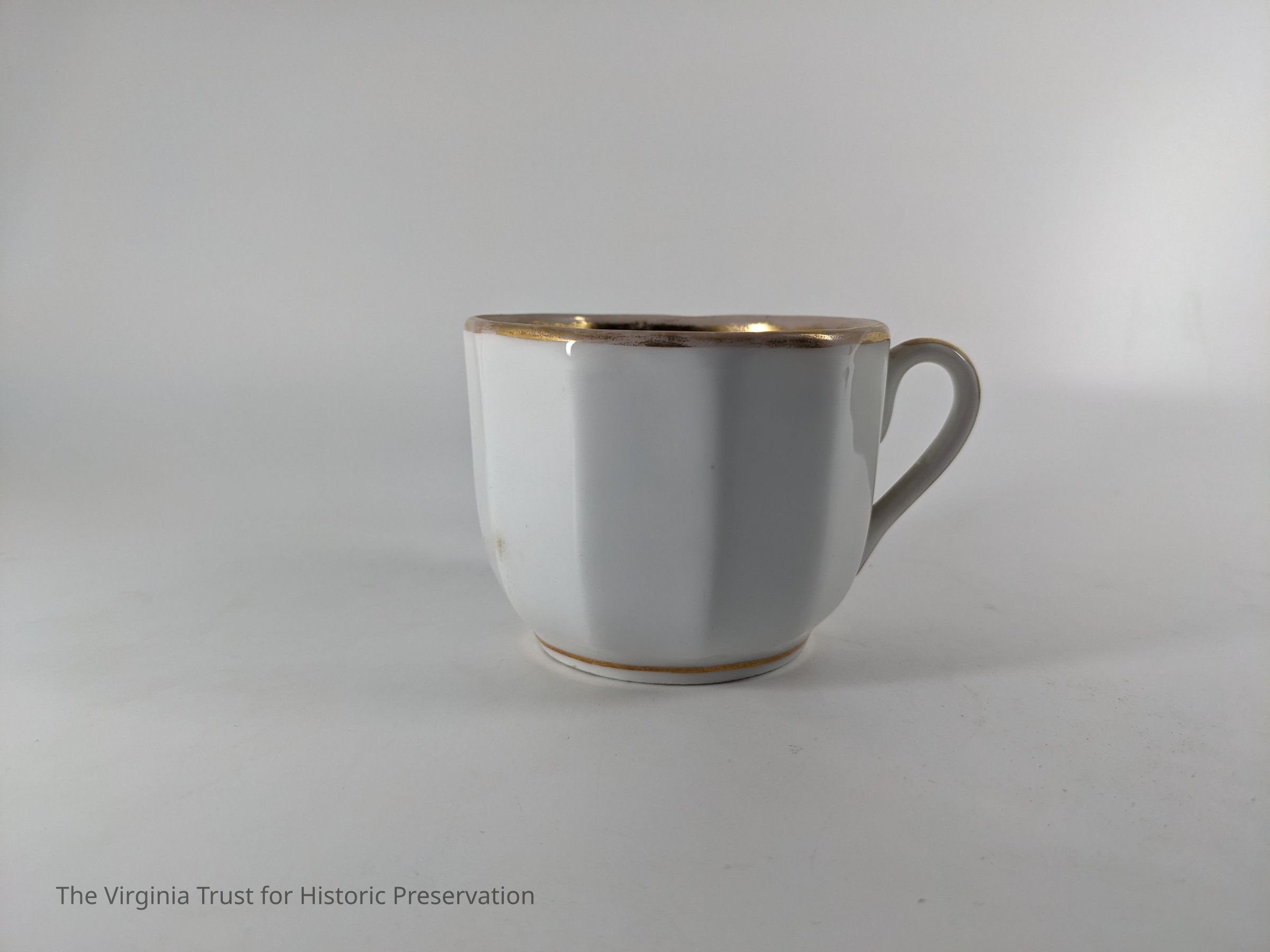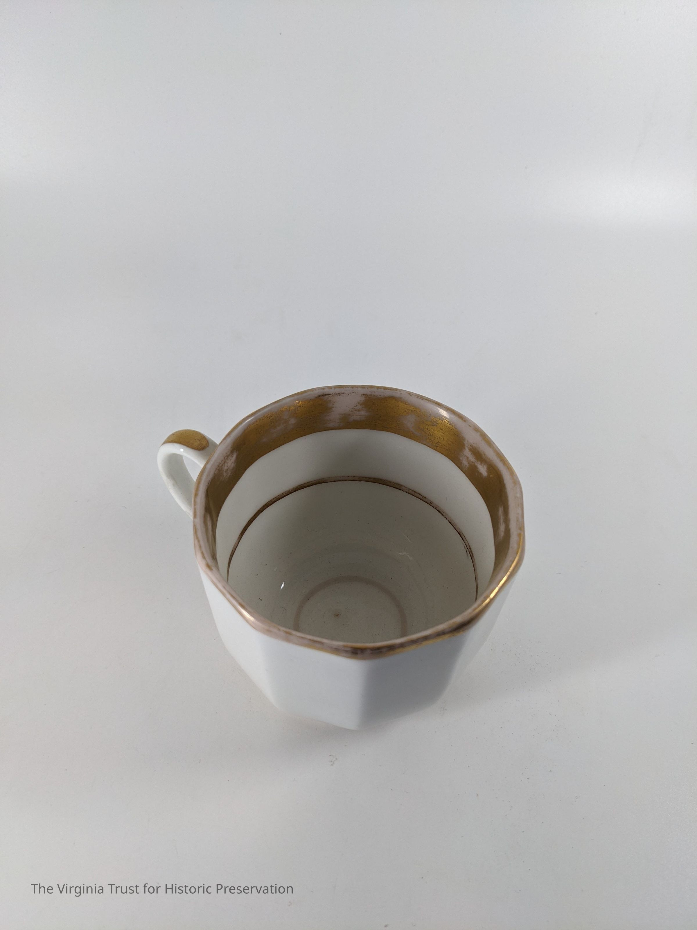 Teacup, white with gold bands of decoration inside and outside of cup.