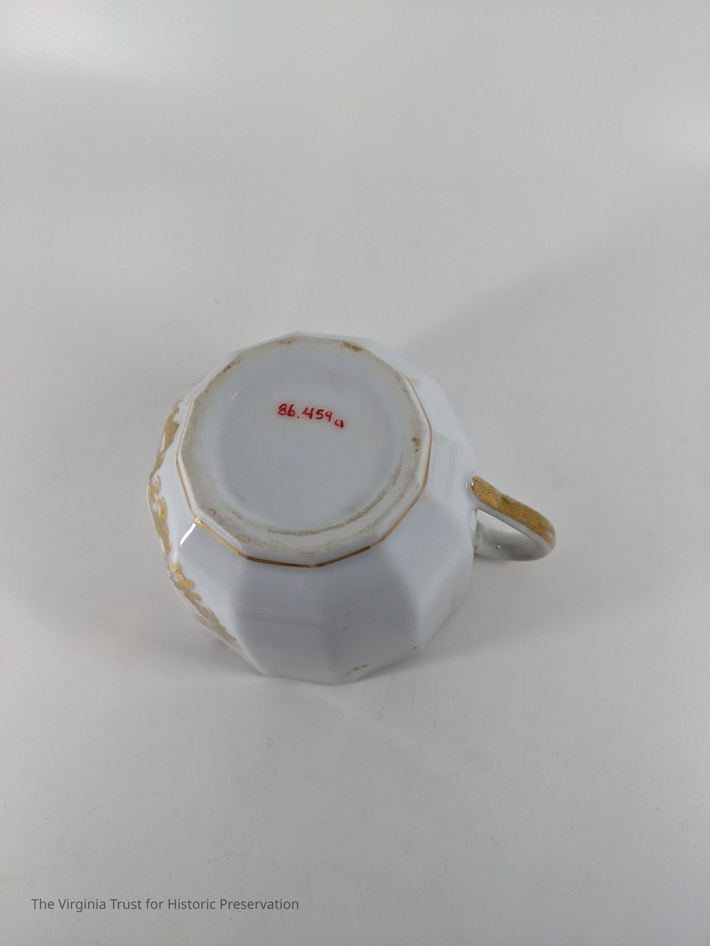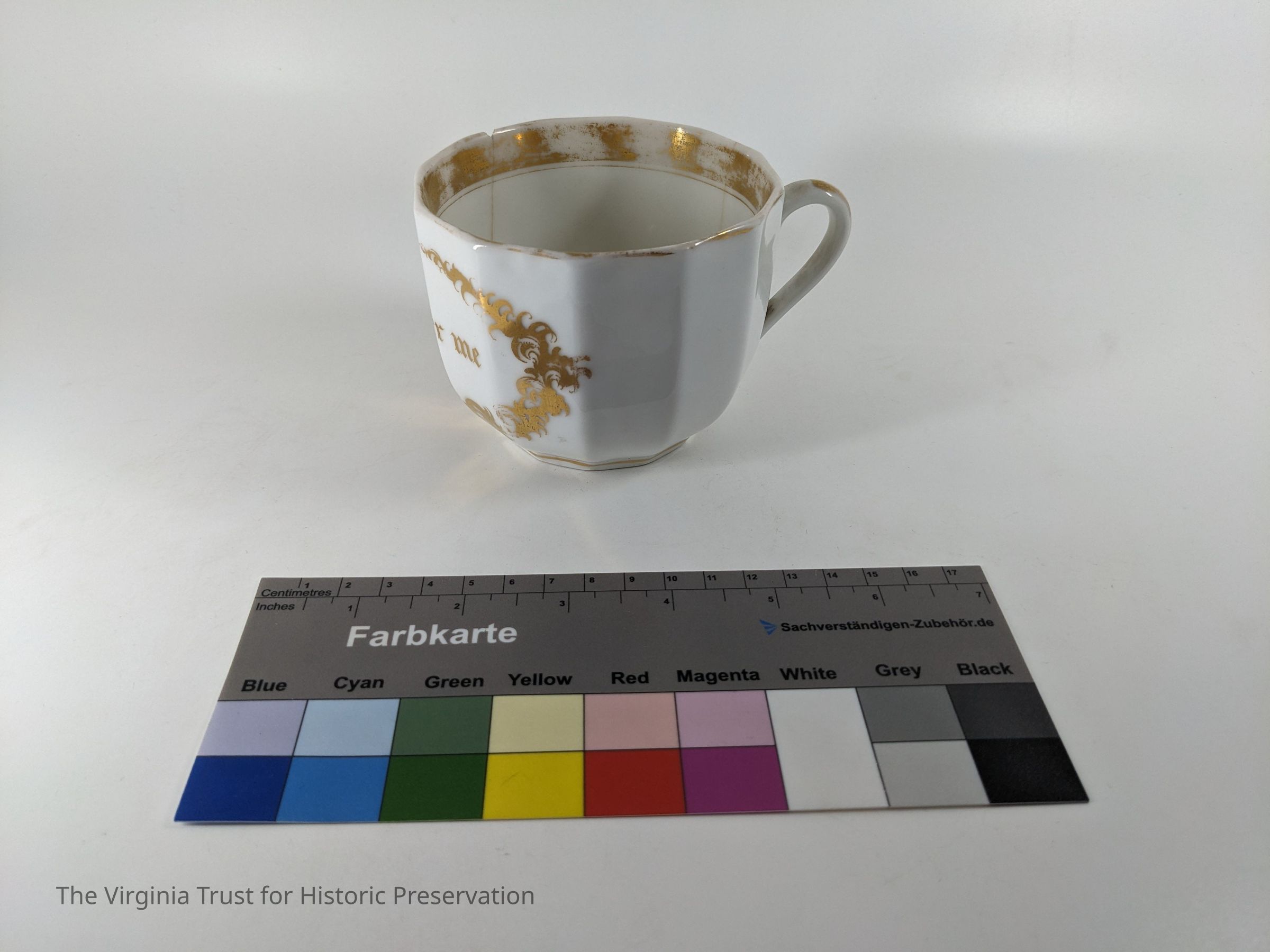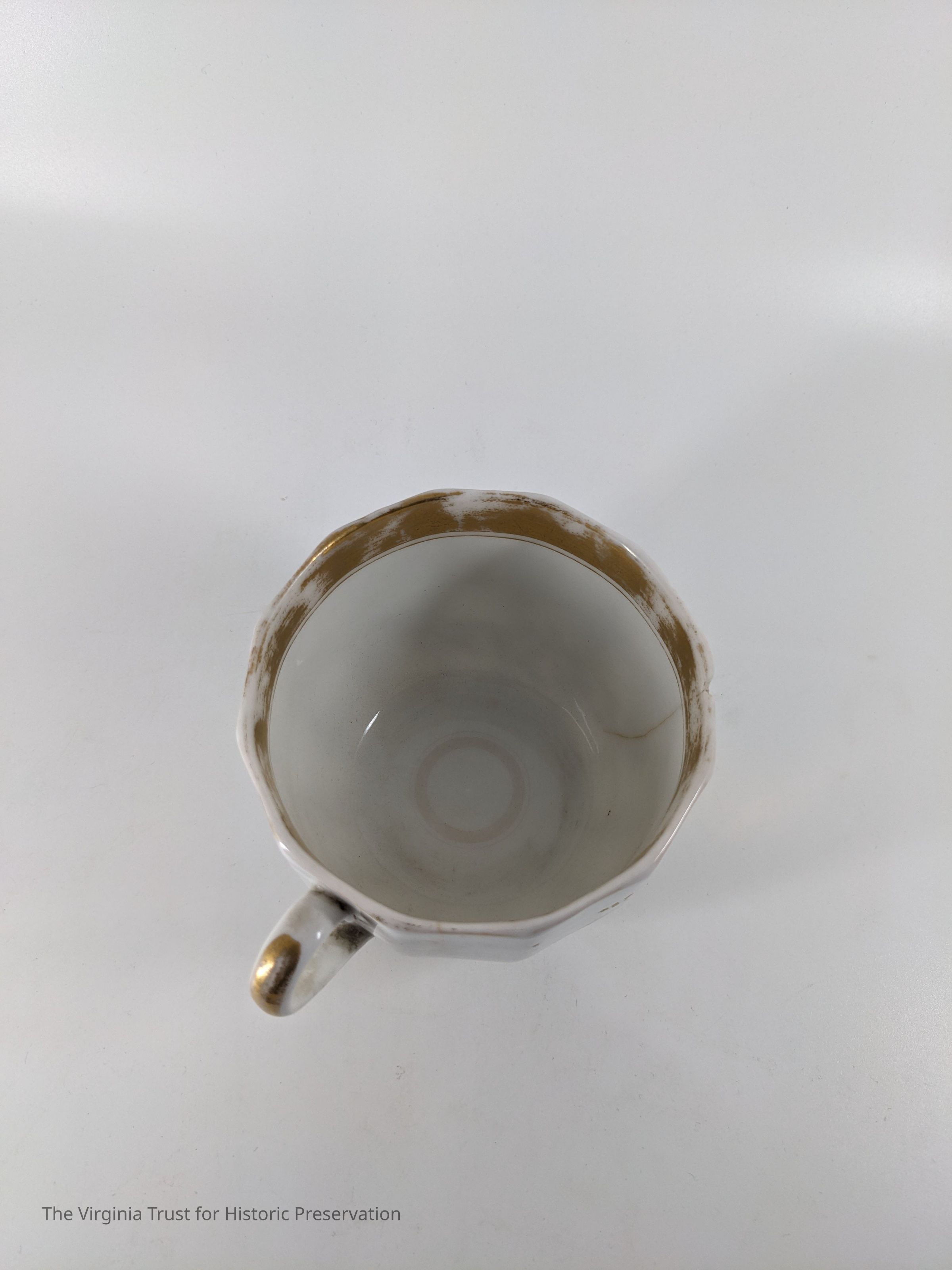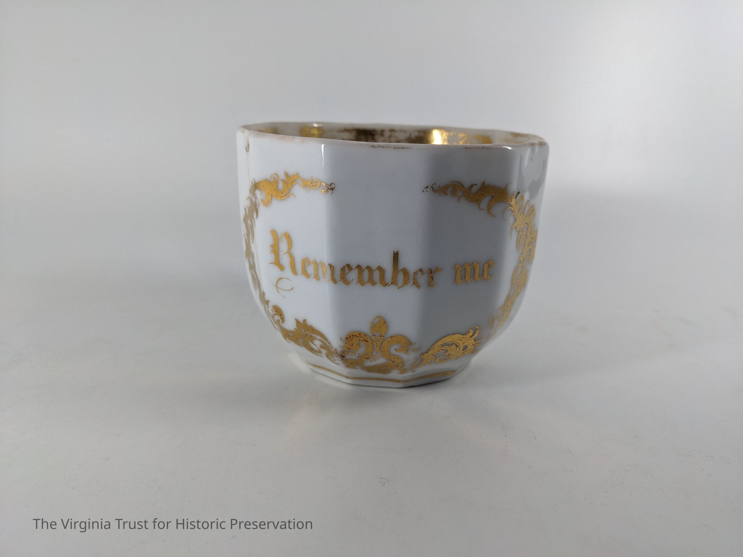 White china coffee cup with gold trim. "Remember Me" painted on the side of the cup.