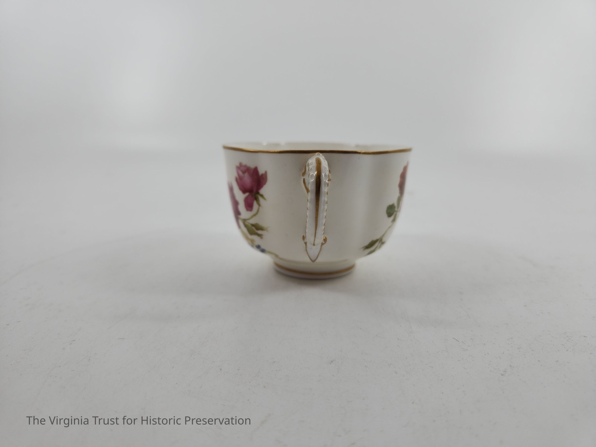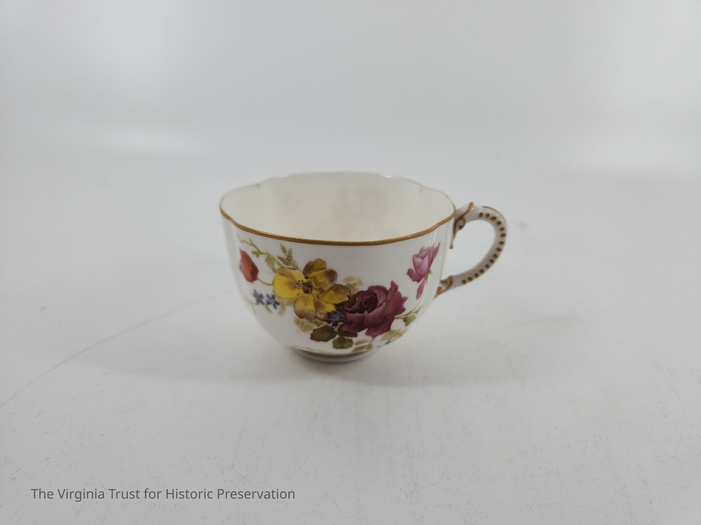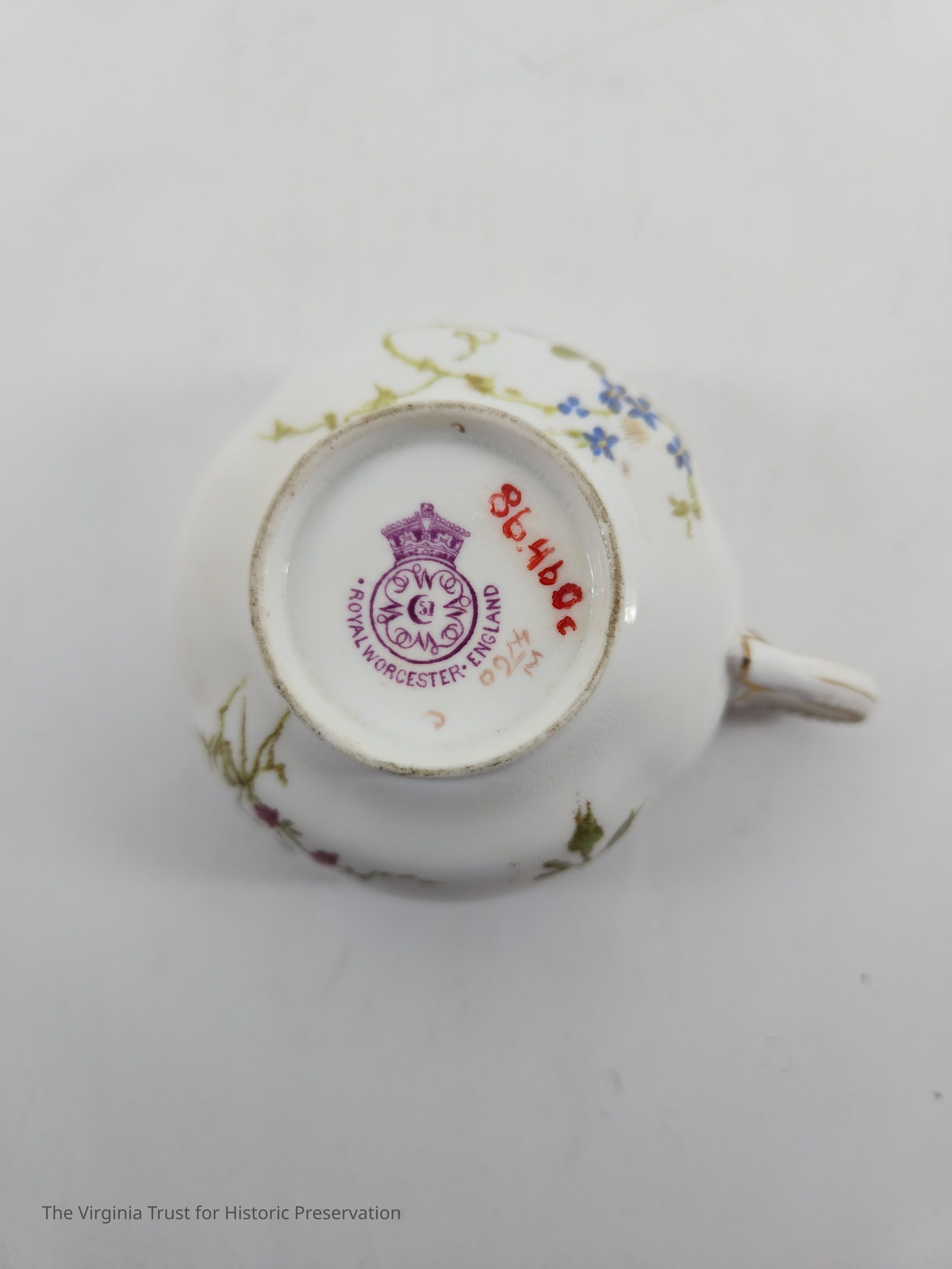One of a set of 4 teacups. Marked "Royal Worcester-England." "Ditchley China." White with floral design.