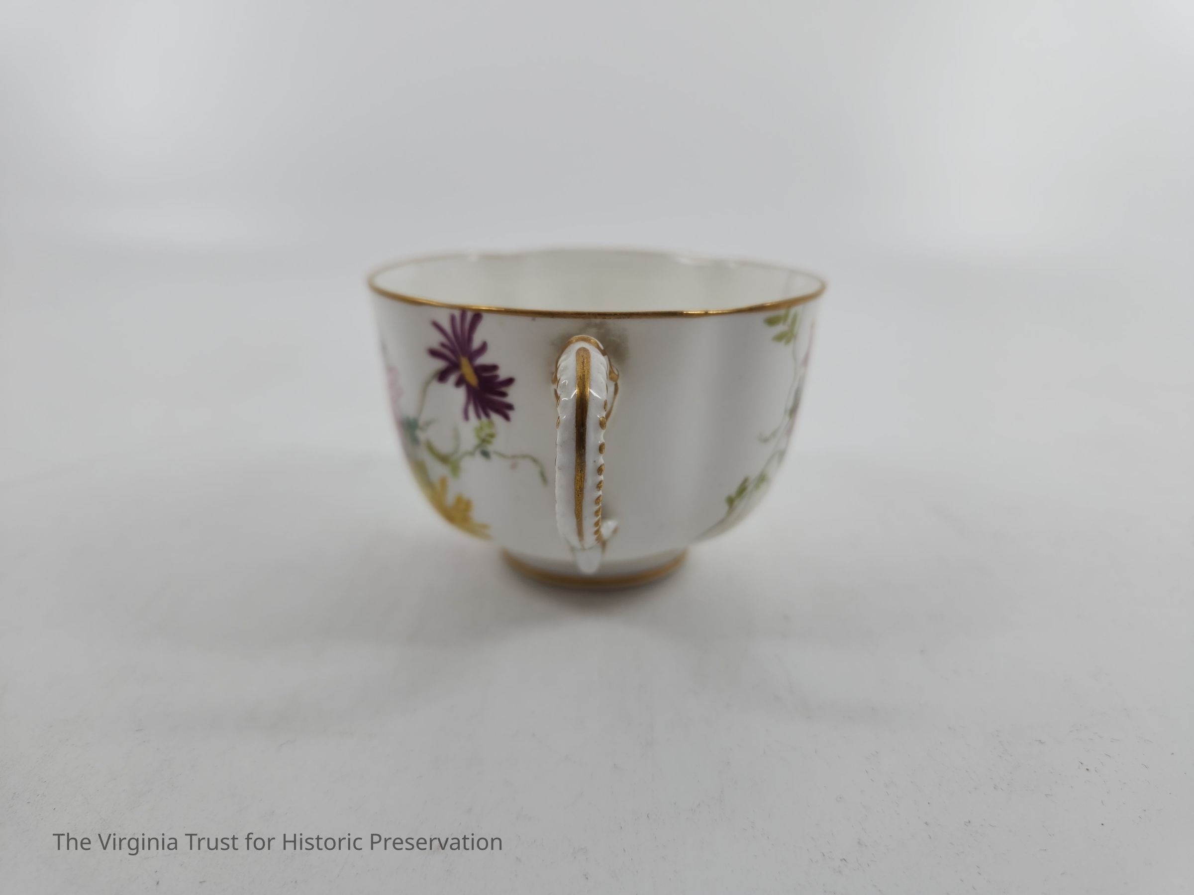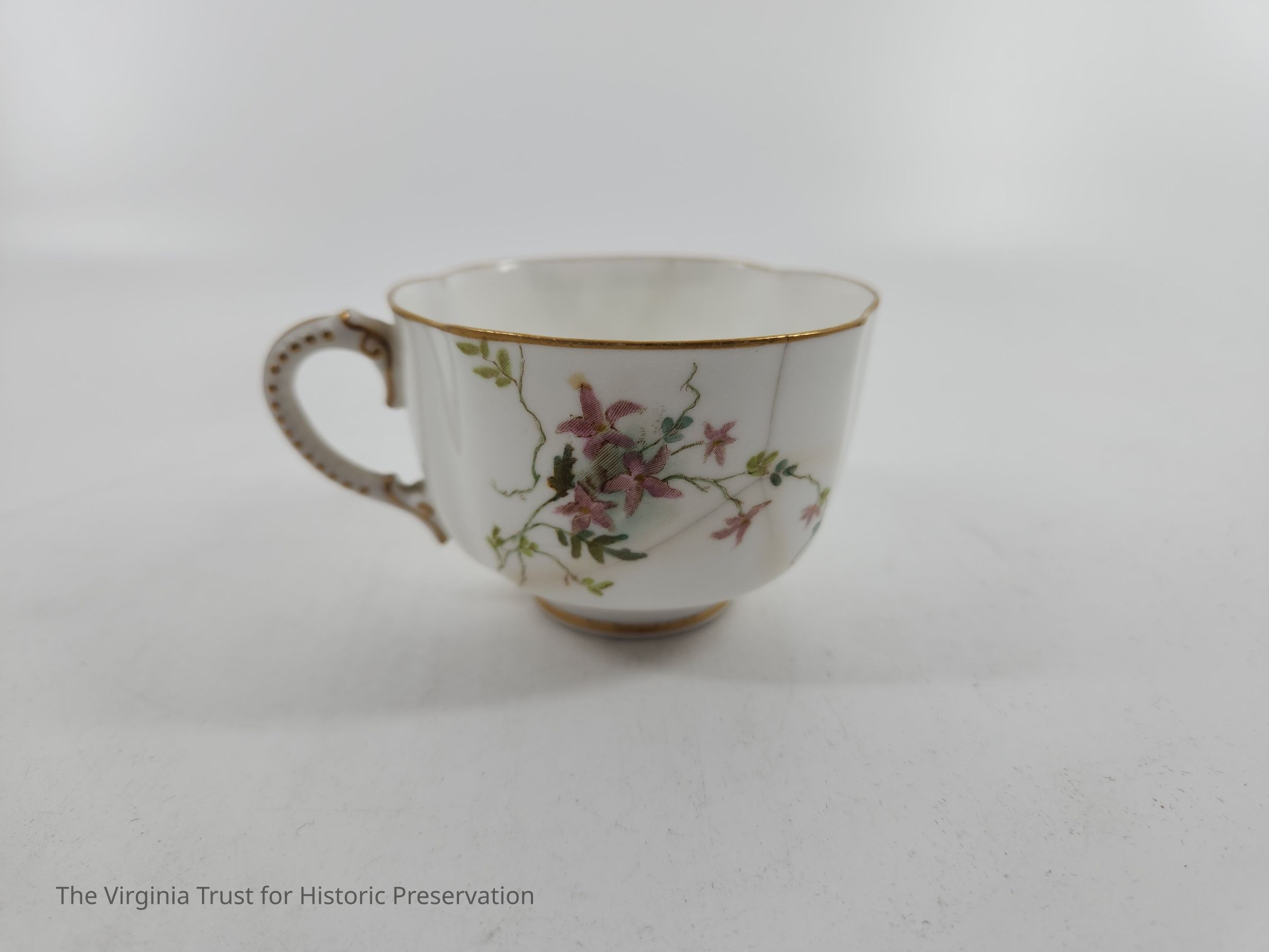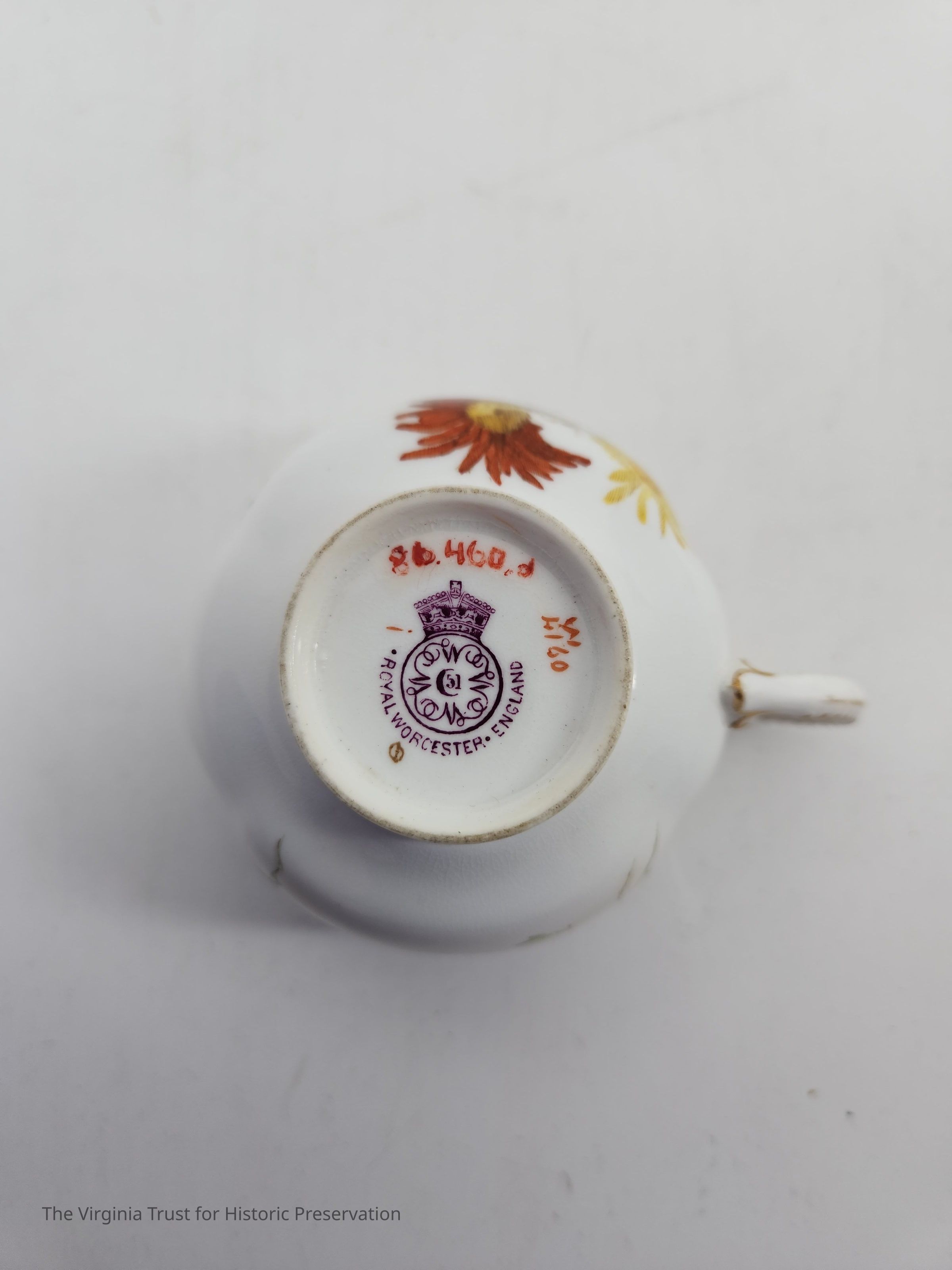 One of a set of 4 teacups. Marked "Royal Worcester-England." "Ditchley China." White with floral design.