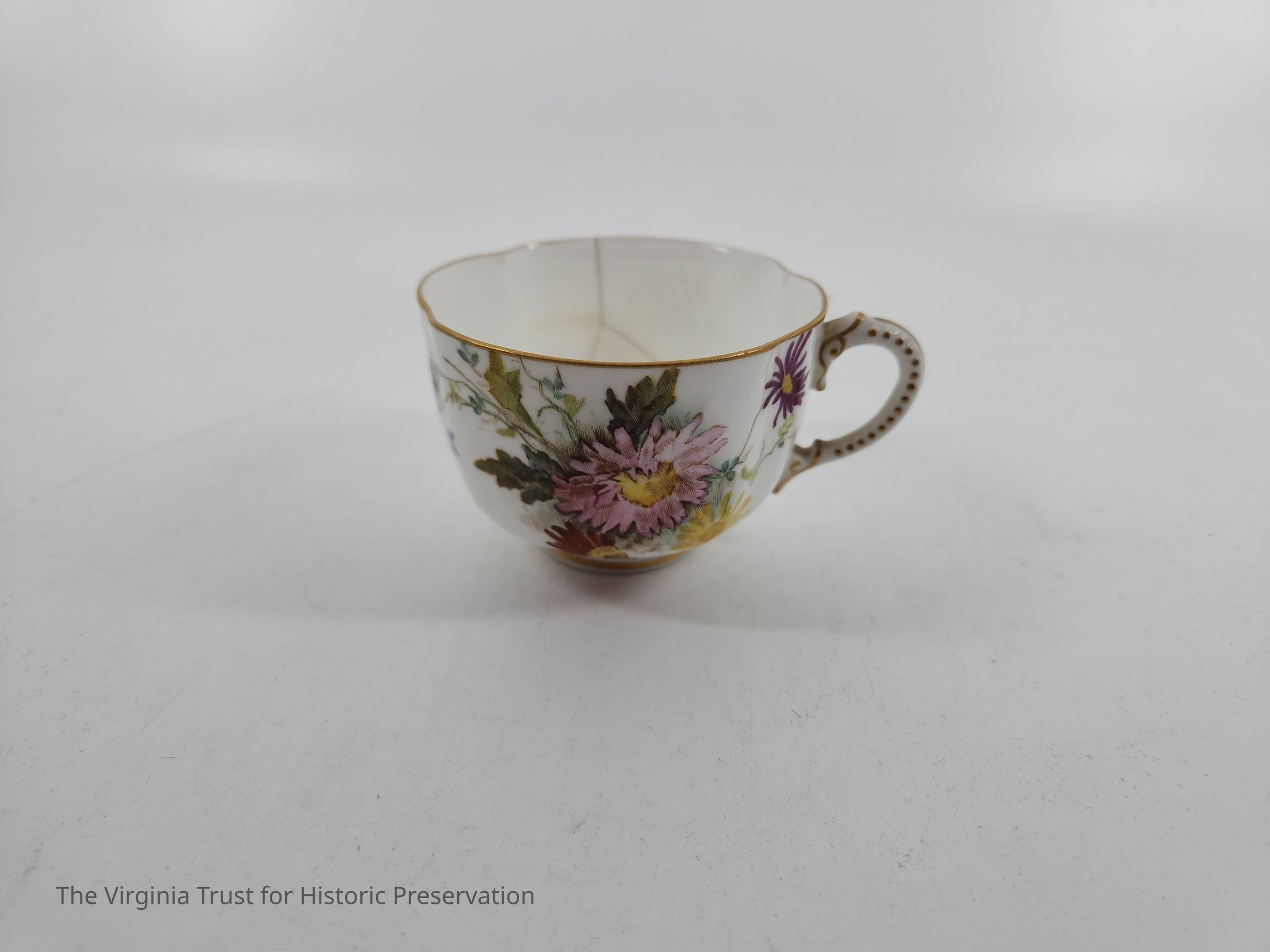 White ceramic teacup with pink, yellow, blue, and magenta floral design and a gold rim
