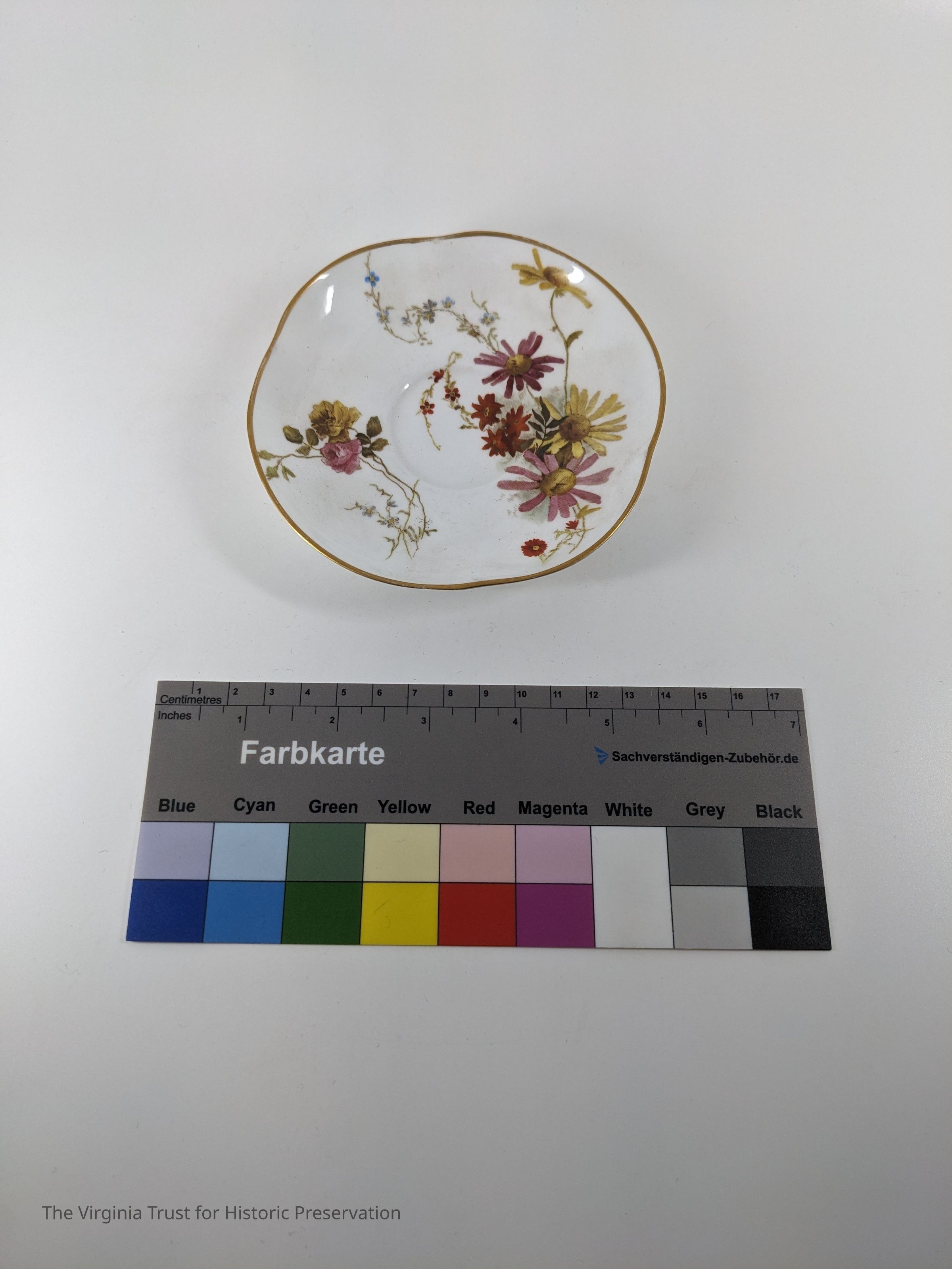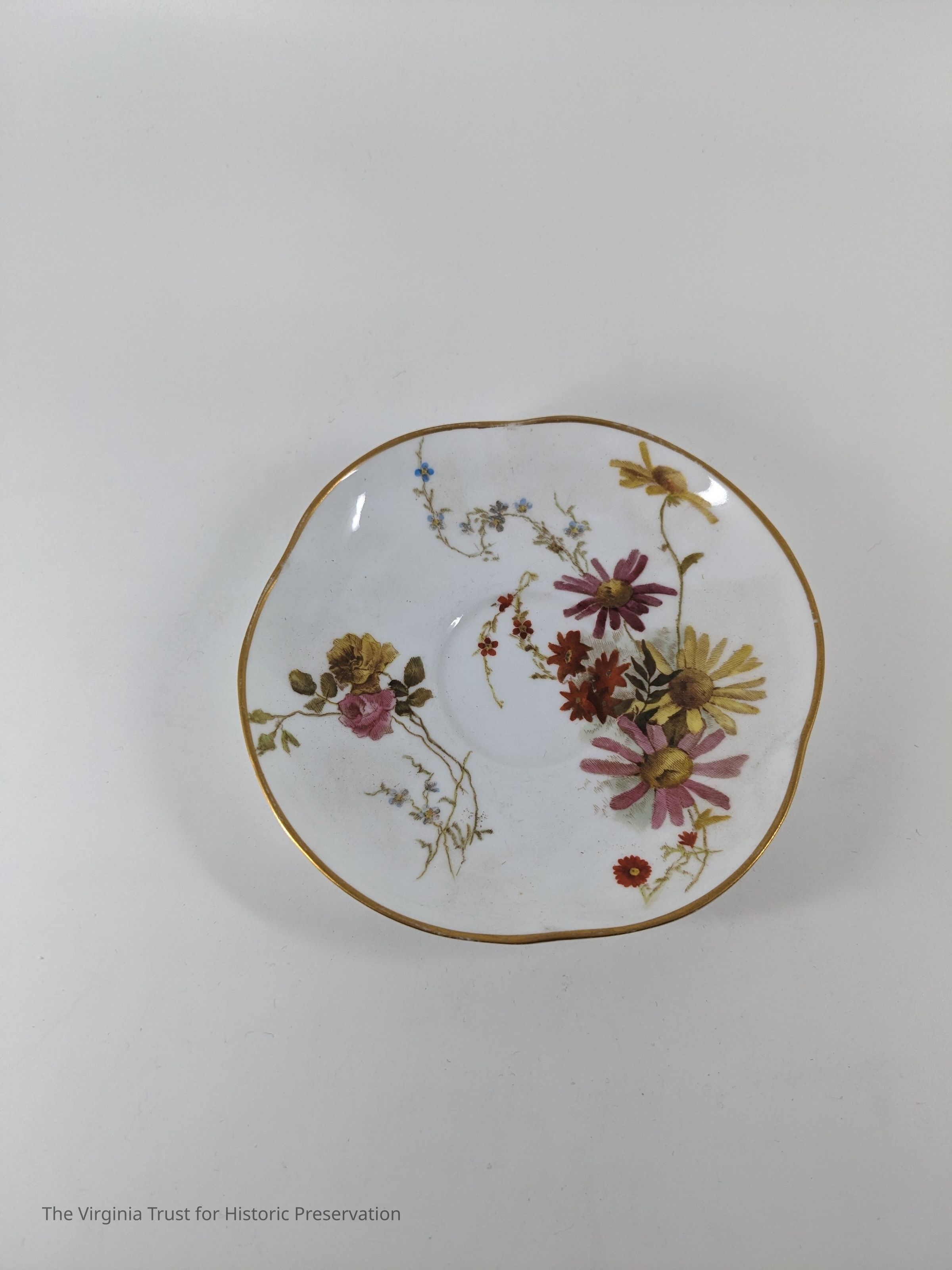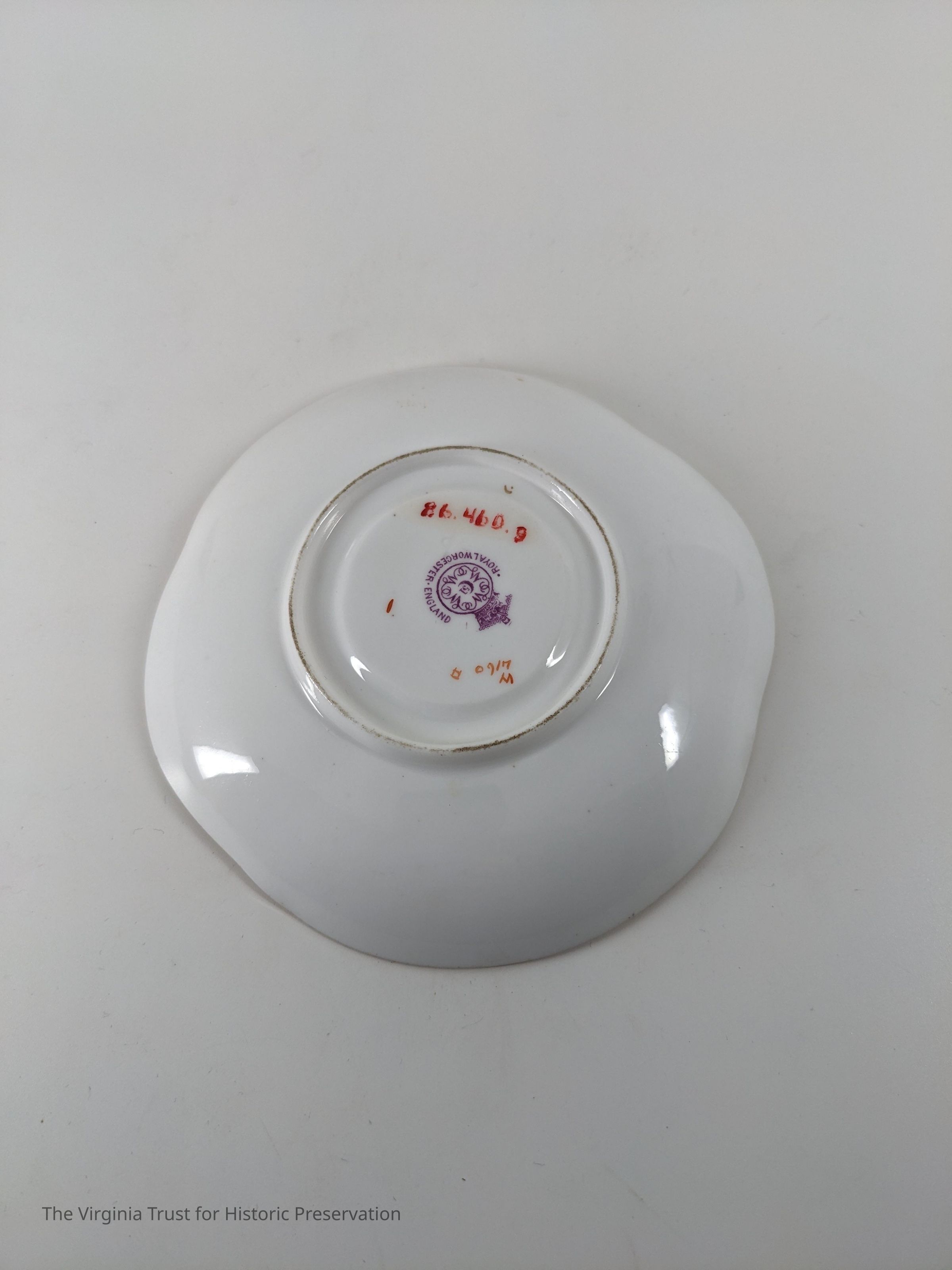 One of a set of 5 saucers. Marked "Royal Worcester-England." "Ditchley China." White with floral design.
