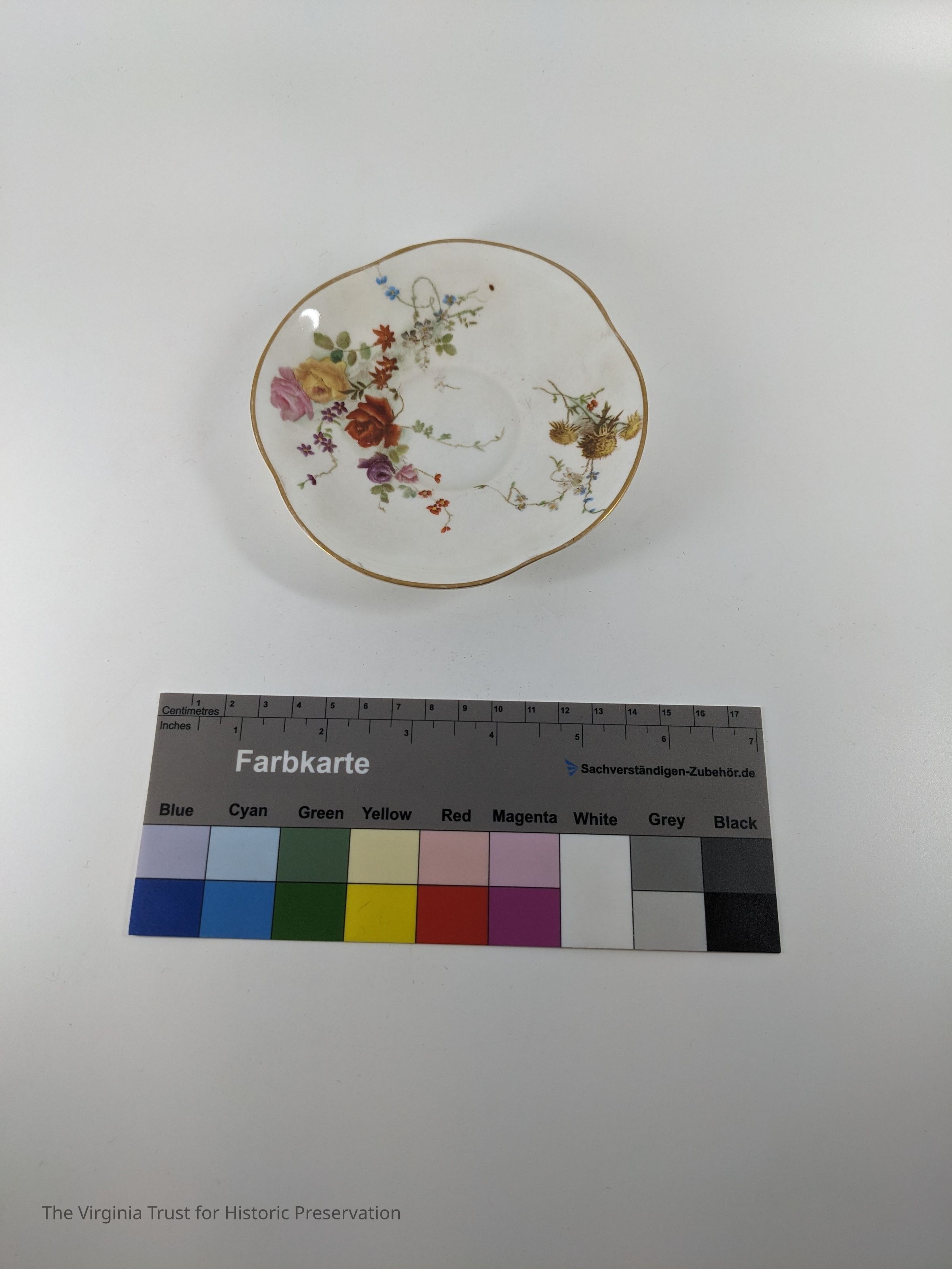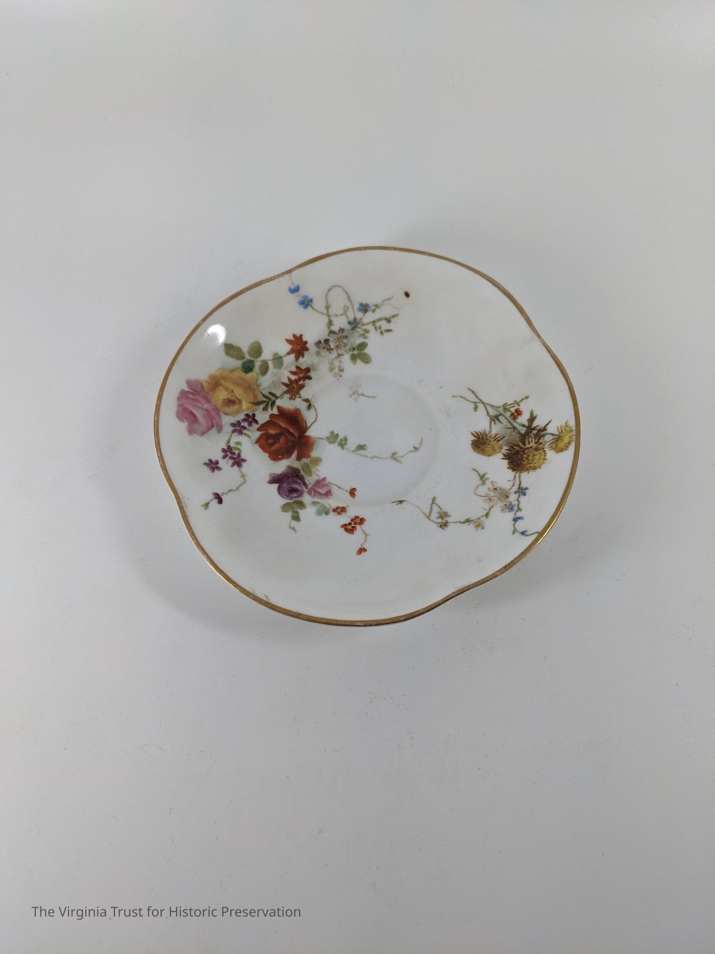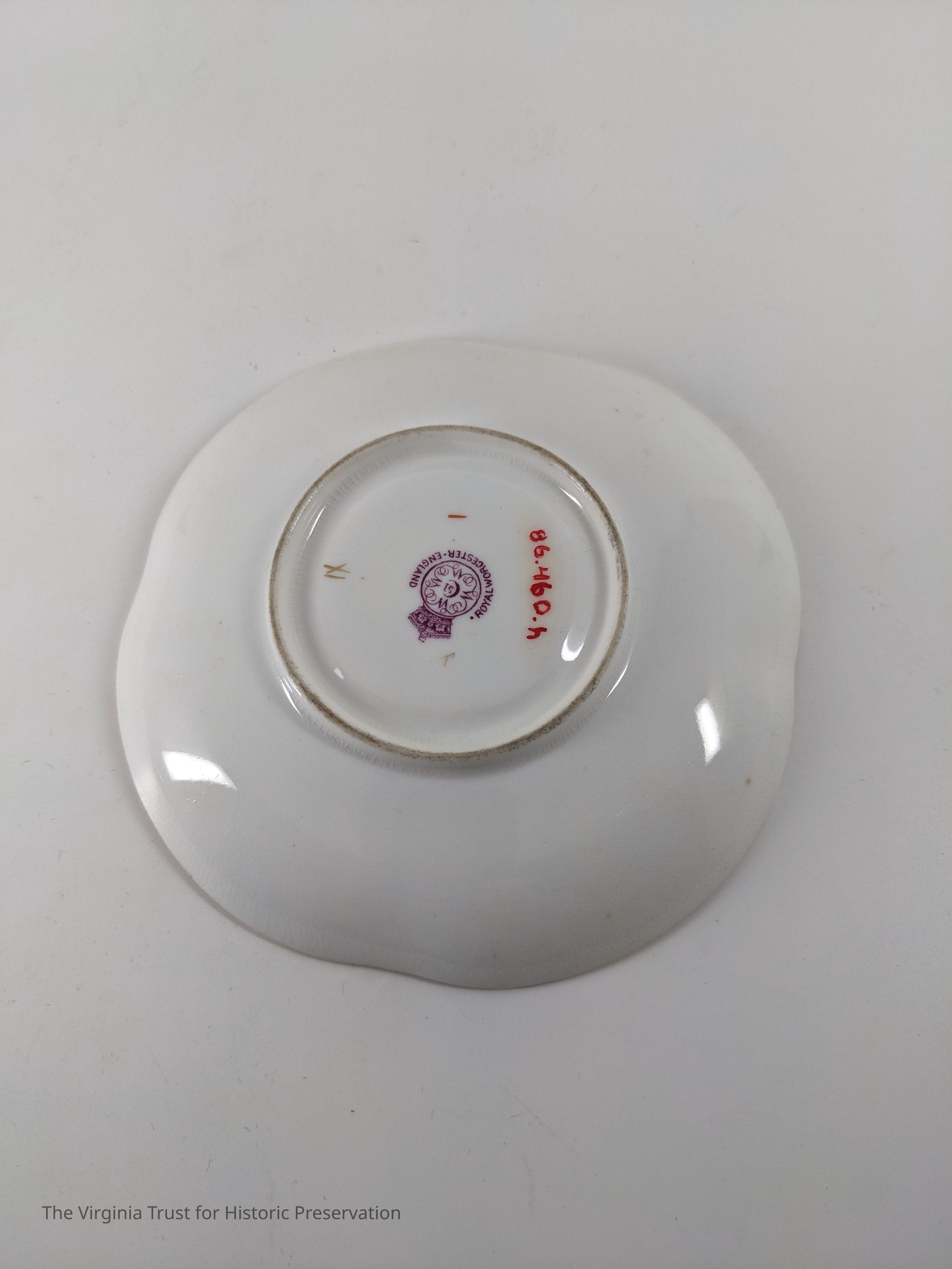 One of a set of 5 saucers. Marked "Royal Worcester-England." "Ditchley China." White with floral design.