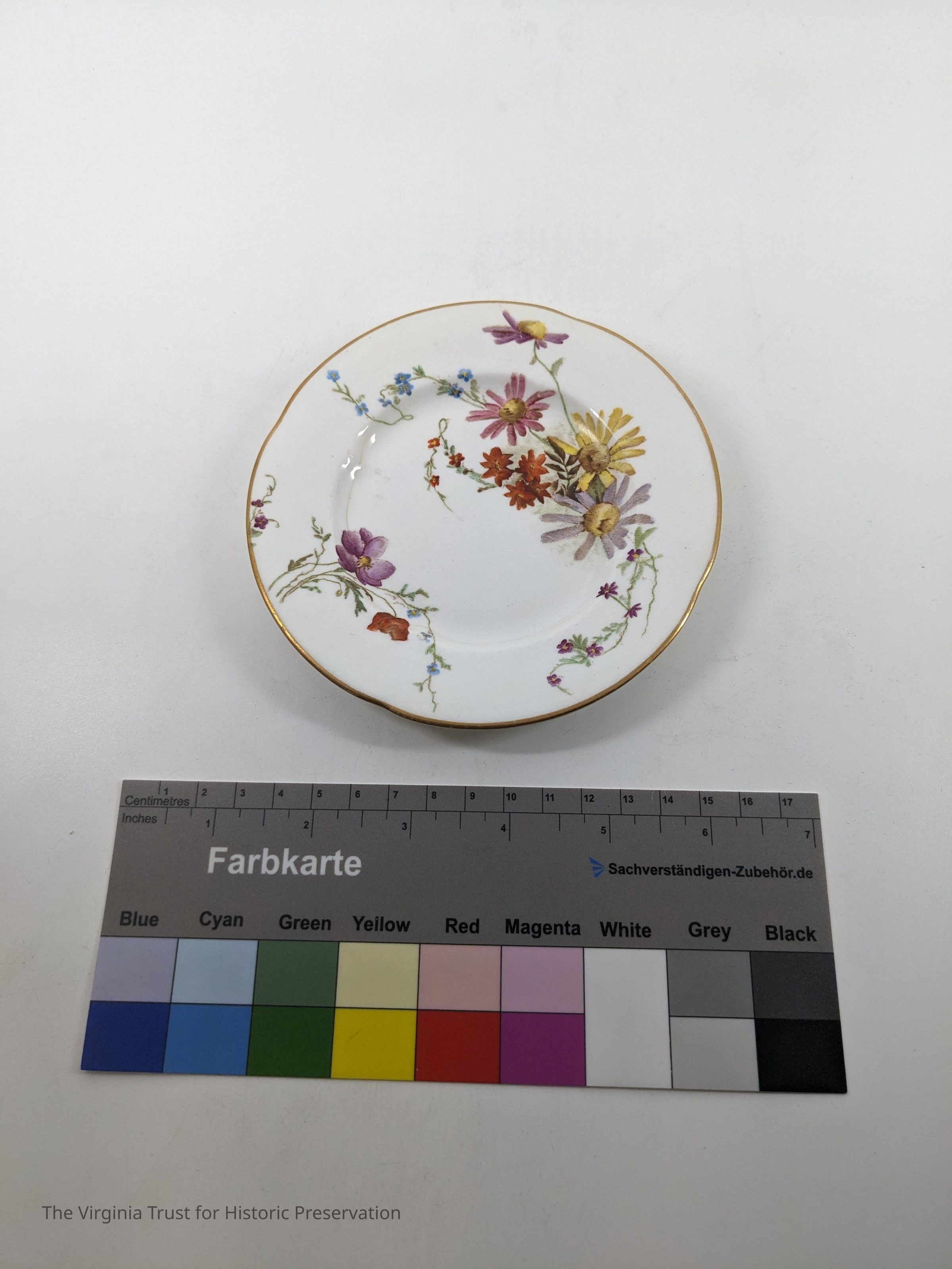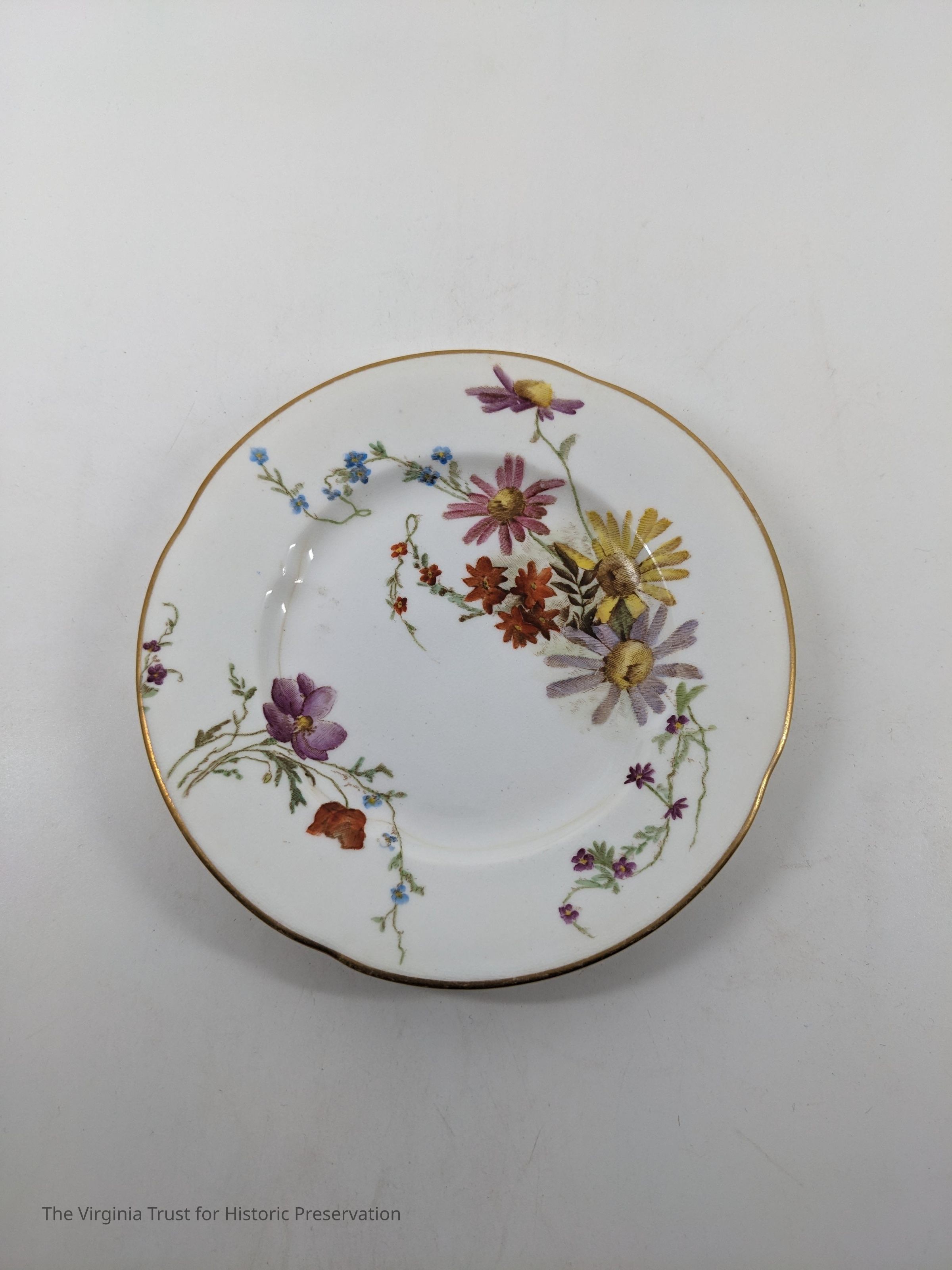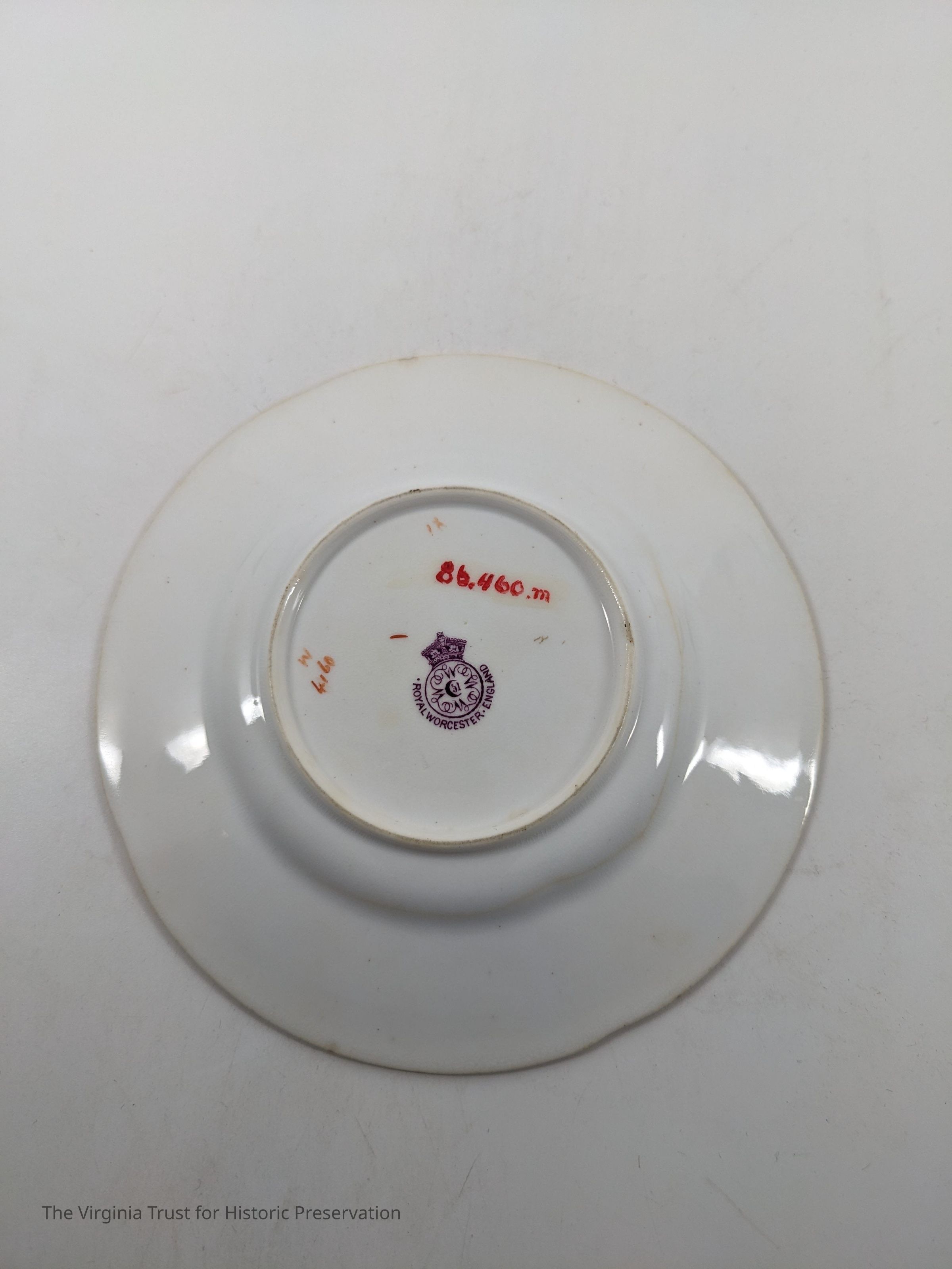 One of a set of 4 plates. White with floral design and gold rim. Marked "Royal Worcester-England." "Ditchley China."