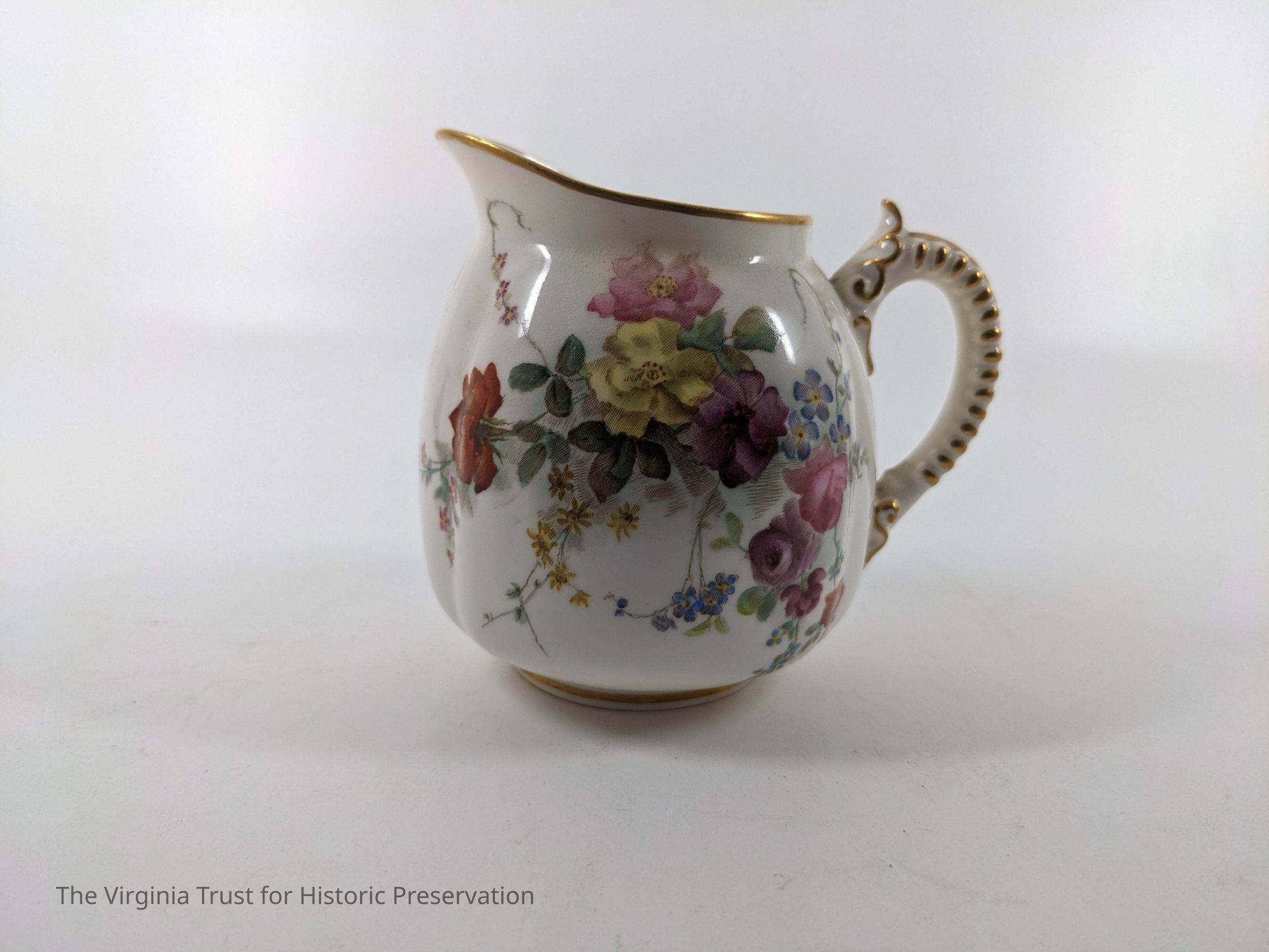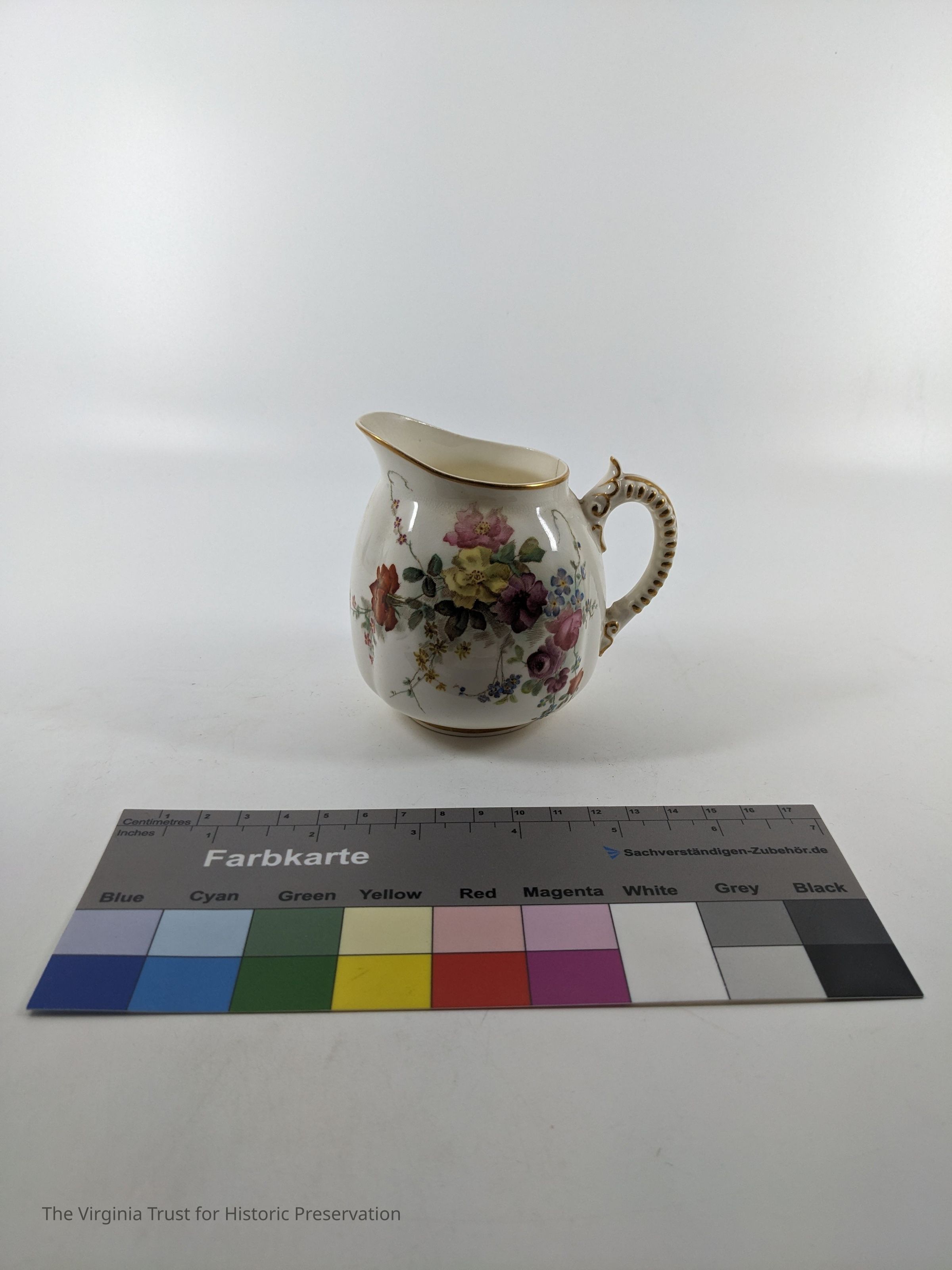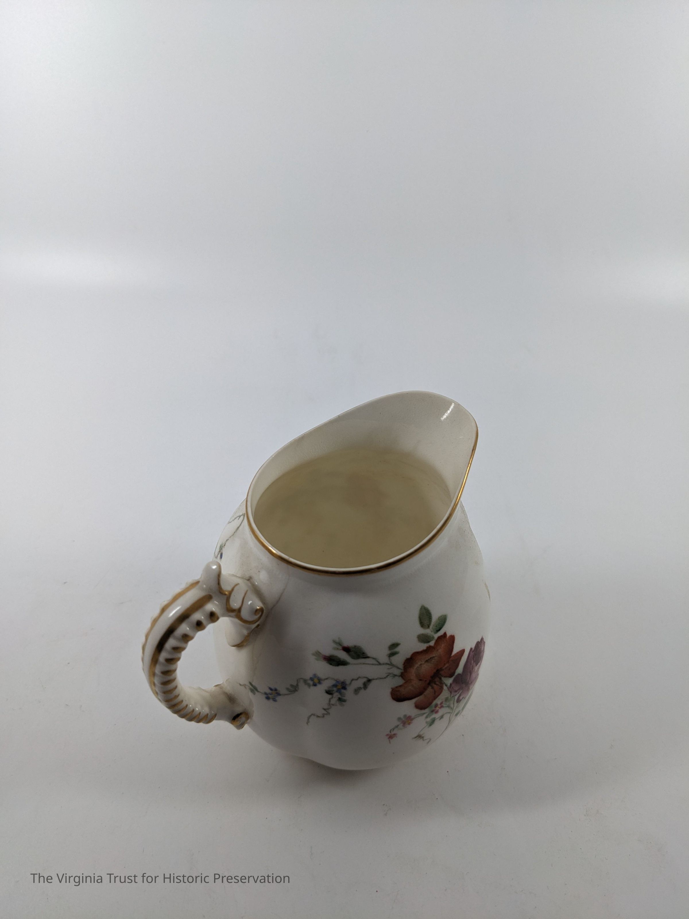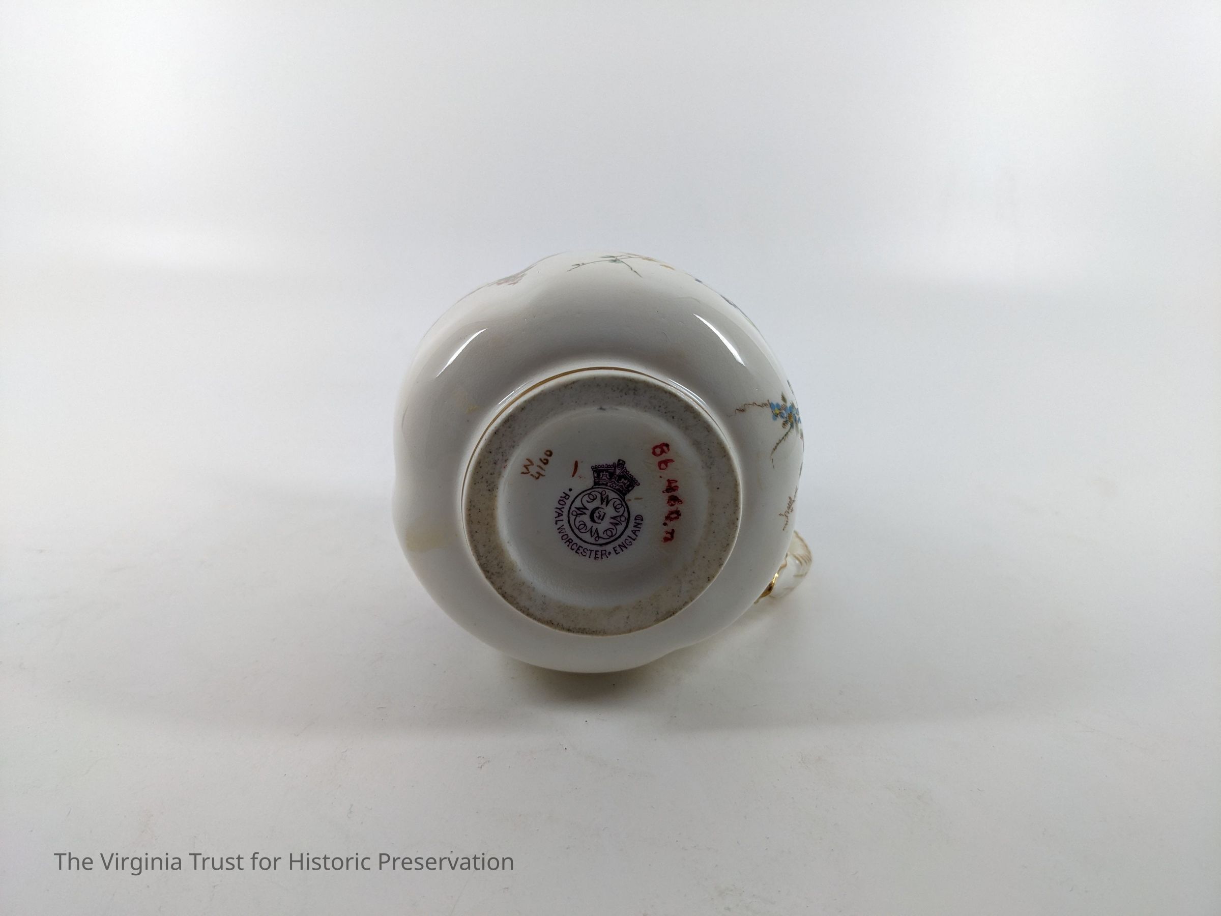 Small cream pitcher. Marked "Royal Worcester-England." "Ditchley China." White with floral design.