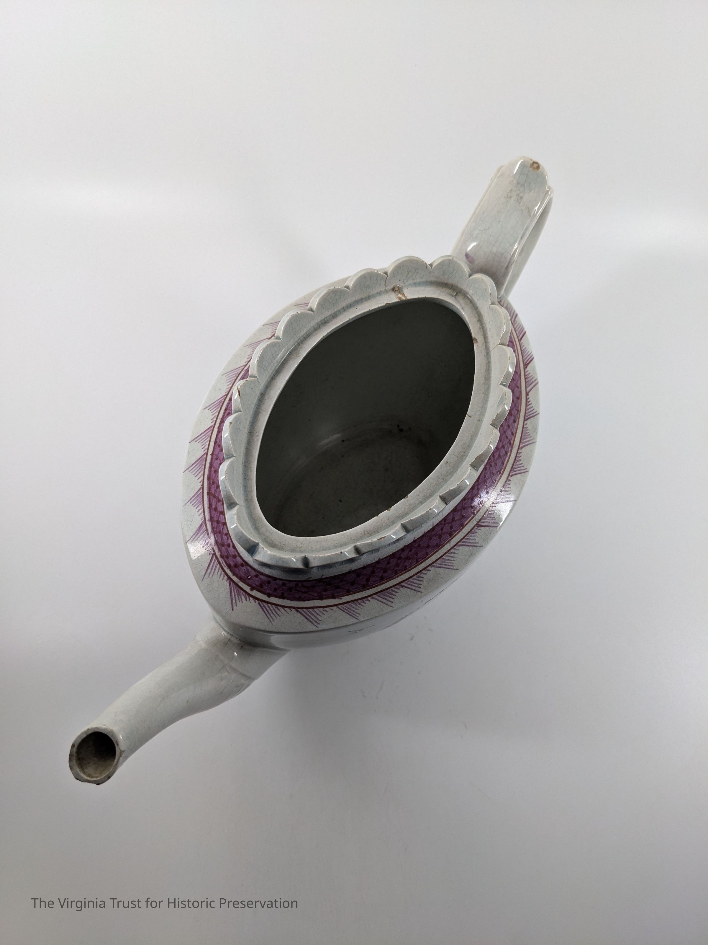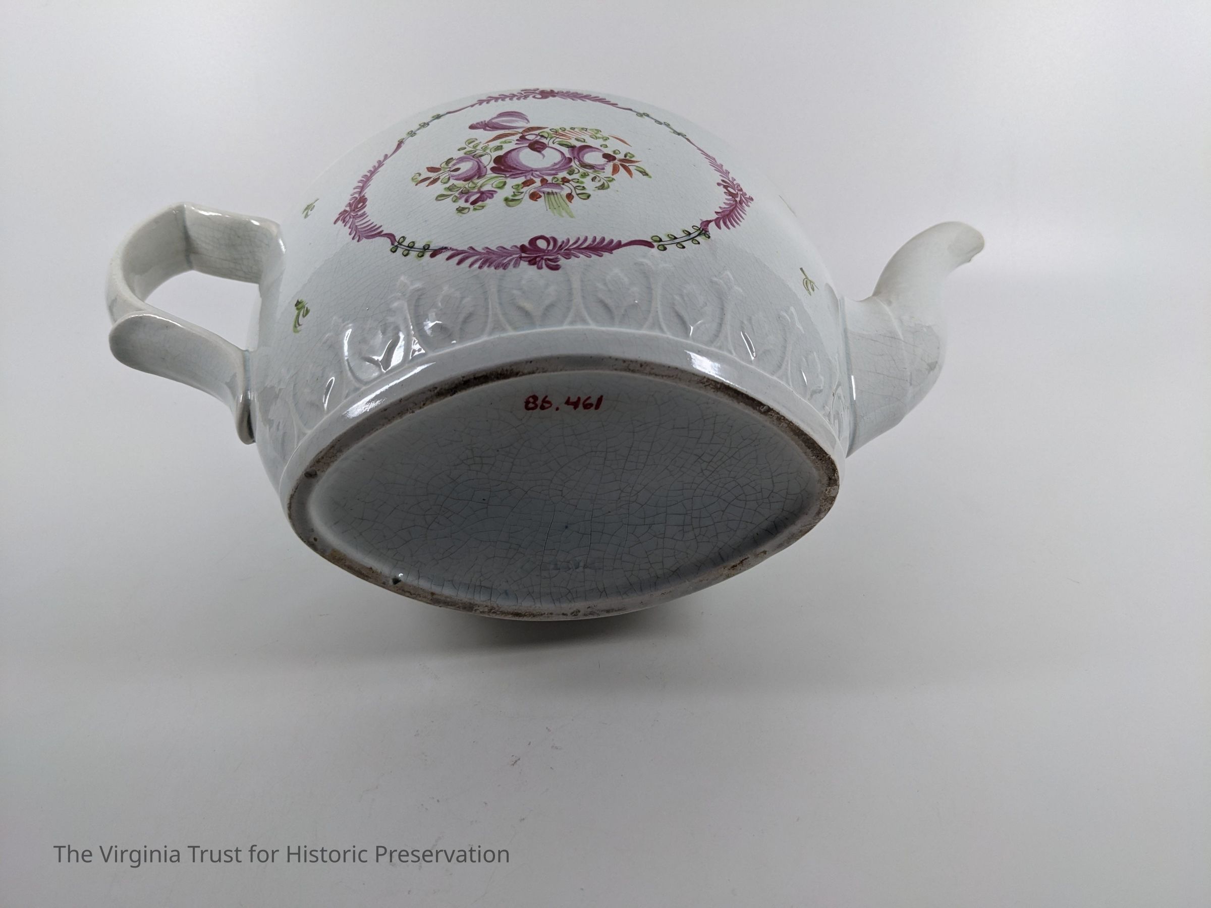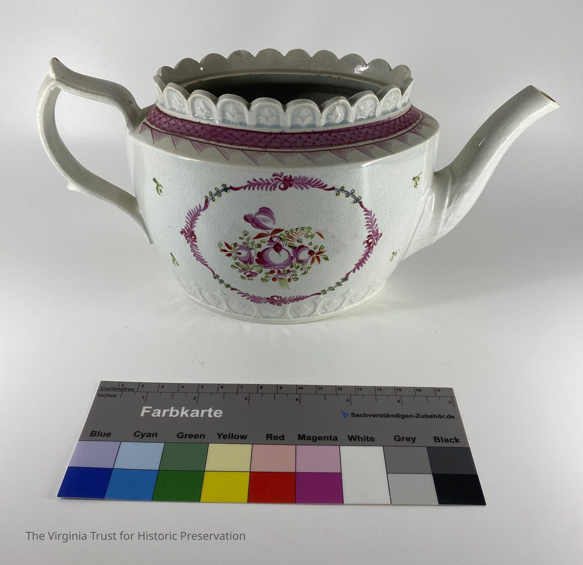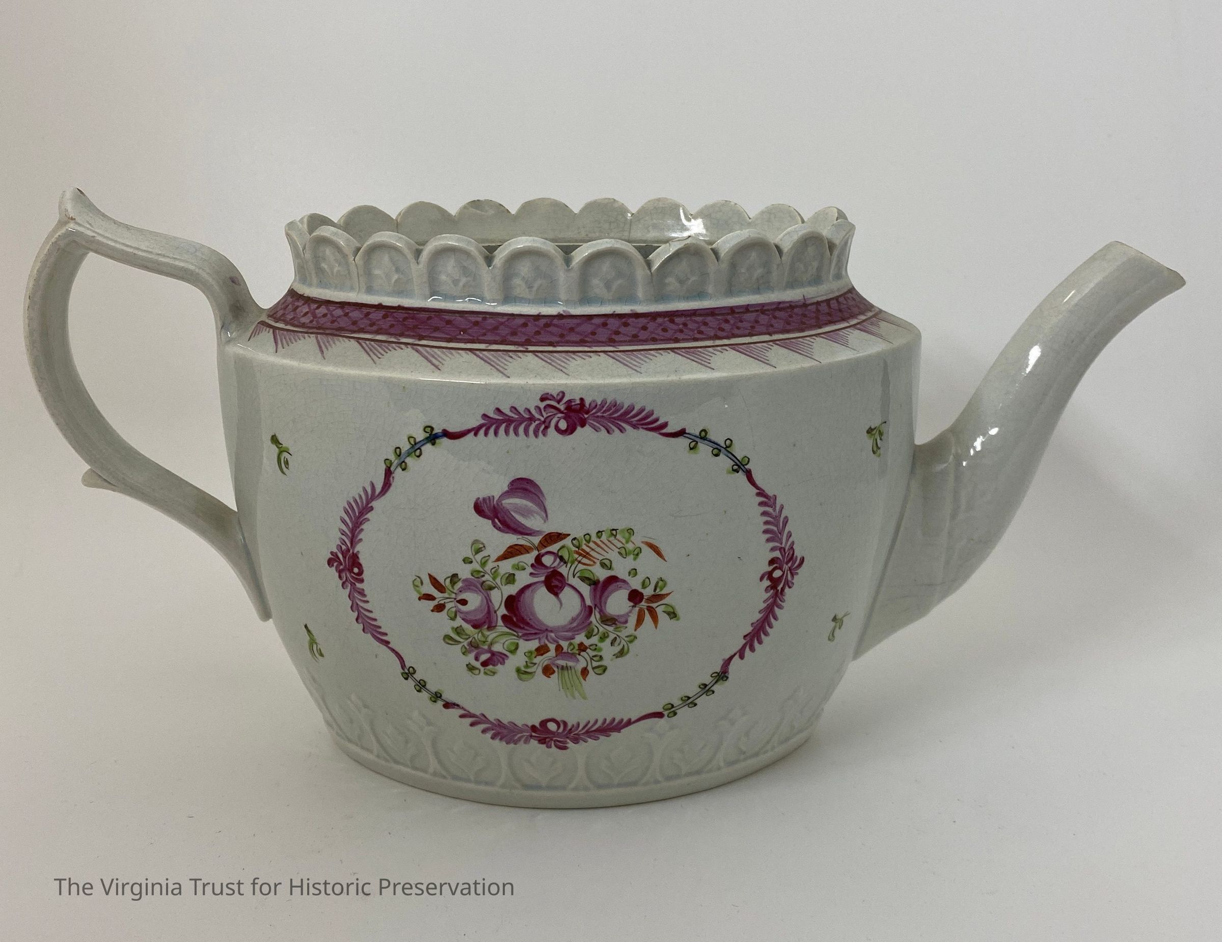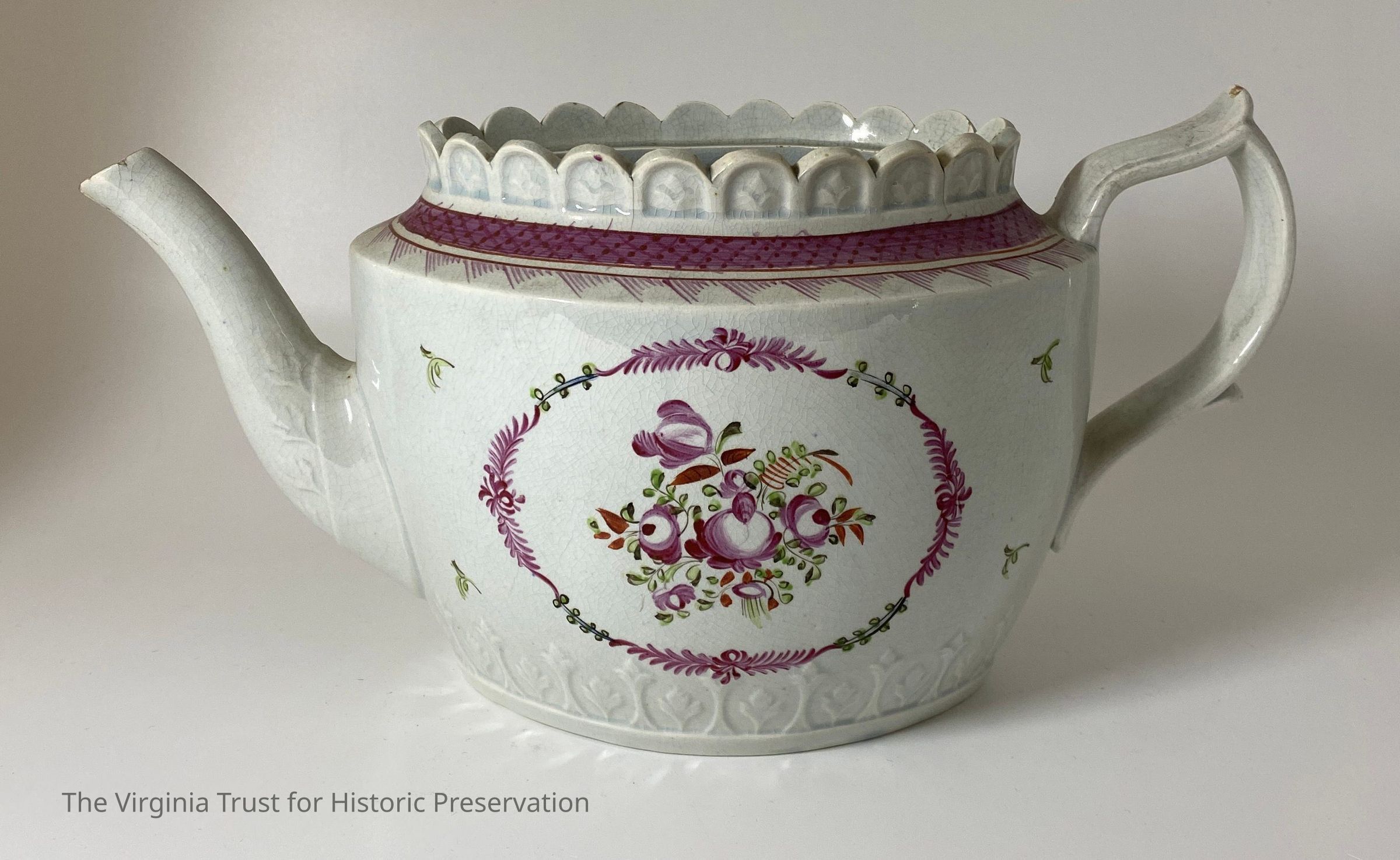 White oblong porcelain teapot with scalloped top and rose colored floral design.