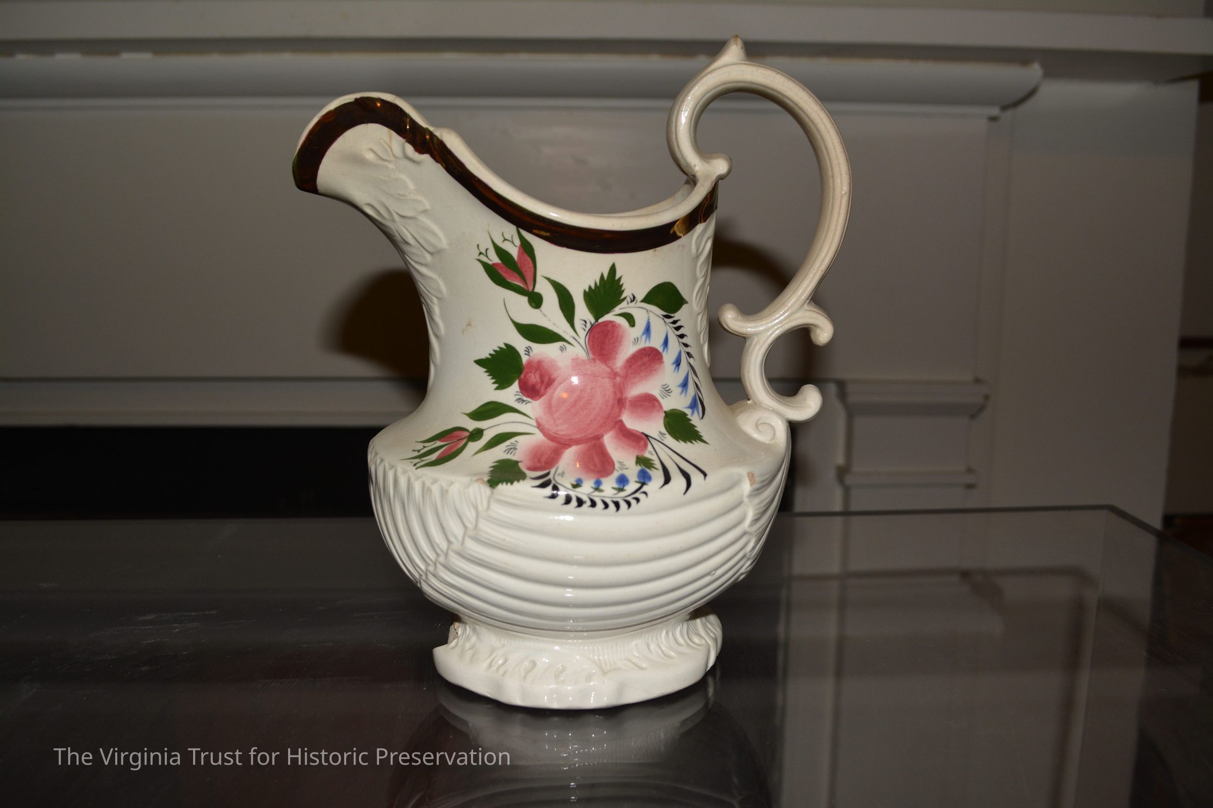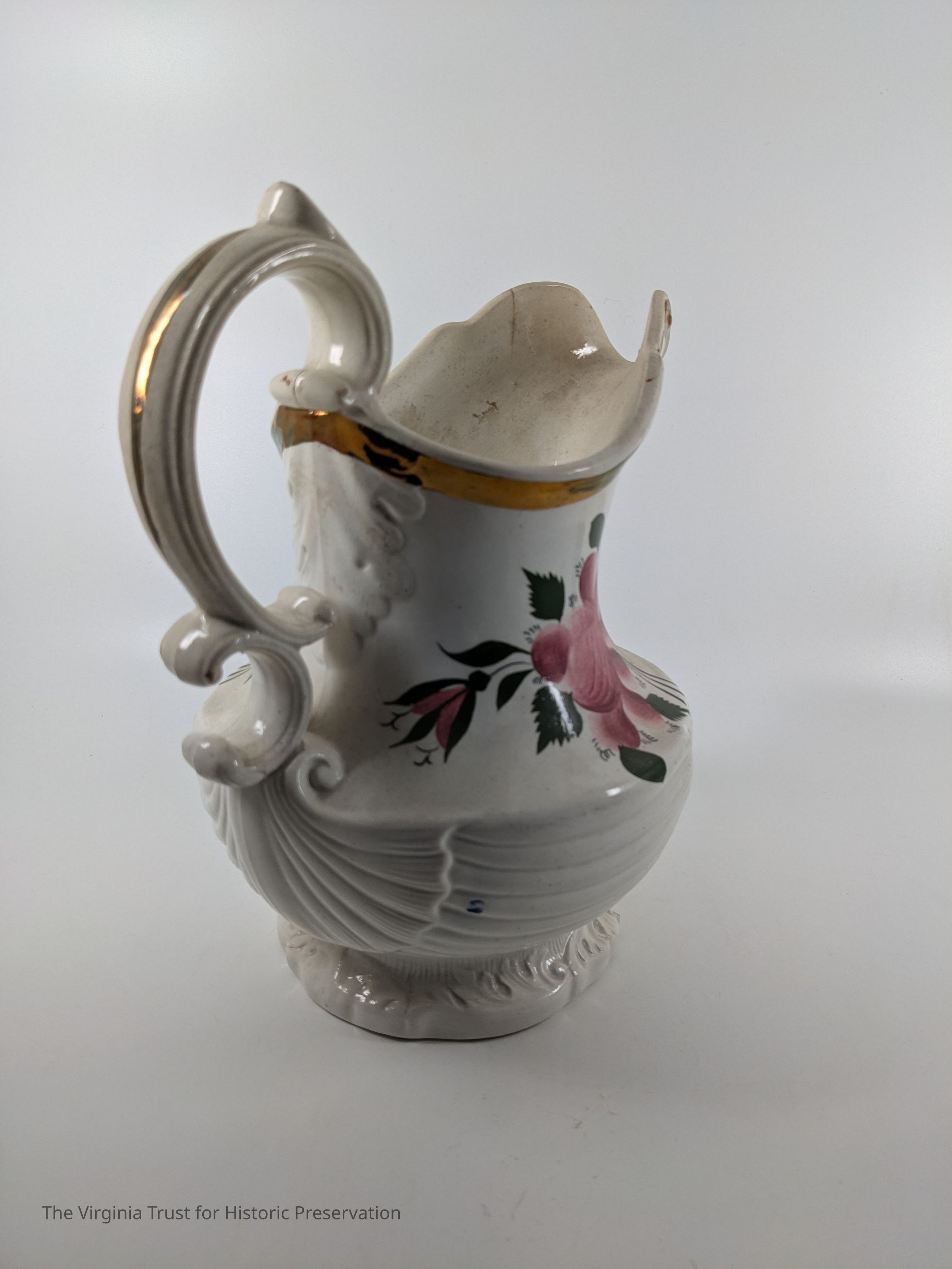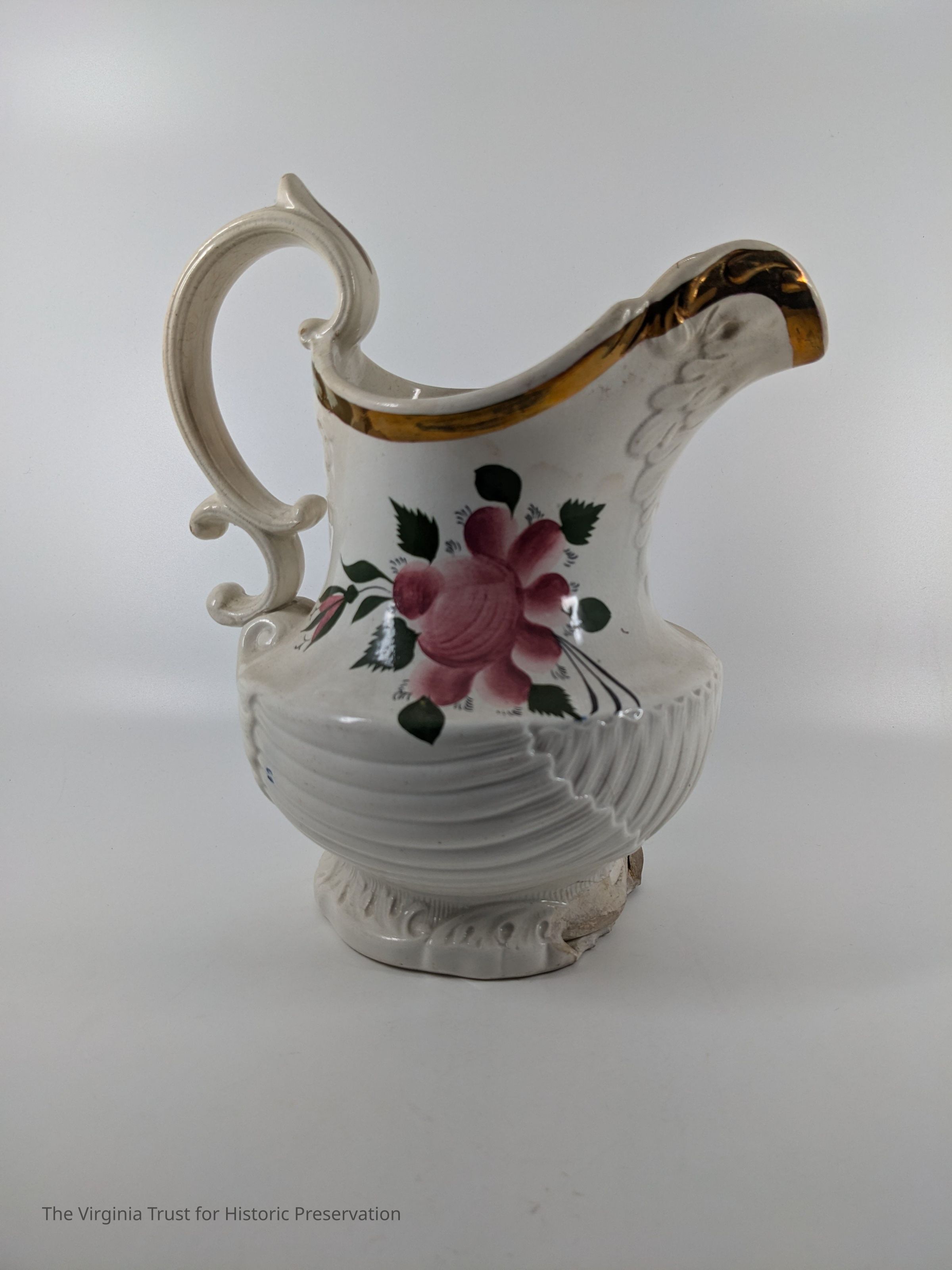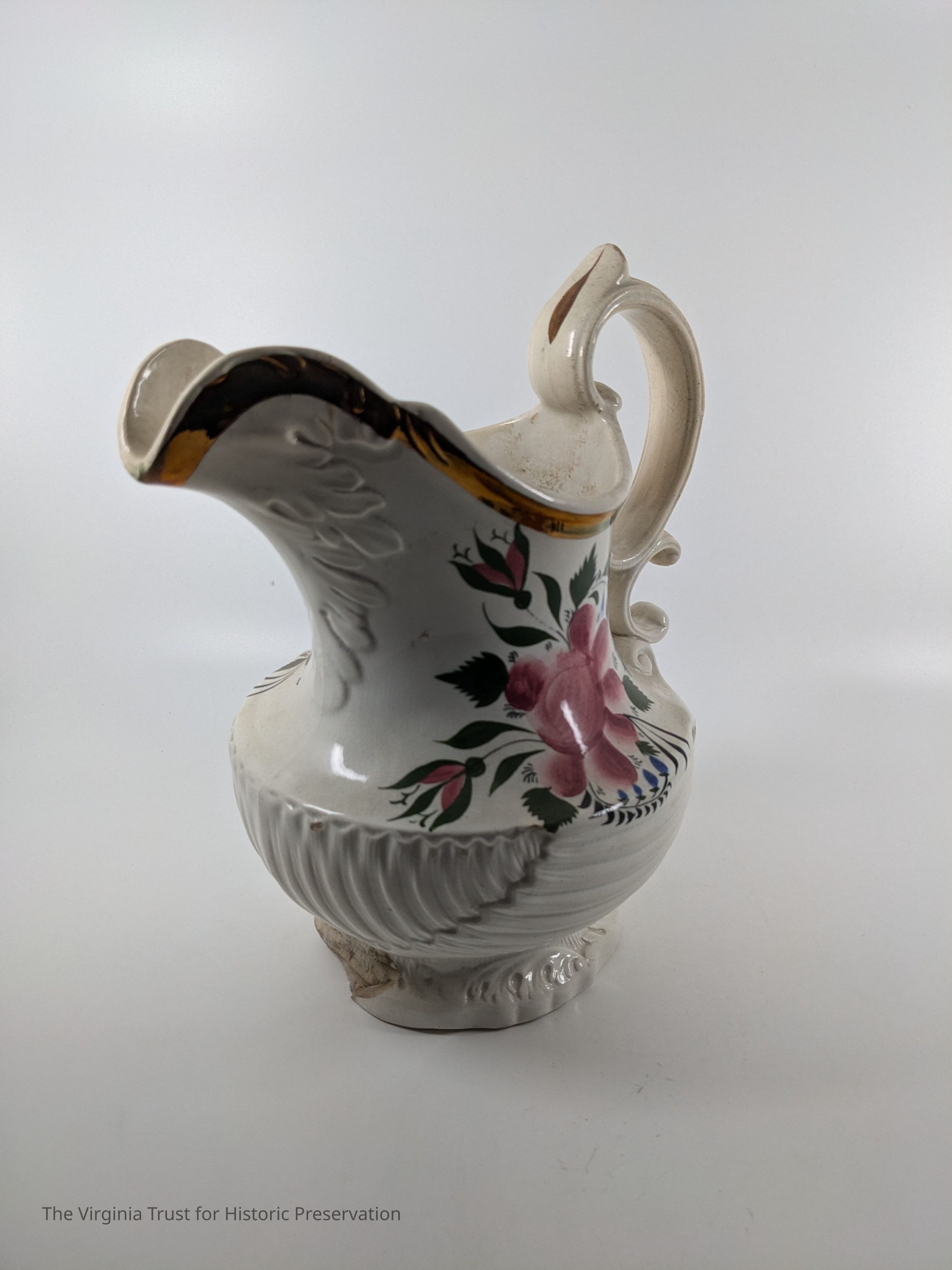 White china pitcher with painted rose, rosebuds, and leaves. "W" marked on bottom. Bronze painted rim.