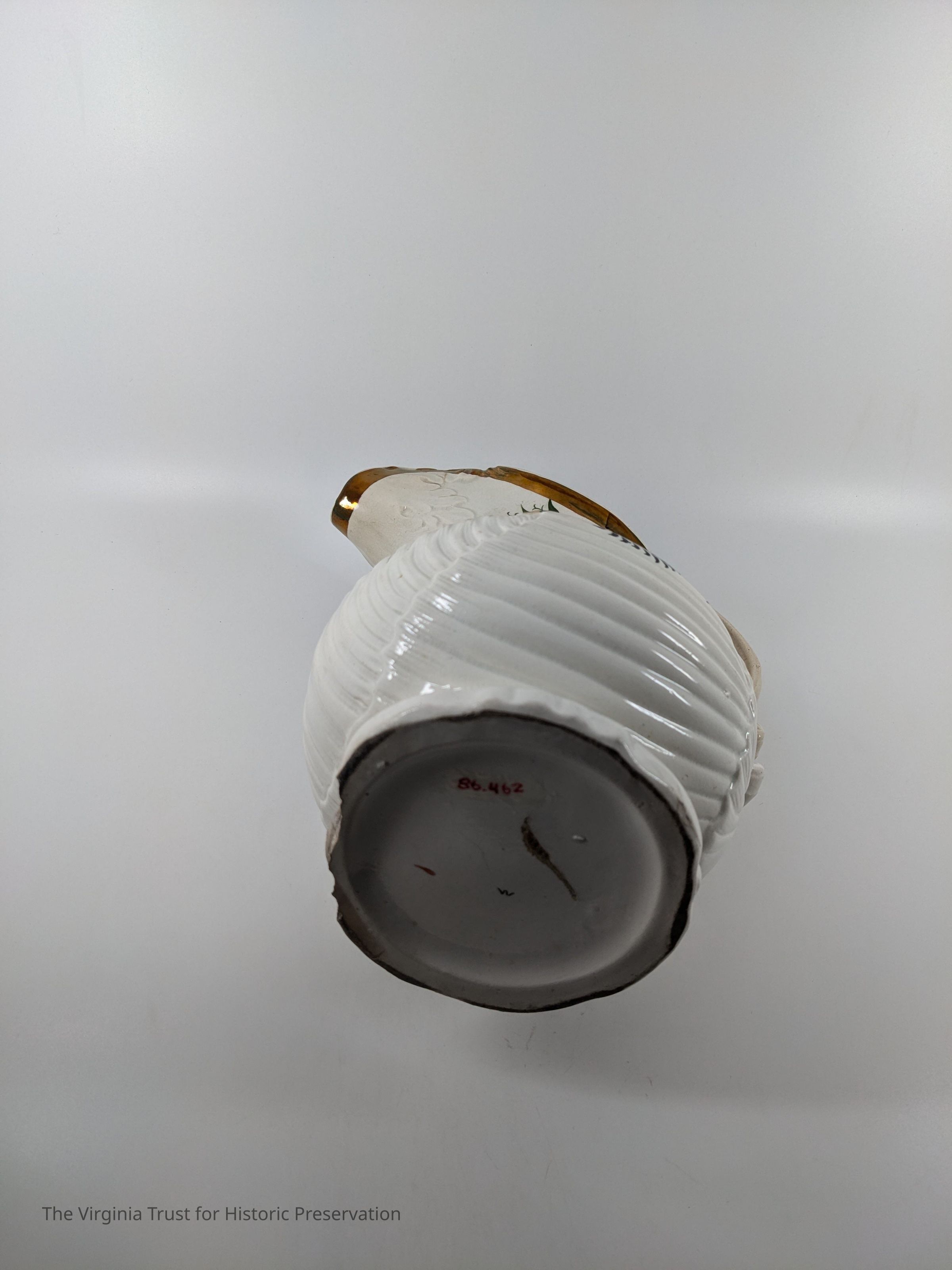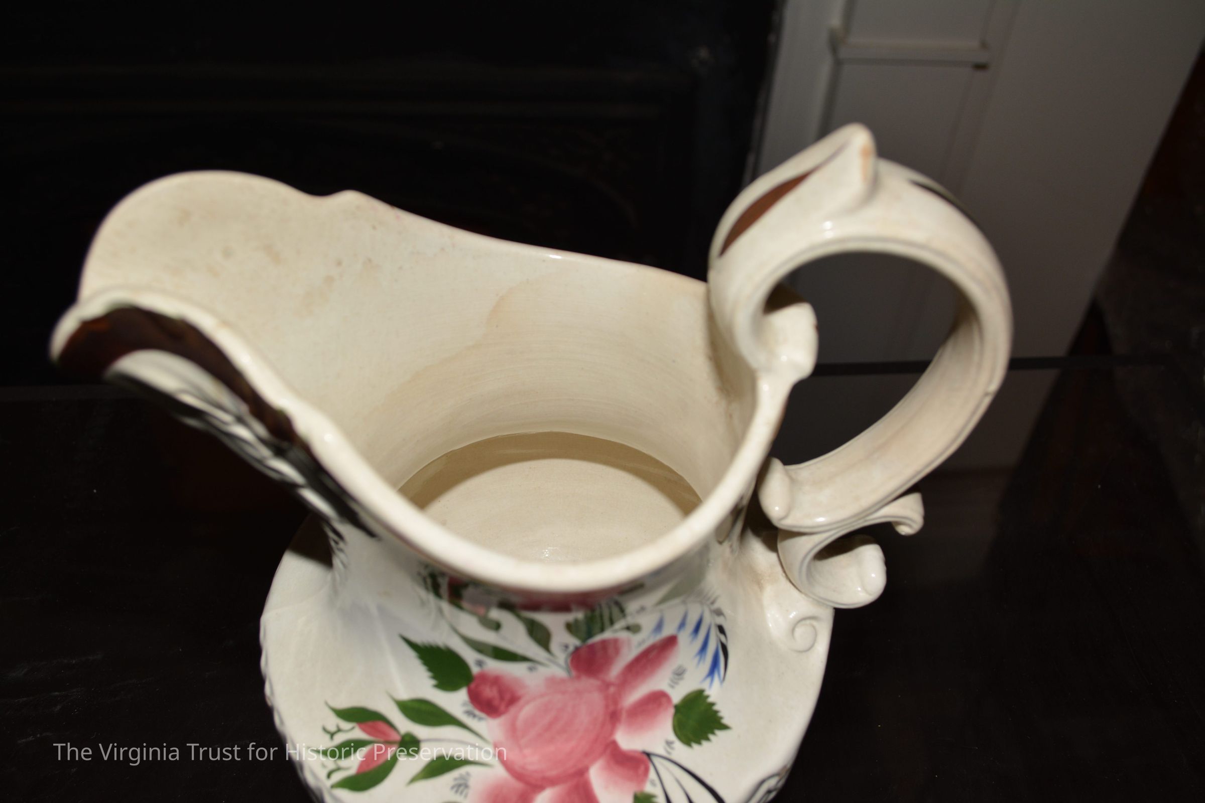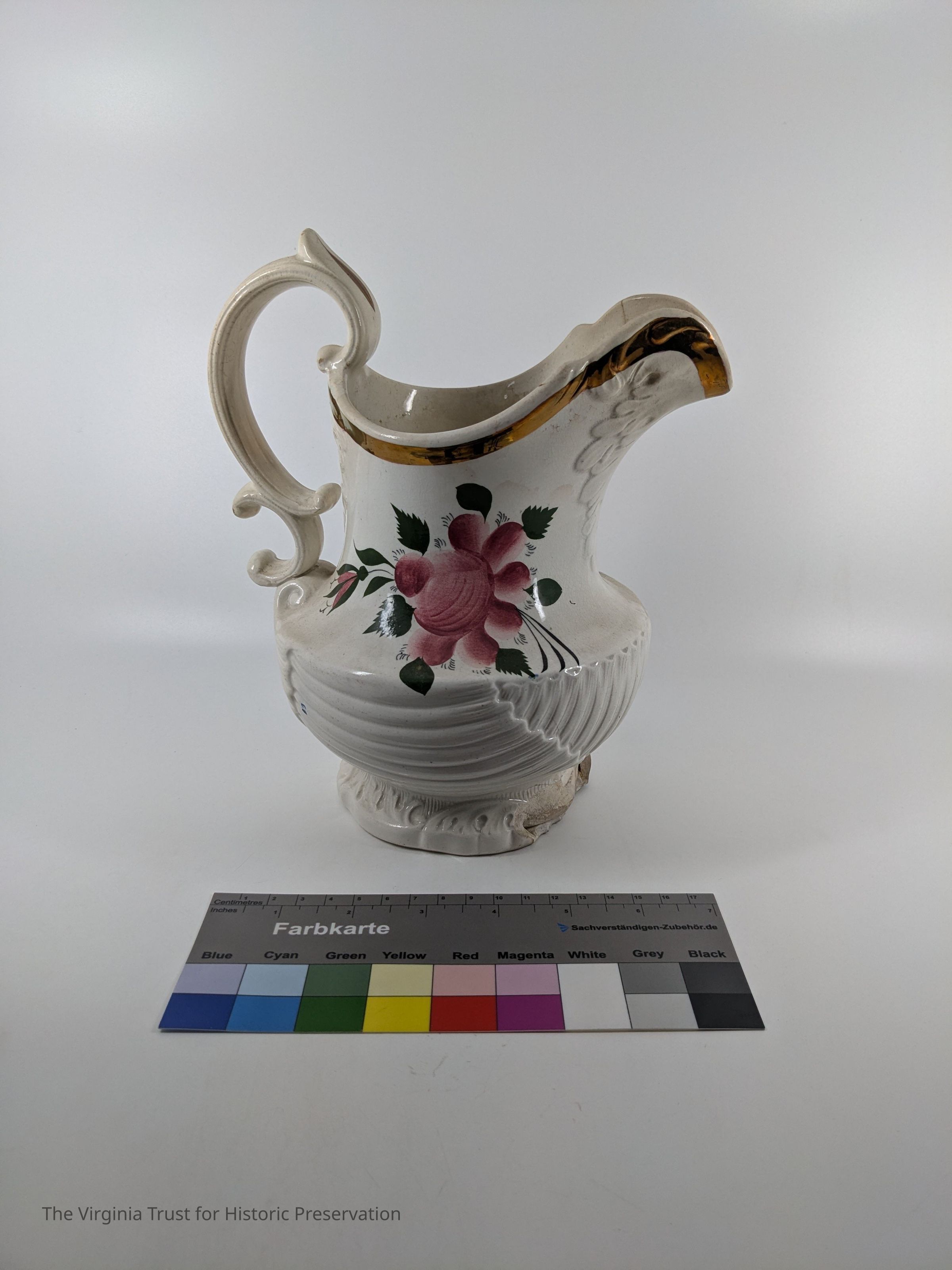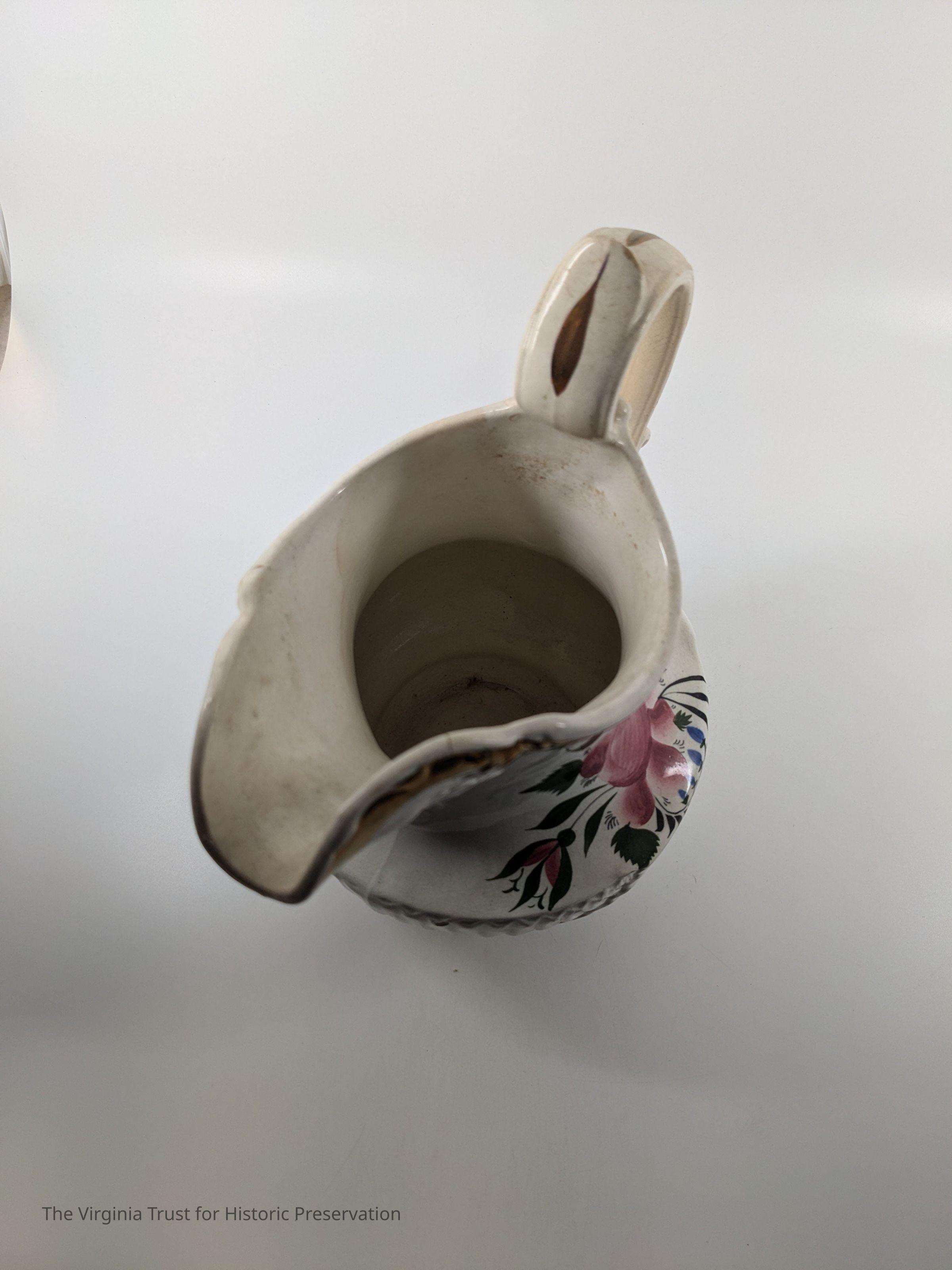 White china pitcher with painted rose, rosebuds, and leaves. "W" marked on bottom. Bronze painted rim.