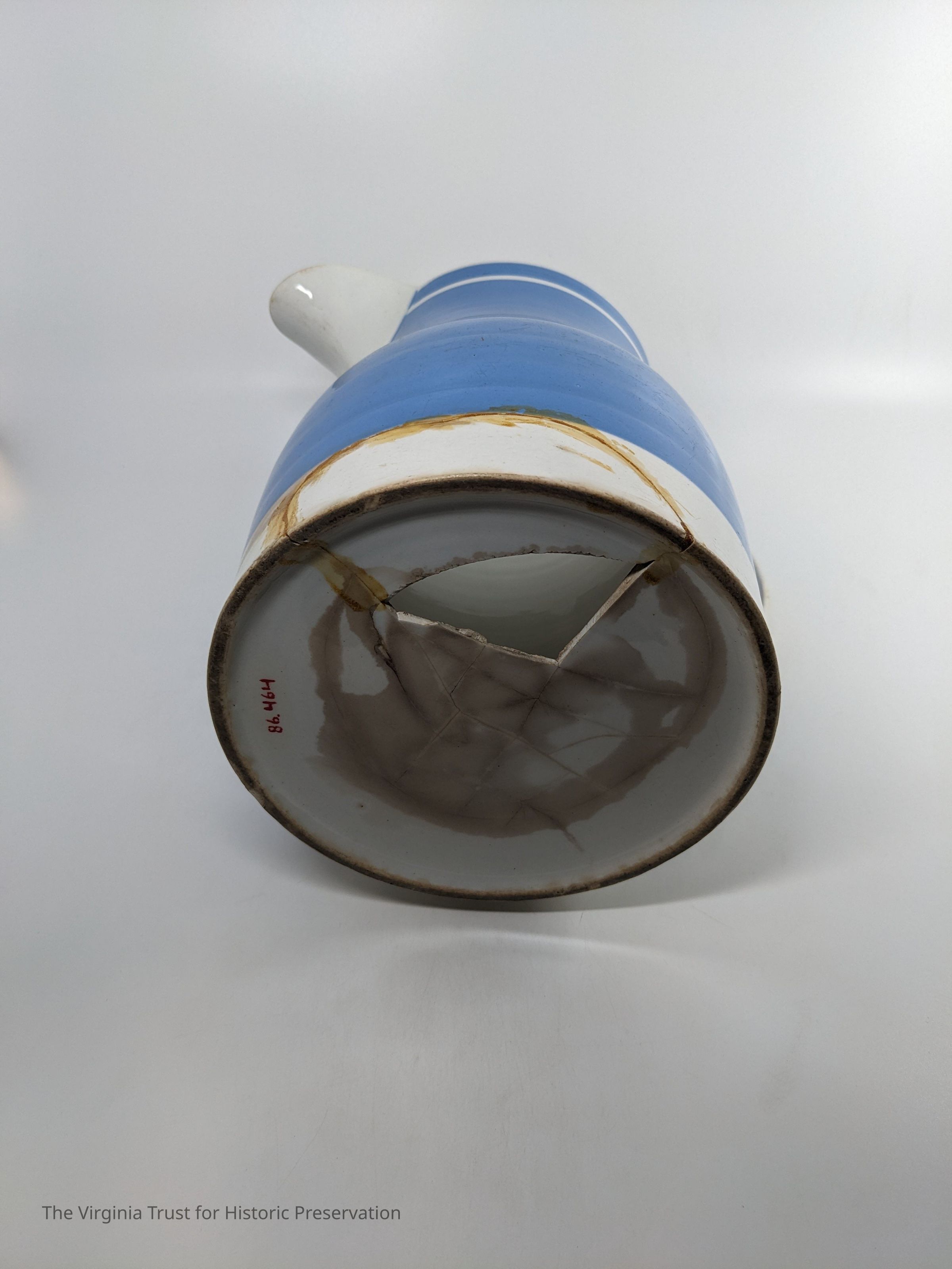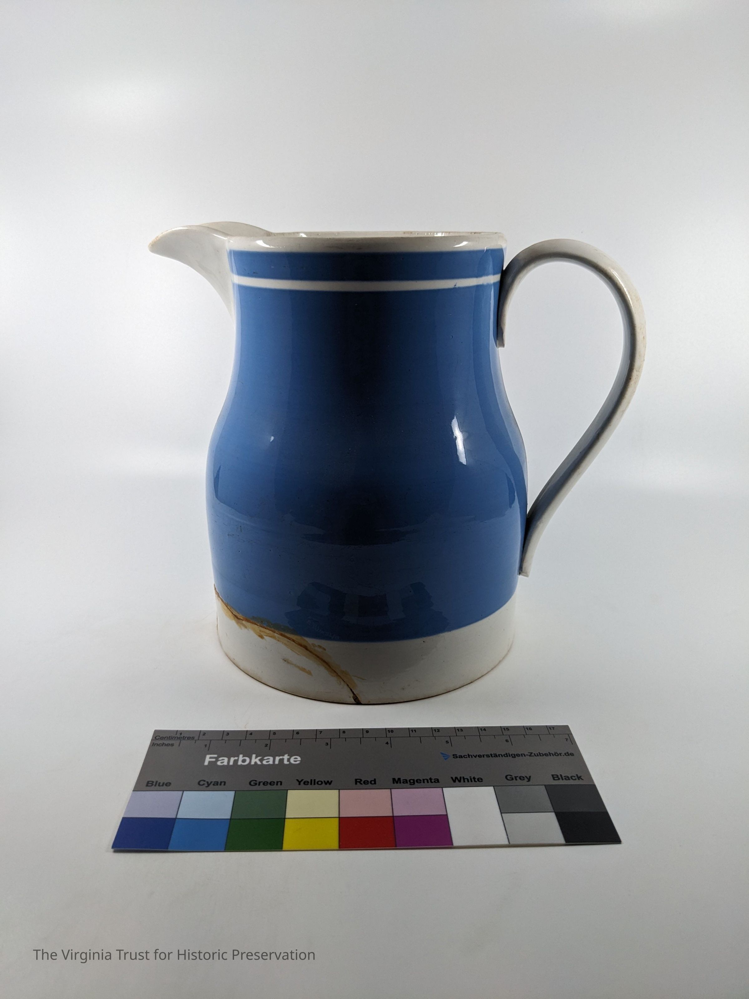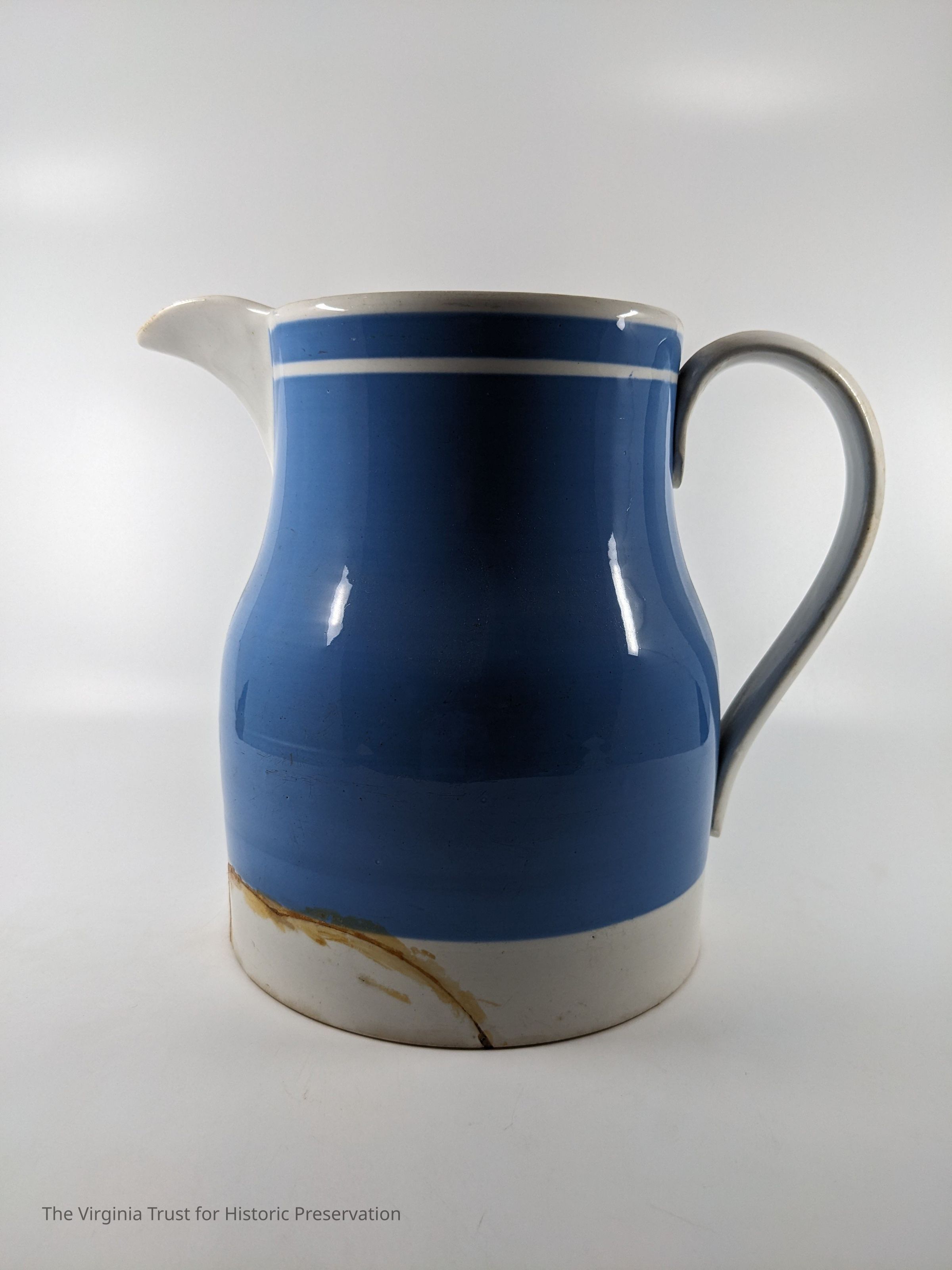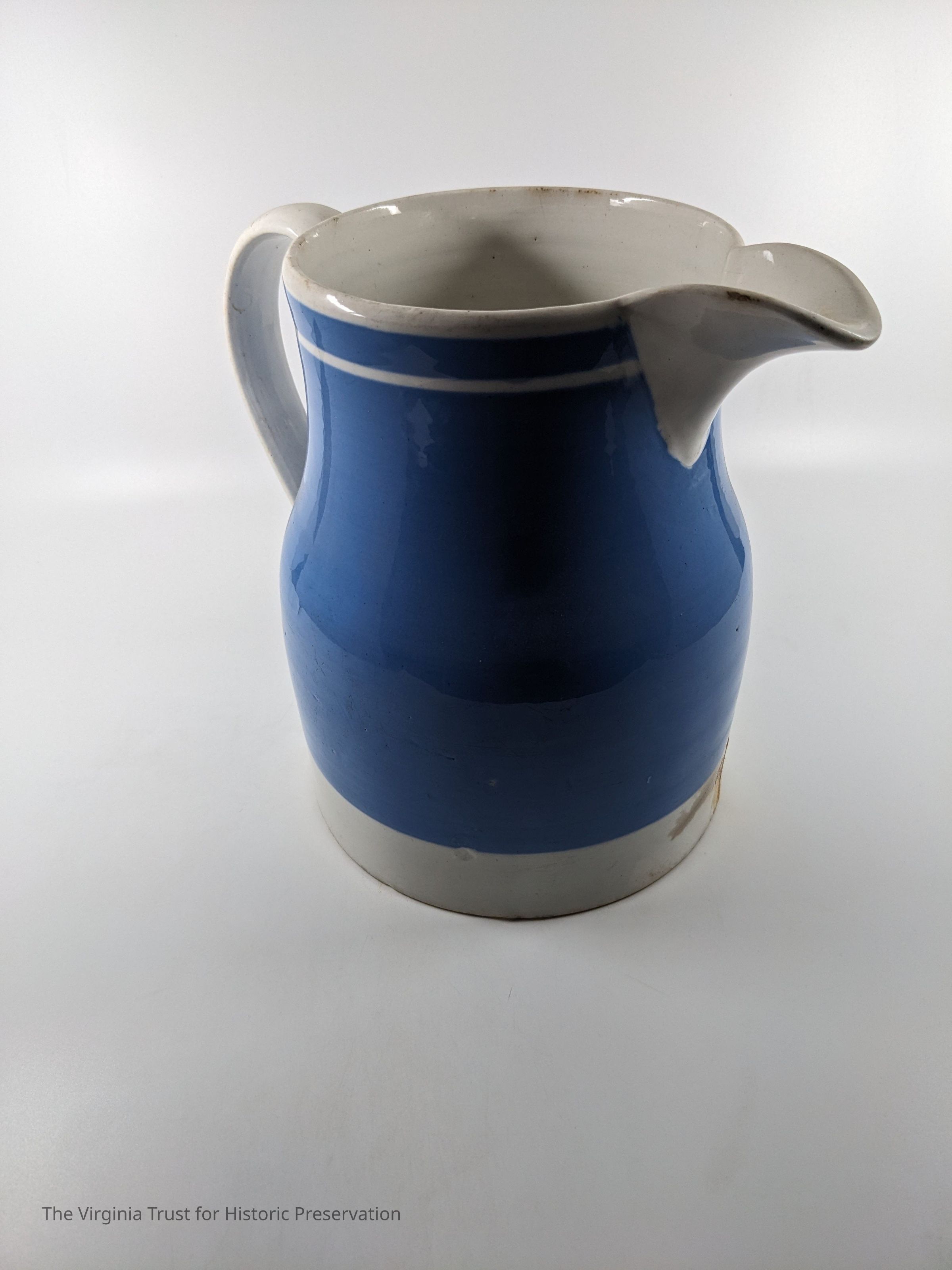 Light blue pitcher with white handle and trim.