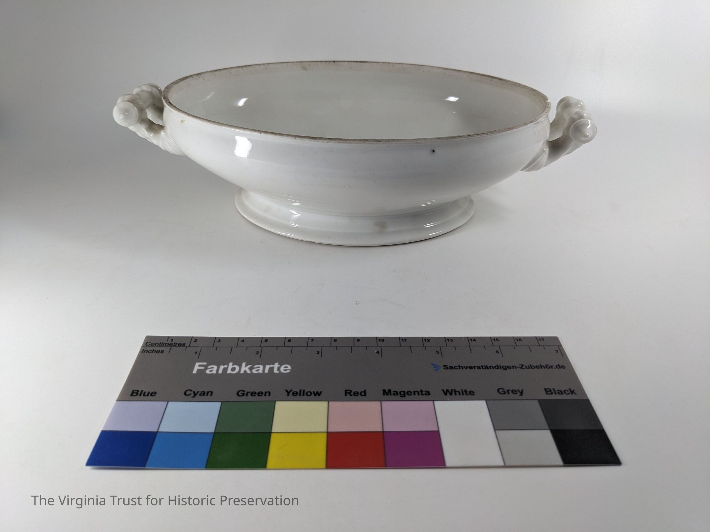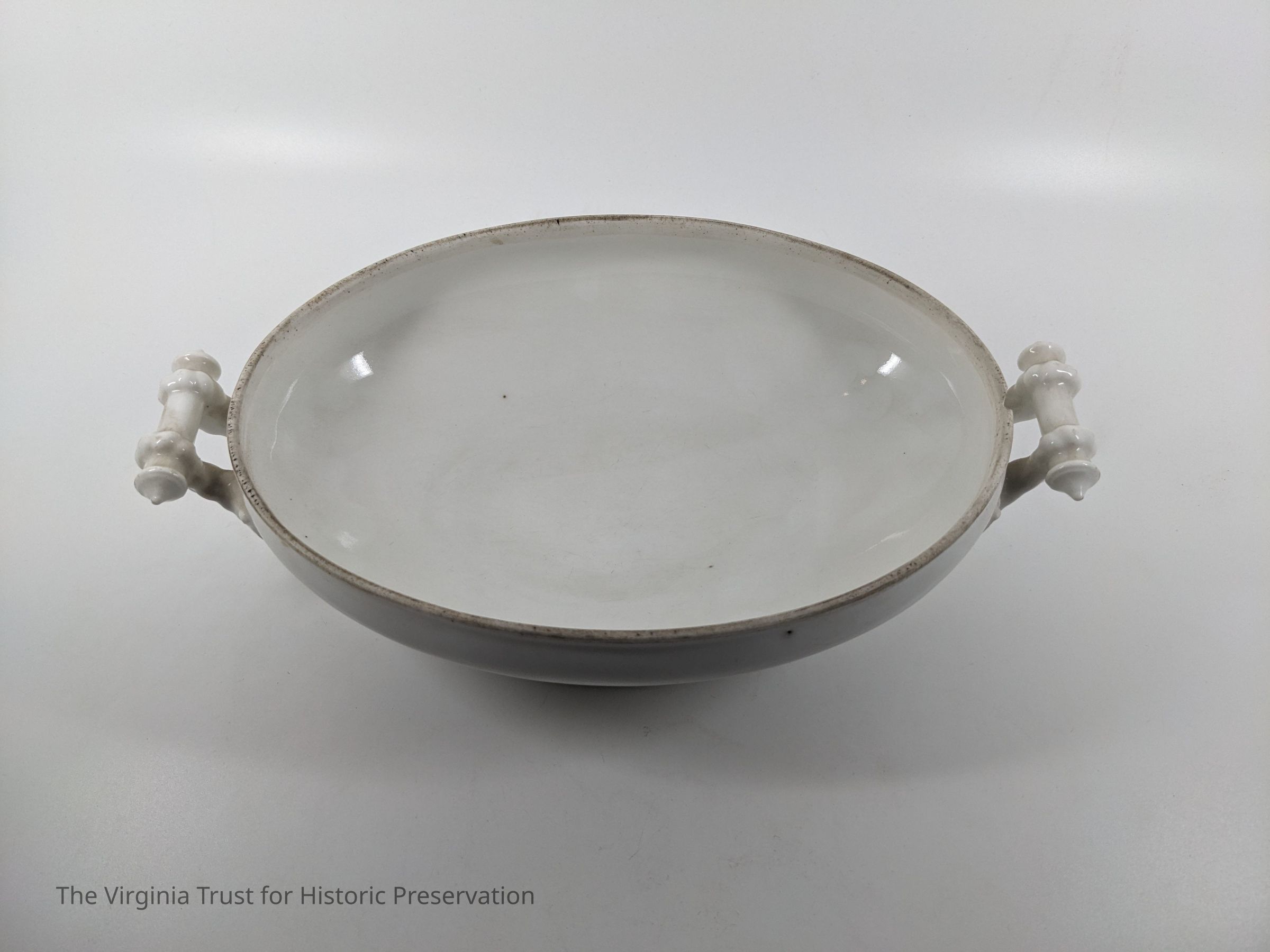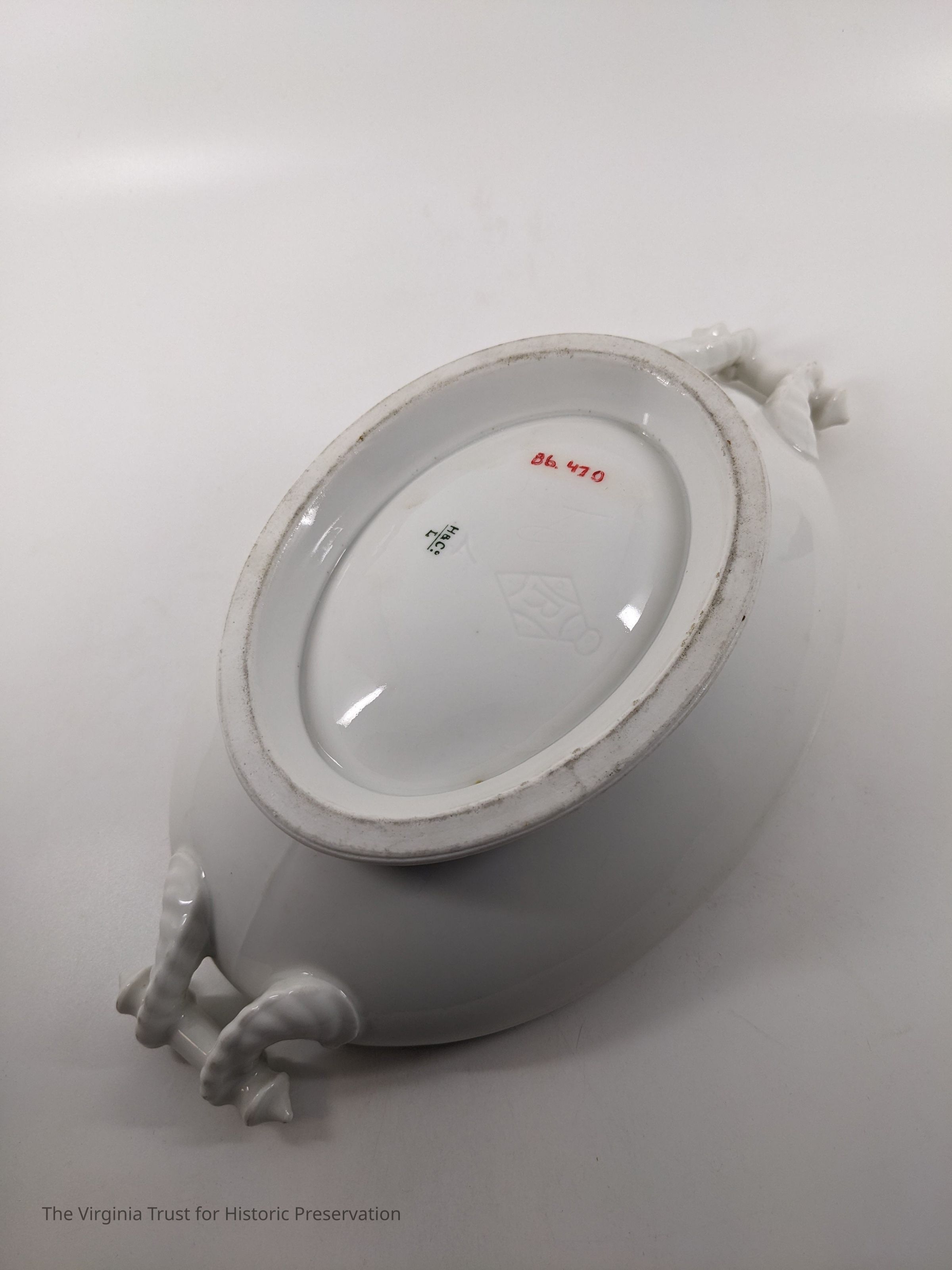 White vegetable bowl with handles. Marked on bottom: "H&C/L." Stamped on bottom "R."