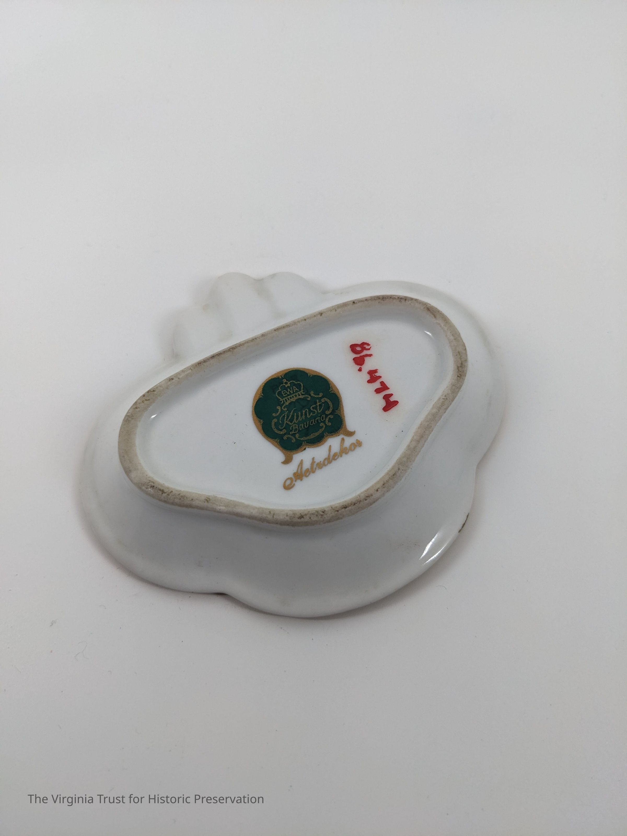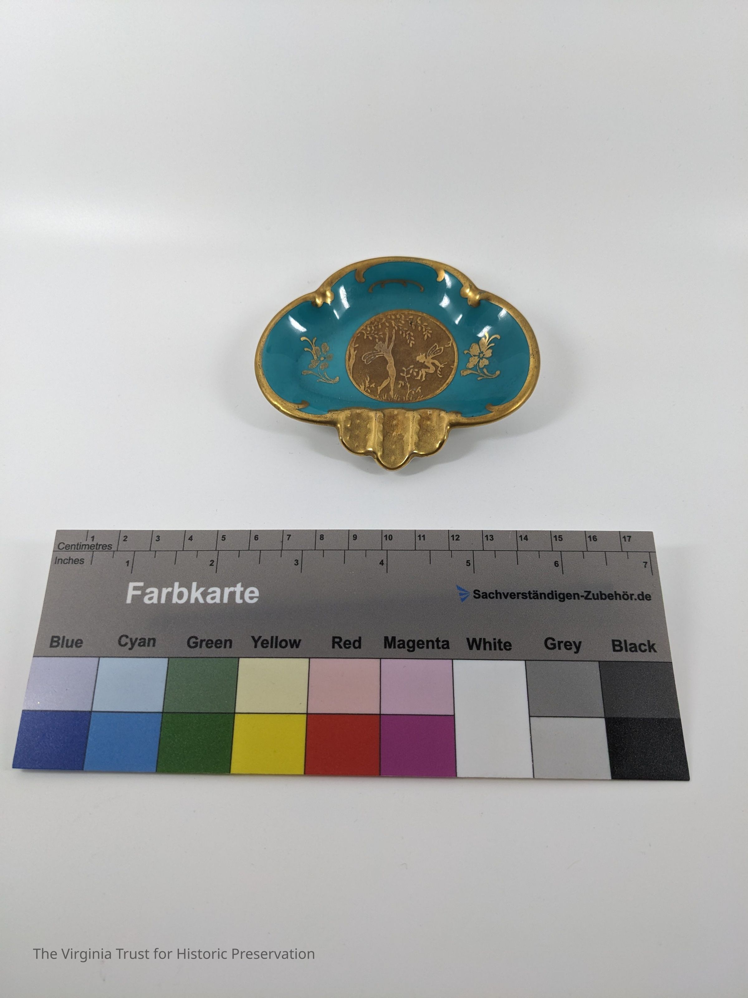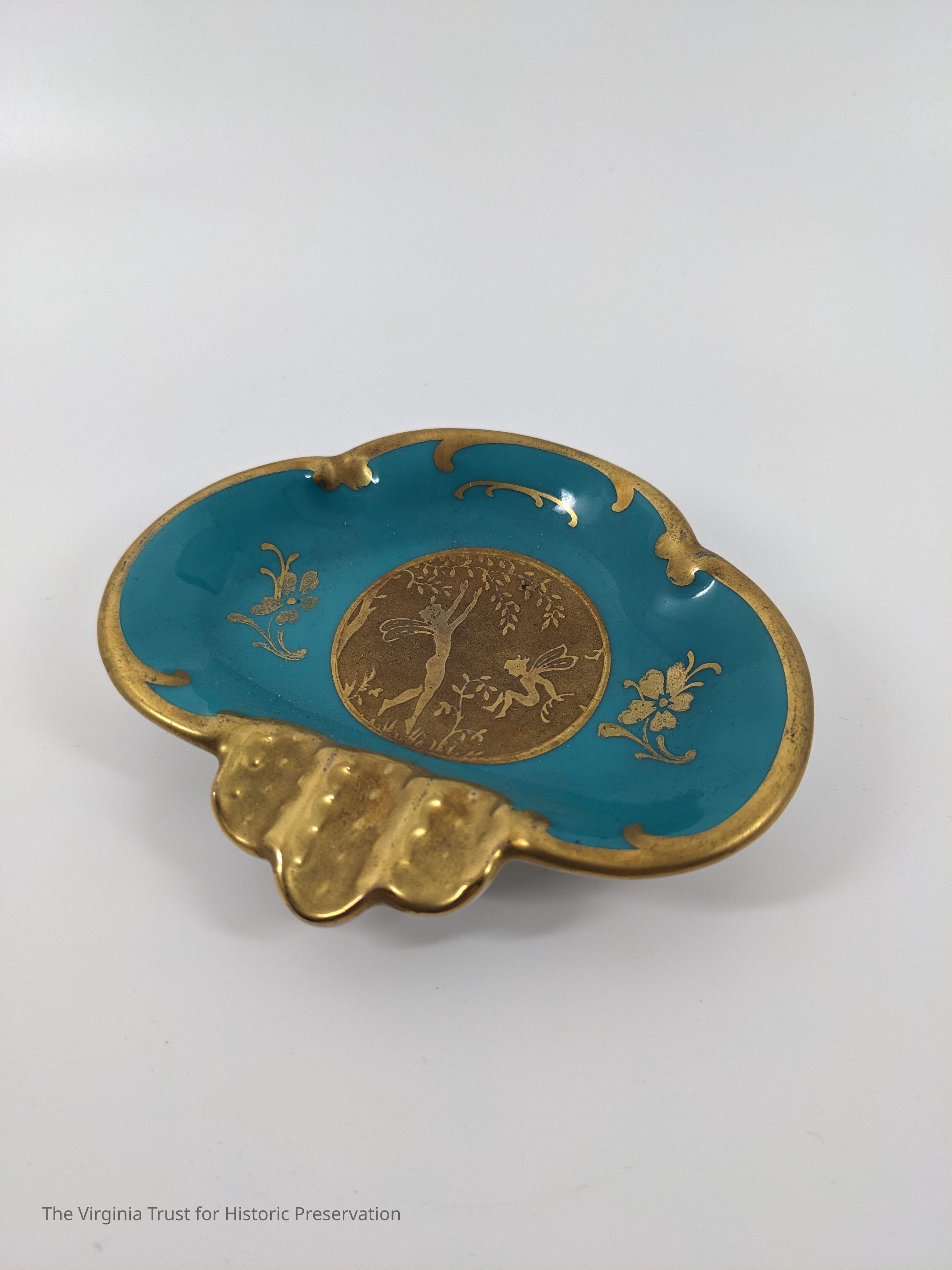 Porcelain ashtray. Blue-green with gold design. Medallion in center shows two fairies. Art Nouveau form. Sticker on bottom reads: "EWA Kunst Bavaria" and "Aetrdekor." .Dimensions