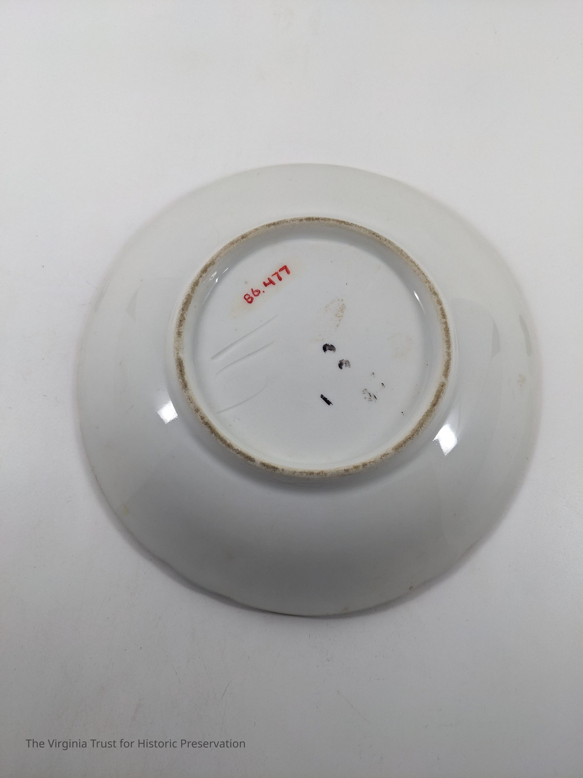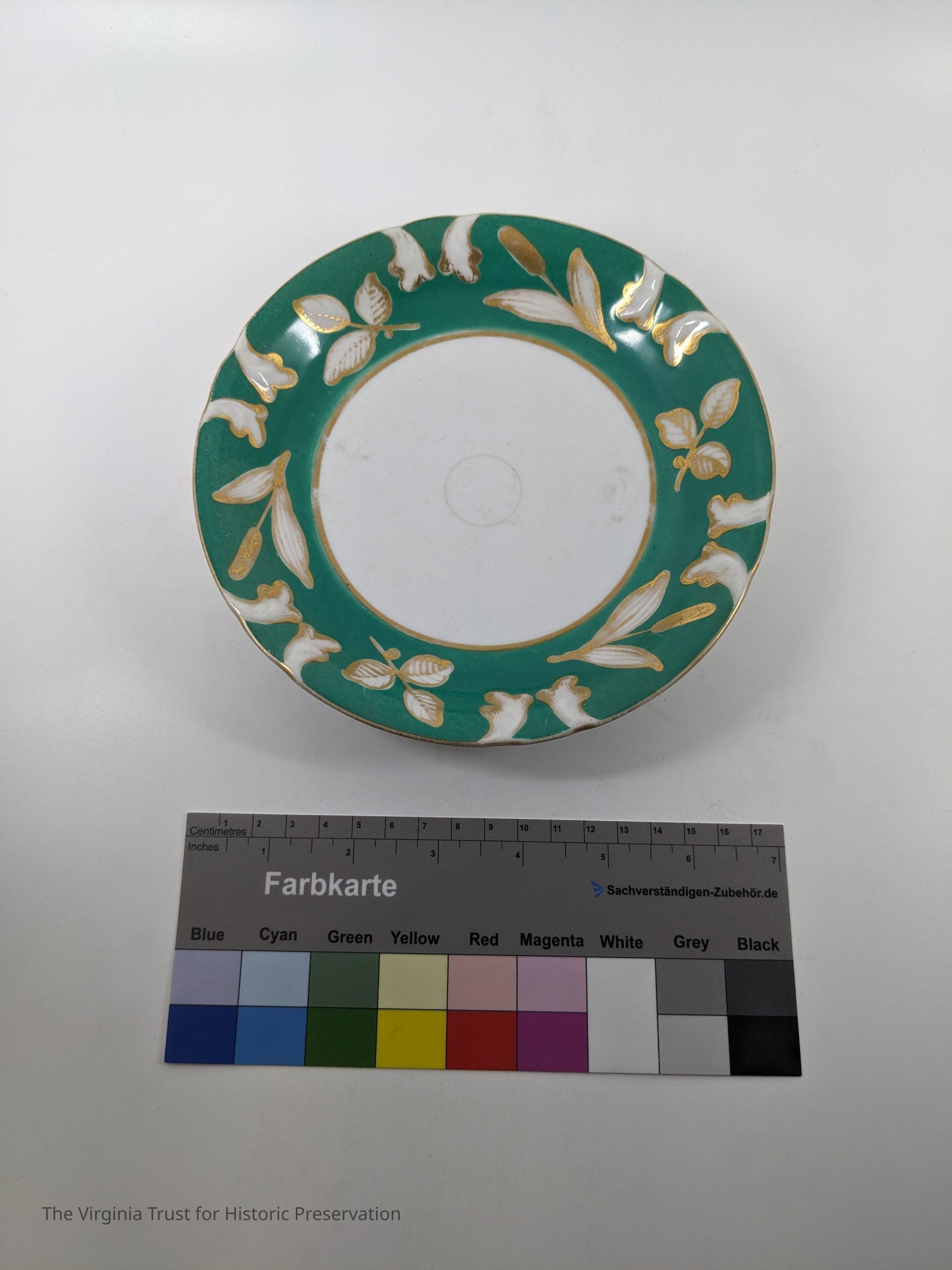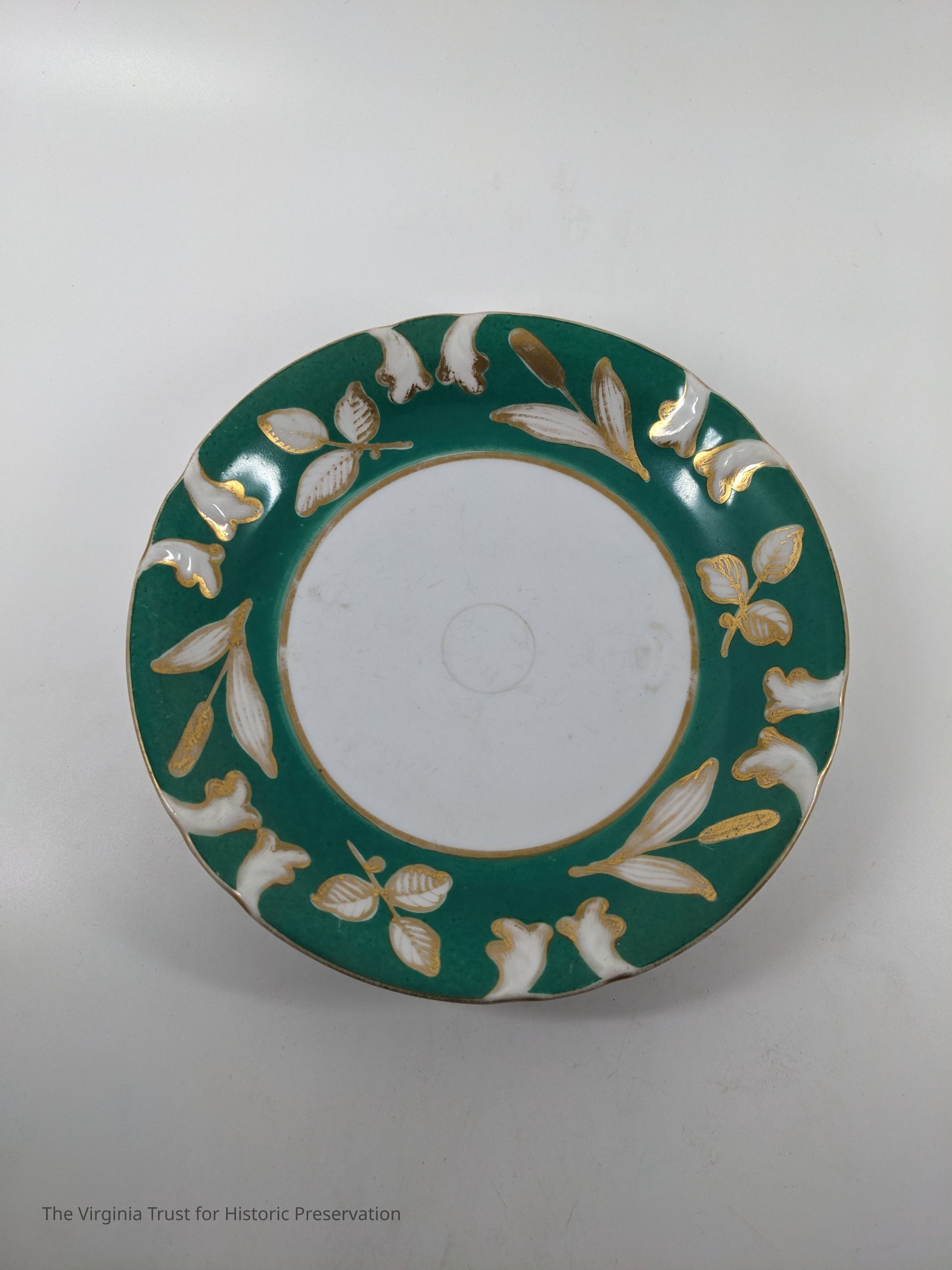 English earthenware plate. White with green border. Border has white floral motifs outlined in gold.