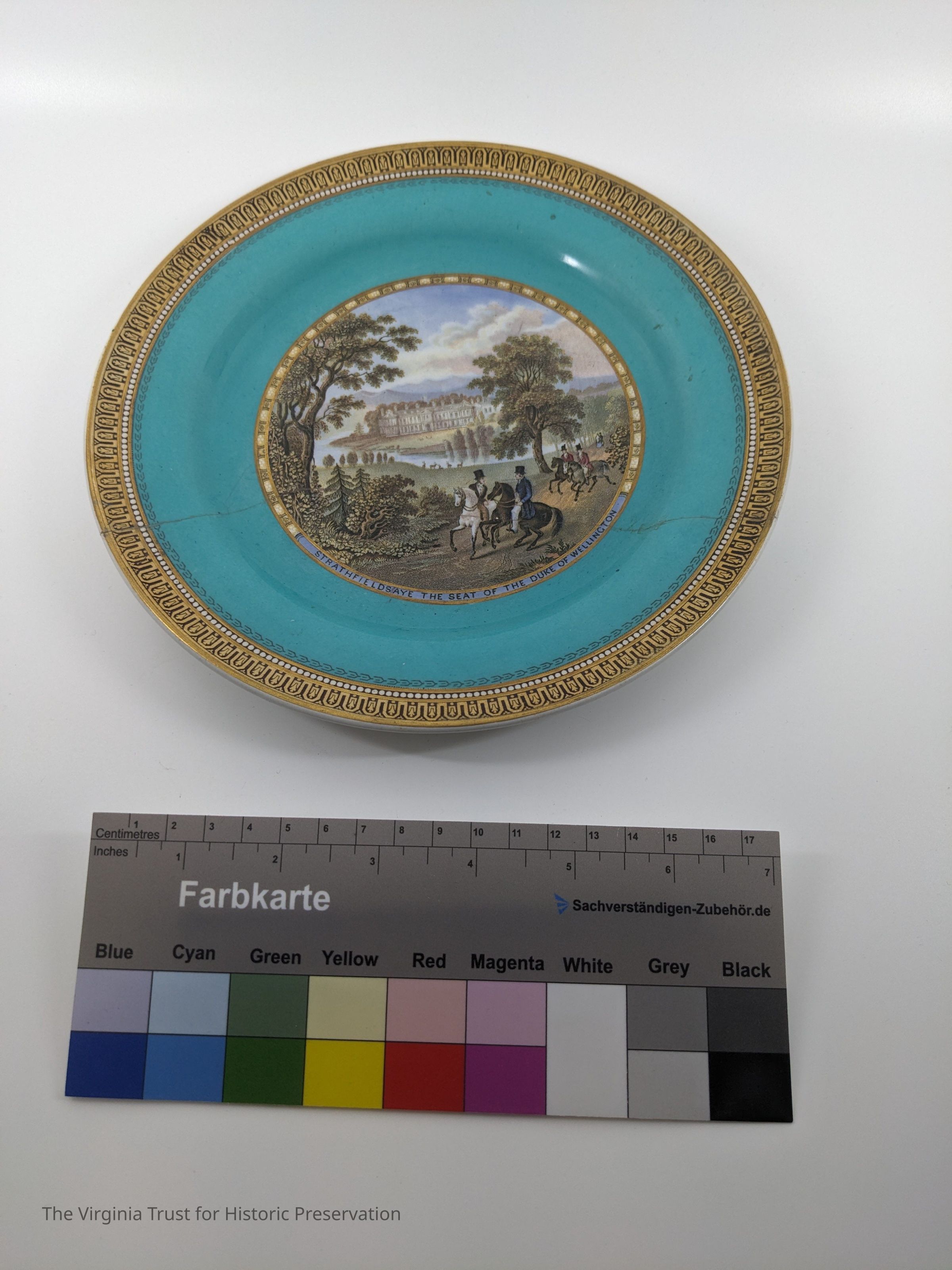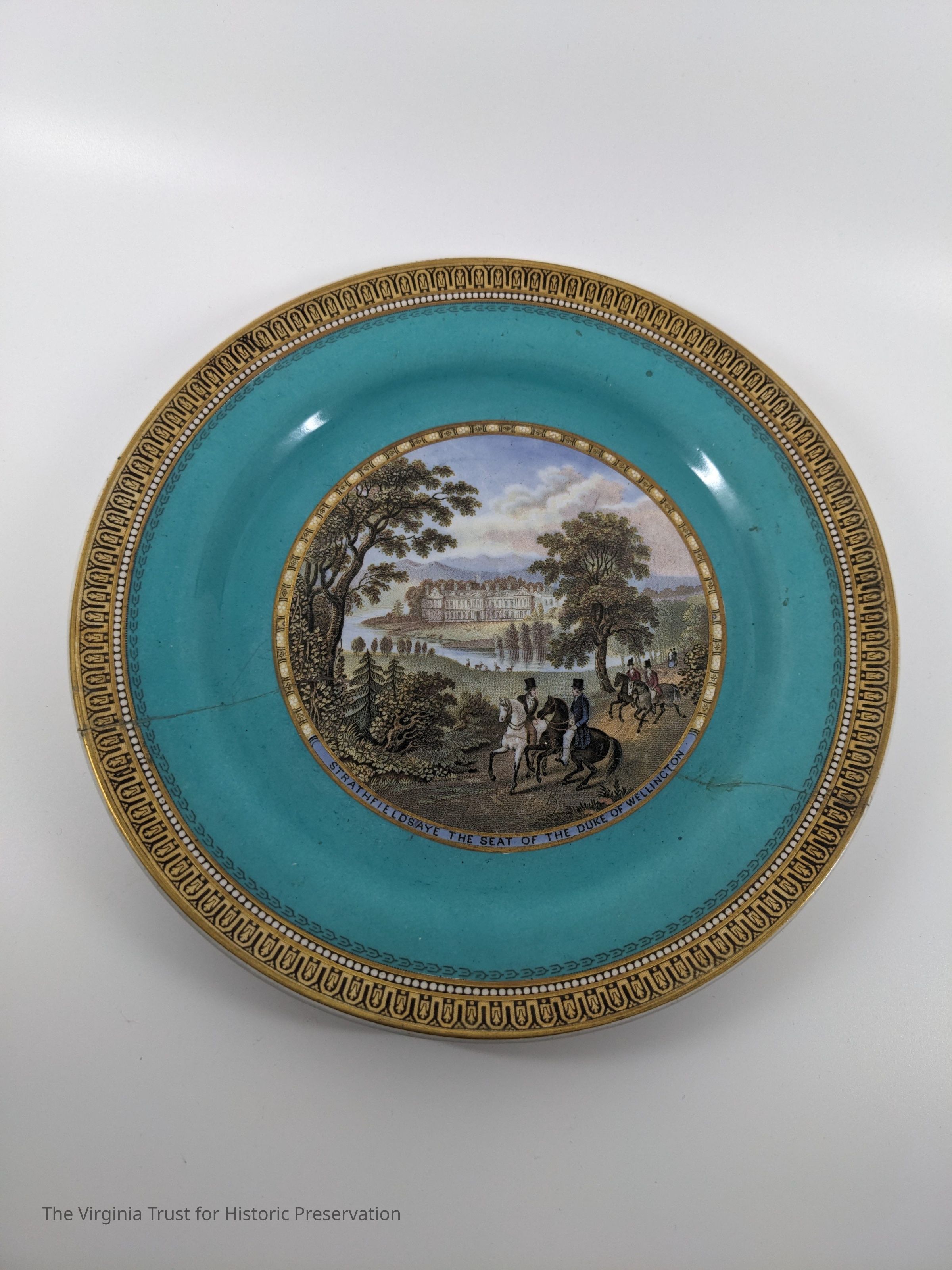 English earthenware plate. Circular picture in center. "Wellington" plate, scene of Strathfieldsaye, the seat of the Duke of Wellington.