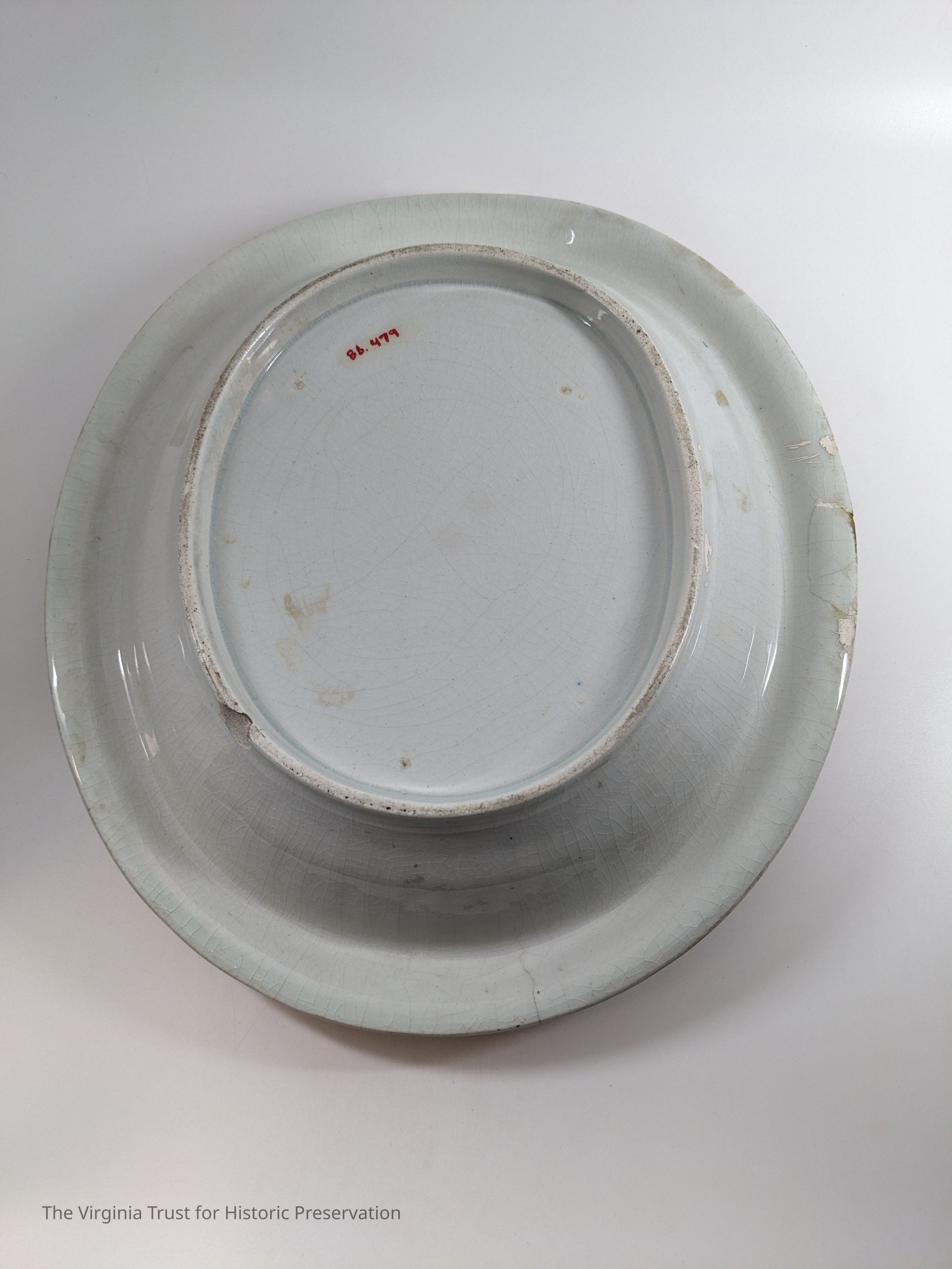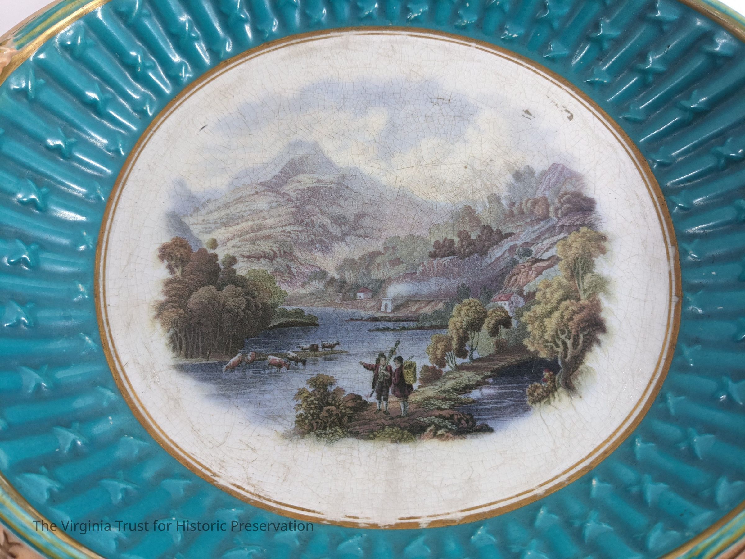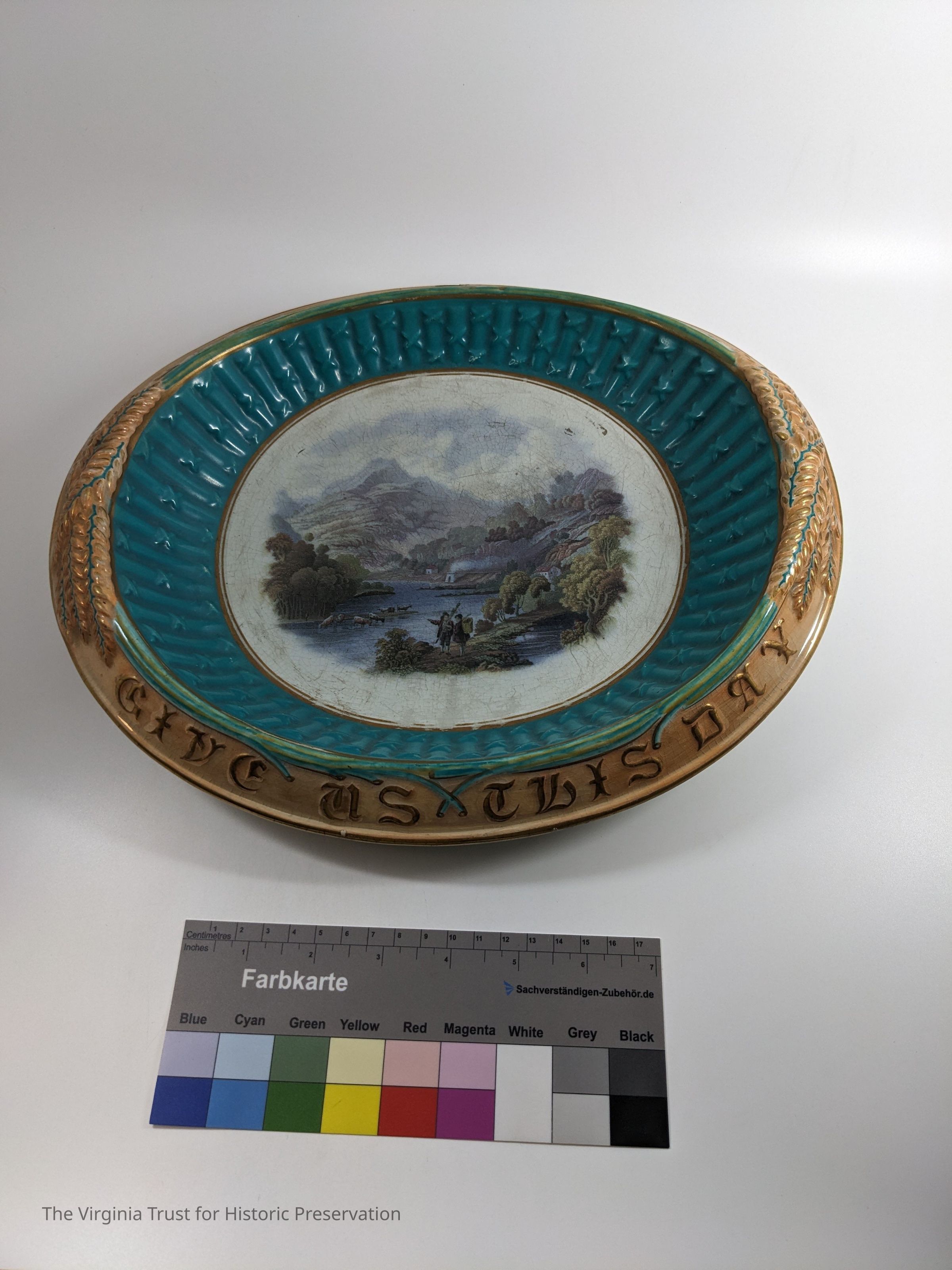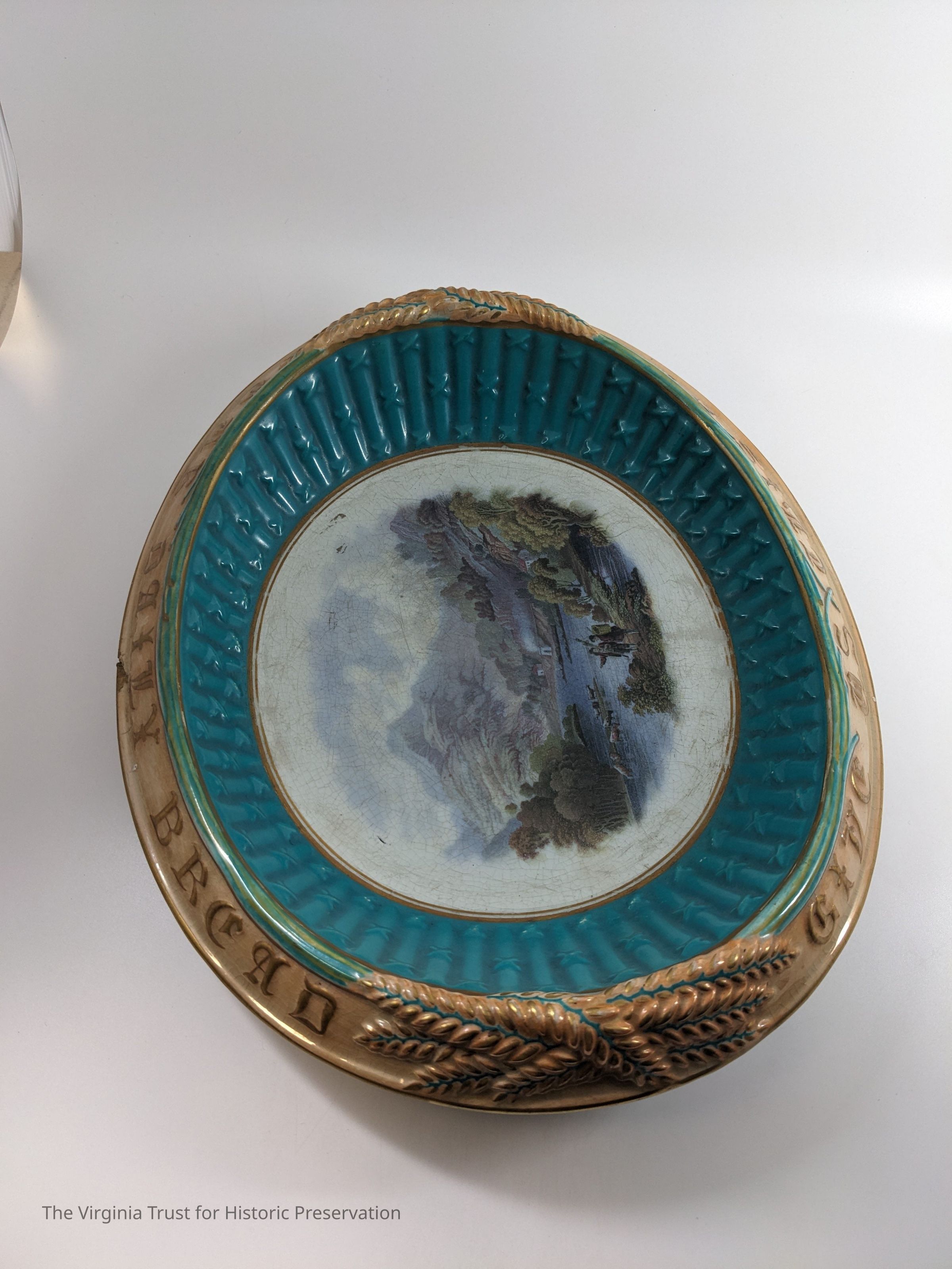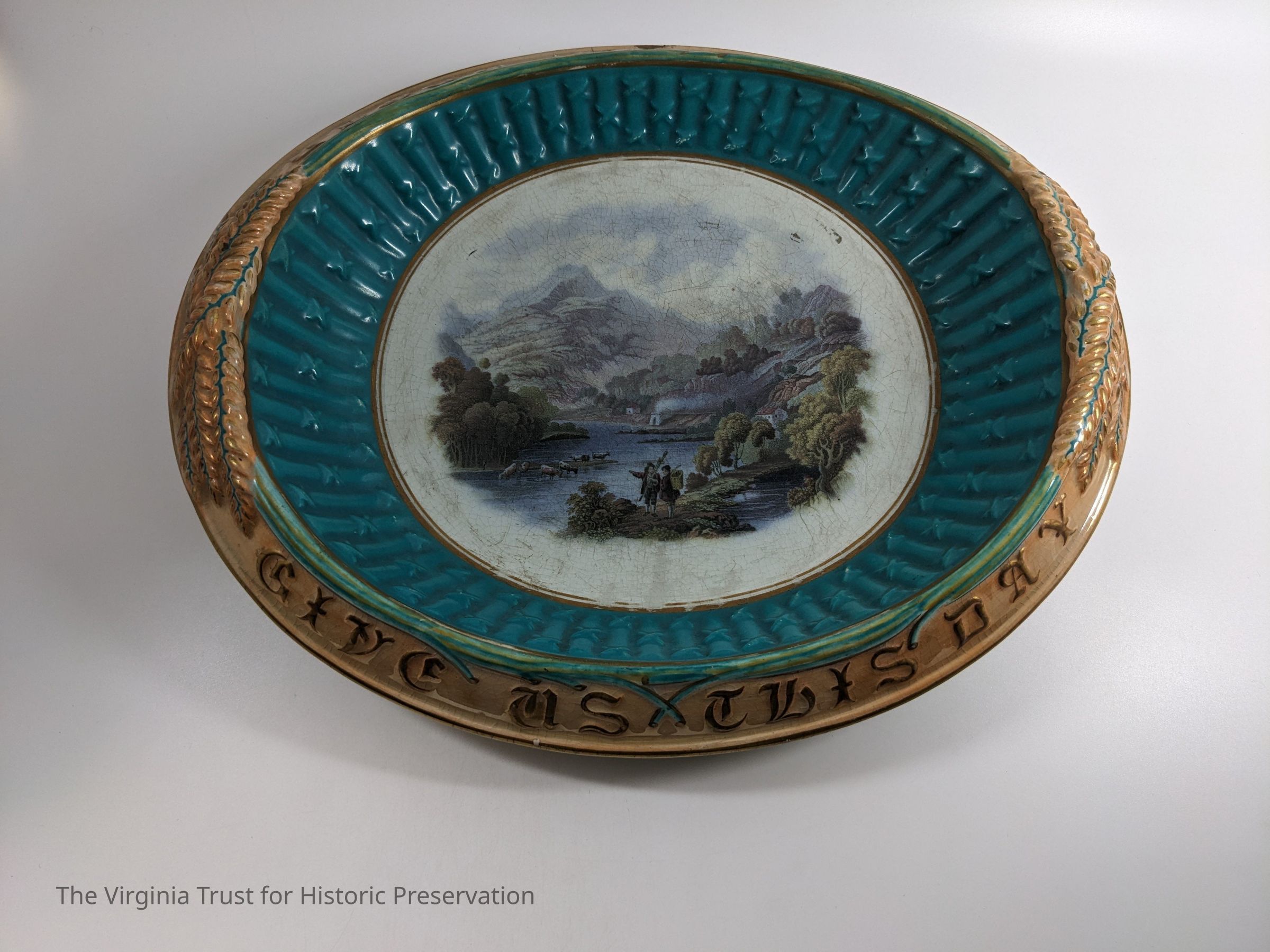English earthenware bread bowl. Pratt center shows a pastoral scene surrounded by a green border. Ends of oval shape have raised wheat design. Written around the sides is "Give us this day our daily bread."Dimensions