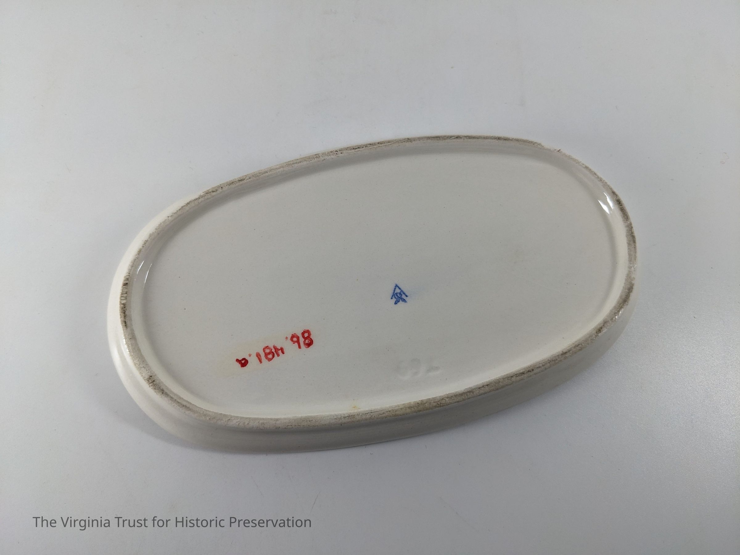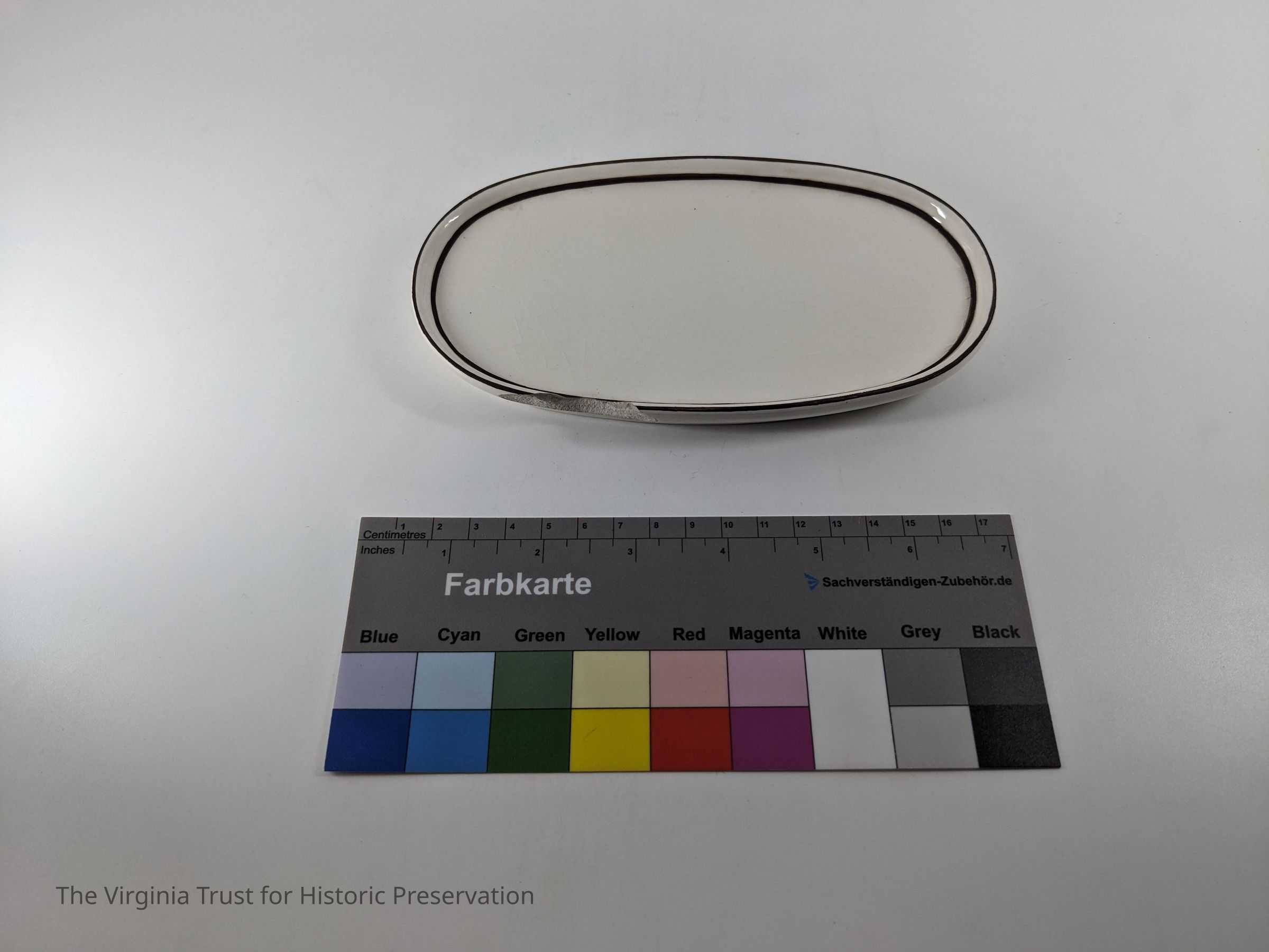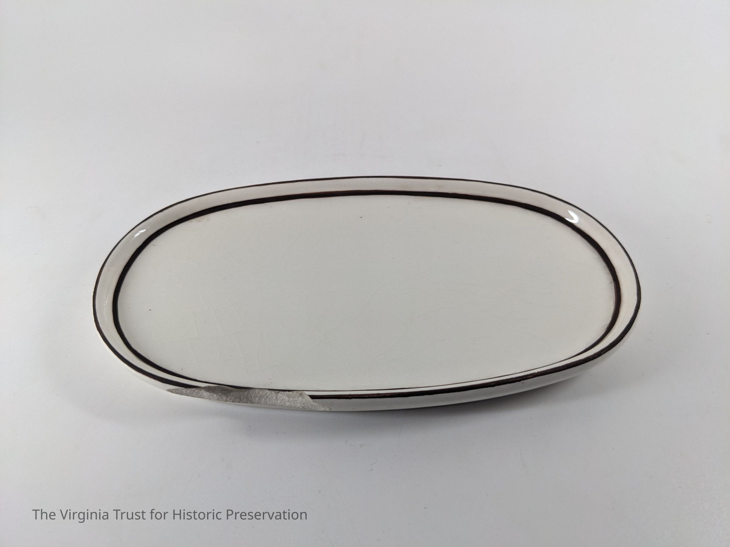 Flat oval butter dish. White with brown rims. Stamped on back "T69.". Set of two with 1986.481 B.