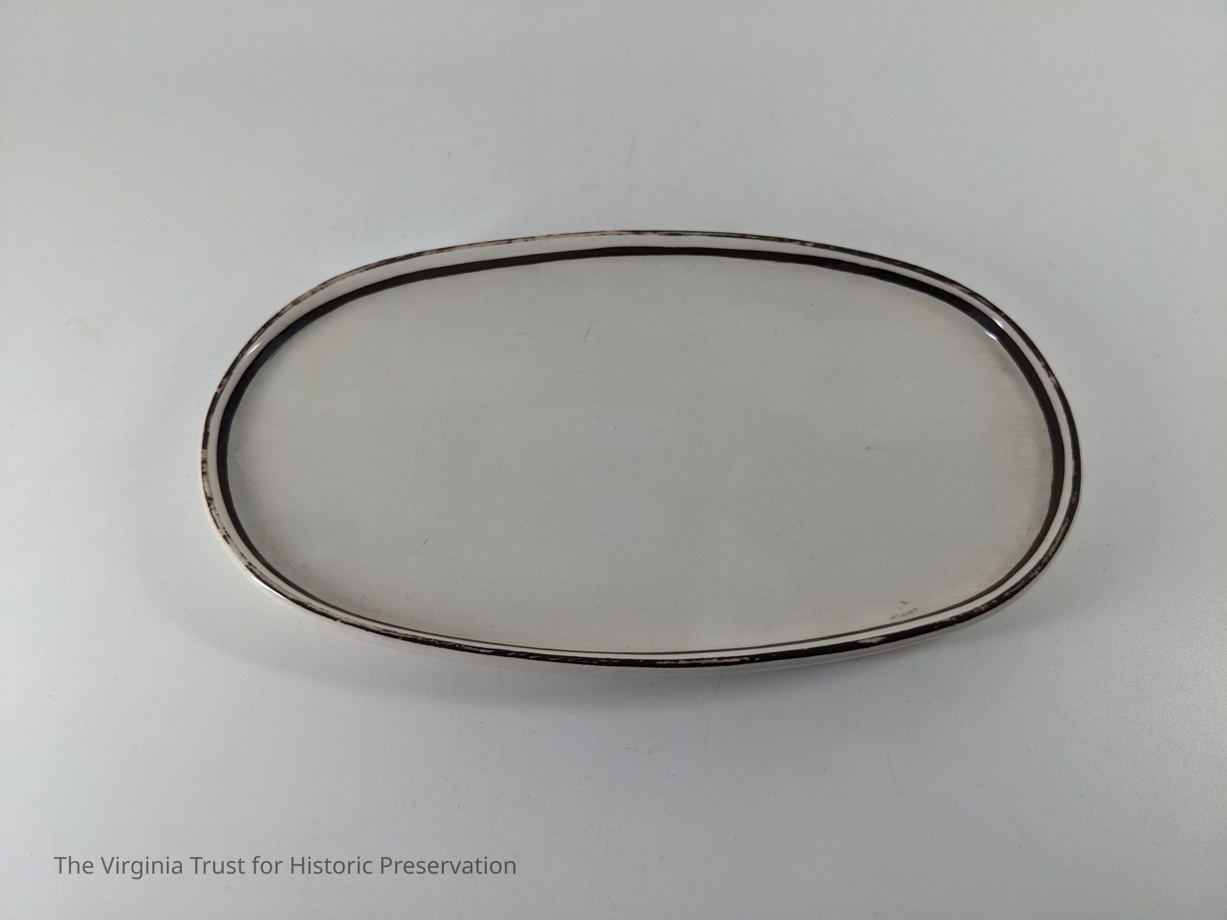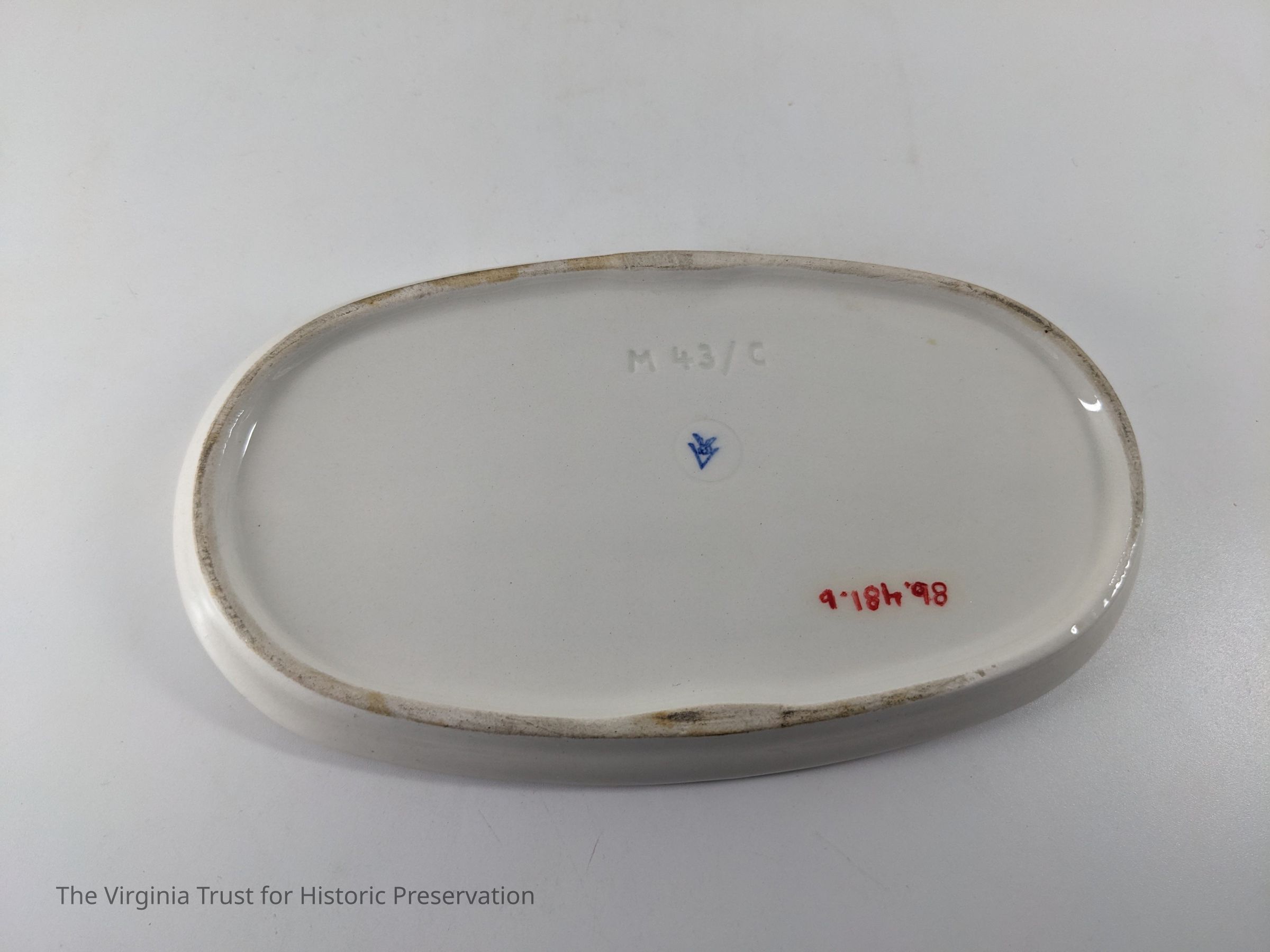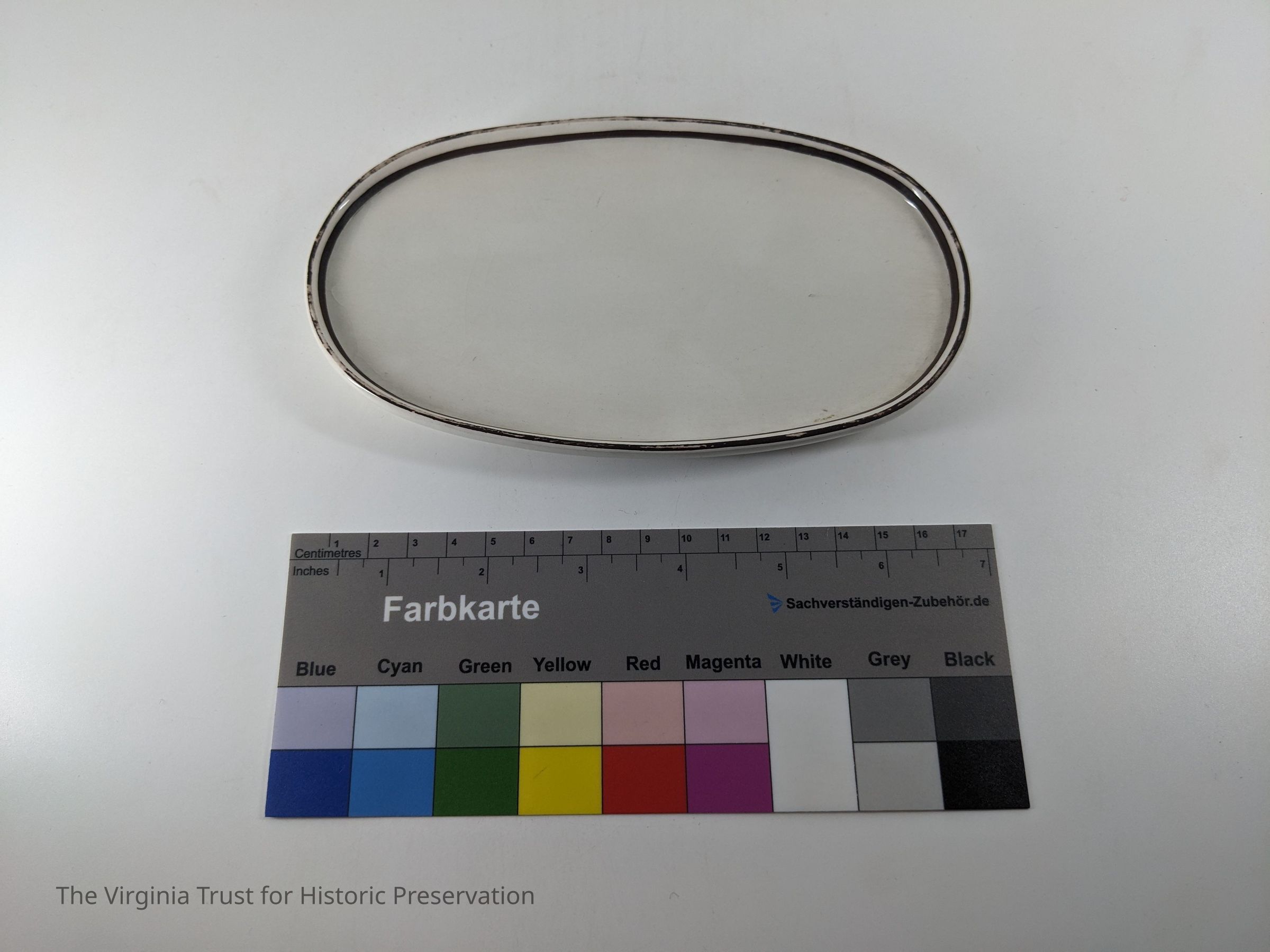 Flat oval butter dish. White with brown rims. Stamped on back "T69". Set of two with 1986.481 B