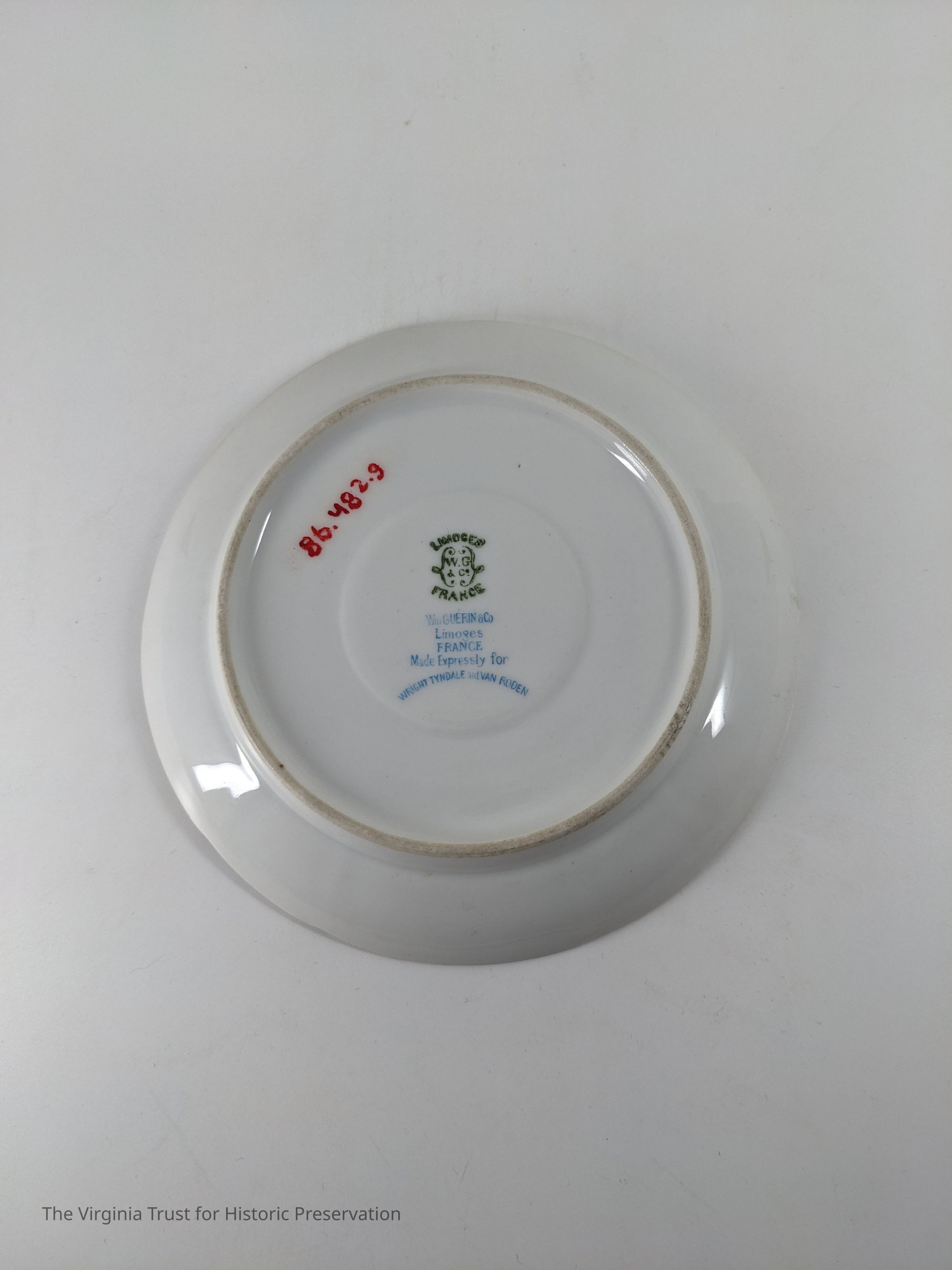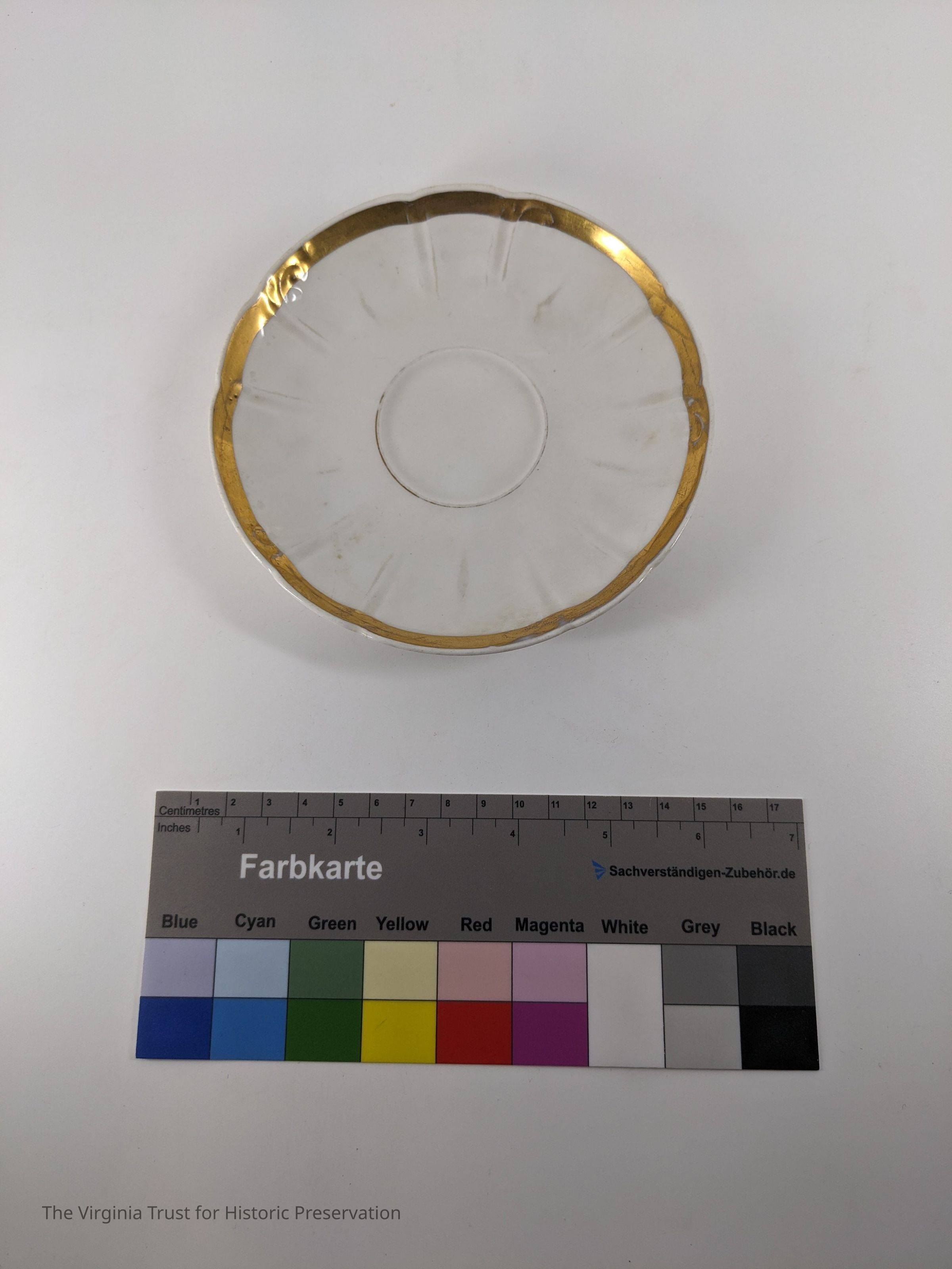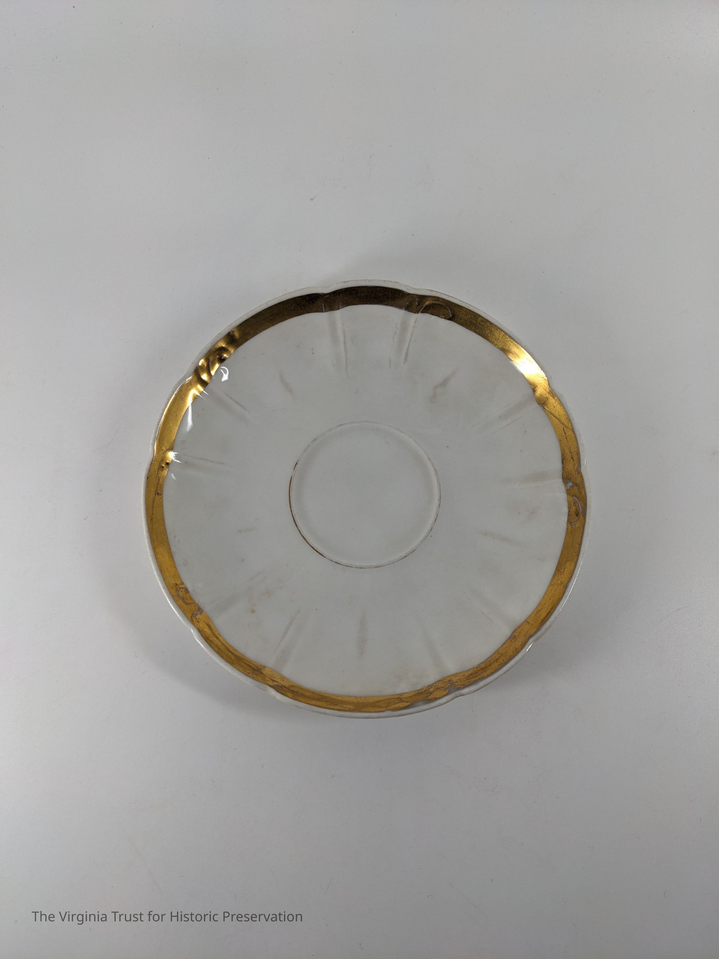 Set of 7. White china teacup saucer with gold rim.