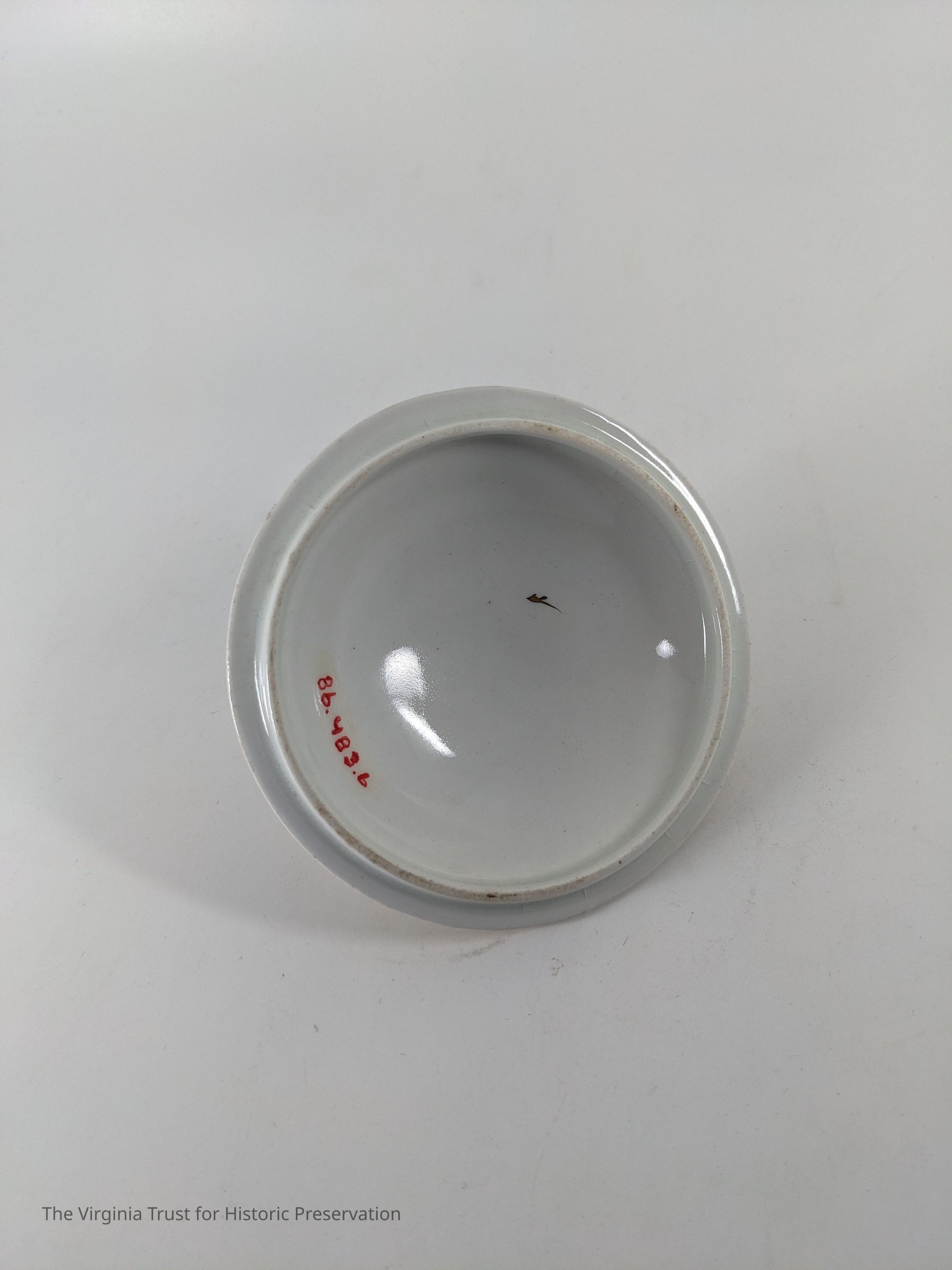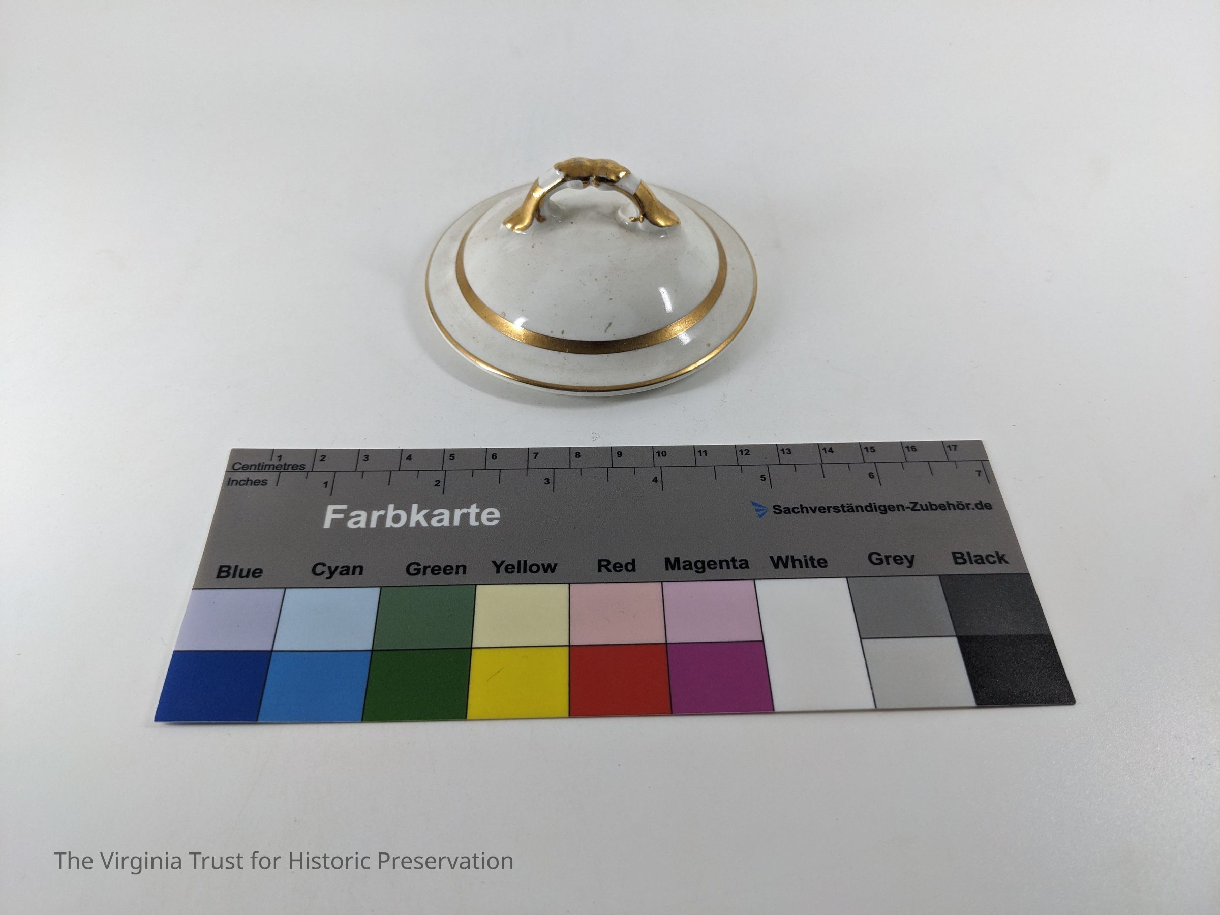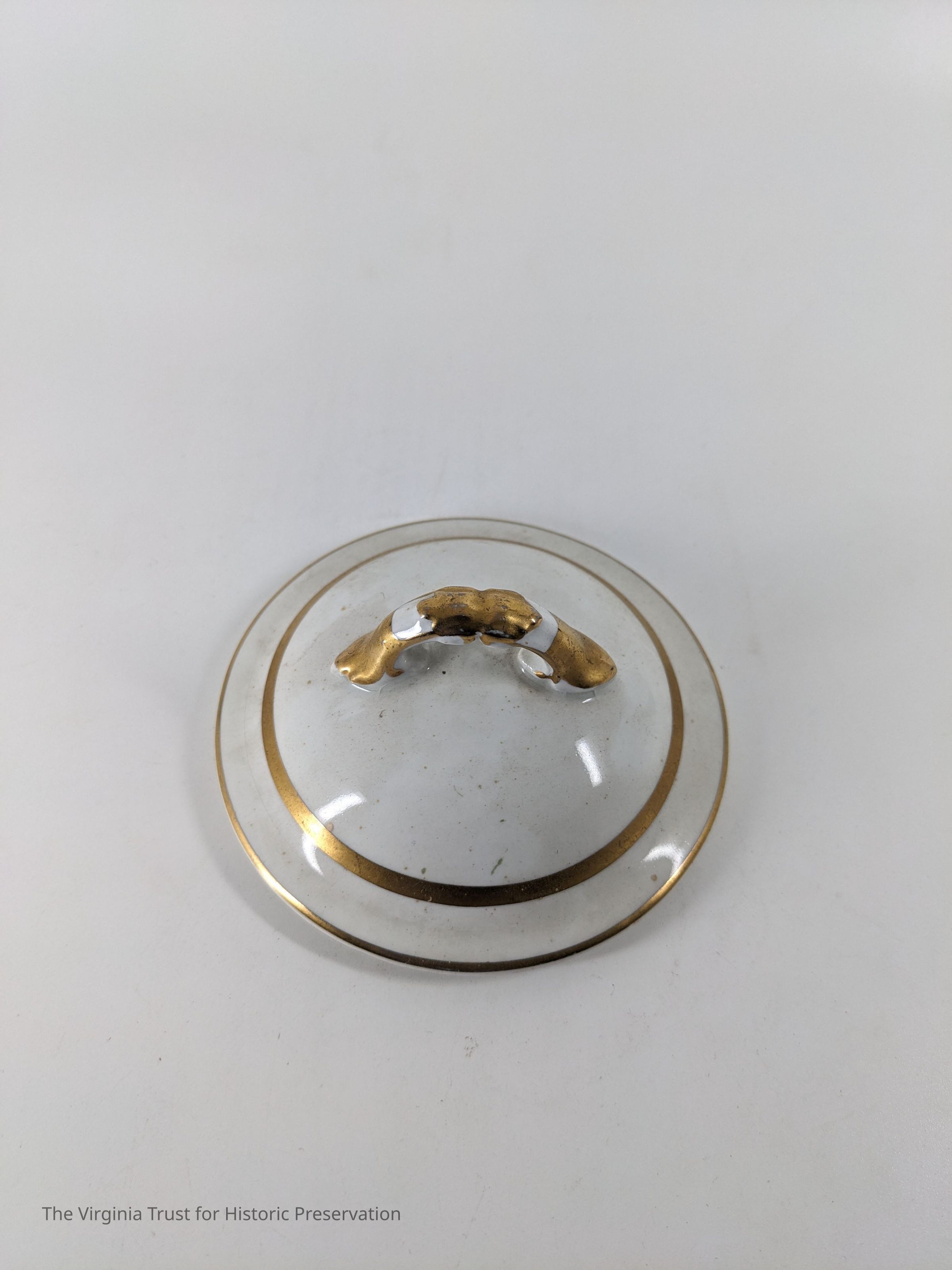 Matching lid for cream pitcher. White china with gold trim, handle on top is gold.