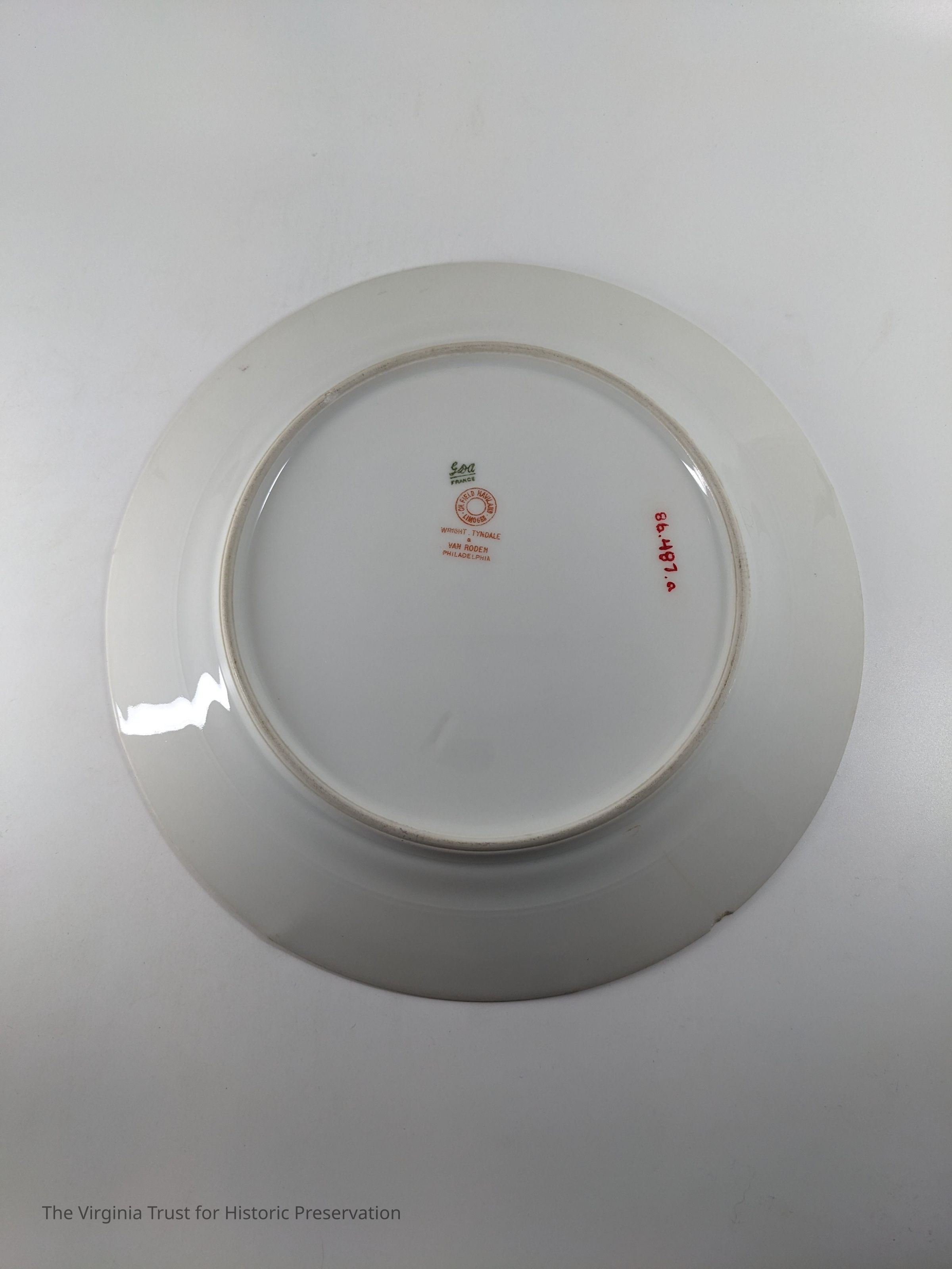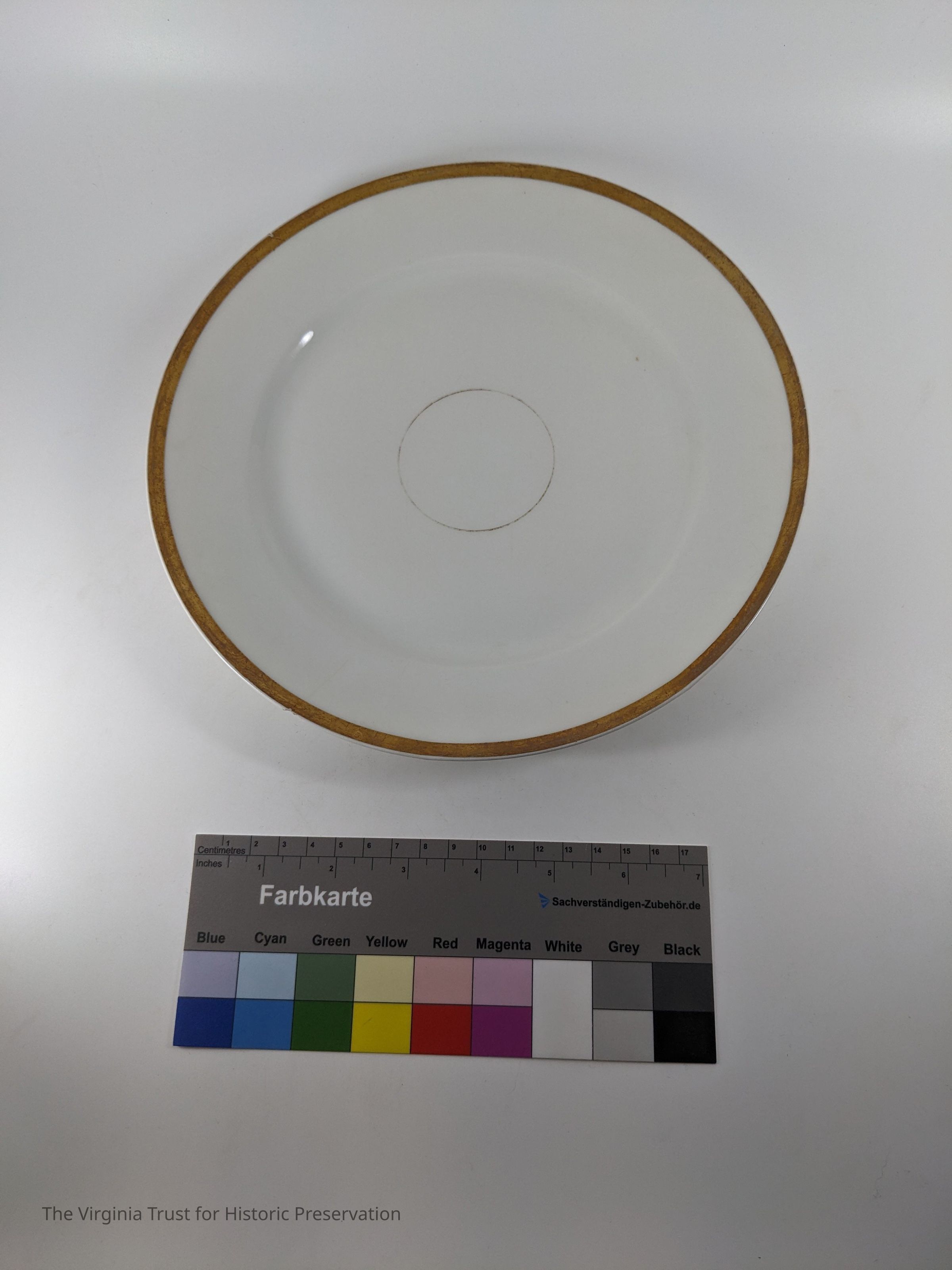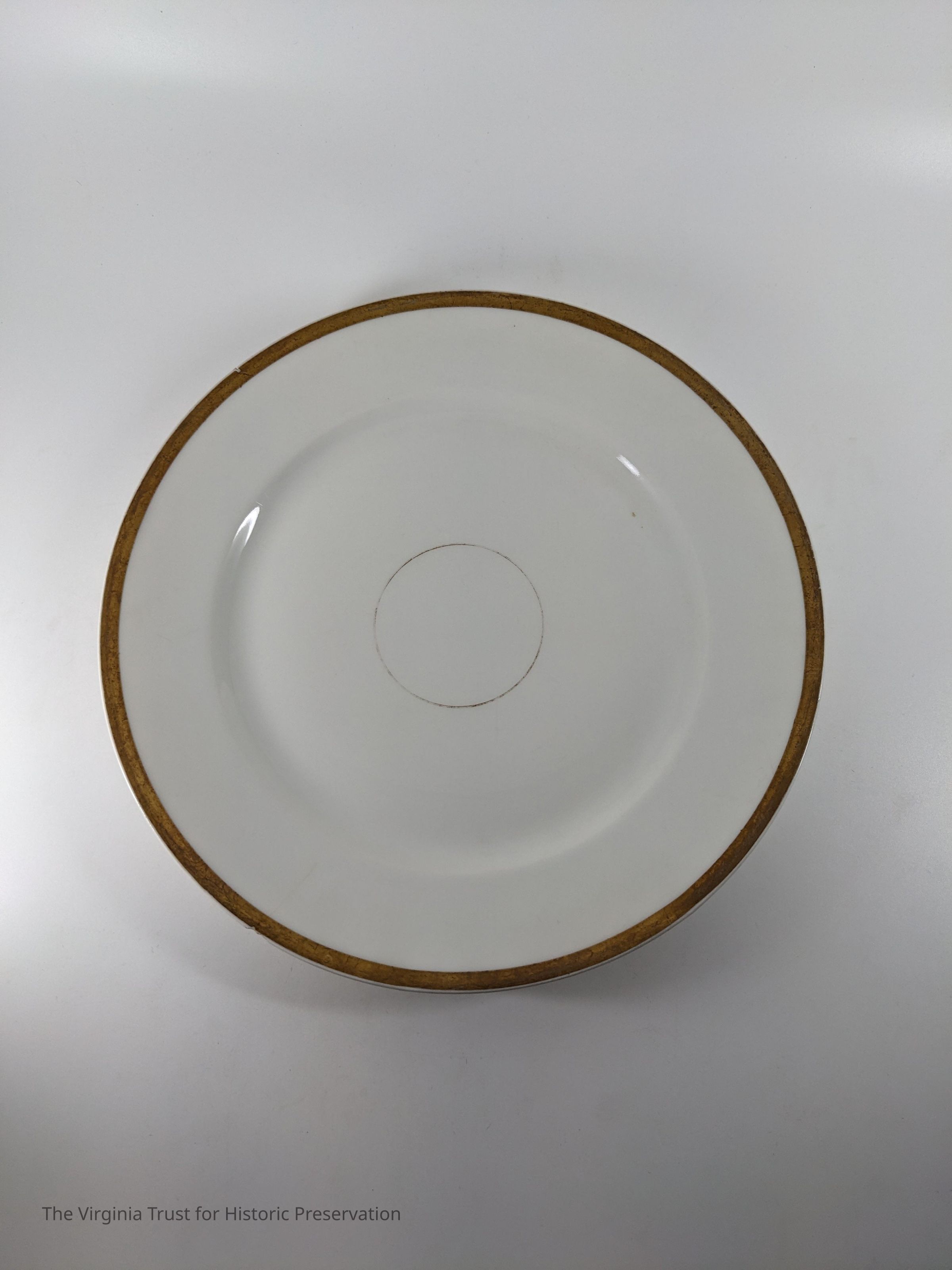 Set of 6 dinner plates - white with gold rims. Stamp on underside: "GDA France Ch. Field Haviland Limoges. Wright Tyndale & Van Roden Philadelphia."
