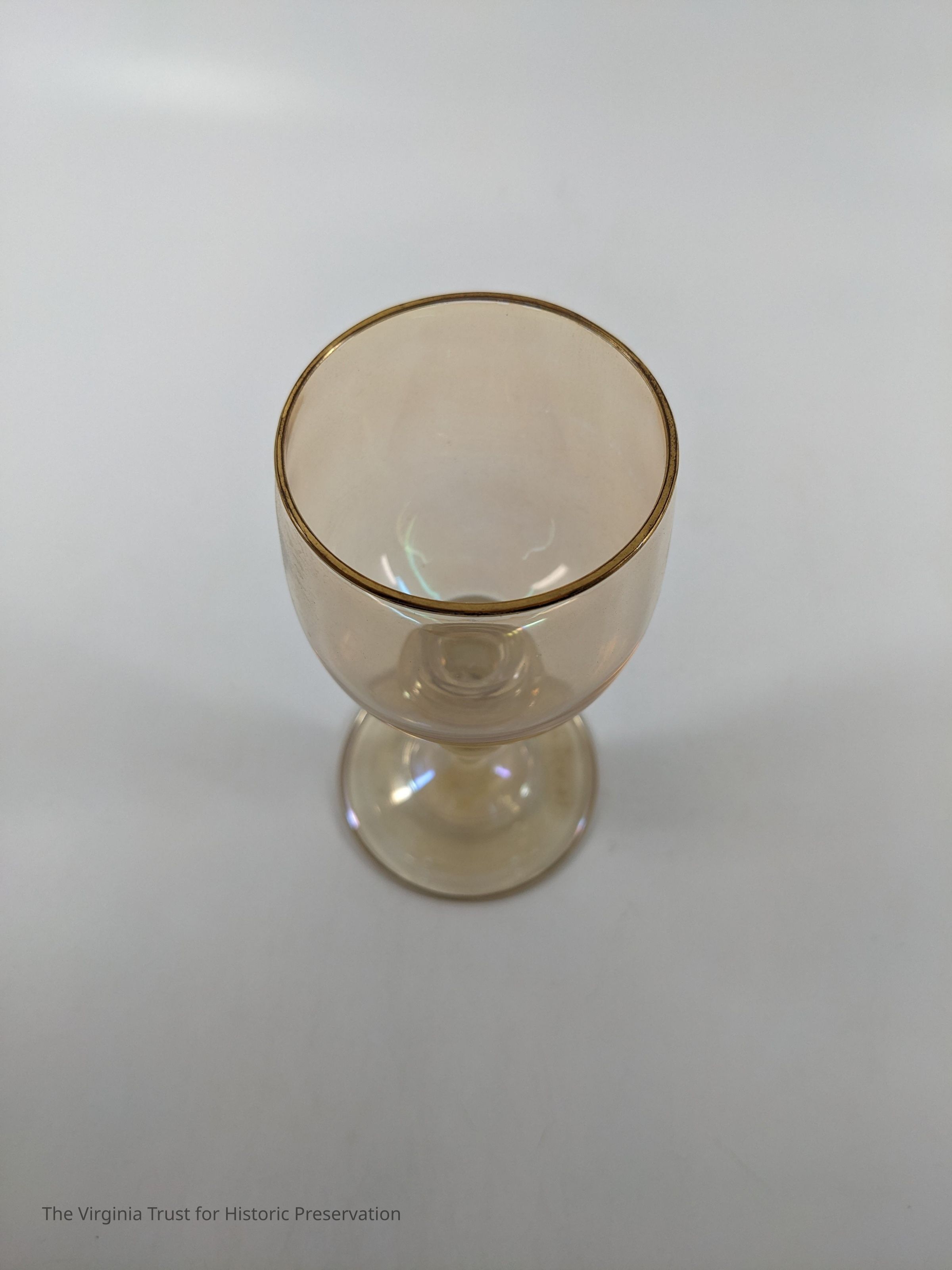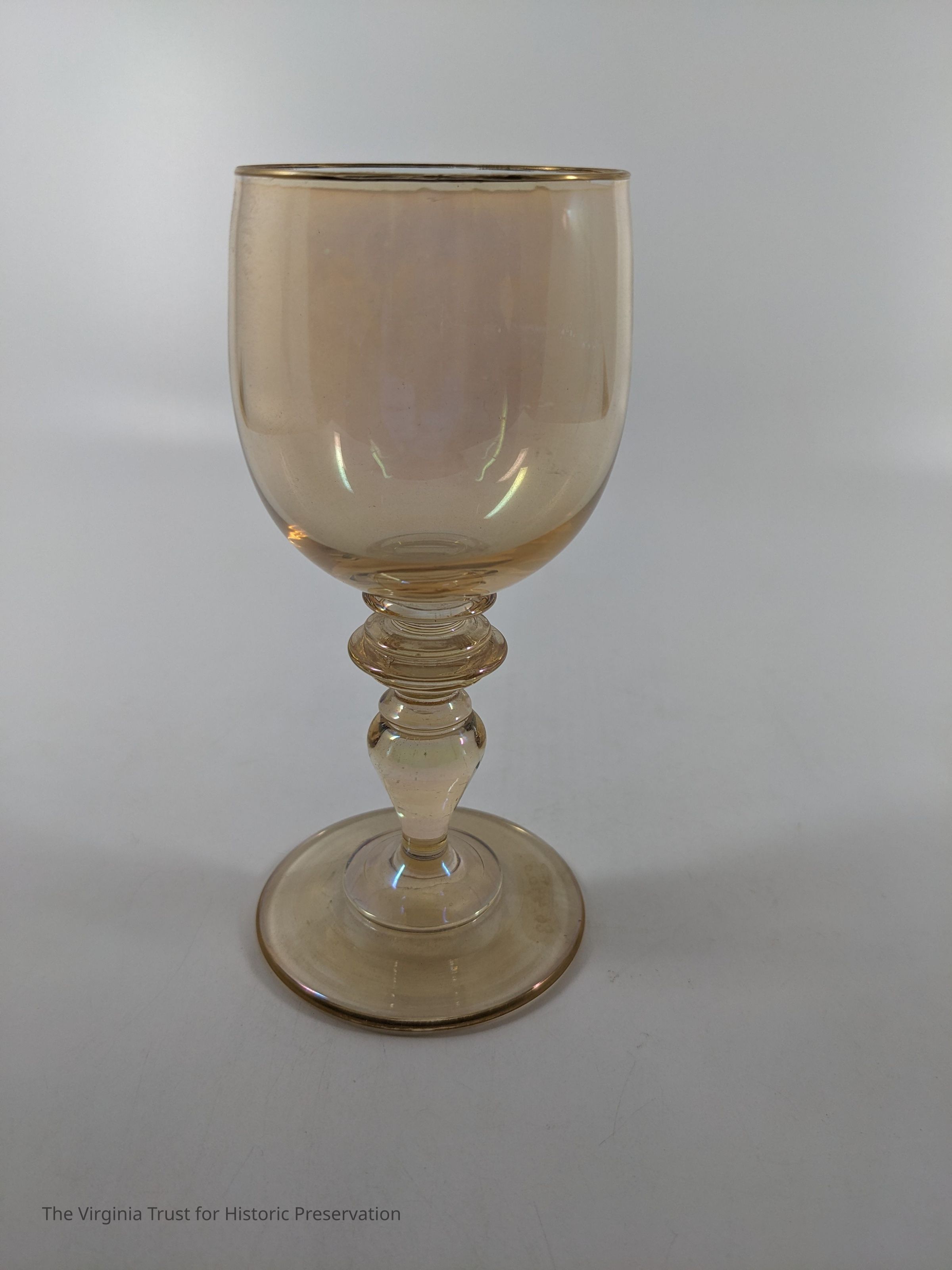 Set of 6 iridescent wine glasses. Yellow in color with gold band around rim and base.
